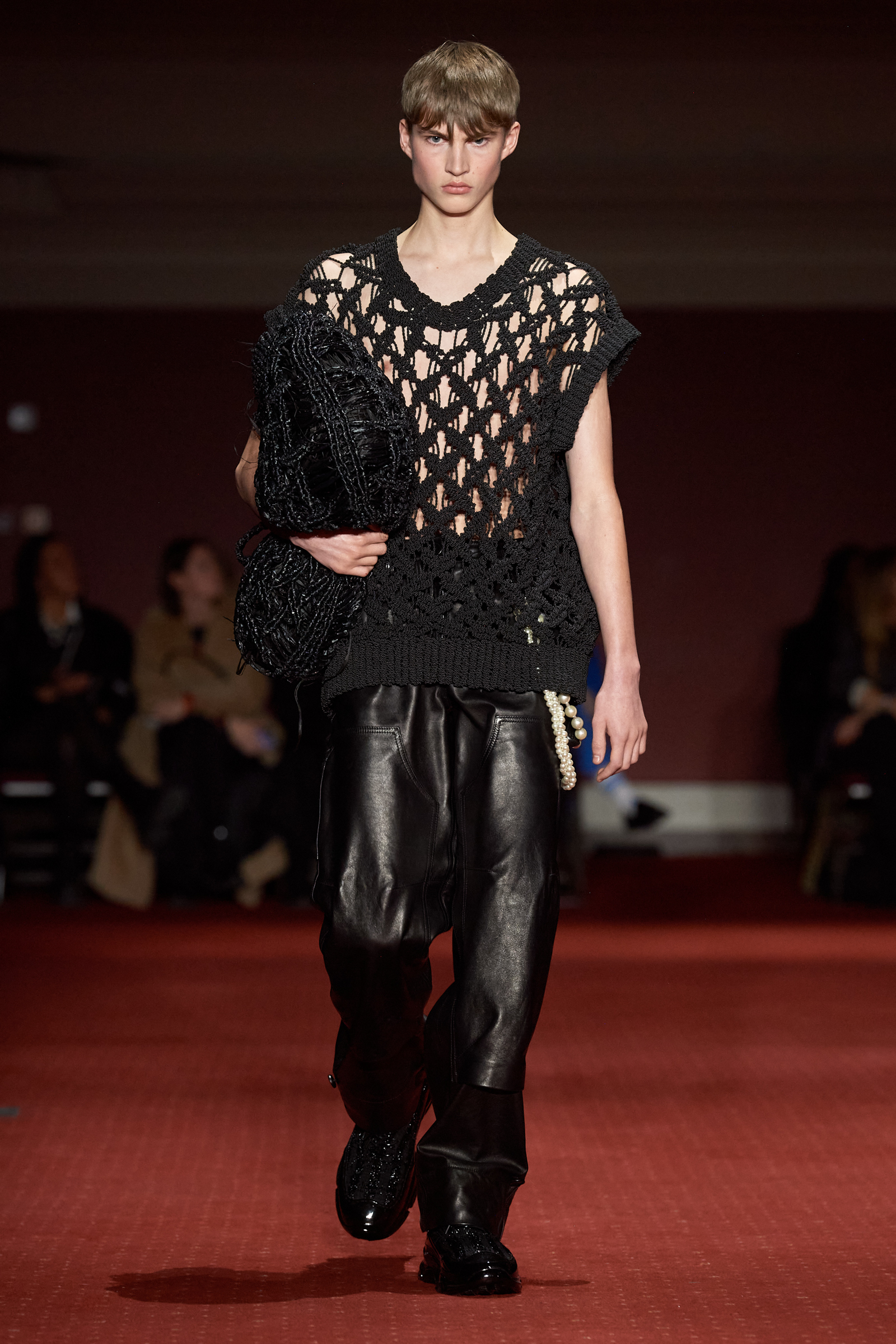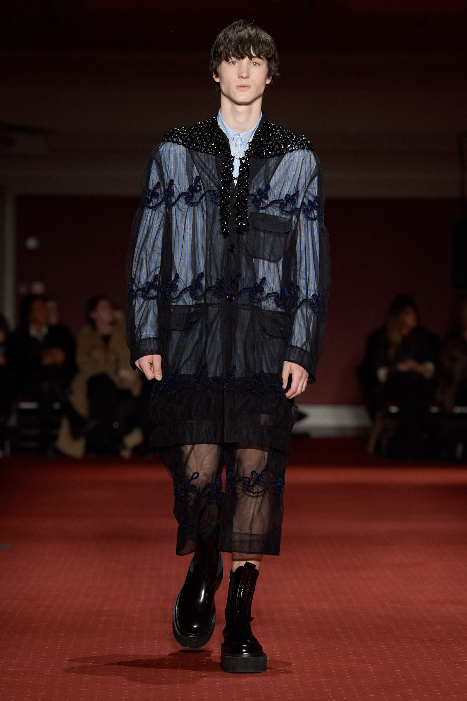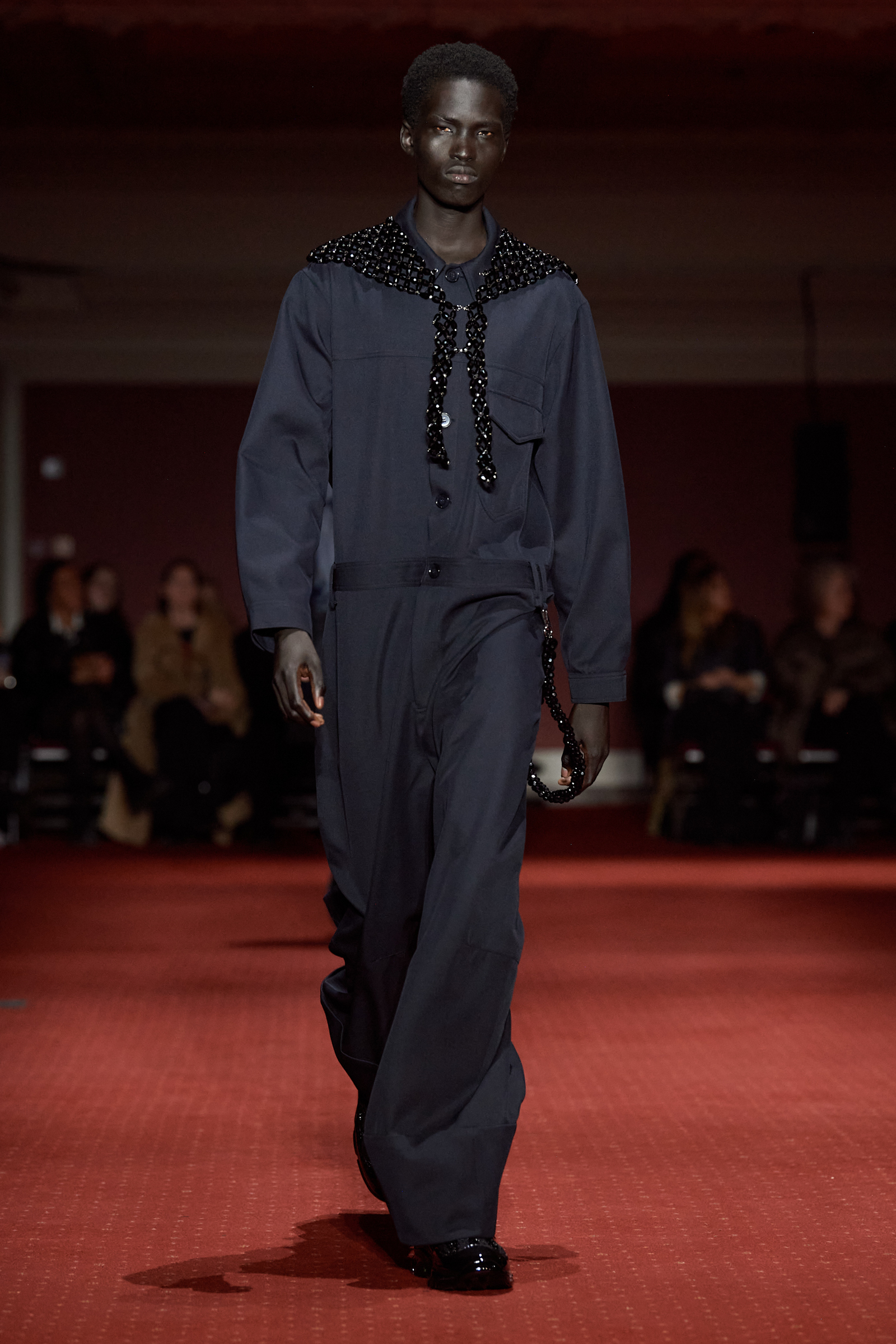 Phew: and all these sideways glances were not the only back and forth at play. The menswear pieces were fascinating on several levels, and in ways that broke their gendered levee and intermingled into the womenswear. One key motif was naval/maritime in the sailor collars and the peacoats with bomber arms and the wonderfully cut “puddle” trousers. Ebbing against that was workwear and Sunday-best formal—all rented asunder by cut-and-pasting elements—which was then muddied and repositioned by the insertion of lace.
