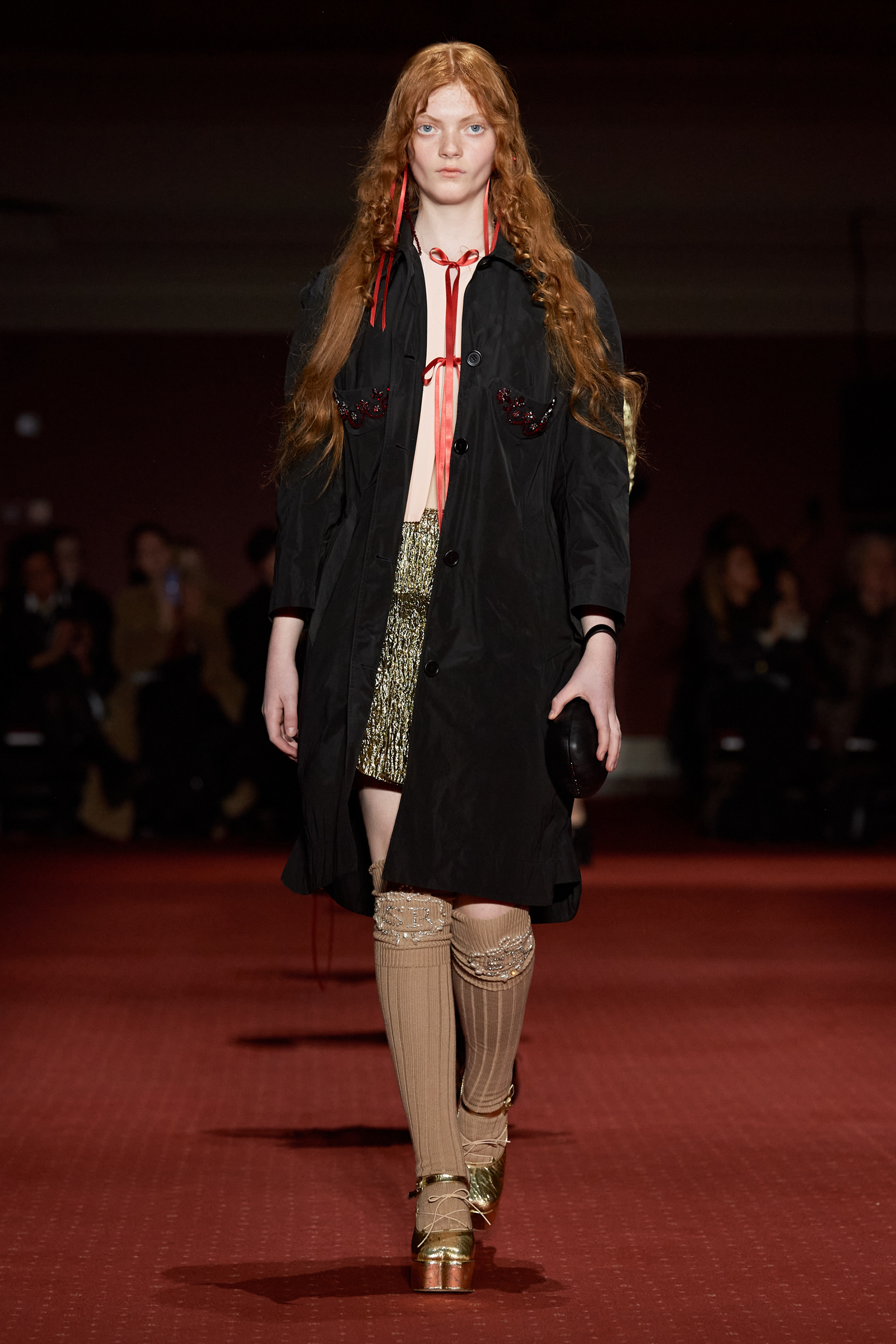 These cut-and-paste mashup pieces, beautiful, were the flow against which ebbed similarly reformed gowns such as that worn by Samantha Morton. A dreamy black nappa car coat worn above a lurex linton kilt for men (and a cracking furry and stoned slide) on a male came after a counterpoint brown coat equivalent and pleated skirt on a female. There were some wonderfully subtle technical details, crossed nylon webbing on jacket arms and that bungee tank, that the designer happily conceded had entered her lexicon thanks to her time working with Moncler: “It made me much more appreciative of the technicality of garments.” Standing stone graphics and new plays on Rocha’s logo by a group of friend creatives added extra texture to a collection that was already aflame with it. She sewed, we reaped.