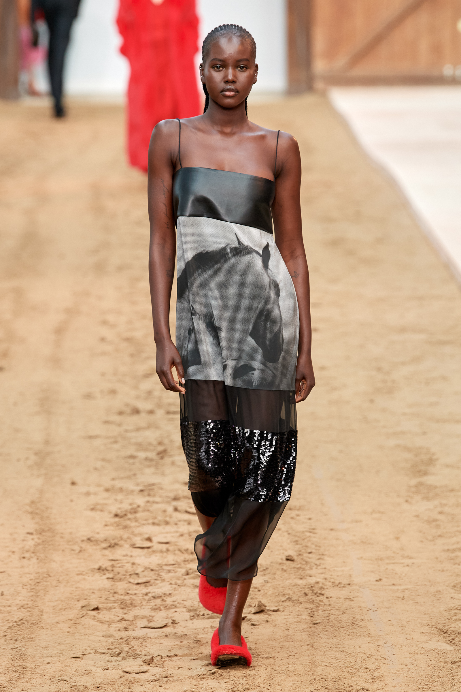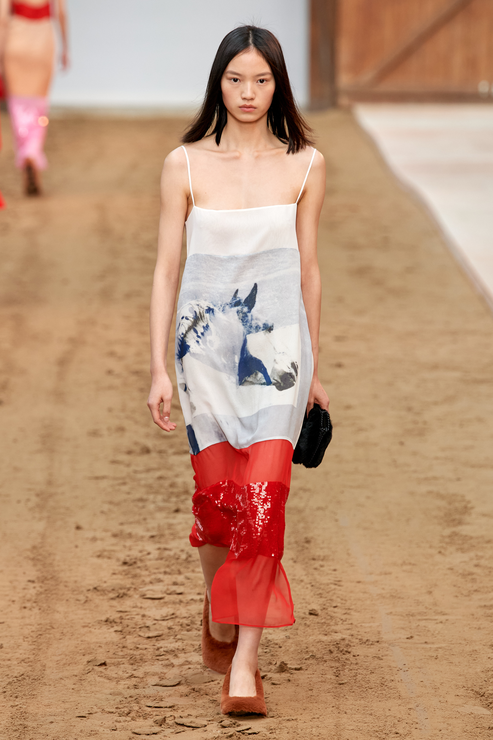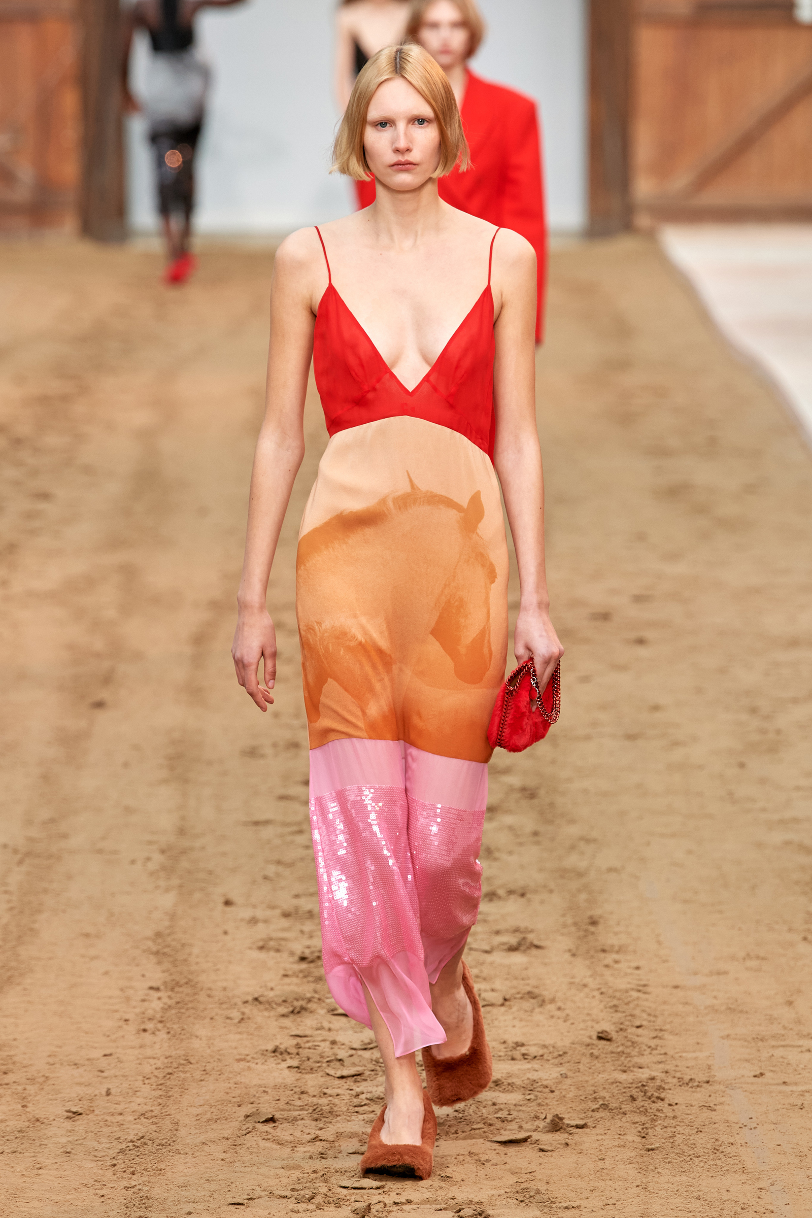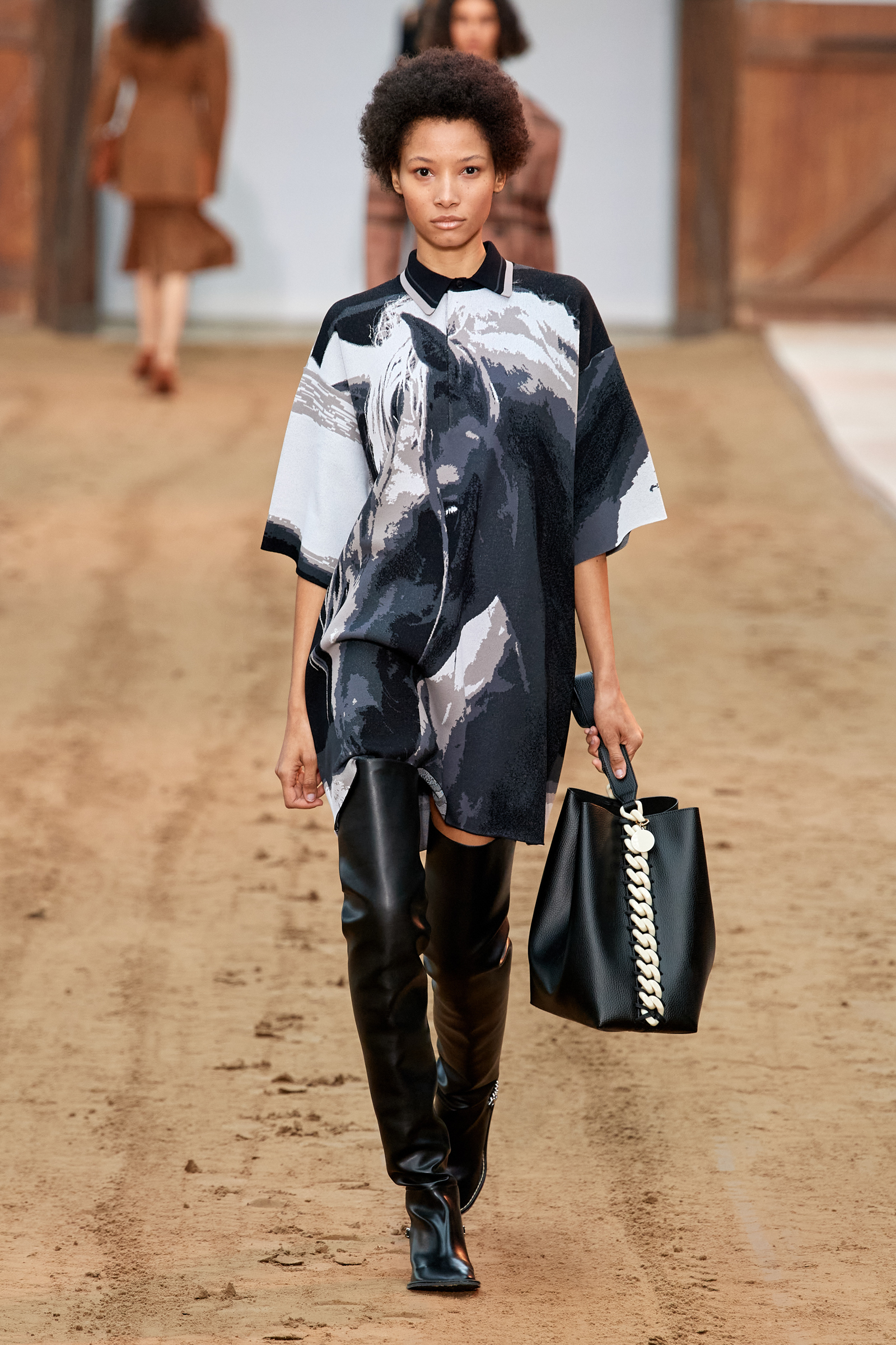 Those memories continued in dresses and knitwear that revived the horse print from her spring/summer 2001 collection for Chloé, albeit in a blurry evocation. McCartney’s ongoing rekindling with her own archives from her tenure at the house is timely—it’s what the kids want (just ask her teenaged daughter) but it’s clearly also invigorating the designer in new ways. Everything suddenly feels a little bit more impassioned in the house of Stella. Last season’s oversized blazers and coats were back today—as on many other runways this month—now adorned in the checks of horse blankets and some sculpted with the nipped-in waists of hunting jackets. As a nod to her family history, McCartney emblazoned her mother’s horse photography on evening dresses, and the horse photography of her sister Mary on shirts—one worn by Pignon himself.