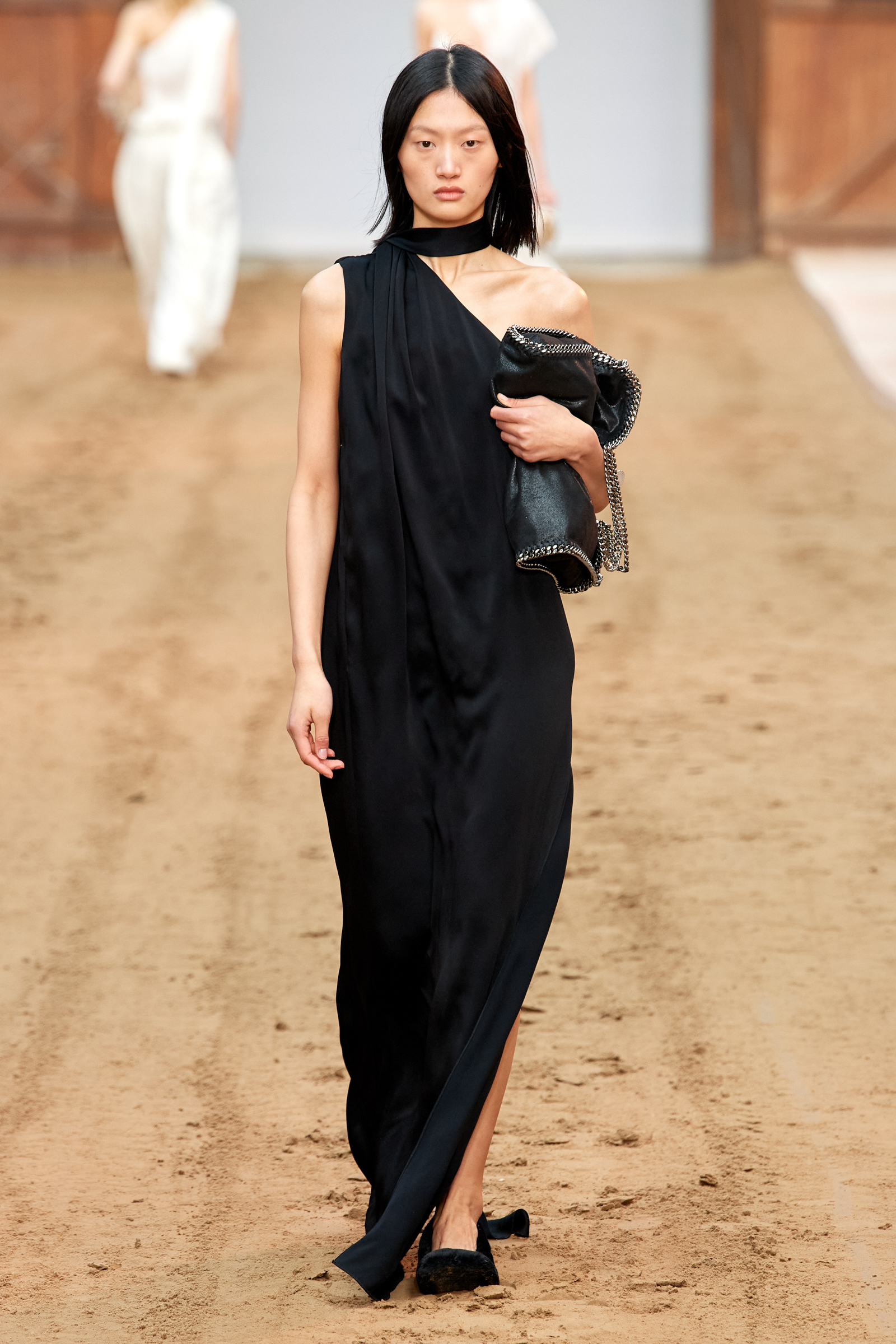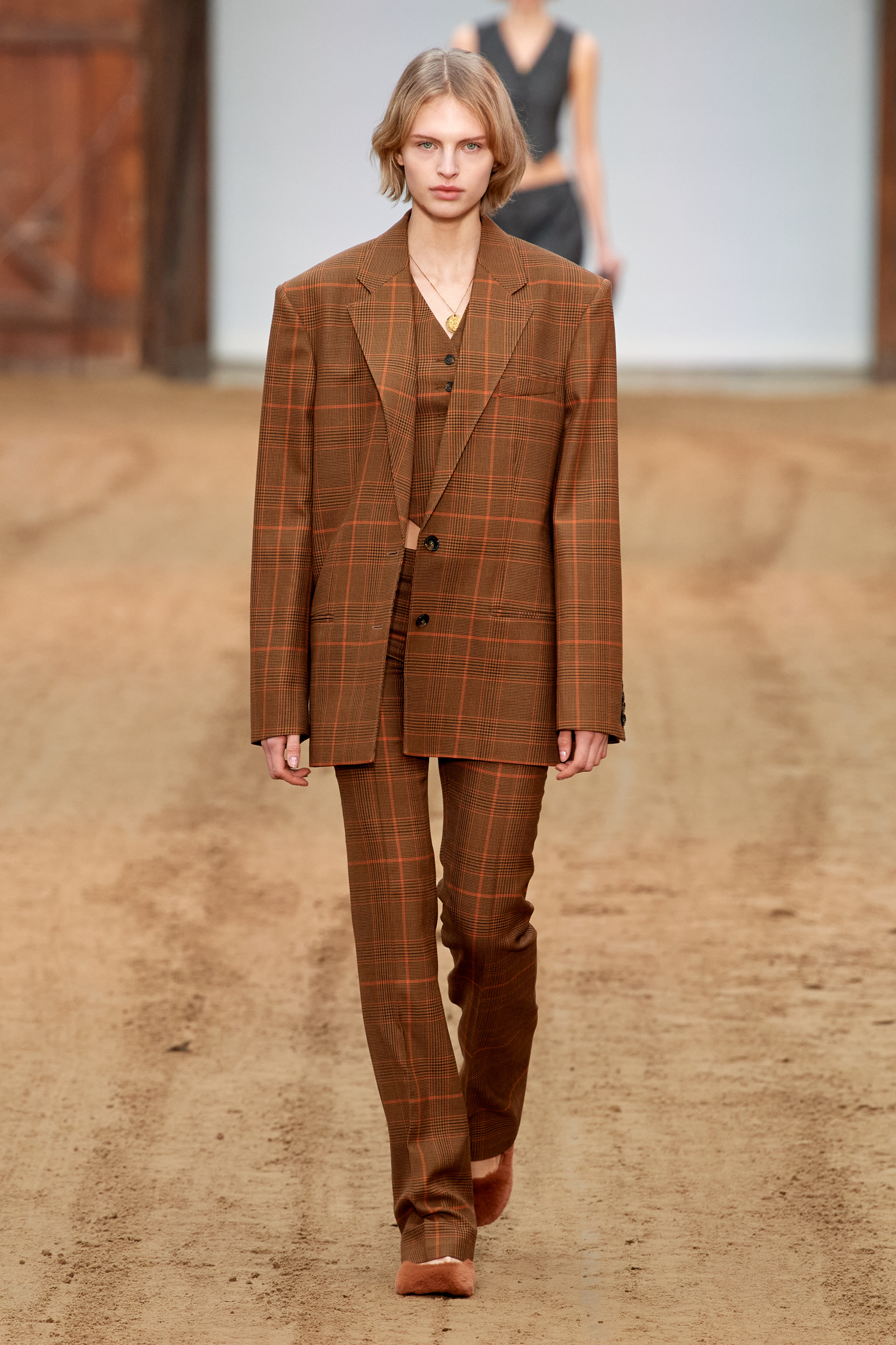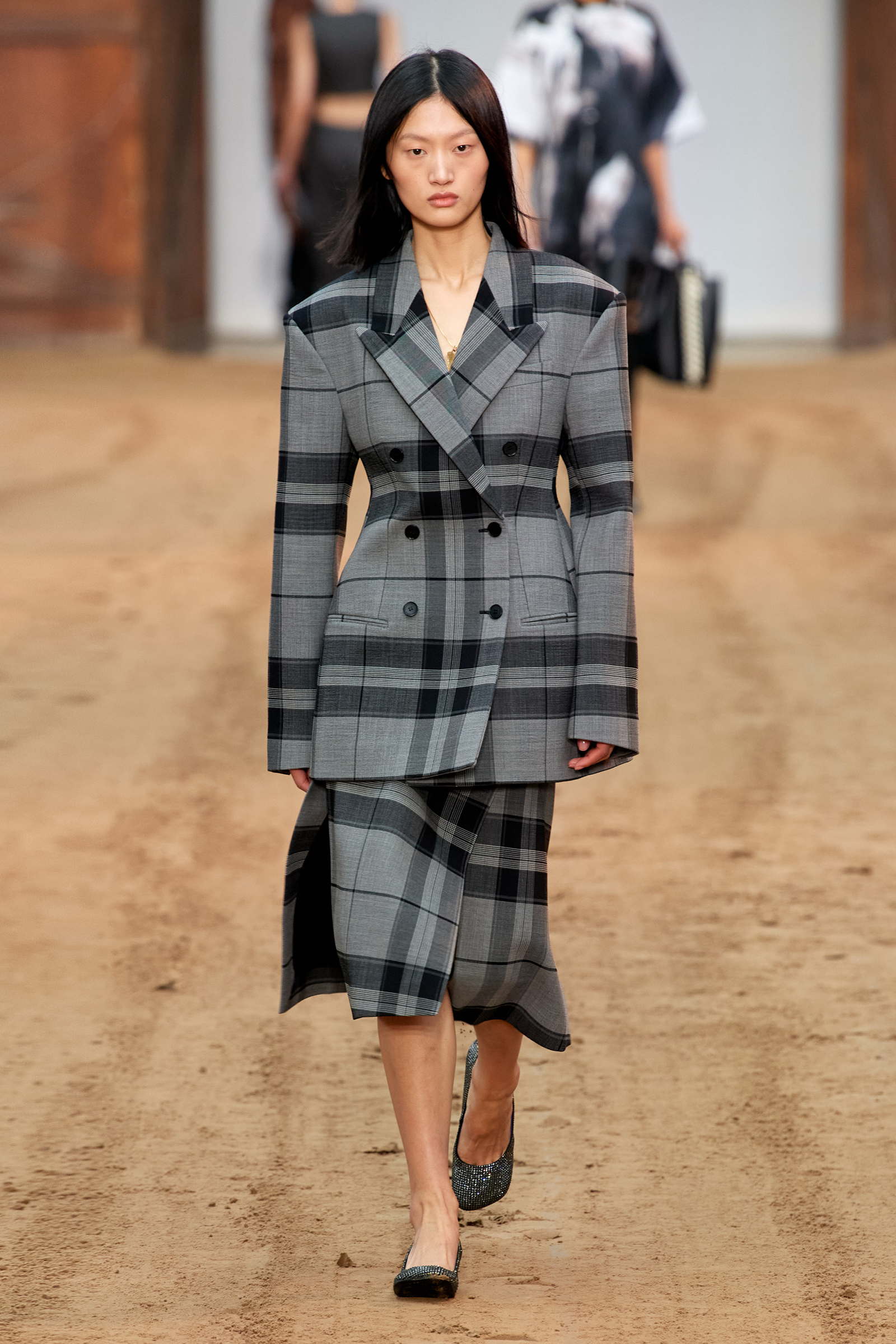 Those memories continued in dresses and knitwear that revived the horse print from her spring/summer 2001 collection for Chloé, albeit in a blurry evocation. McCartney’s ongoing rekindling with her own archives from her tenure at the house is timely—it’s what the kids want (just ask her teenaged daughter) but it’s clearly also invigorating the designer in new ways. Everything suddenly feels a little bit more impassioned in the house of Stella. Last season’s oversized blazers and coats were back today—as on many other runways this month—now adorned in the checks of horse blankets and some sculpted with the nipped-in waists of hunting jackets. As a nod to her family history, McCartney emblazoned her mother’s horse photography on evening dresses, and the horse photography of her sister Mary on shirts—one worn by Pignon himself.