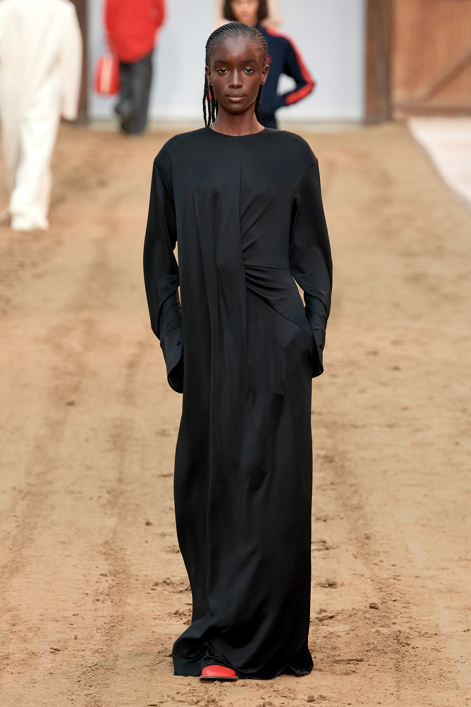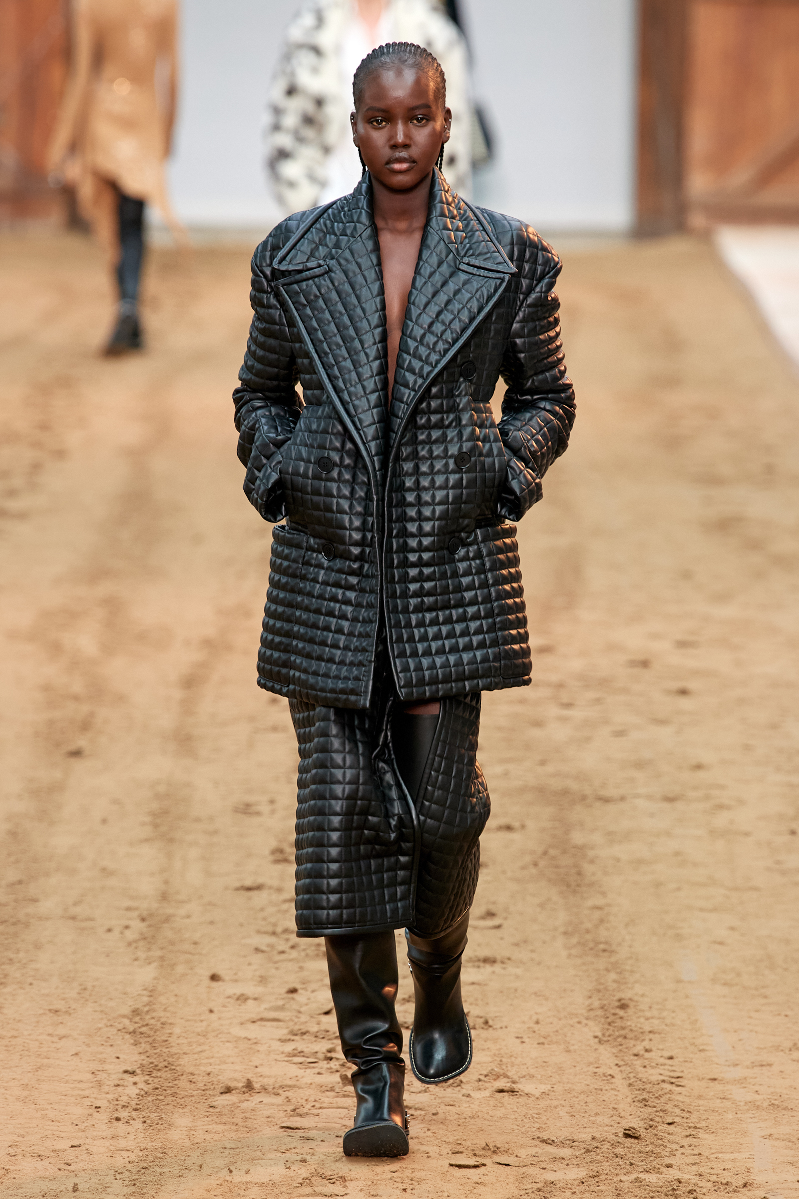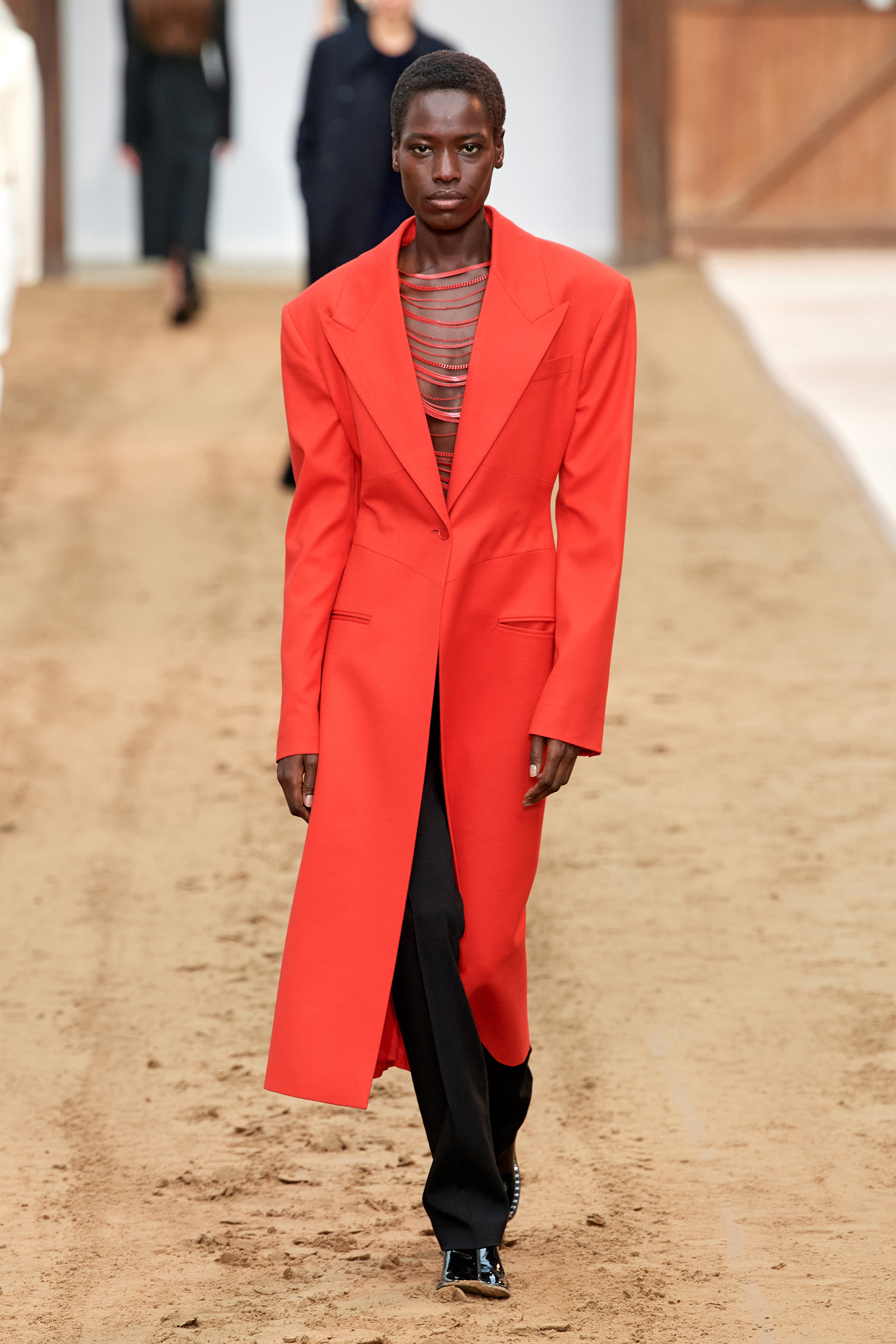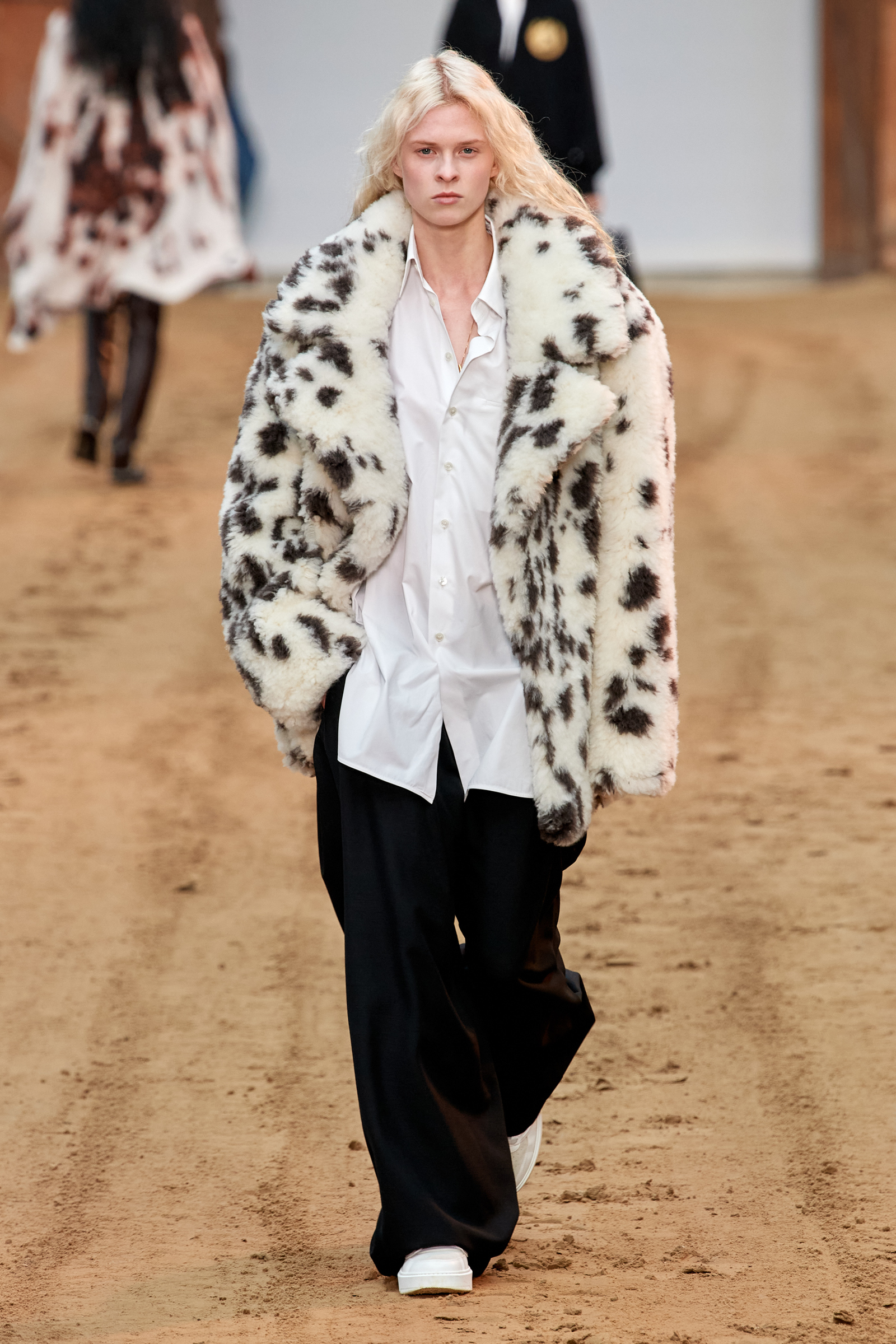 Those memories continued in dresses and knitwear that revived the horse print from her spring/summer 2001 collection for Chloé, albeit in a blurry evocation. McCartney’s ongoing rekindling with her own archives from her tenure at the house is timely—it’s what the kids want (just ask her teenaged daughter) but it’s clearly also invigorating the designer in new ways. Everything suddenly feels a little bit more impassioned in the house of Stella. Last season’s oversized blazers and coats were back today—as on many other runways this month—now adorned in the checks of horse blankets and some sculpted with the nipped-in waists of hunting jackets. As a nod to her family history, McCartney emblazoned her mother’s horse photography on evening dresses, and the horse photography of her sister Mary on shirts—one worn by Pignon himself.