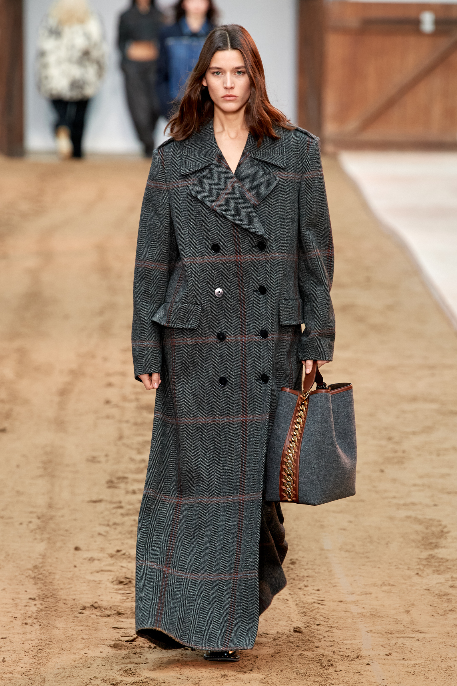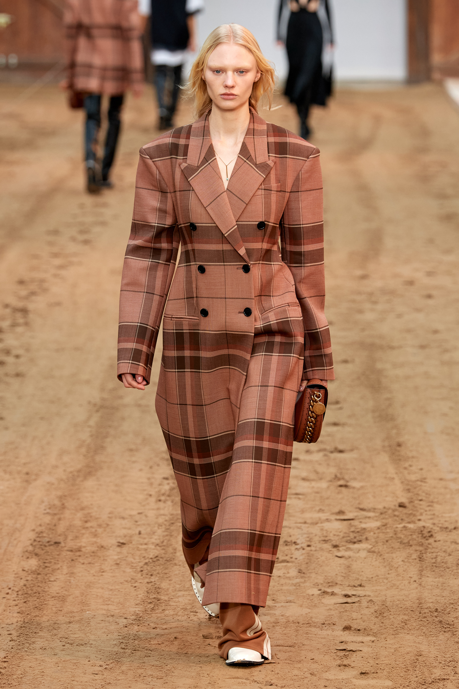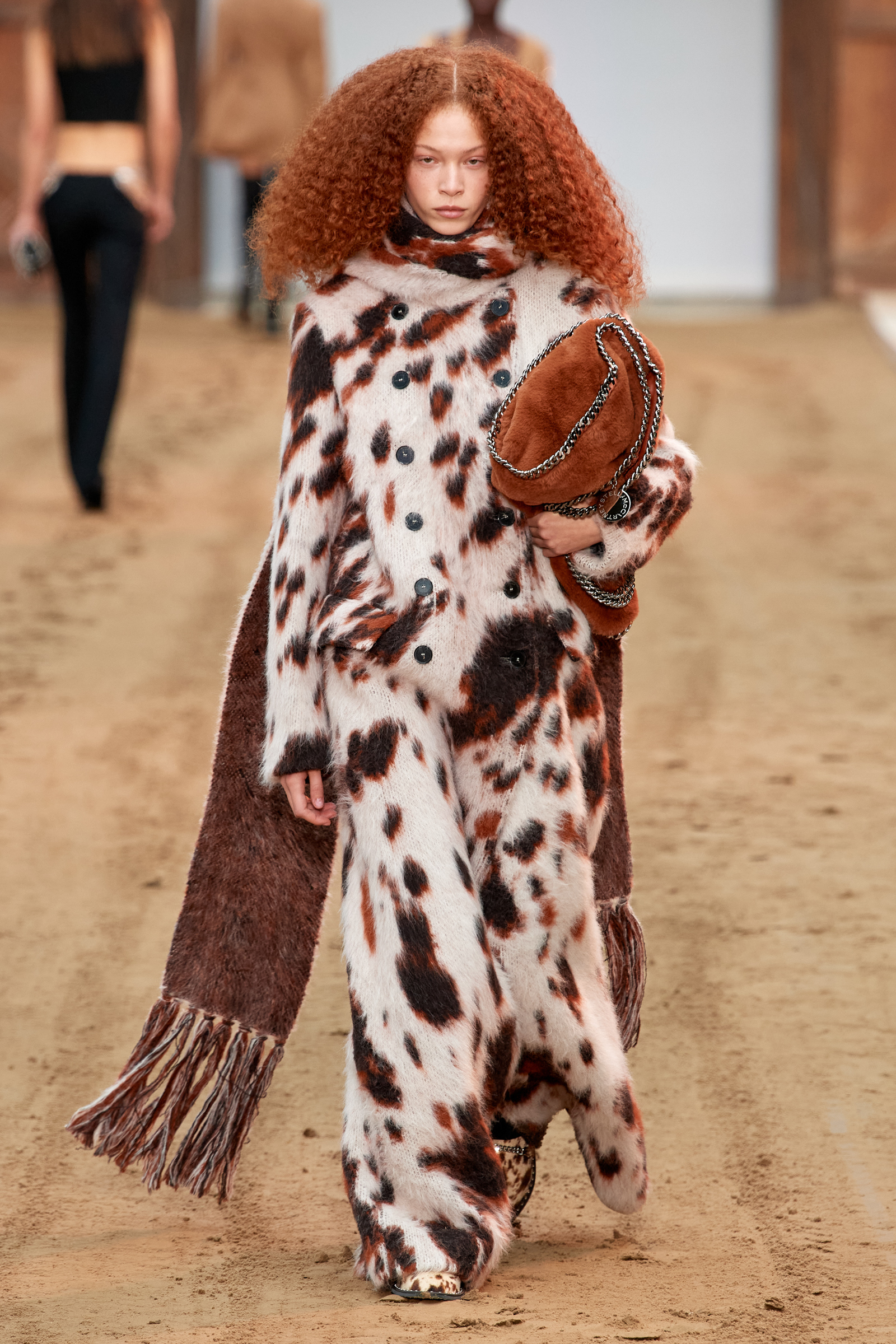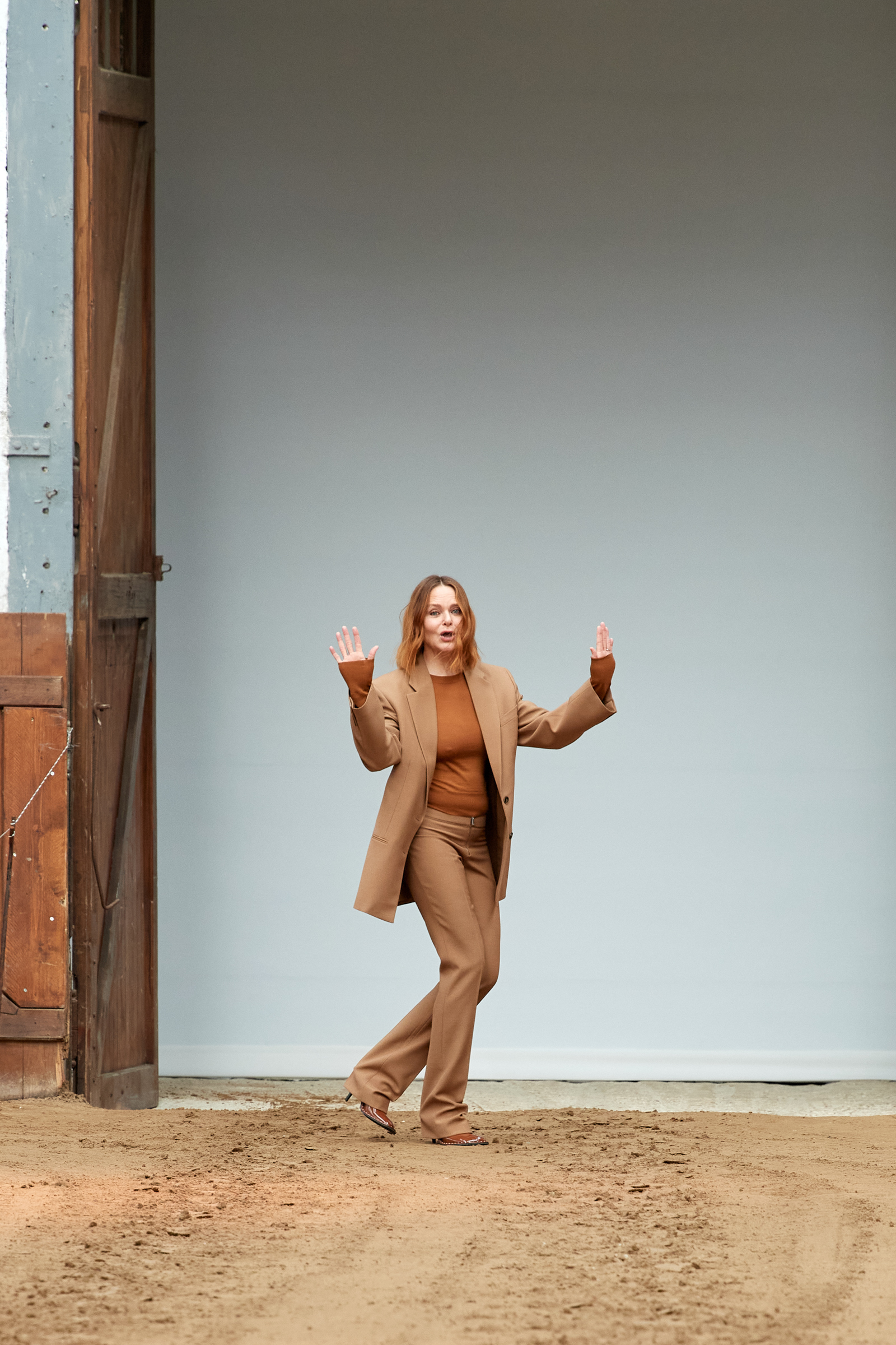 McCartney is vegan, but also someone who believes in harmonious relationships between humans and animals. Her mother Linda bred Appaloosa horses, and to this day, the designer still rides. She has a horse named Summer and keeps dogs, too. “I have a farm in the country and there’s still a hunt next door. I want to make people aware that that’s still going on. Yes, they may not rip it to pieces with dogs, but they shoot the fox. It’s just crazy to me,” she said. Her collection was an exercise in claiming and re-appropriating the codes of the British equestrian wardrobes associated with hunting and the warhorses of the Great War, and all the things McCartney doesn’t believe in.