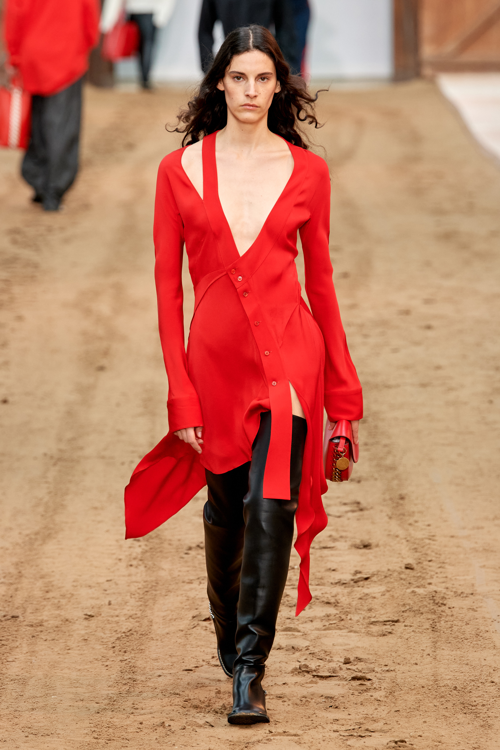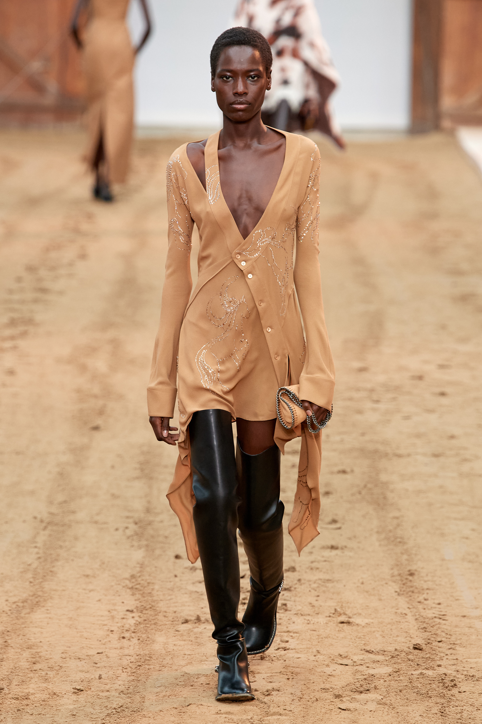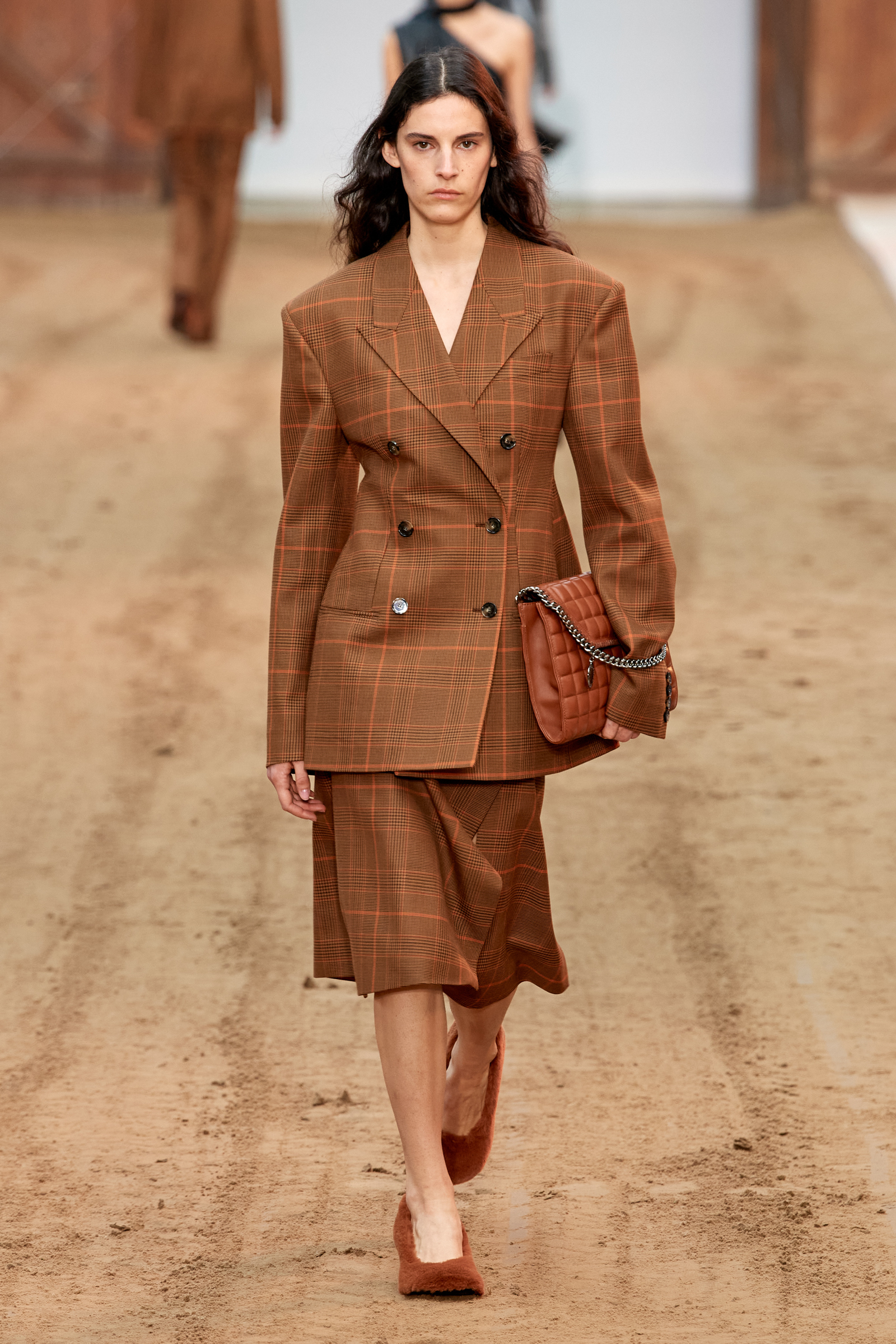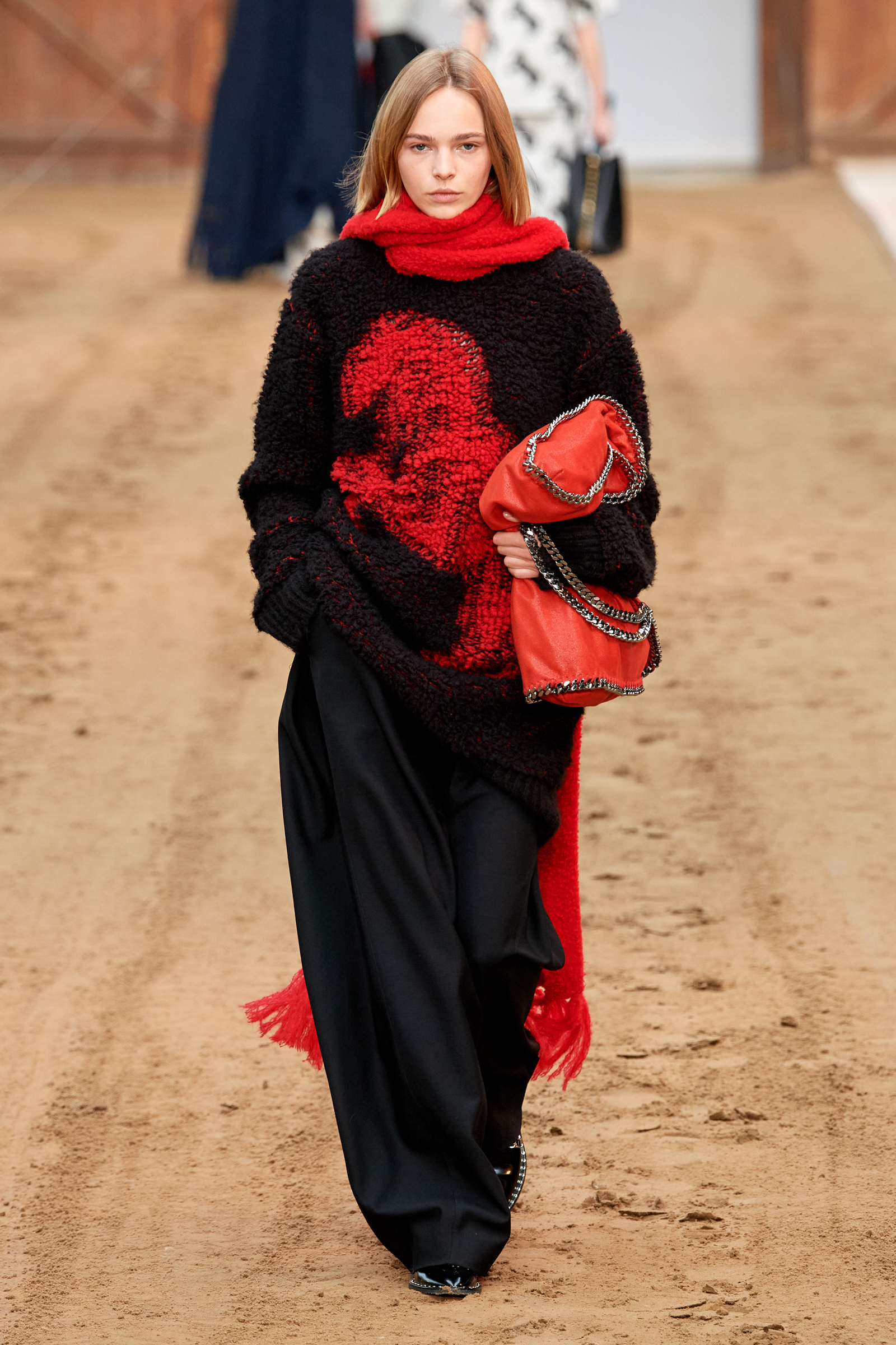 McCartney is vegan, but also someone who believes in harmonious relationships between humans and animals. Her mother Linda bred Appaloosa horses, and to this day, the designer still rides. She has a horse named Summer and keeps dogs, too. “I have a farm in the country and there’s still a hunt next door. I want to make people aware that that’s still going on. Yes, they may not rip it to pieces with dogs, but they shoot the fox. It’s just crazy to me,” she said. Her collection was an exercise in claiming and re-appropriating the codes of the British equestrian wardrobes associated with hunting and the warhorses of the Great War, and all the things McCartney doesn’t believe in.