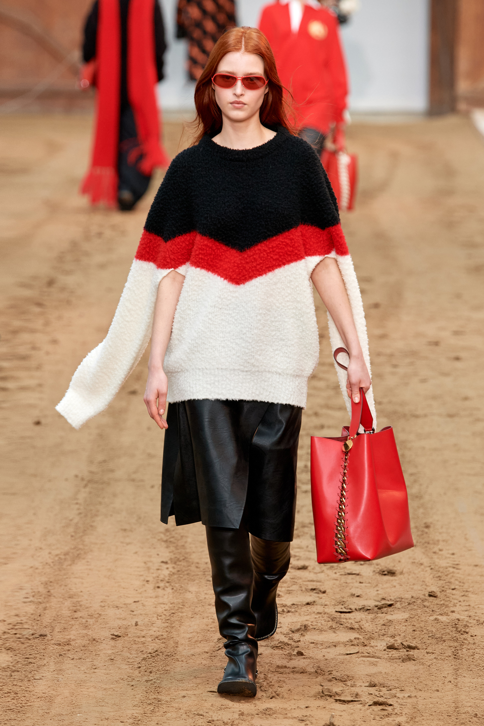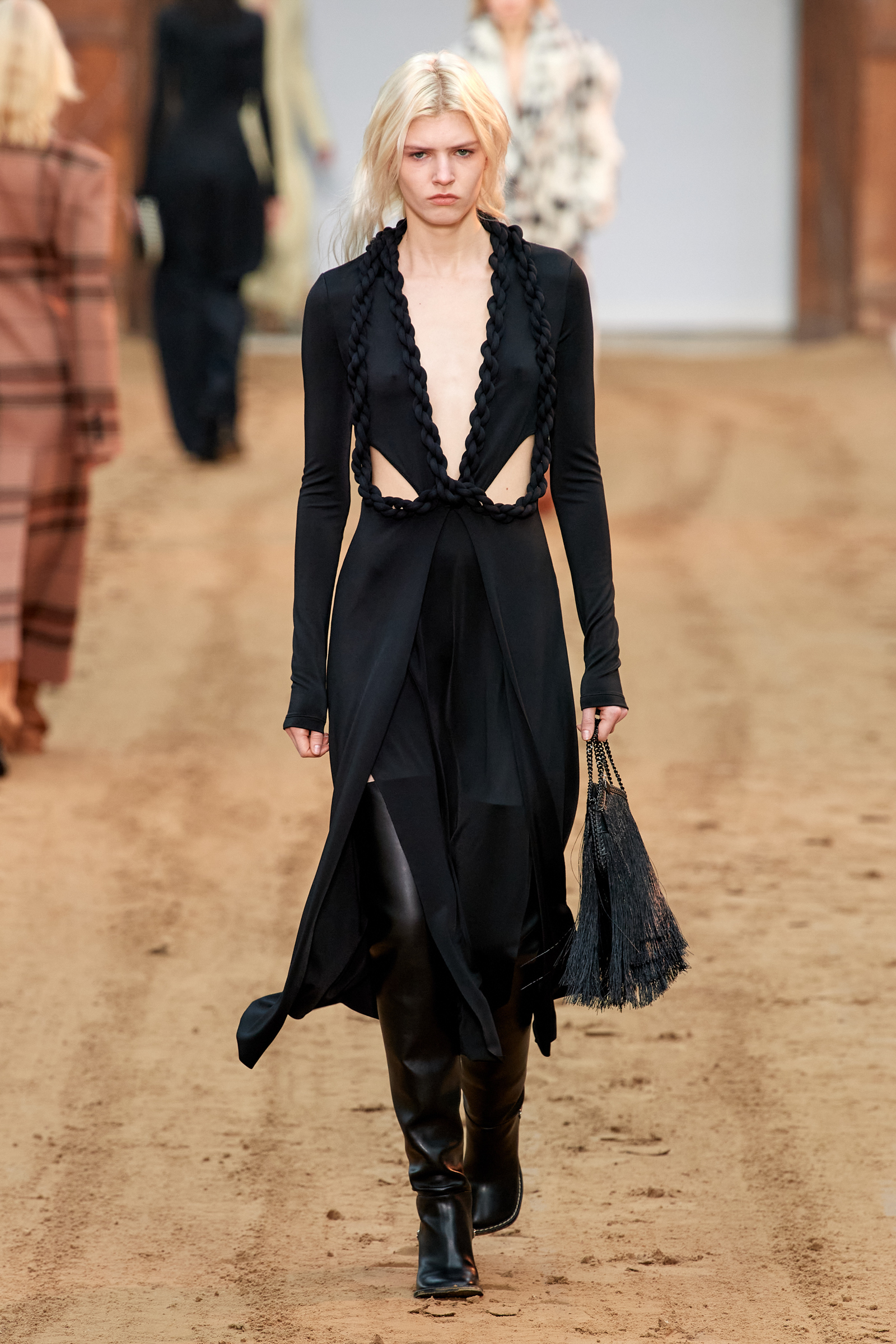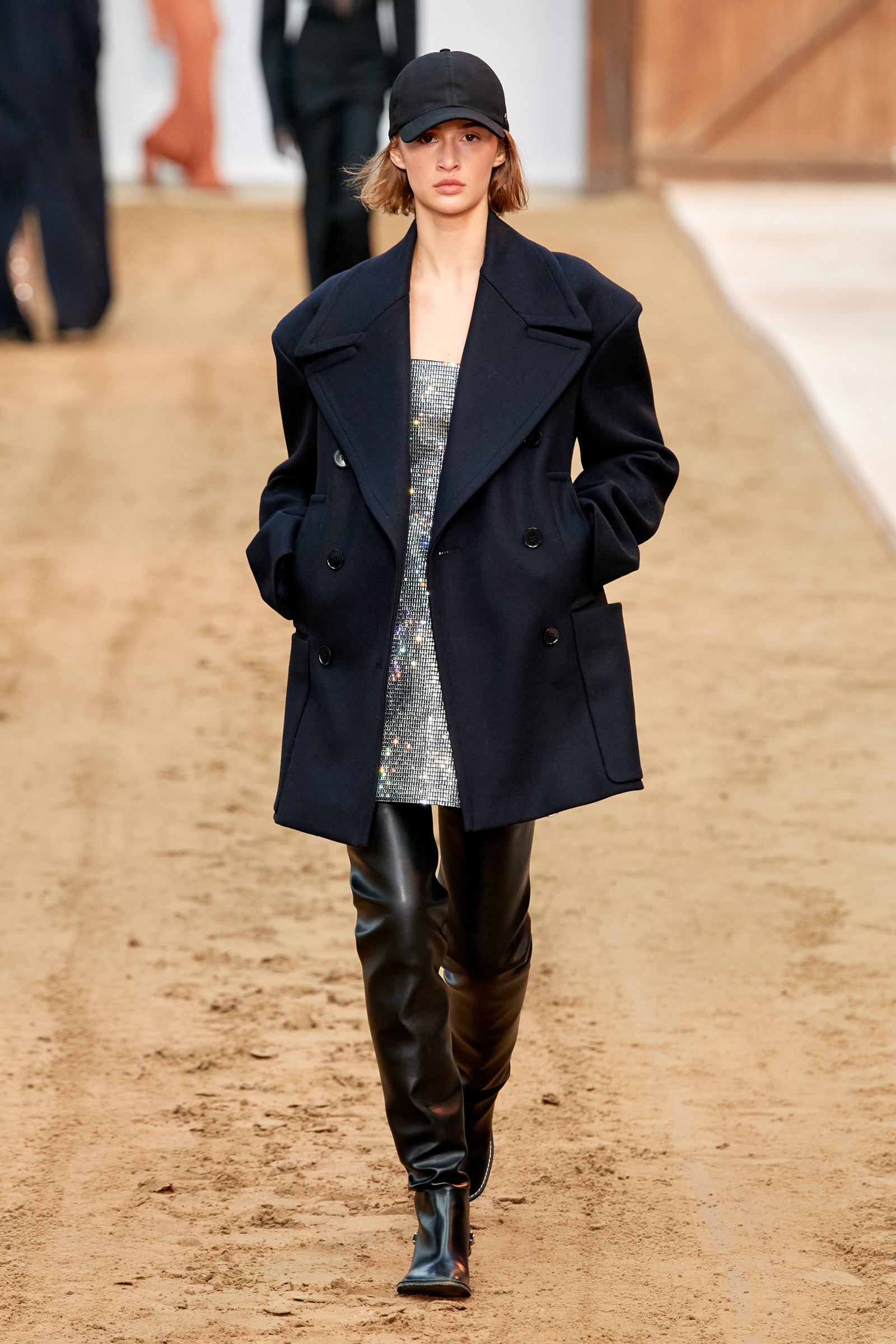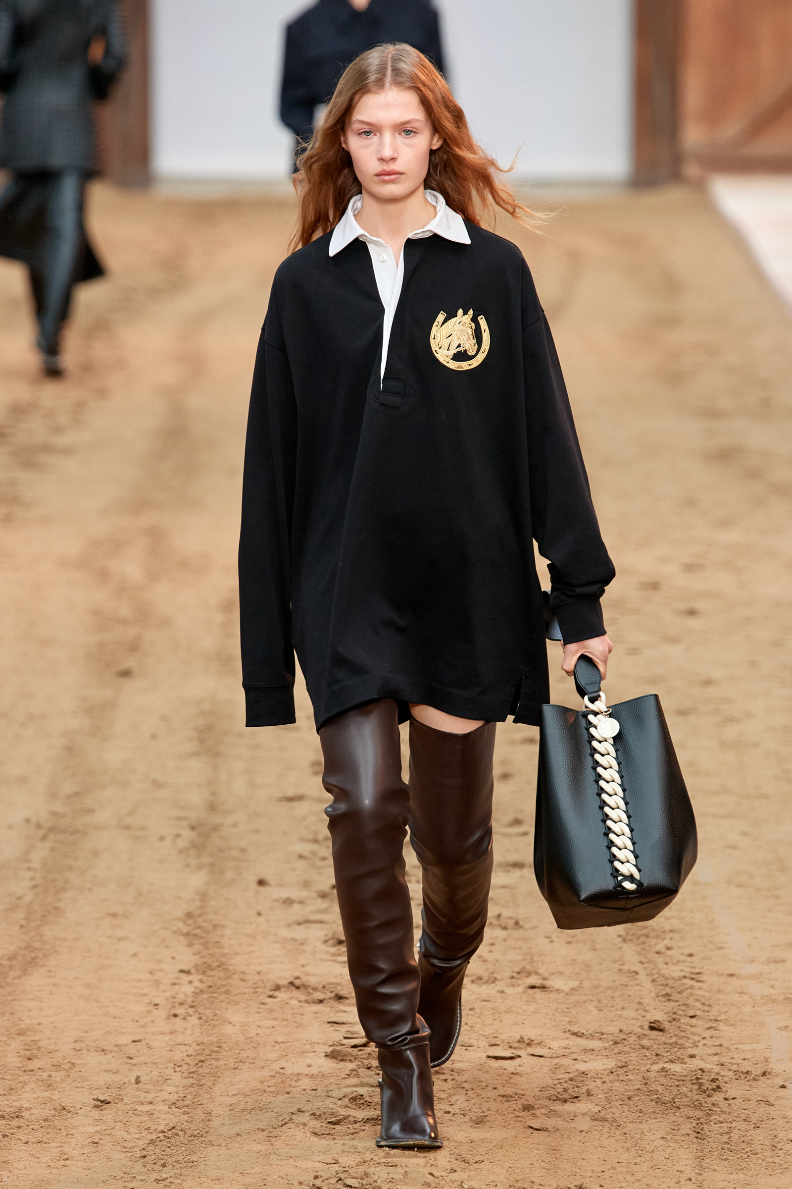 McCartney is vegan, but also someone who believes in harmonious relationships between humans and animals. Her mother Linda bred Appaloosa horses, and to this day, the designer still rides. She has a horse named Summer and keeps dogs, too. “I have a farm in the country and there’s still a hunt next door. I want to make people aware that that’s still going on. Yes, they may not rip it to pieces with dogs, but they shoot the fox. It’s just crazy to me,” she said. Her collection was an exercise in claiming and re-appropriating the codes of the British equestrian wardrobes associated with hunting and the warhorses of the Great War, and all the things McCartney doesn’t believe in.