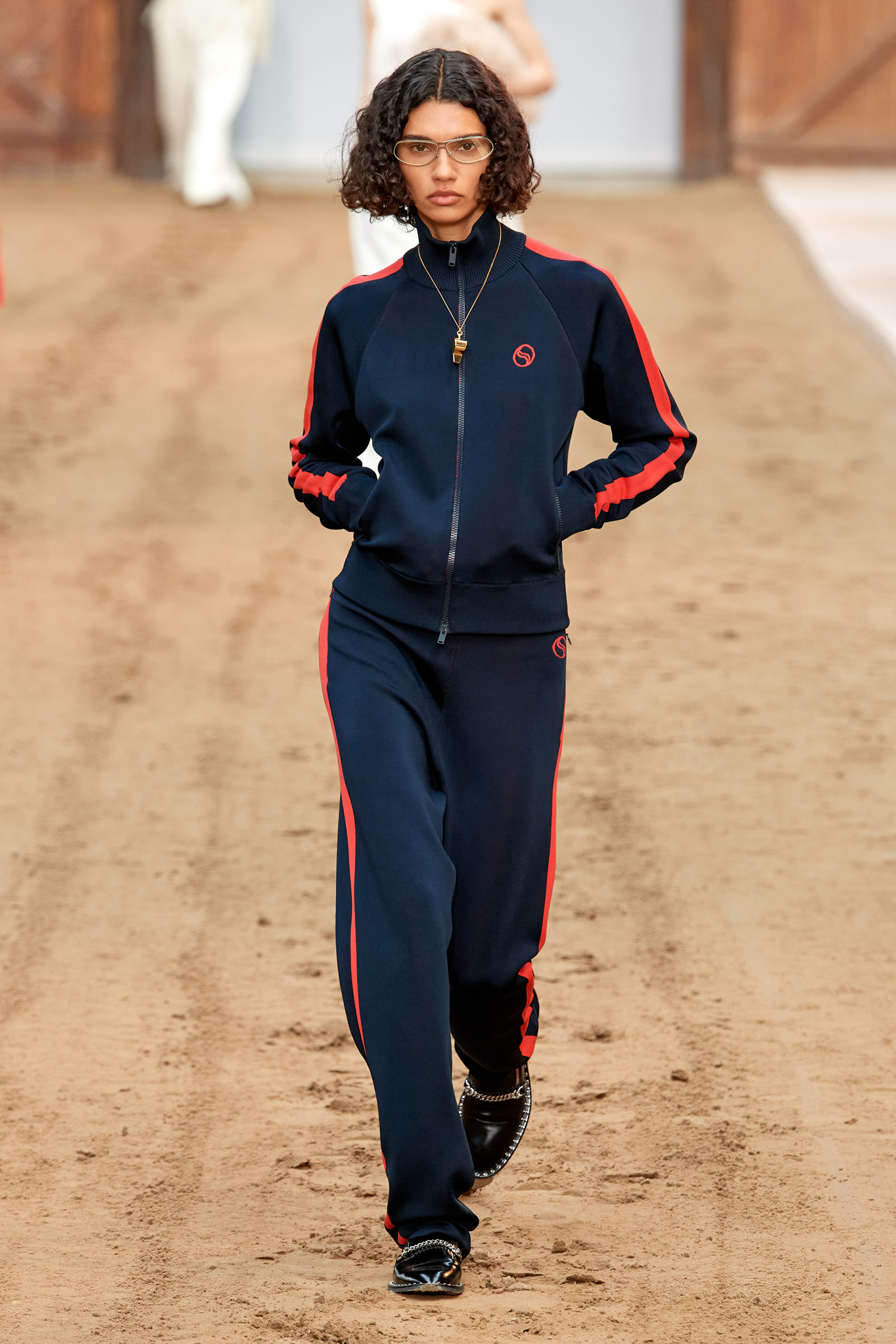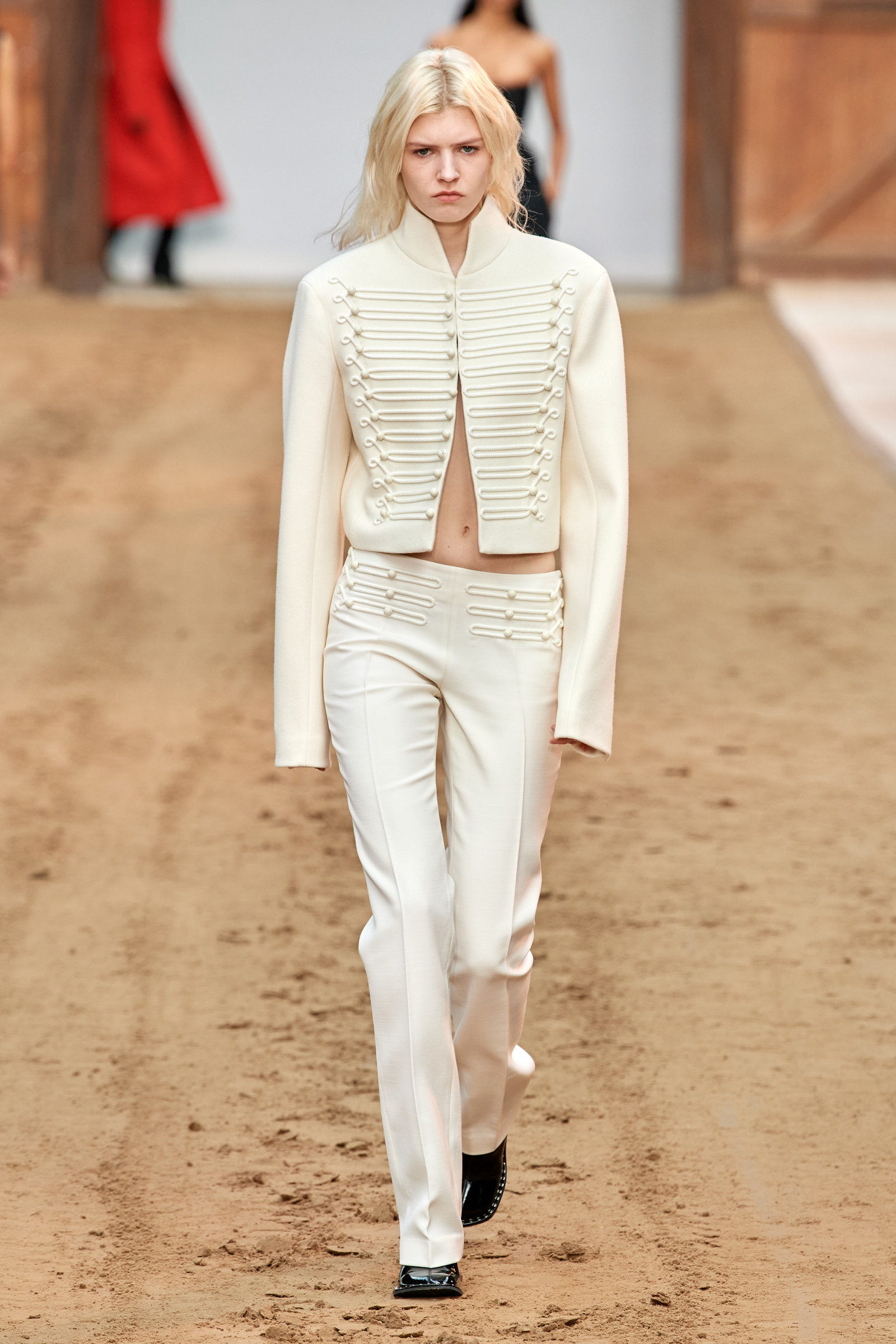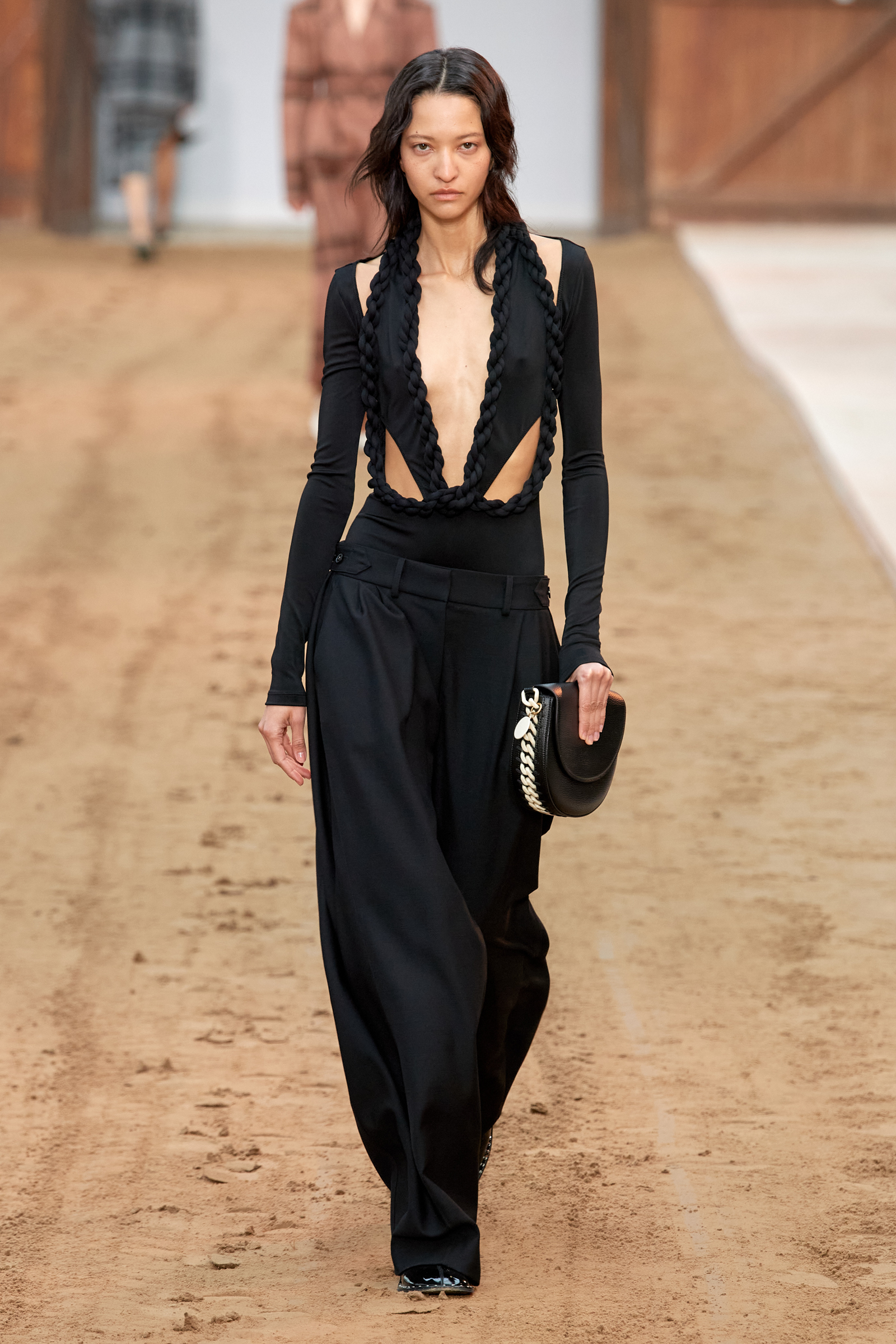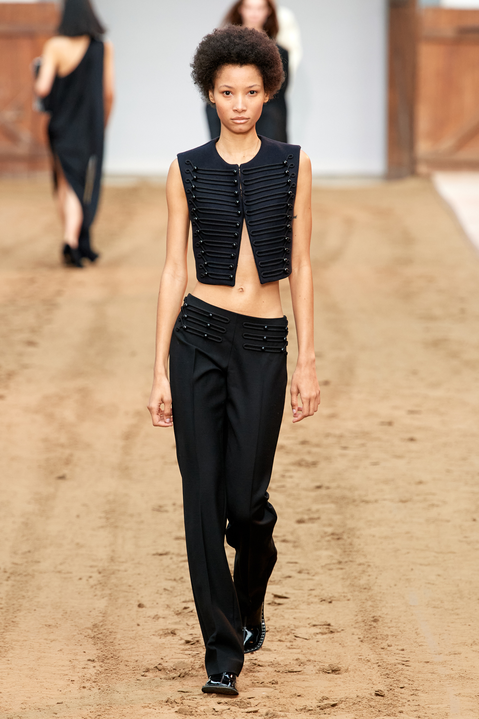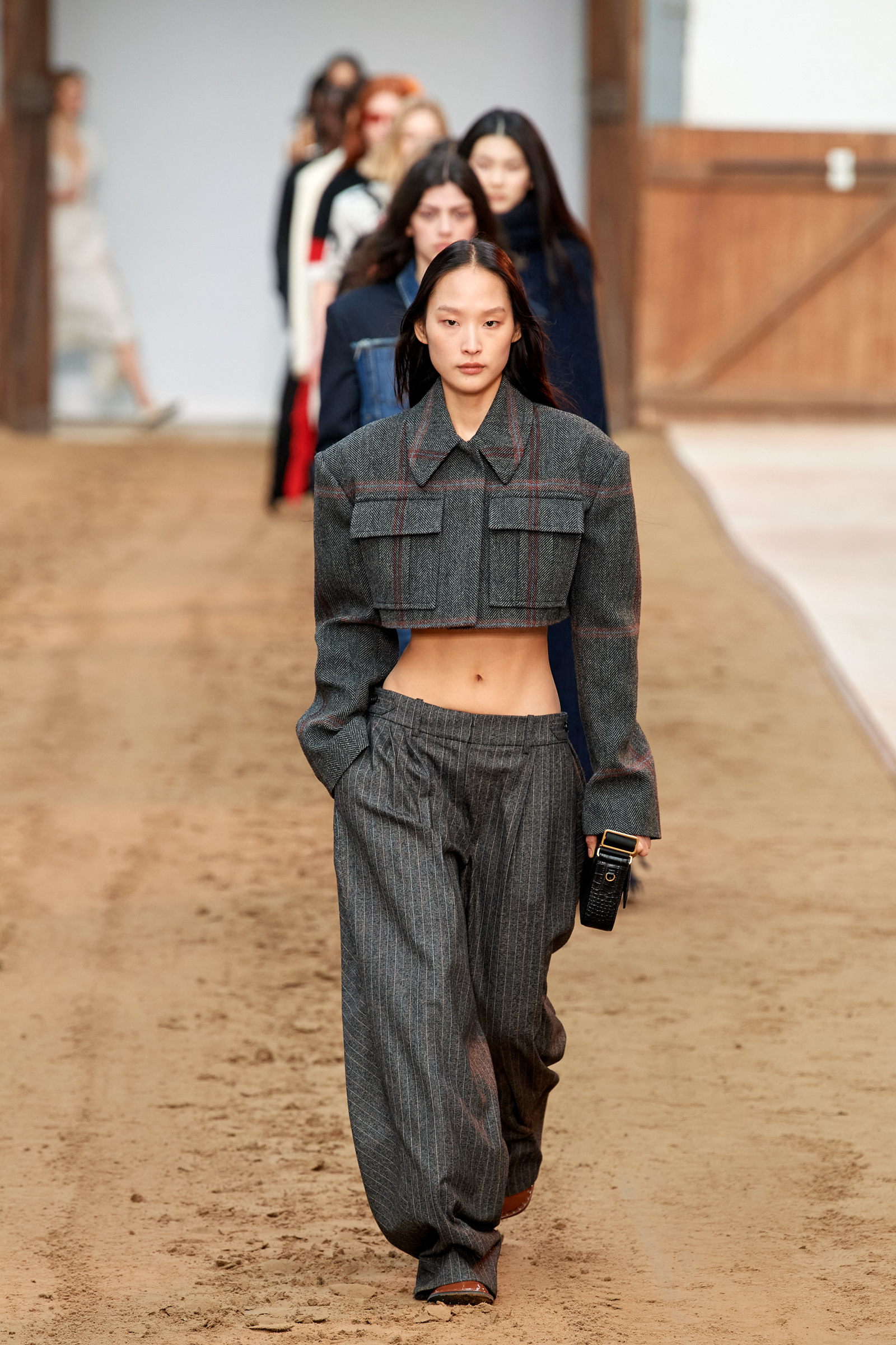 “It’s beautiful: the tailoring, the bespoke work. As someone who studied that for many years, you can’t get away from it,” she said, reflecting on those uniforms. “The relationship between the man and the woman and the horse and nature, it’s this kind of pull-and-push, and I think there’s a poetry at the center of it all.” McCartney applied her equestrian grammar to the Y2K language of her own fashion history, which she first re-introduced last season. The fusion materialized in skimpy hussar jackets, little cropped vests, deconstructed denim suits from another equestrian culture, and low-riding trousers that infused McCartney’s Chloé-era draped hip chains with fresh tack associations.