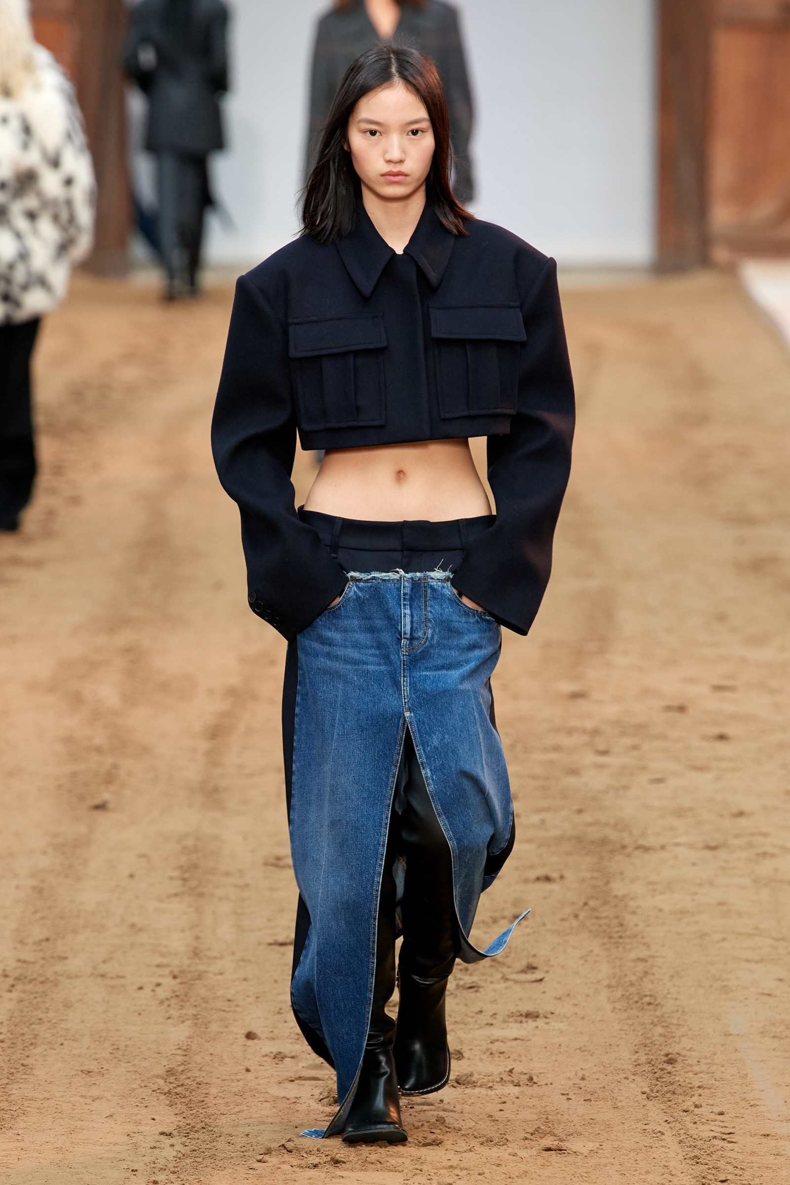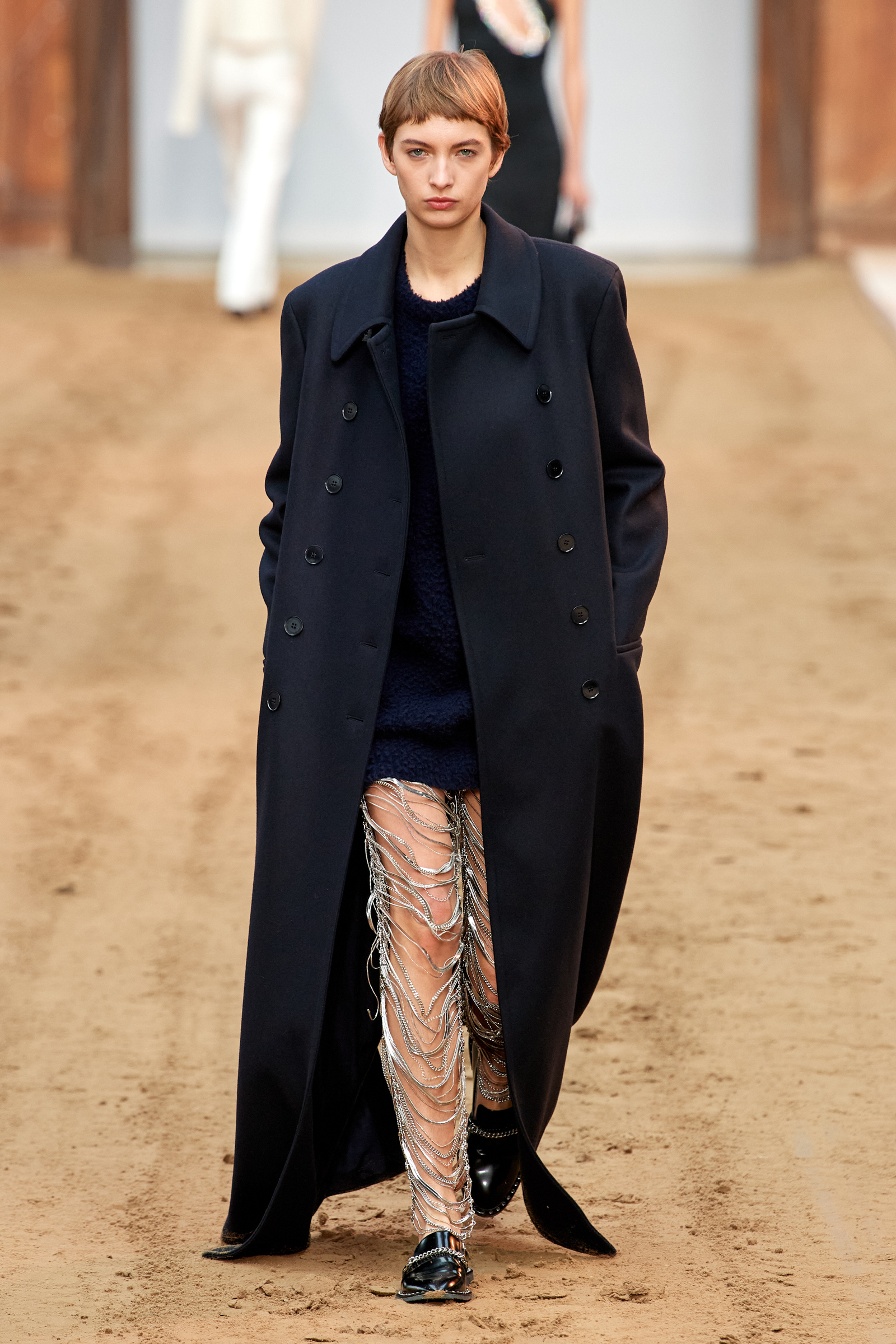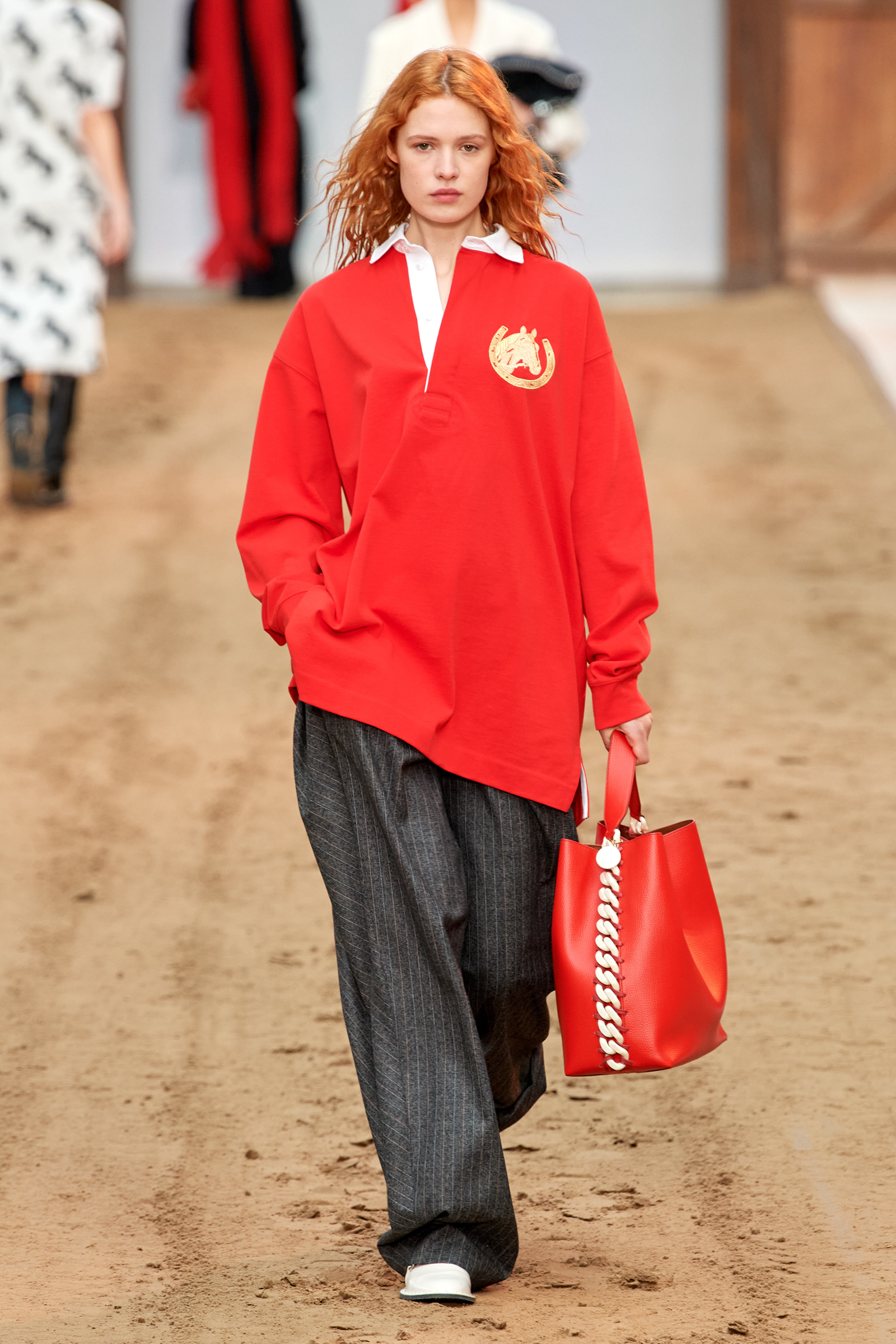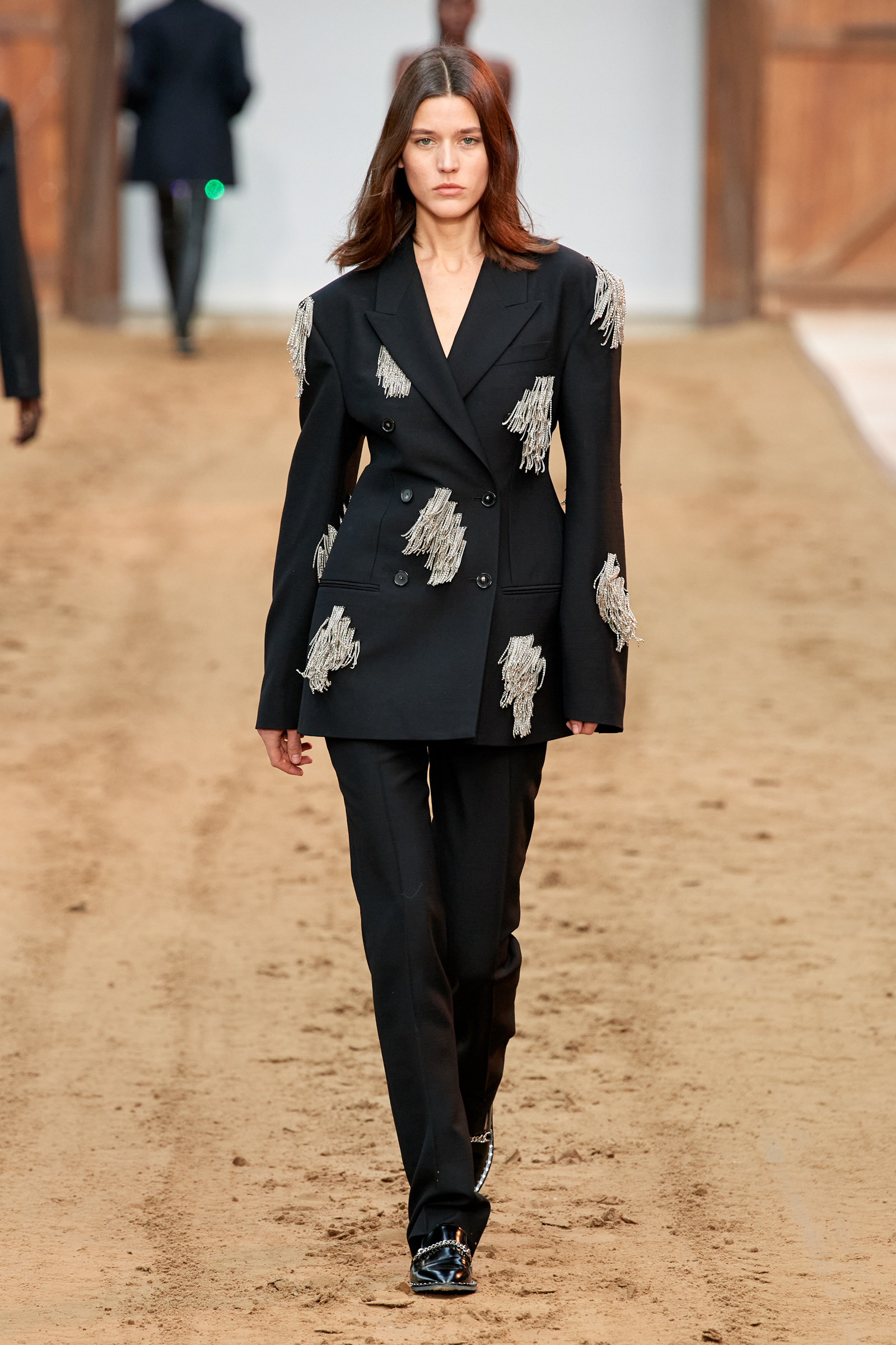 “It’s beautiful: the tailoring, the bespoke work. As someone who studied that for many years, you can’t get away from it,” she said, reflecting on those uniforms. “The relationship between the man and the woman and the horse and nature, it’s this kind of pull-and-push, and I think there’s a poetry at the center of it all.” McCartney applied her equestrian grammar to the Y2K language of her own fashion history, which she first re-introduced last season. The fusion materialized in skimpy hussar jackets, little cropped vests, deconstructed denim suits from another equestrian culture, and low-riding trousers that infused McCartney’s Chloé-era draped hip chains with fresh tack associations.