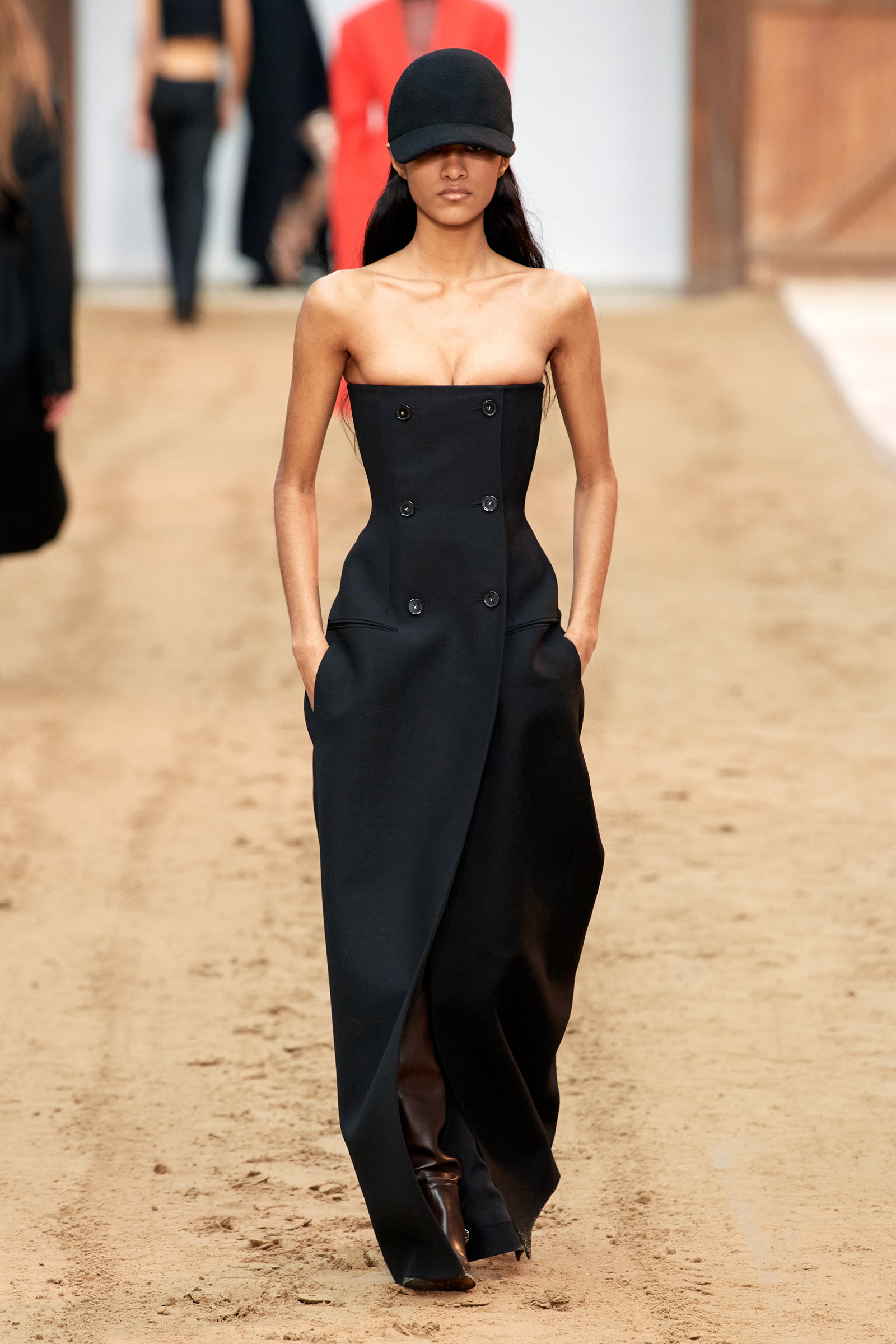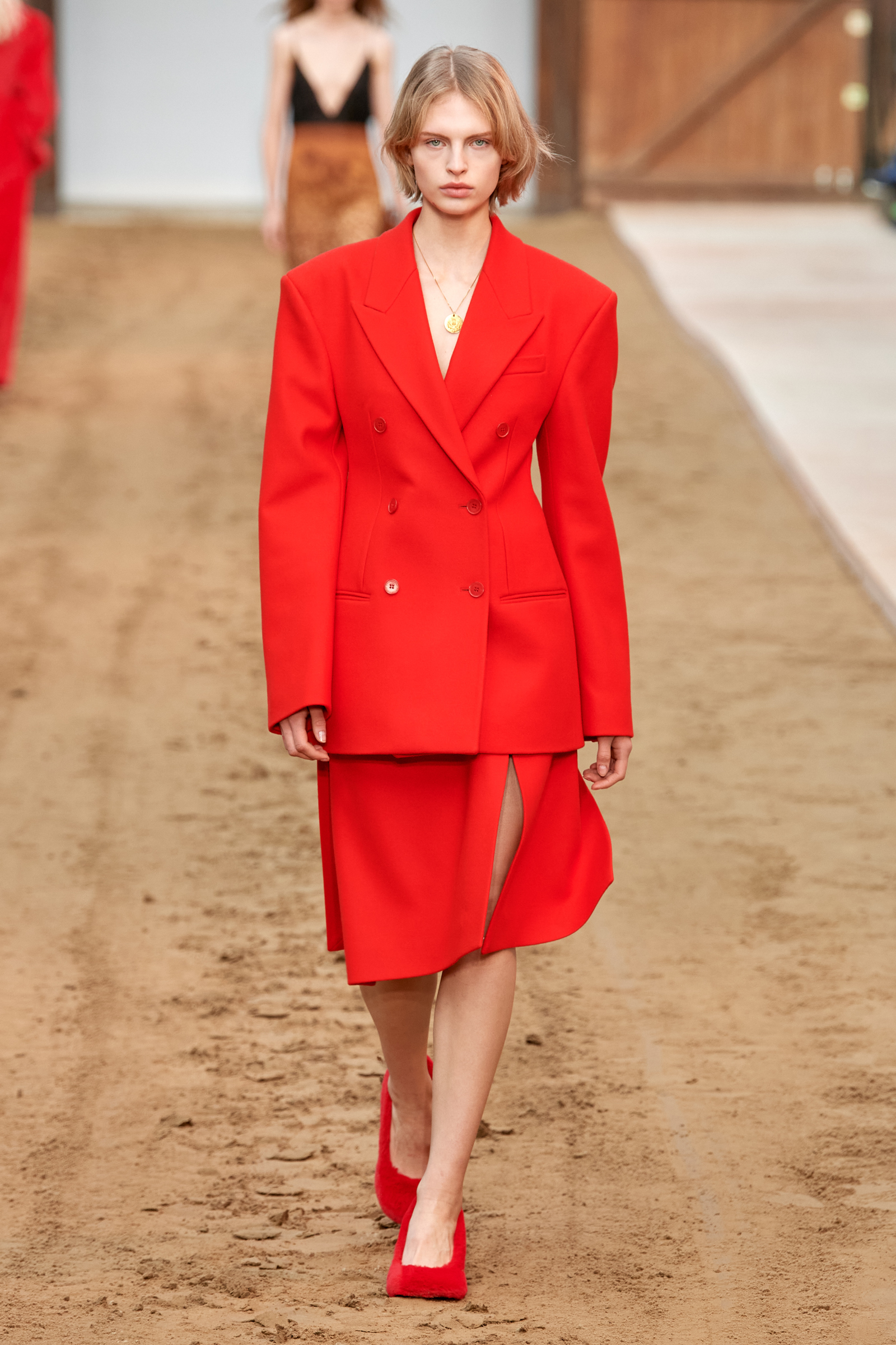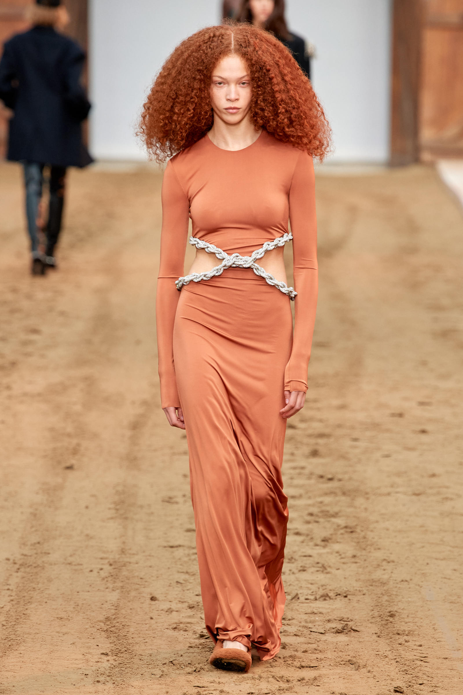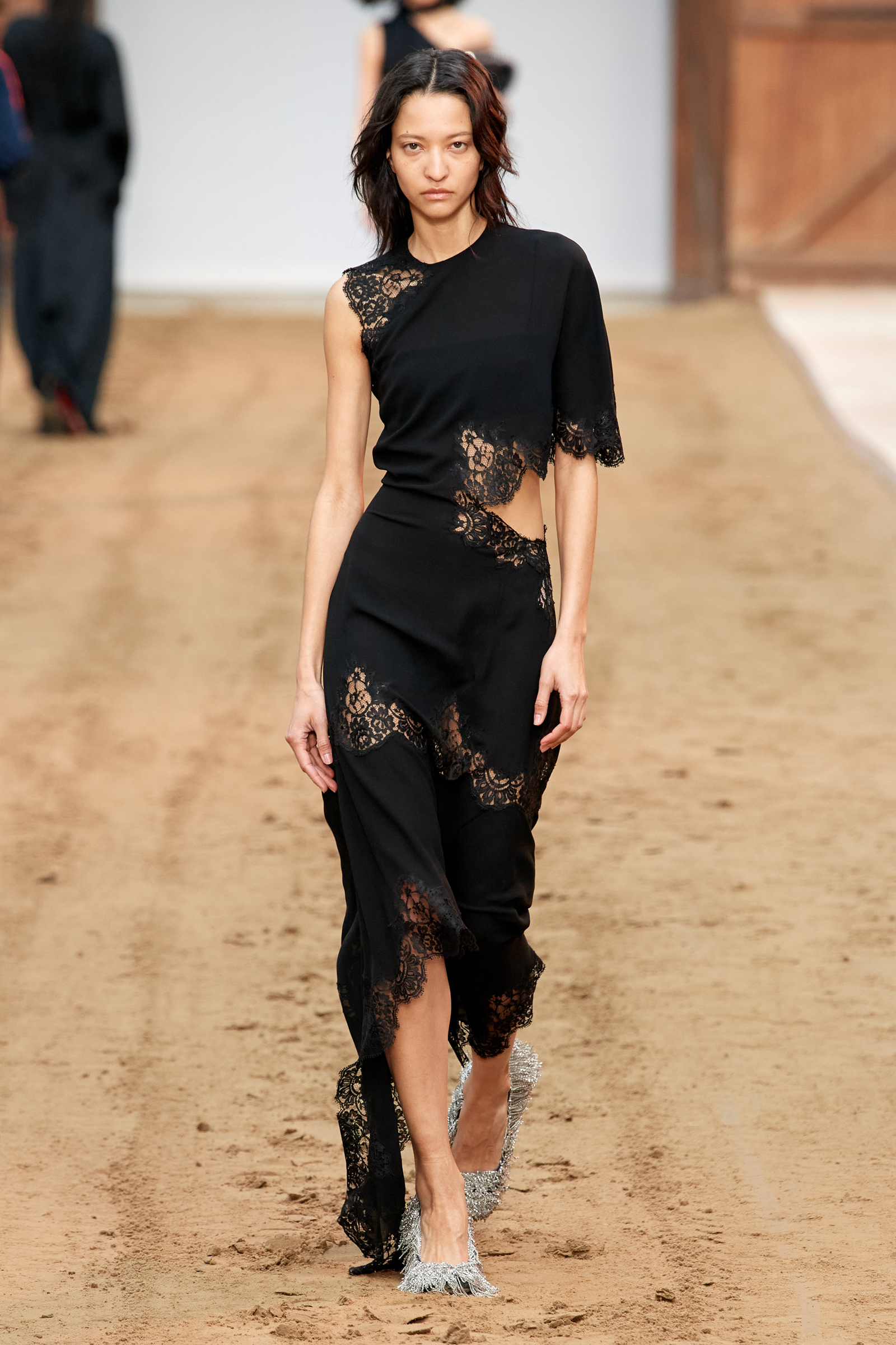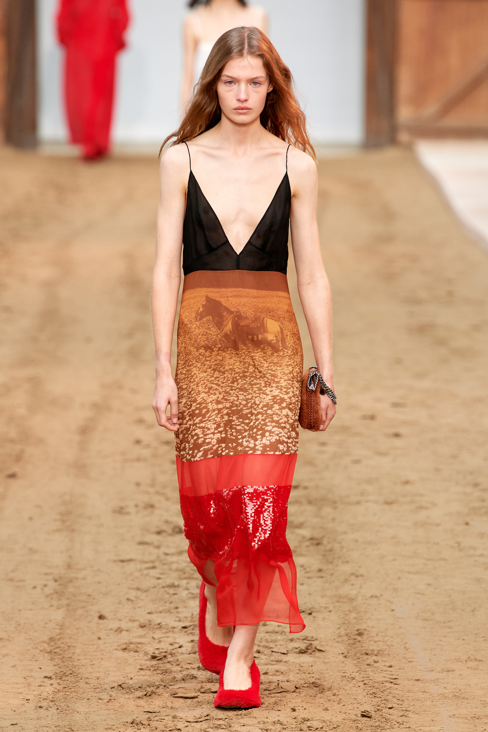 “It’s beautiful: the tailoring, the bespoke work. As someone who studied that for many years, you can’t get away from it,” she said, reflecting on those uniforms. “The relationship between the man and the woman and the horse and nature, it’s this kind of pull-and-push, and I think there’s a poetry at the center of it all.” McCartney applied her equestrian grammar to the Y2K language of her own fashion history, which she first re-introduced last season. The fusion materialized in skimpy hussar jackets, little cropped vests, deconstructed denim suits from another equestrian culture, and low-riding trousers that infused McCartney’s Chloé-era draped hip chains with fresh tack associations.