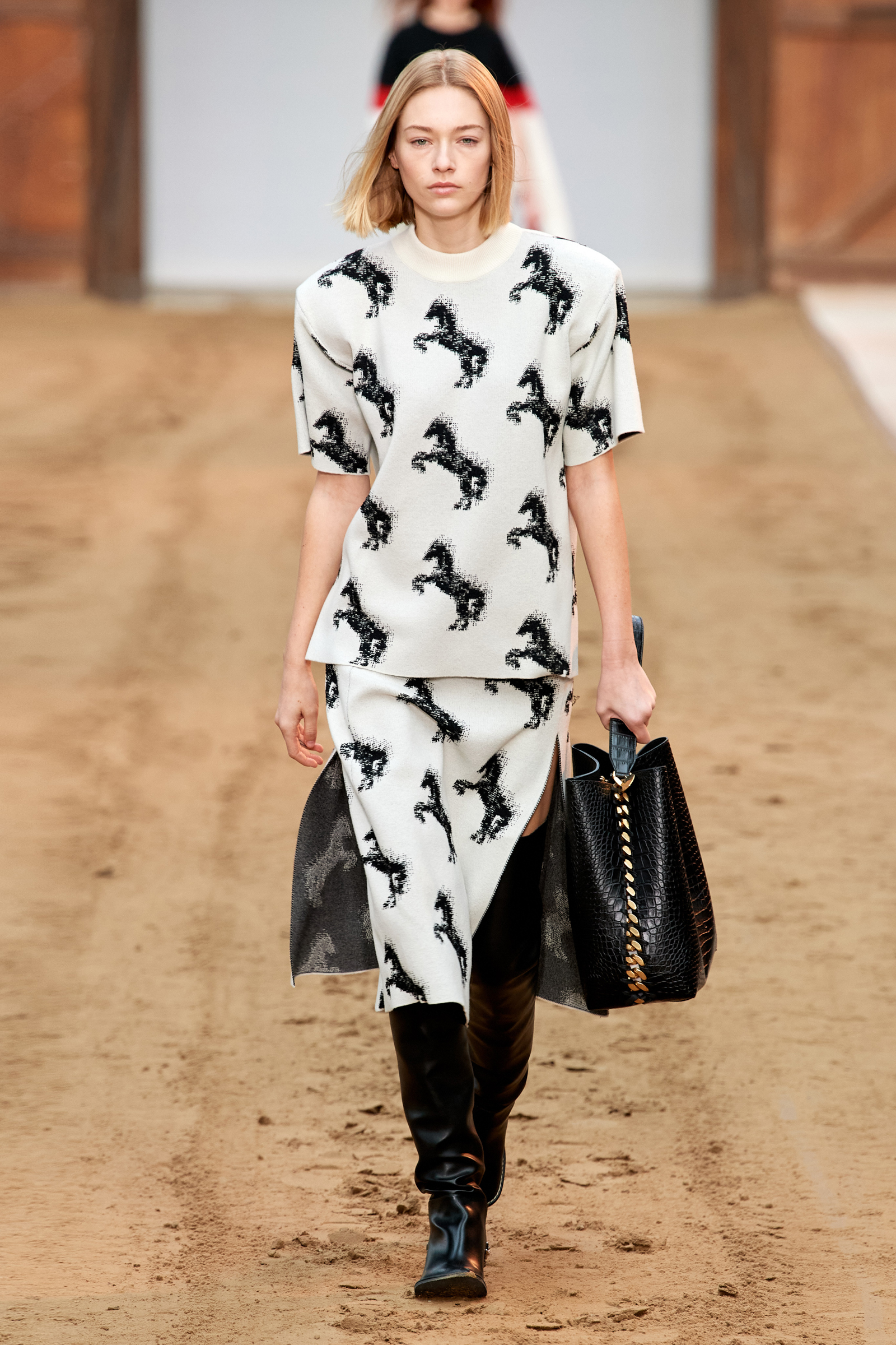 Asked to elaborate on the relationship between the collection and horses, McCartney smiled: “I guess the main relationship is that they’re alive and the clothes haven’t killed anything. There’s a celebration of everyone living in harmony together.” Next to an exhaustive list of the sustainable materials that made up the collection (too long to mention but accessible on her website), she enforced that philosophy in three new handbags created from state-of-the-art alternatives to animal leather: one from the plant-based, plastic-free and circular material MIRIUM; another crafted in croc-effect AppleSkin made from apple waste; and the first-ever bag made from a white version of the mushroom material Mylo.