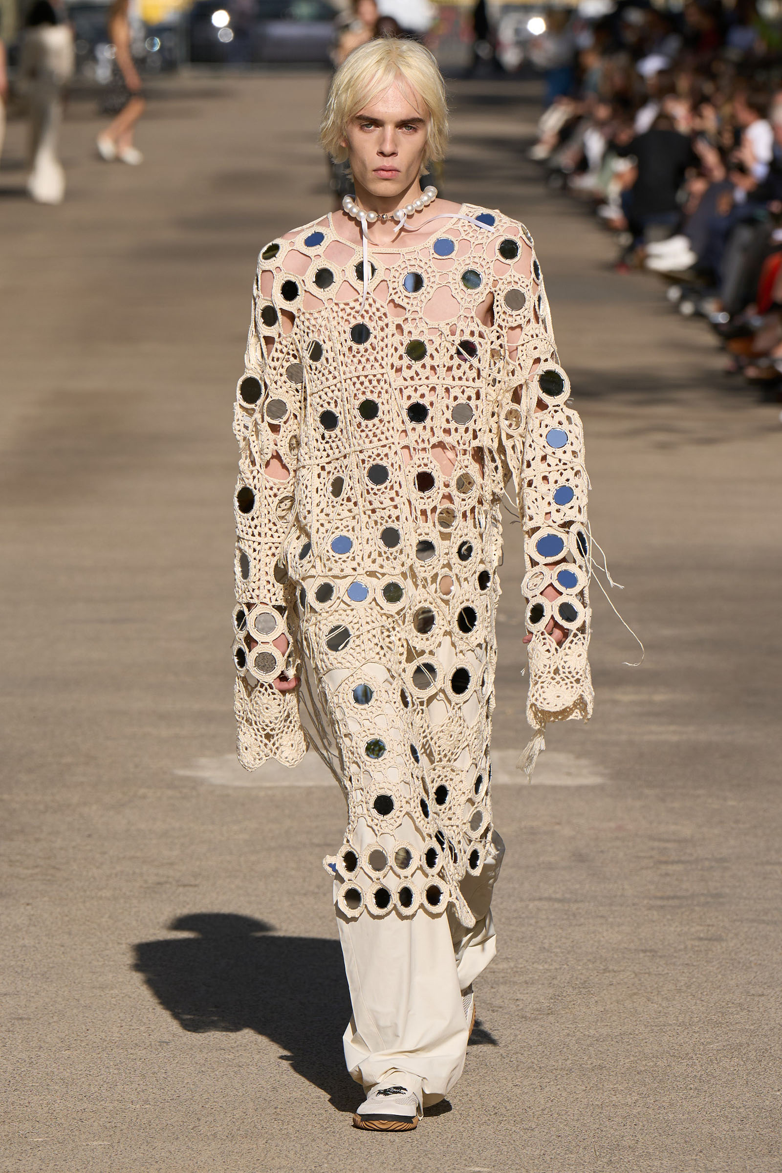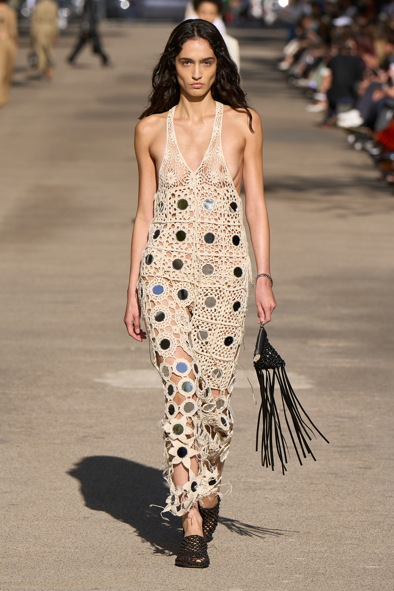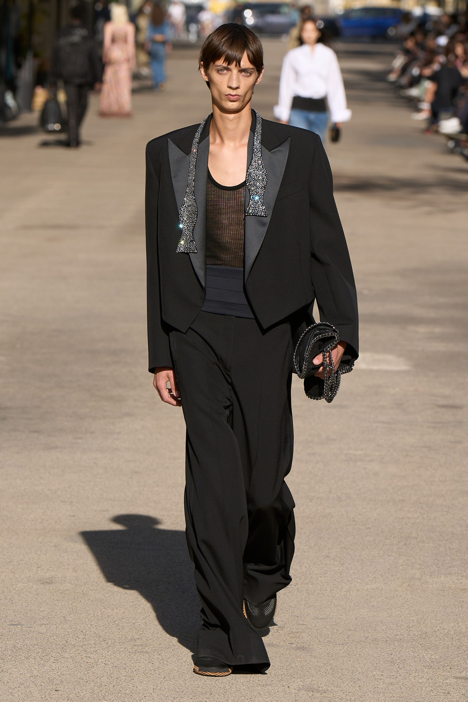 From her father (whose fab wardrobe is one of the many things that made Peter Jackson’s Beatles documentary such fun to watch) came the tuxedo shirts and cummerbunds and a terrific look that combined a willowy vest and full trousers with a white blouse trailing long poet sleeves. Her late mother was the horseback-riding, vegetarian-cookbook-author free spirit and a photographer and musician besides. The mirror-embellished dresses crocheted from Keel Labs’s seaweed-based yarn Kelsun and worn by both genders tapped into her rebellious streak. Elsewhere, the cape-like backs of tops and dresses made with taffeta from Nona Source, the LVMH-backed deadstock platform, seemed to have been designed to evoke wings, while the brocade short-shorts looked like stage-ready tour costumes.