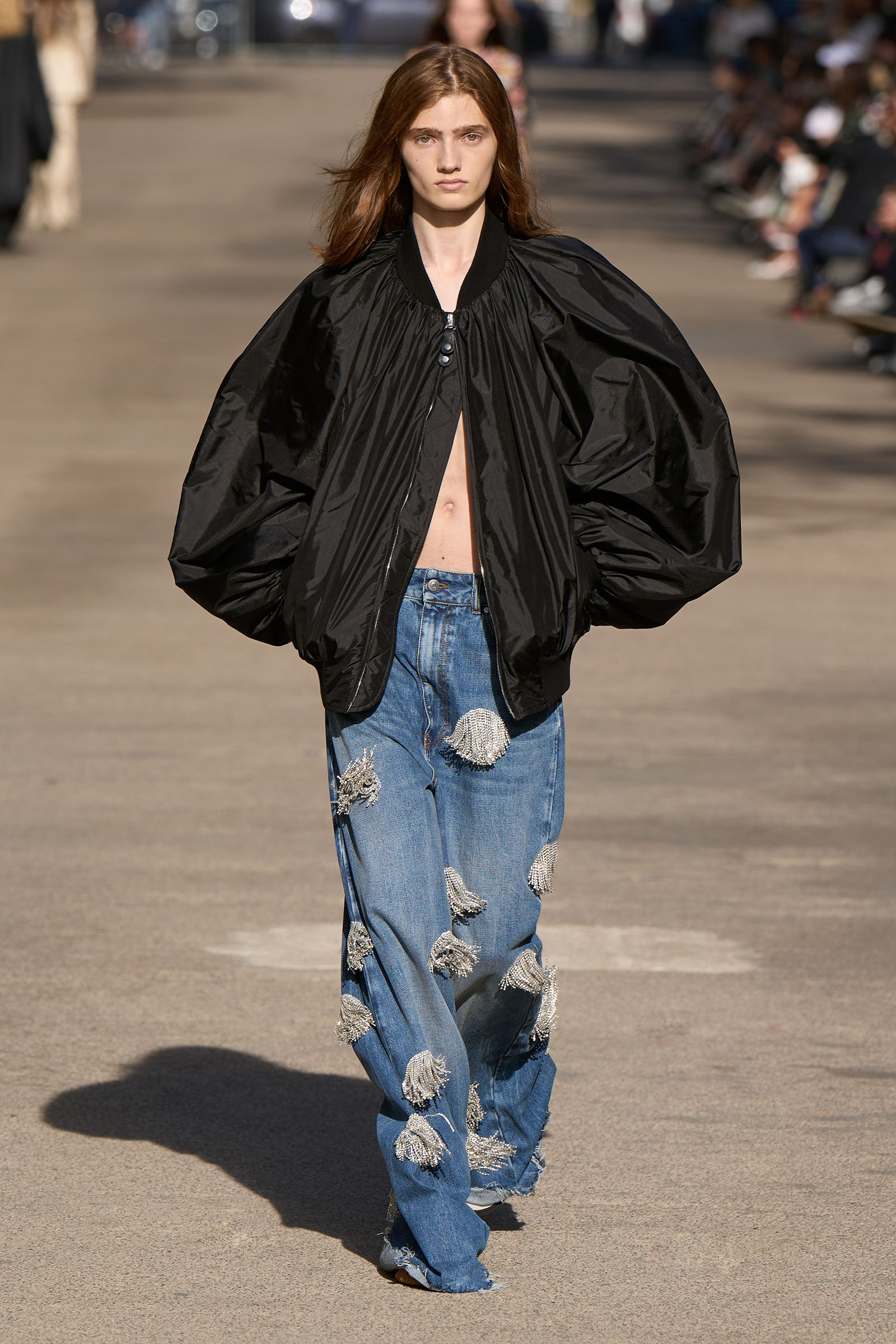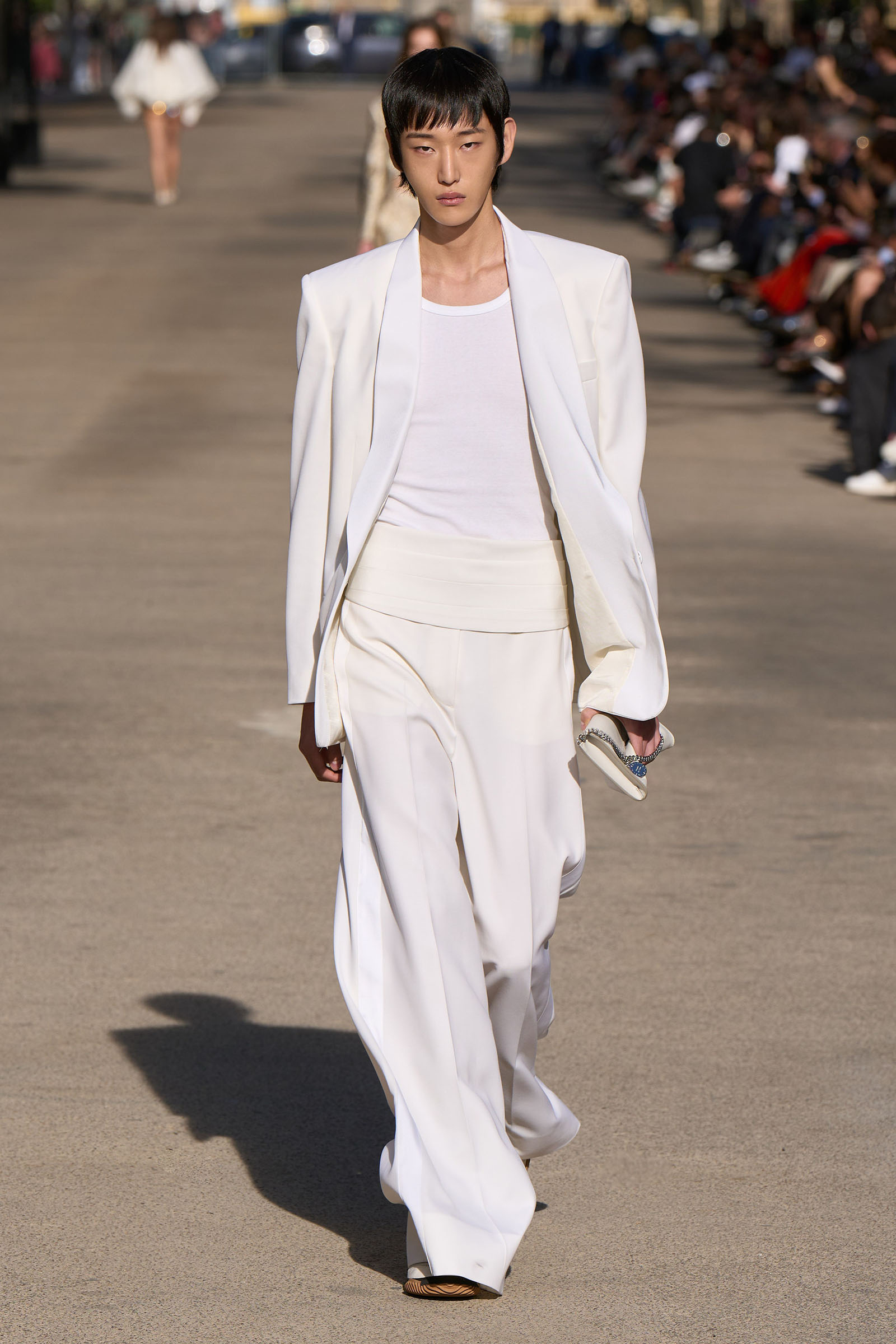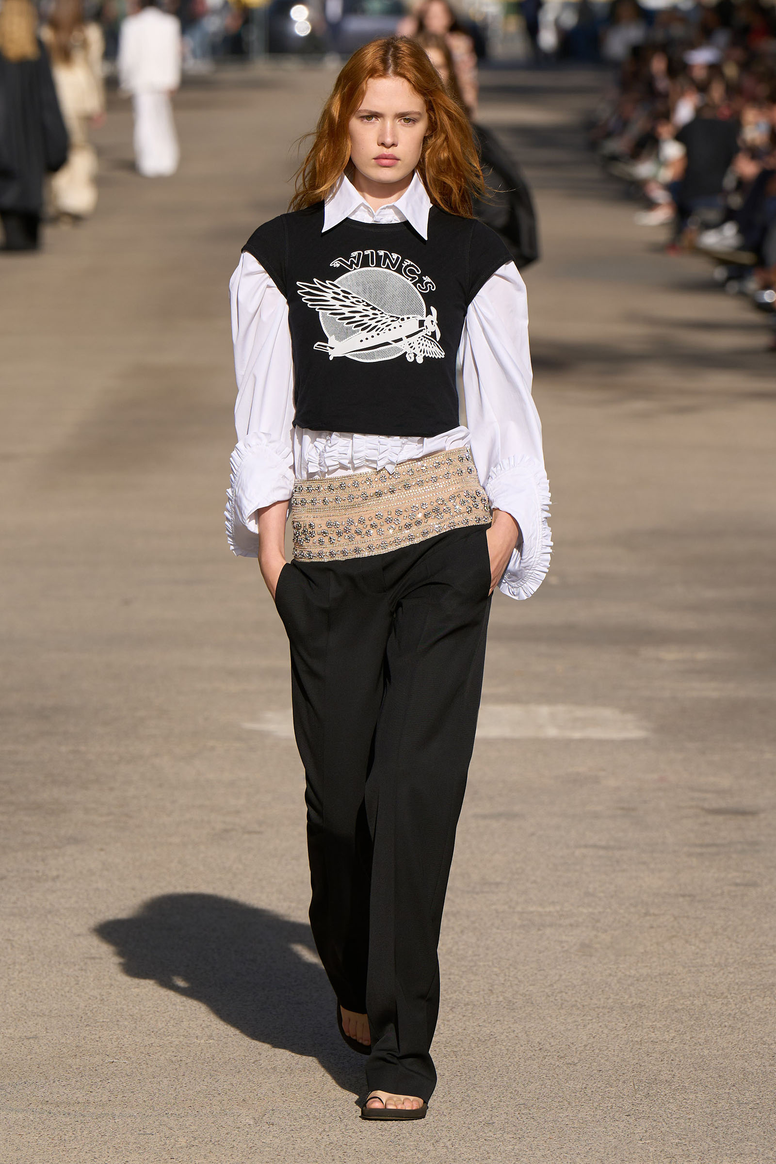 From her father (whose fab wardrobe is one of the many things that made Peter Jackson’s Beatles documentary such fun to watch) came the tuxedo shirts and cummerbunds and a terrific look that combined a willowy vest and full trousers with a white blouse trailing long poet sleeves. Her late mother was the horseback-riding, vegetarian-cookbook-author free spirit and a photographer and musician besides. The mirror-embellished dresses crocheted from Keel Labs’s seaweed-based yarn Kelsun and worn by both genders tapped into her rebellious streak. Elsewhere, the cape-like backs of tops and dresses made with taffeta from Nona Source, the LVMH-backed deadstock platform, seemed to have been designed to evoke wings, while the brocade short-shorts looked like stage-ready tour costumes.