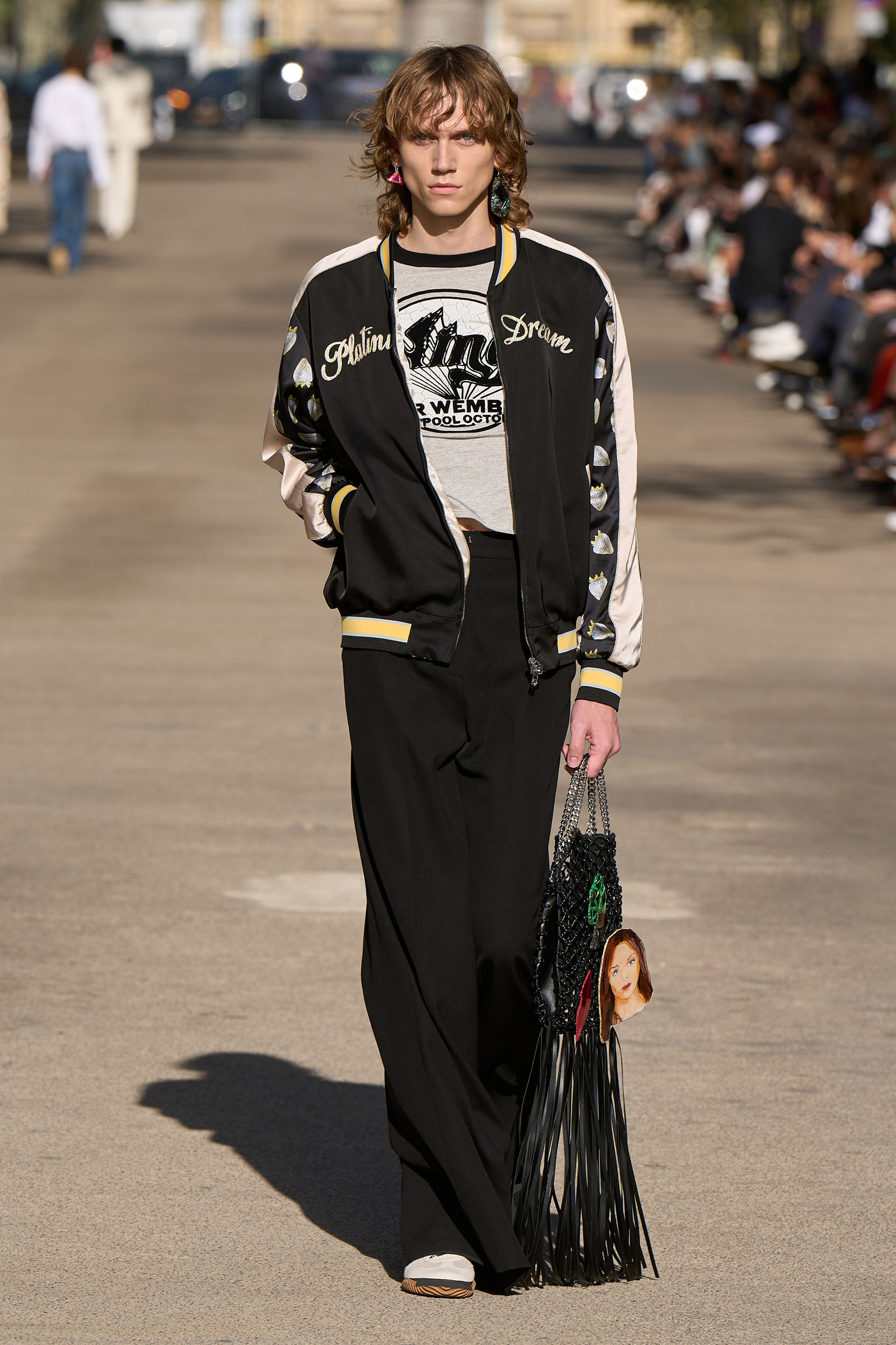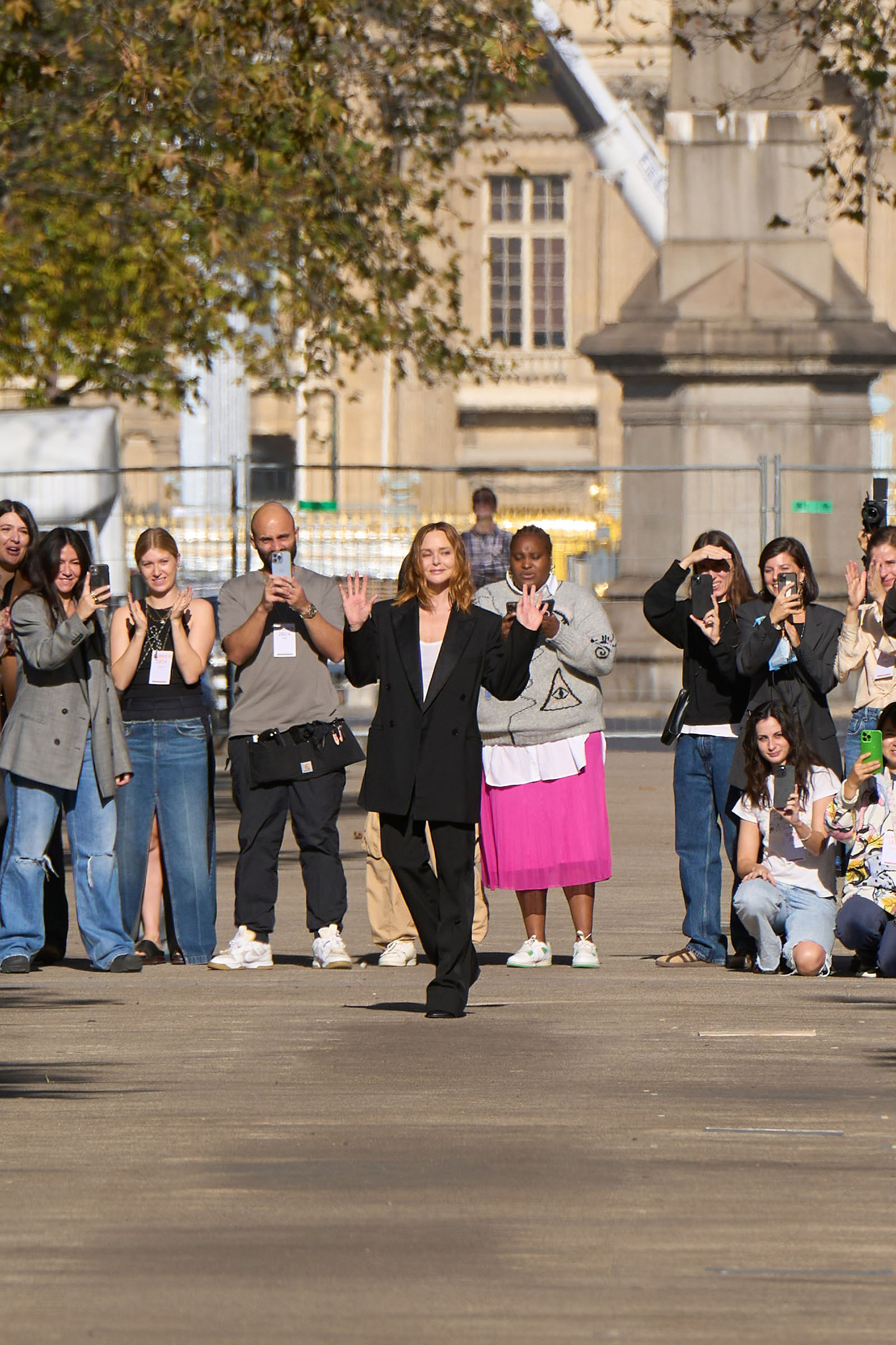 Stella McCartney set up her show at the Marché Saxe-Breteuil. On Thursdays and Saturdays it’s a popular open-air market, with vendors selling fresh produce, fish, cheese, bread, and flowers. Today there were representatives from companies pioneering new fabric technologies like NFW Mirum, which makes plant-based leather, and Keel Labs, which produces seaweed-based fibers; stashes of vintage Stella McCartney clothes and stacks of old records; and a merch stall dedicated to Wings, her mum and dad’s band. The market opened up to the public after the show, and all the money raised from sales will go to charities aligned with McCartney’s anti–animal cruelty, responsible-design philosophies.