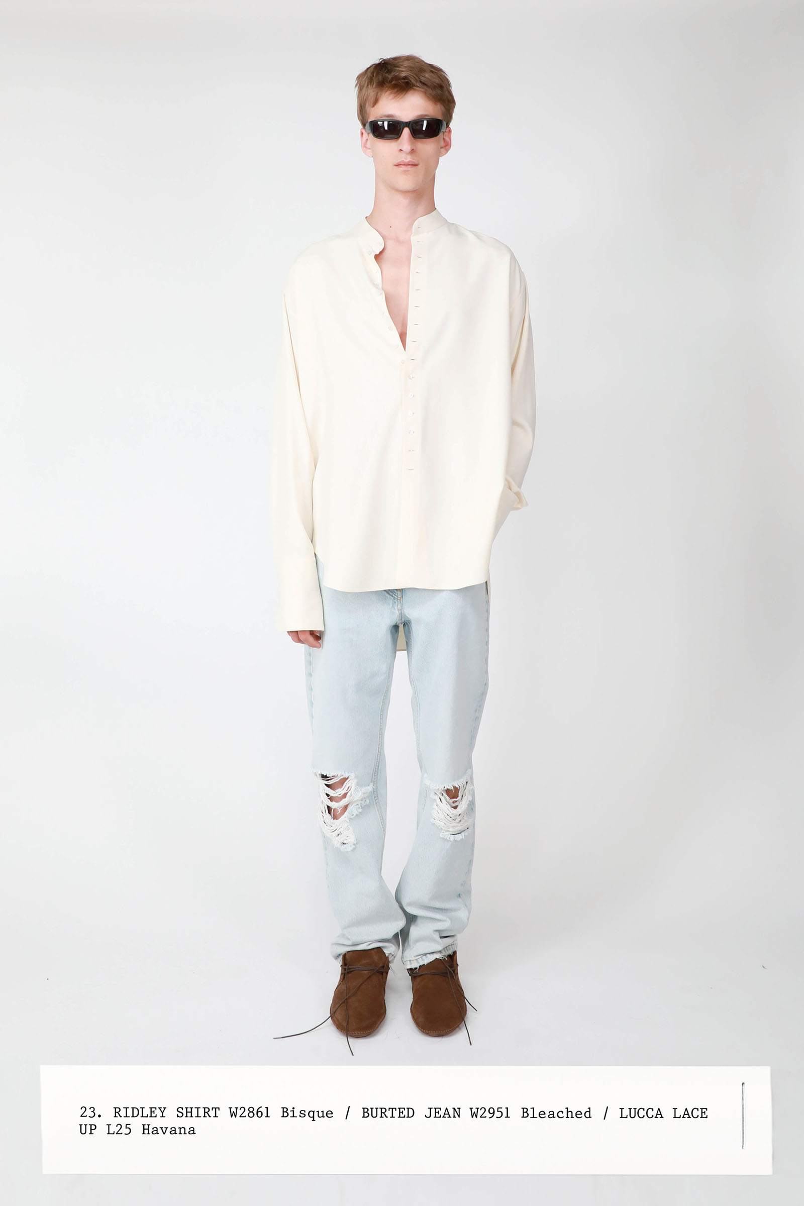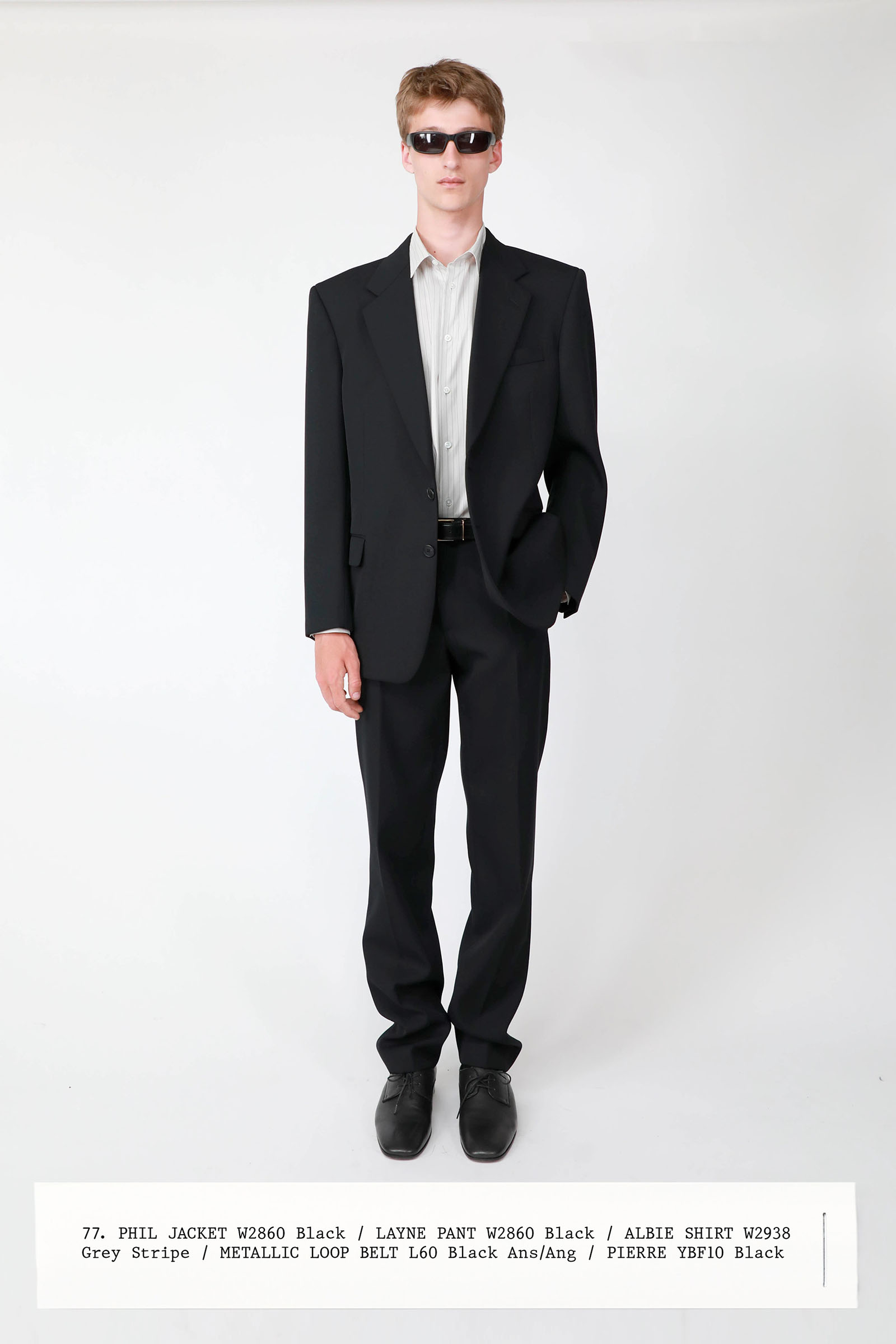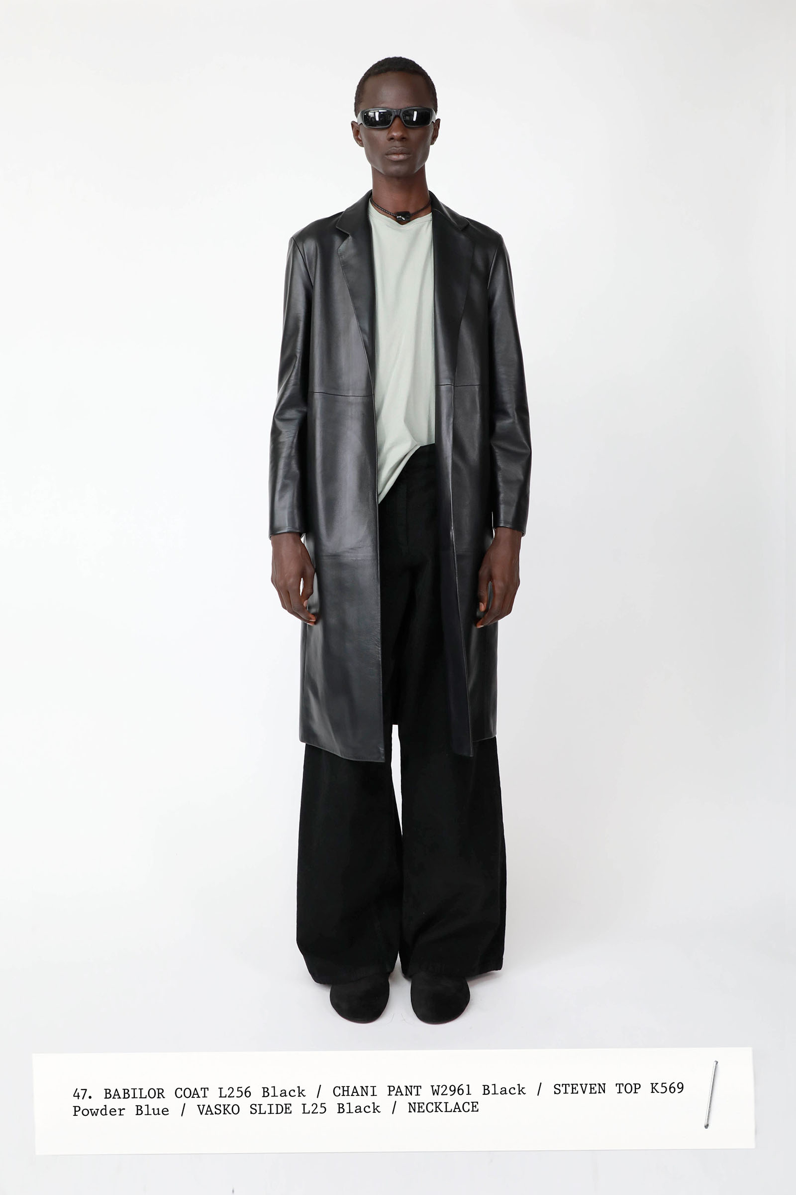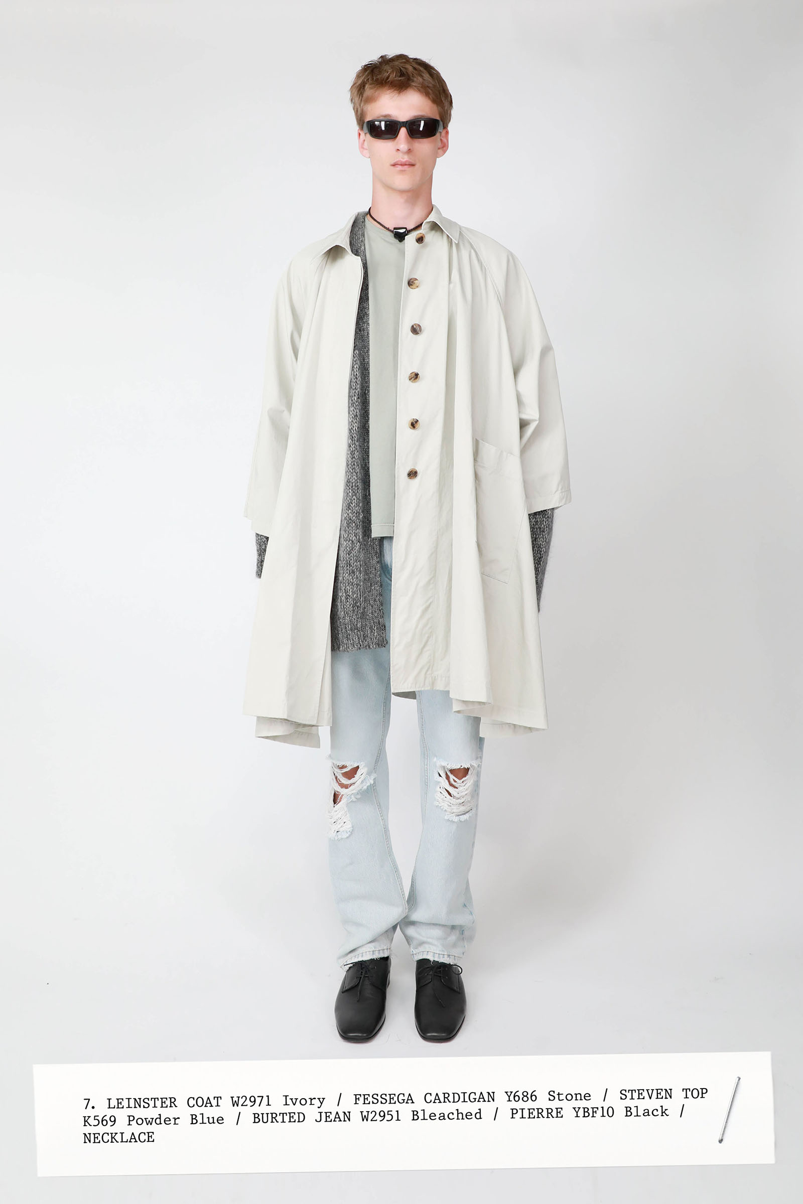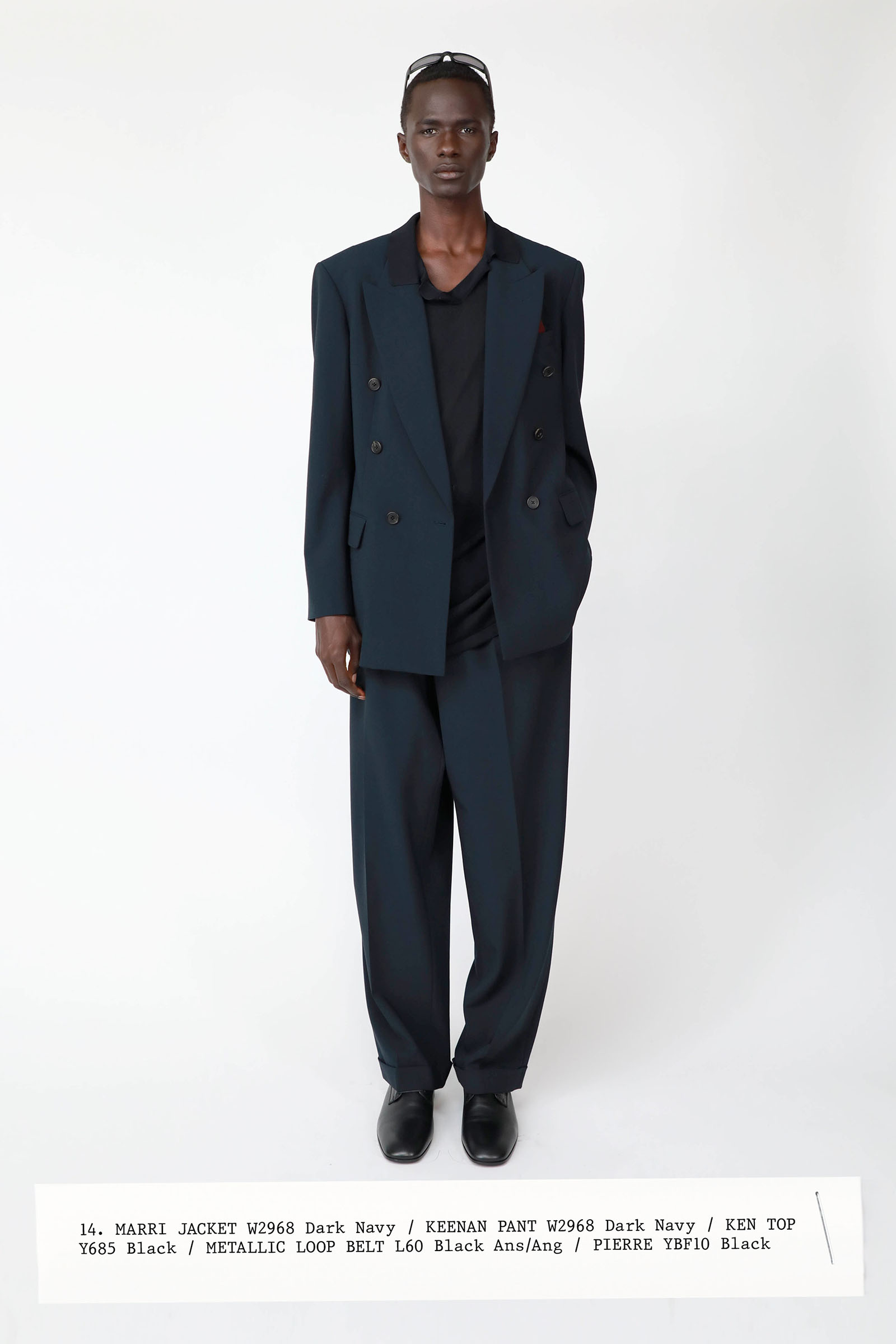 The collection was introduced with an explanation that an expanded range of men’s wear yielded pieces that overlapped with the women’s offer. Can you spot the knee-length, black leather trench that reappears throughout the lineup? The leisure shirts with their retro stripes? The jeans that have been skillfully shredded at the knees, enhancing their desirability? Note, too, how the tailoring that seemed intentionally boxy and generous on a female frame is as intentionally streamlined on the male counterpart.
