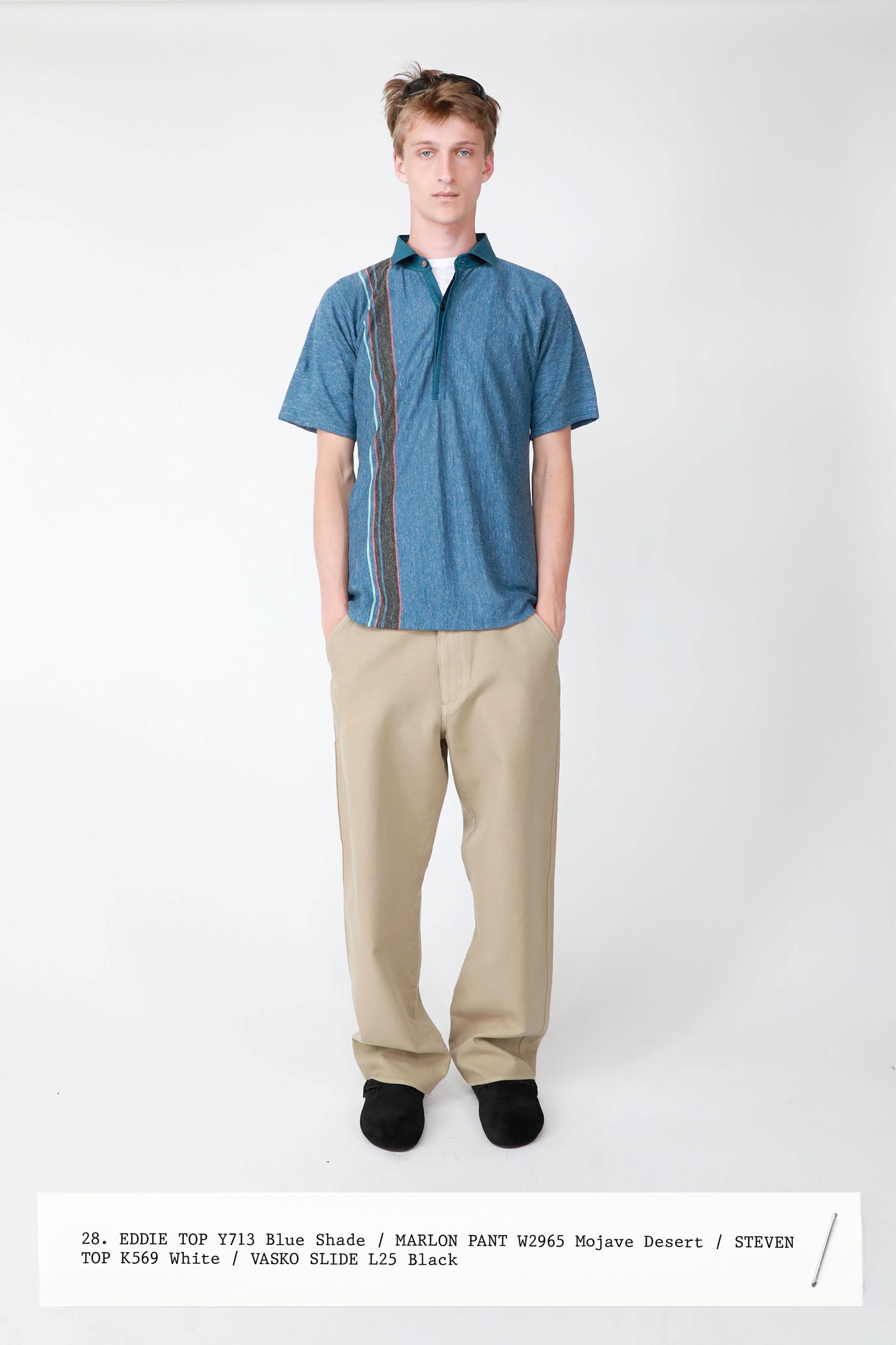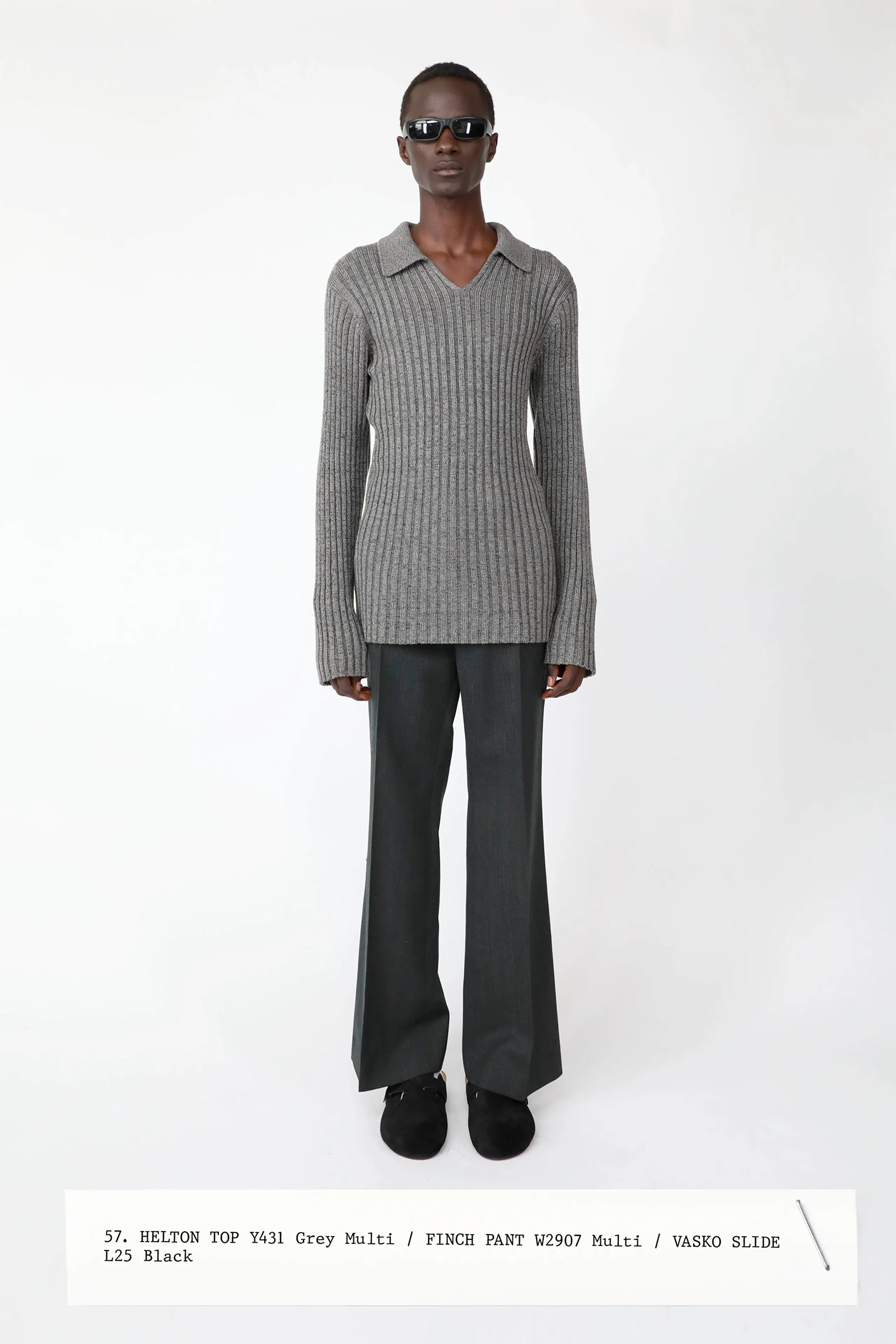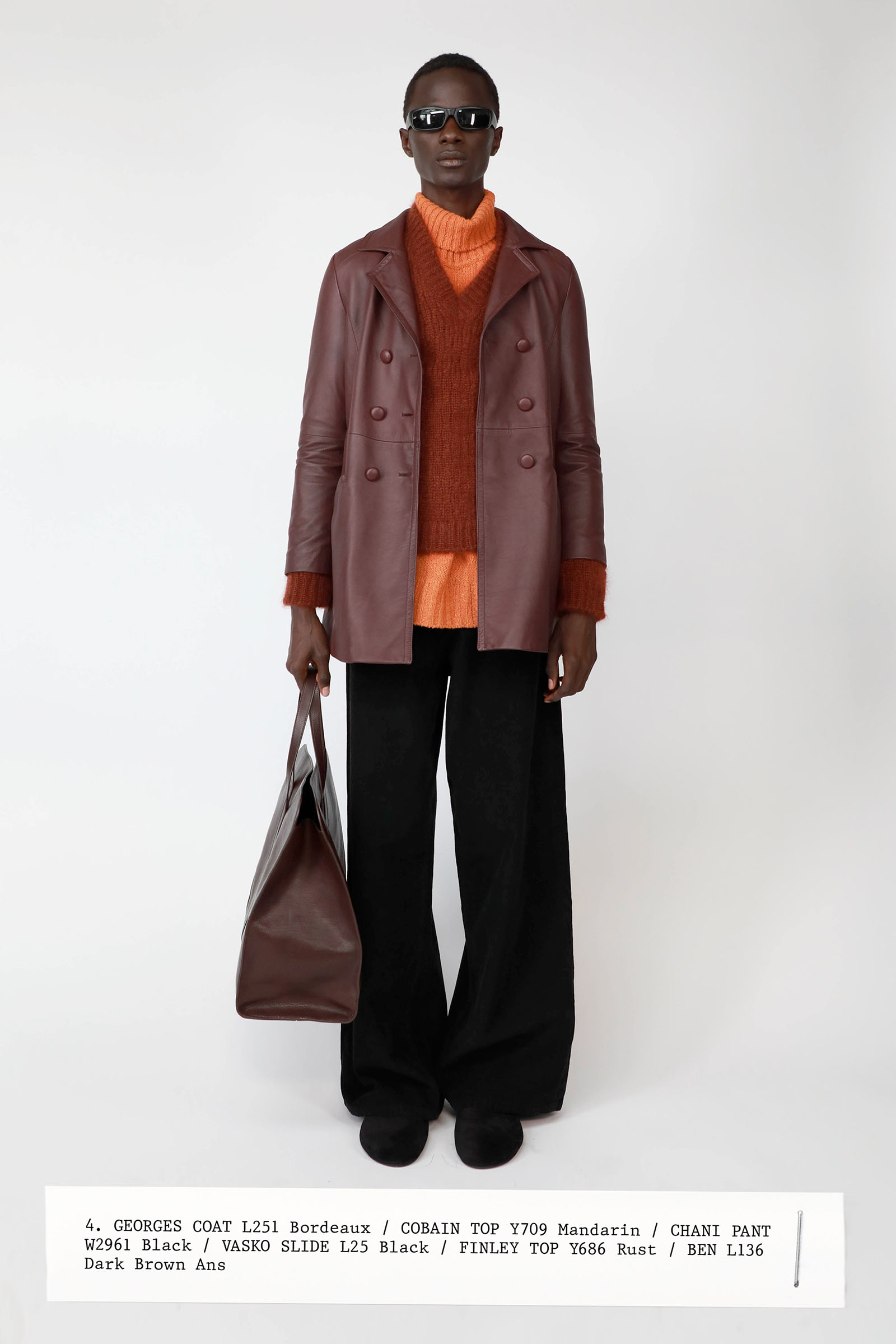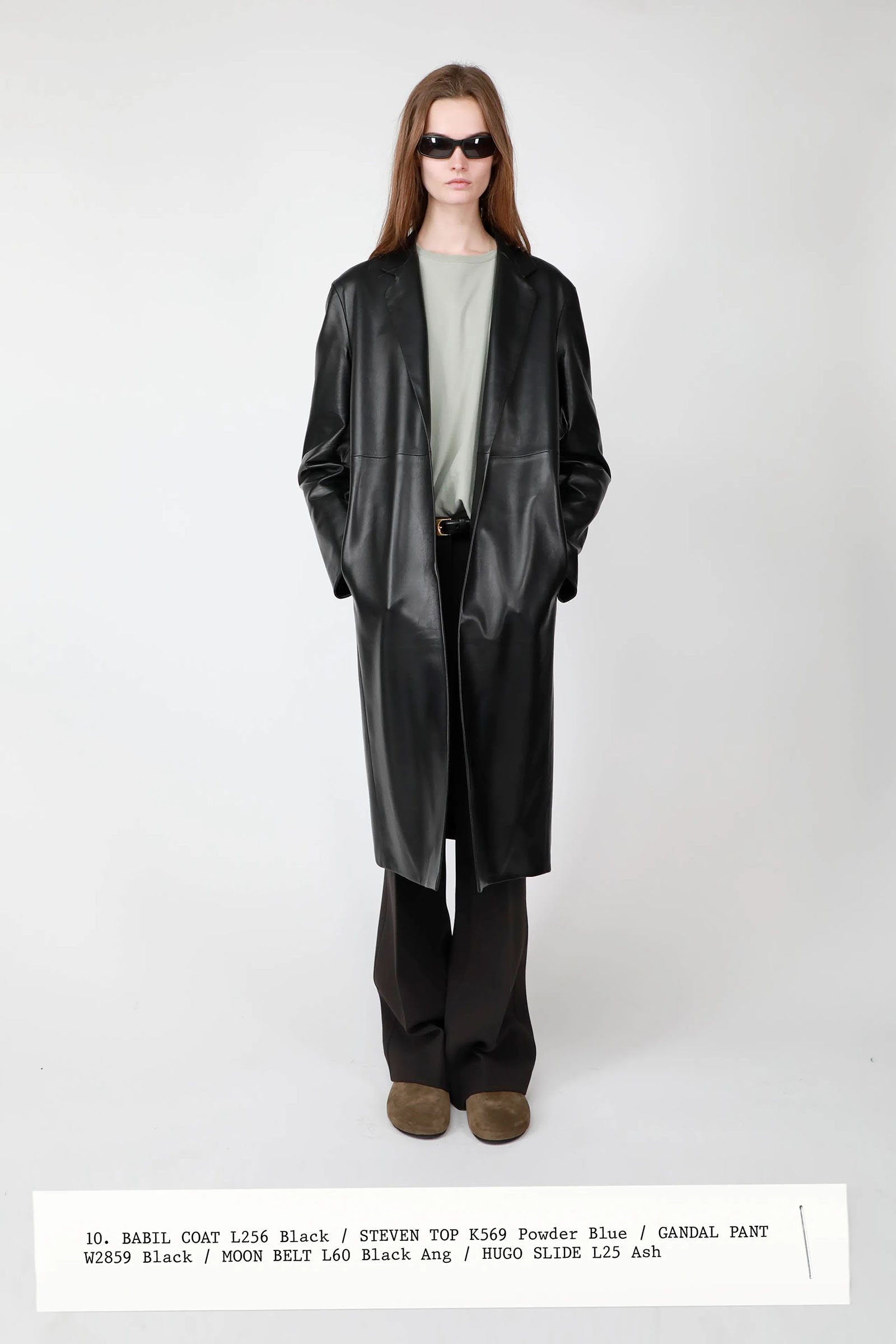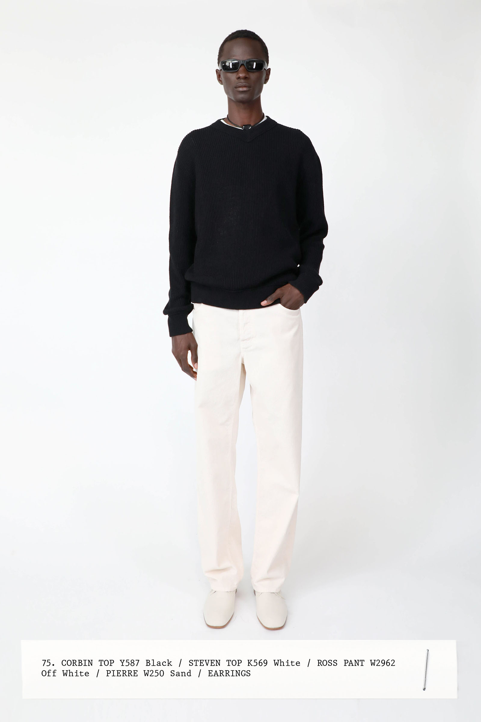 The collection was introduced with an explanation that an expanded range of men’s wear yielded pieces that overlapped with the women’s offer. Can you spot the knee-length, black leather trench that reappears throughout the lineup? The leisure shirts with their retro stripes? The jeans that have been skillfully shredded at the knees, enhancing their desirability? Note, too, how the tailoring that seemed intentionally boxy and generous on a female frame is as intentionally streamlined on the male counterpart.