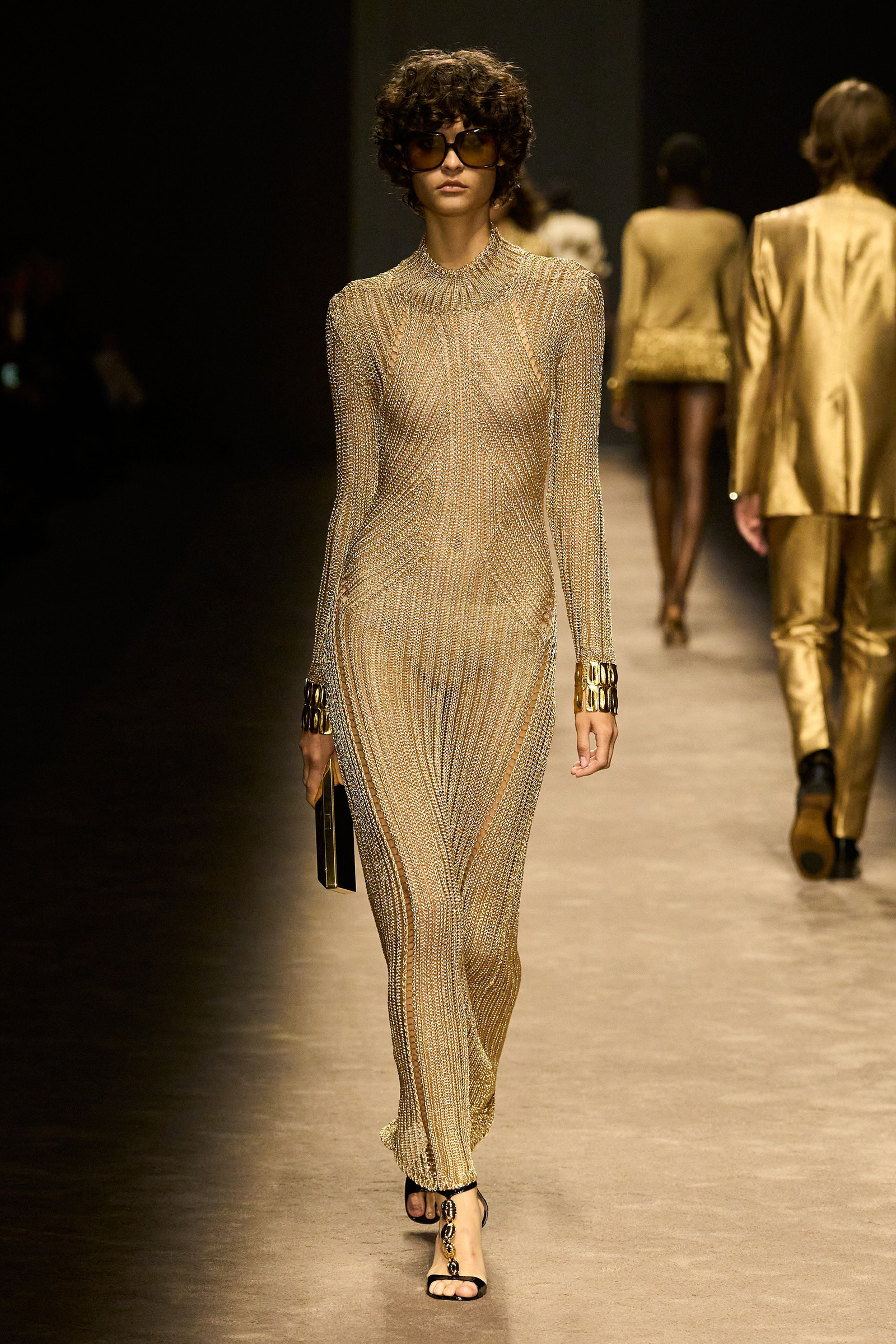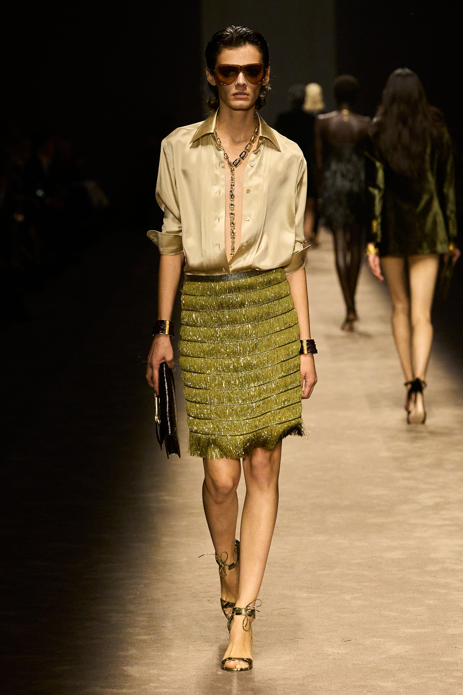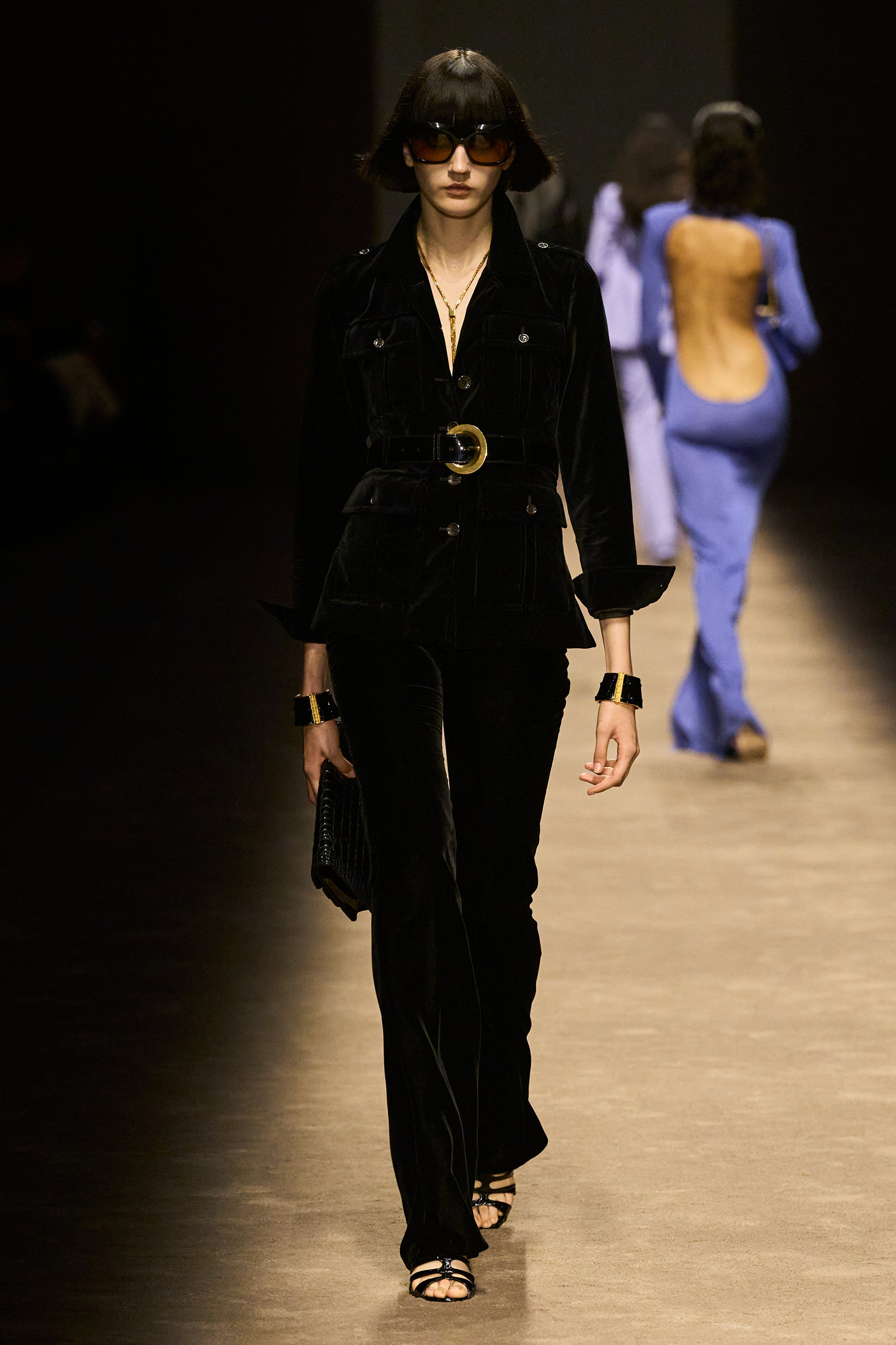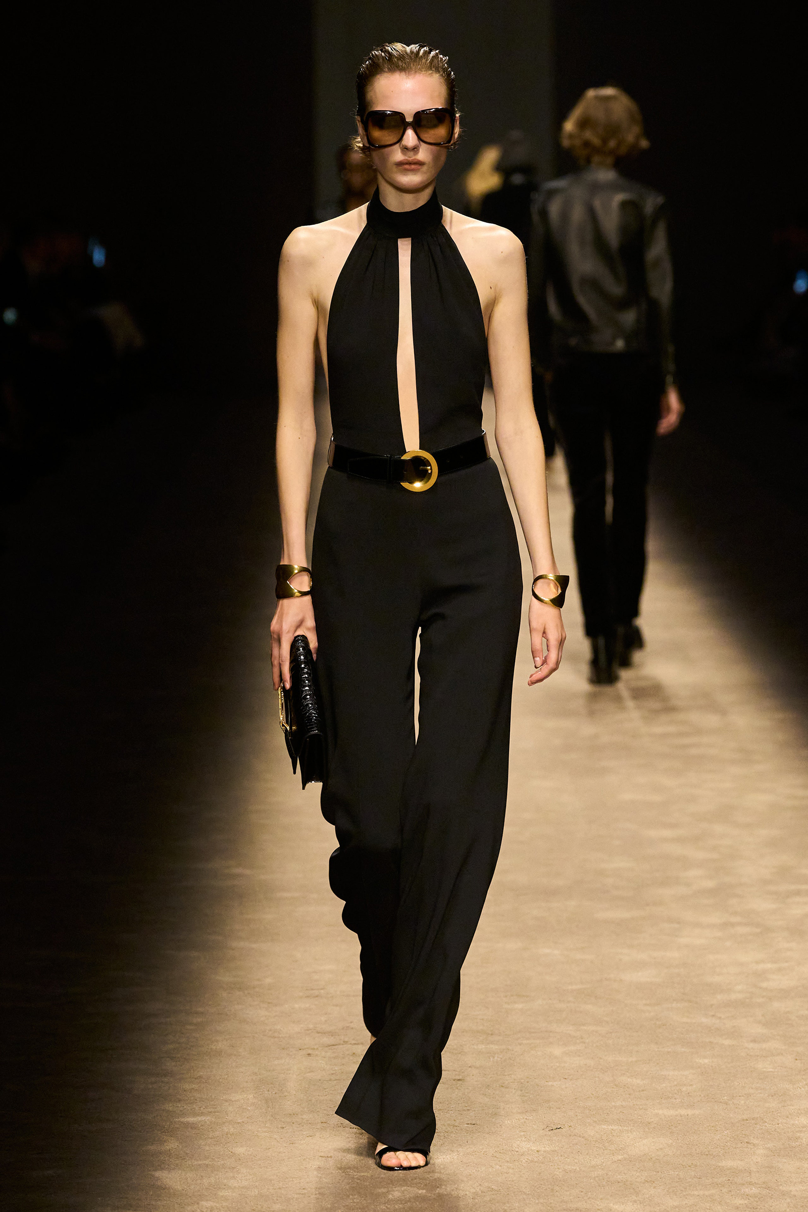 The women and men on the runway tonight did indeed feel closer together. They shared materials including glossy mock croc, a color palette, and a tendency to wear their shirts unbuttoned past the navel, though the short-shorts were girls-only. The collection was a bit like a greatest hits playlist, starting with the sculpted belt buckle from Ford’s iconic spring 1996 show for Gucci, only this slinky long dress was black, not white, and instead of a hip cut-out, it had an exposed back (a recurring motif).