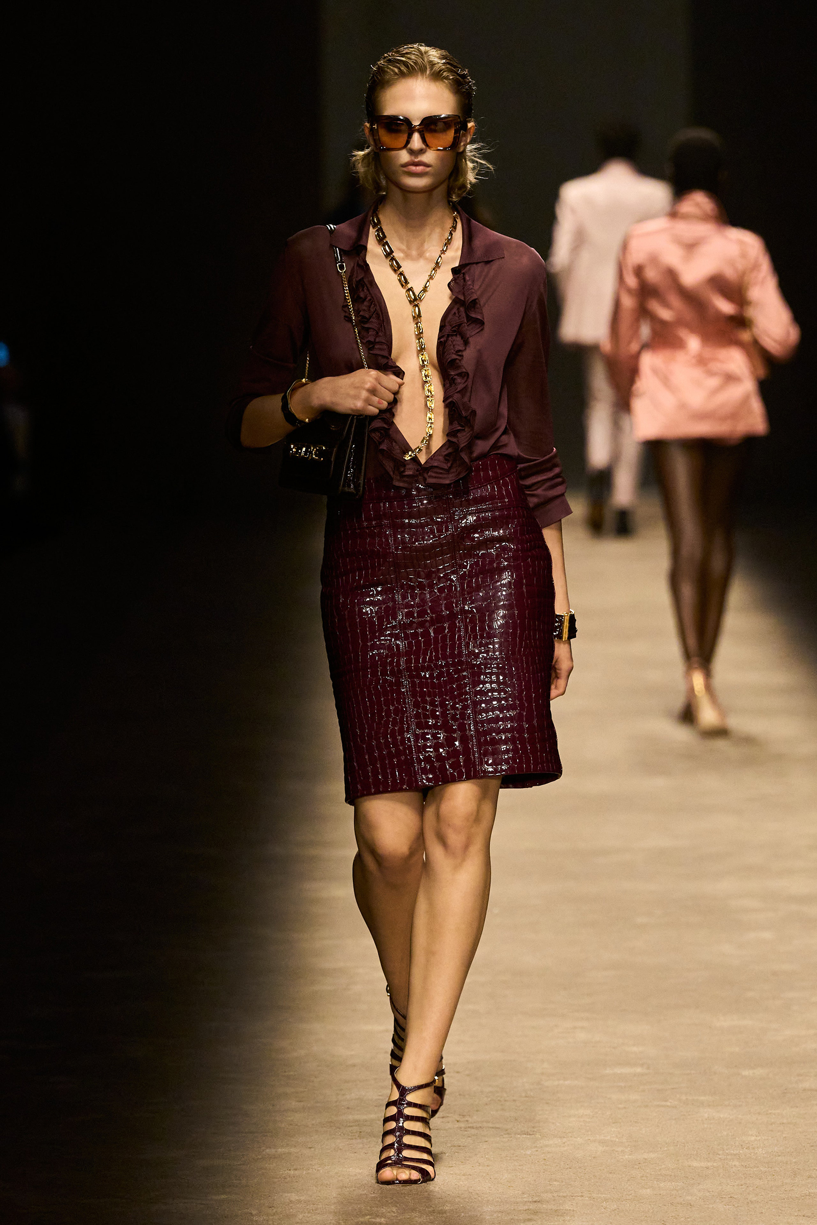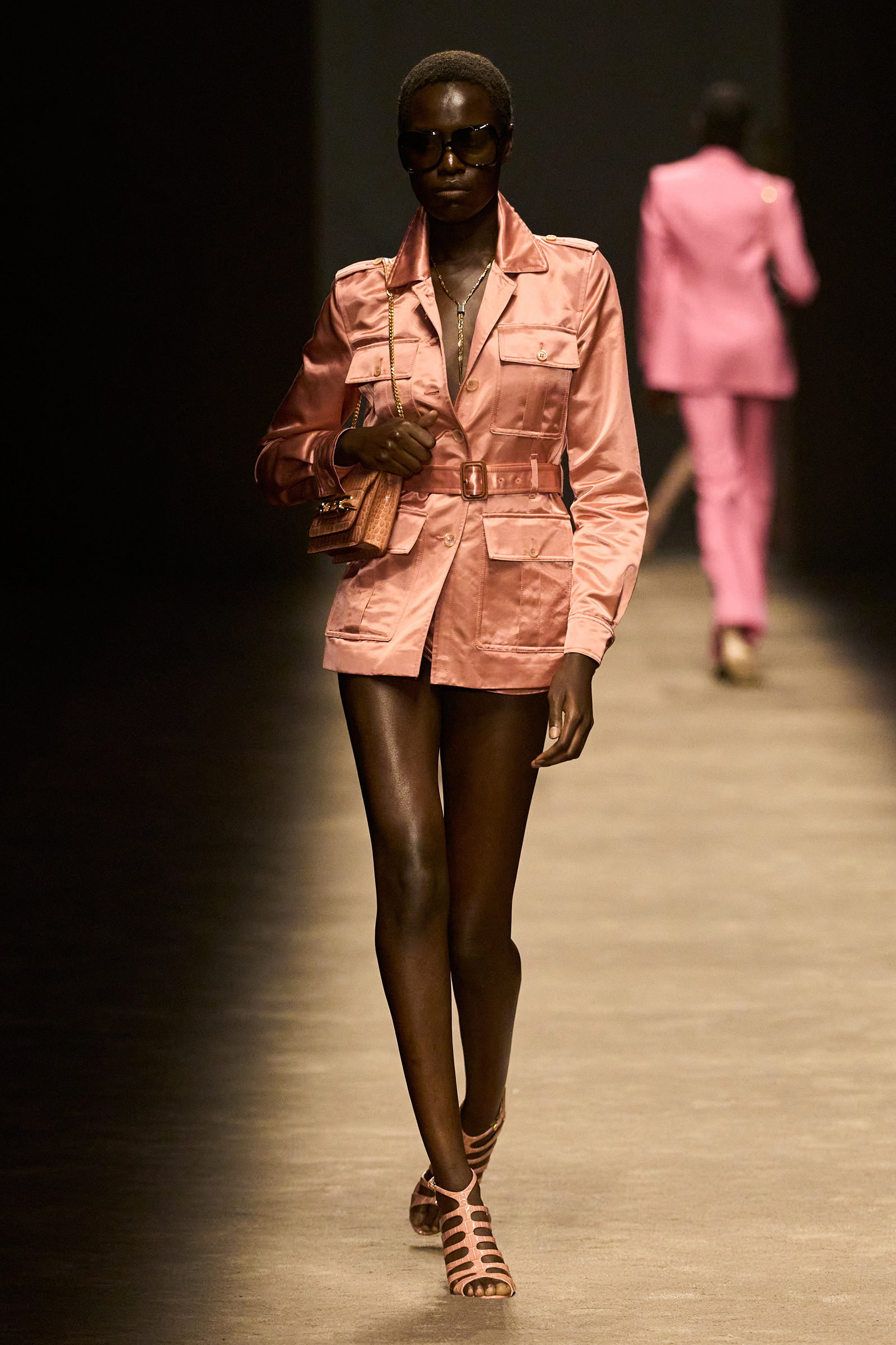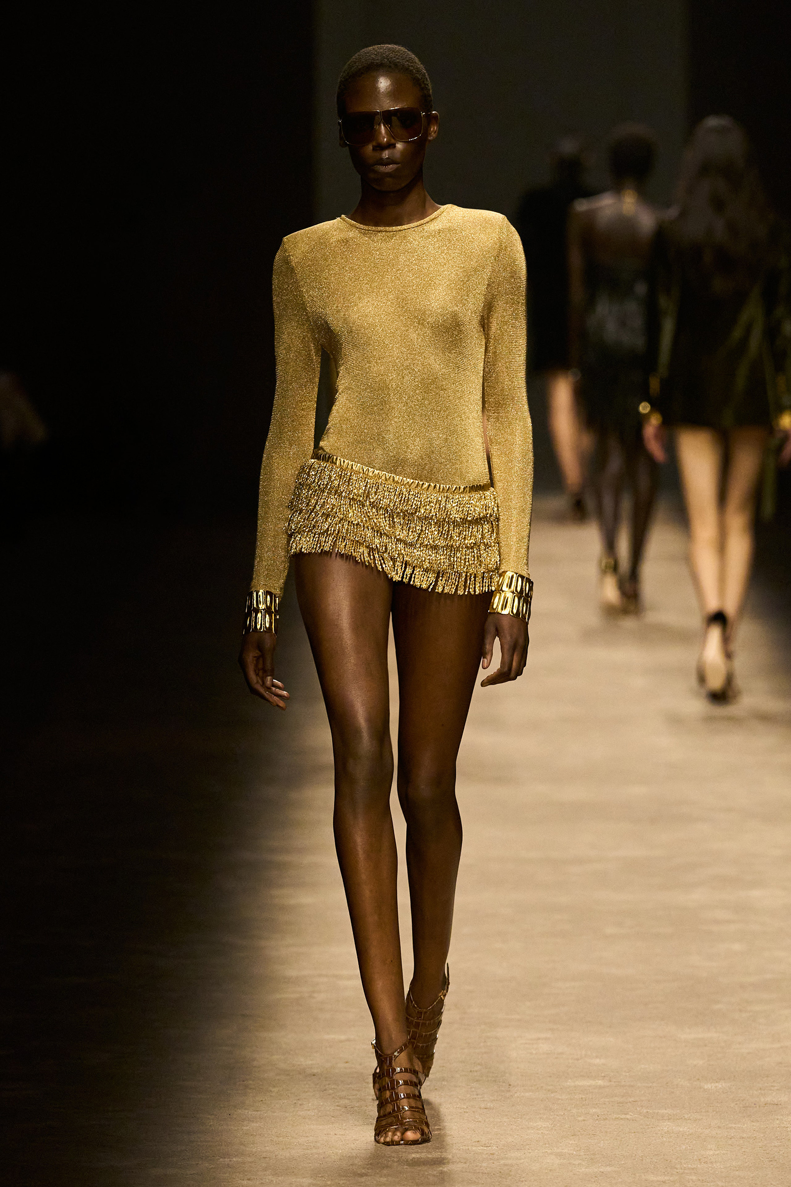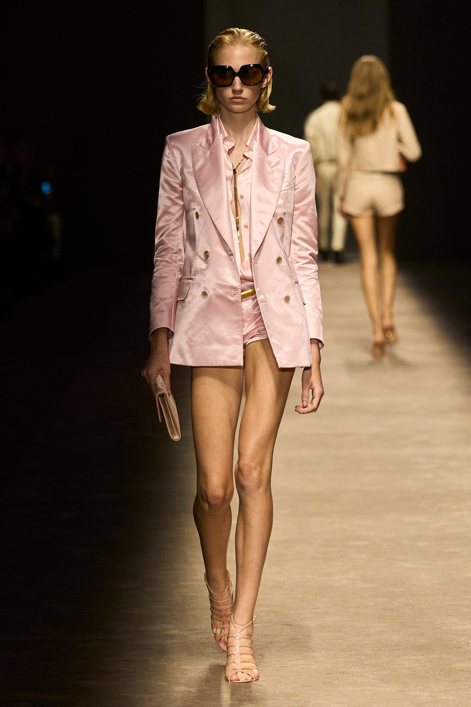 The women and men on the runway tonight did indeed feel closer together. They shared materials including glossy mock croc, a color palette, and a tendency to wear their shirts unbuttoned past the navel, though the short-shorts were girls-only. The collection was a bit like a greatest hits playlist, starting with the sculpted belt buckle from Ford’s iconic spring 1996 show for Gucci, only this slinky long dress was black, not white, and instead of a hip cut-out, it had an exposed back (a recurring motif).