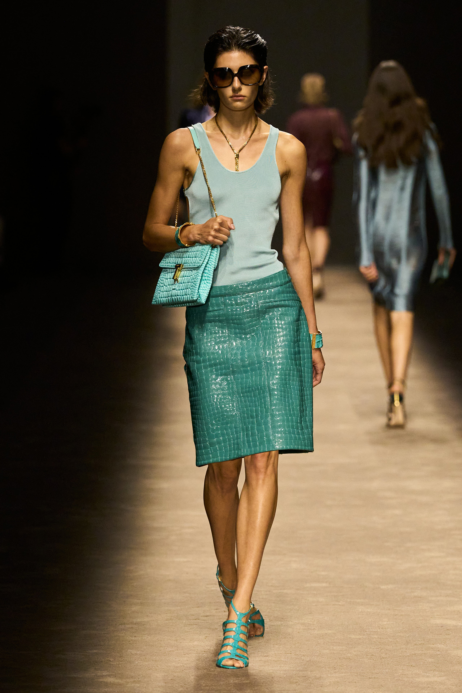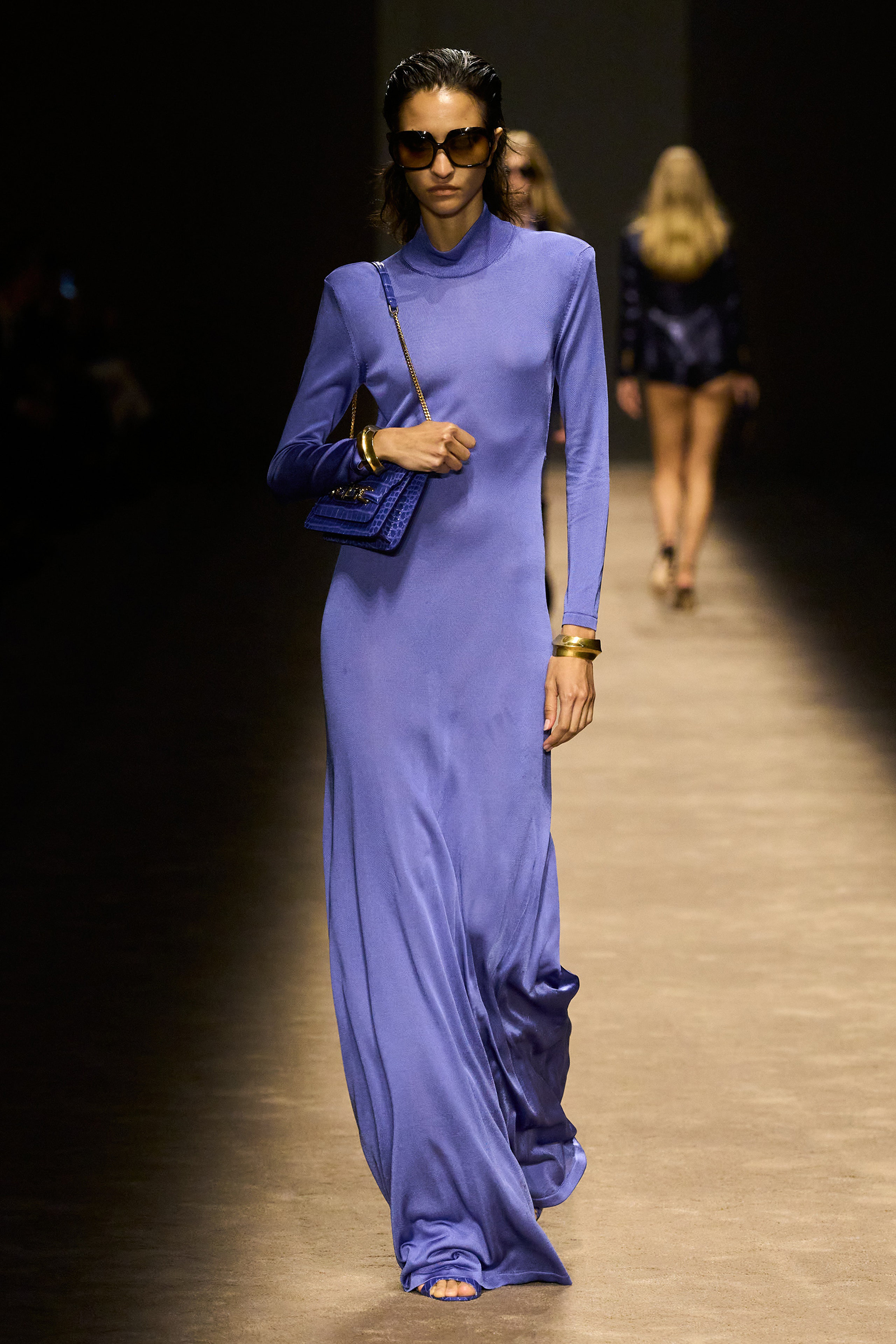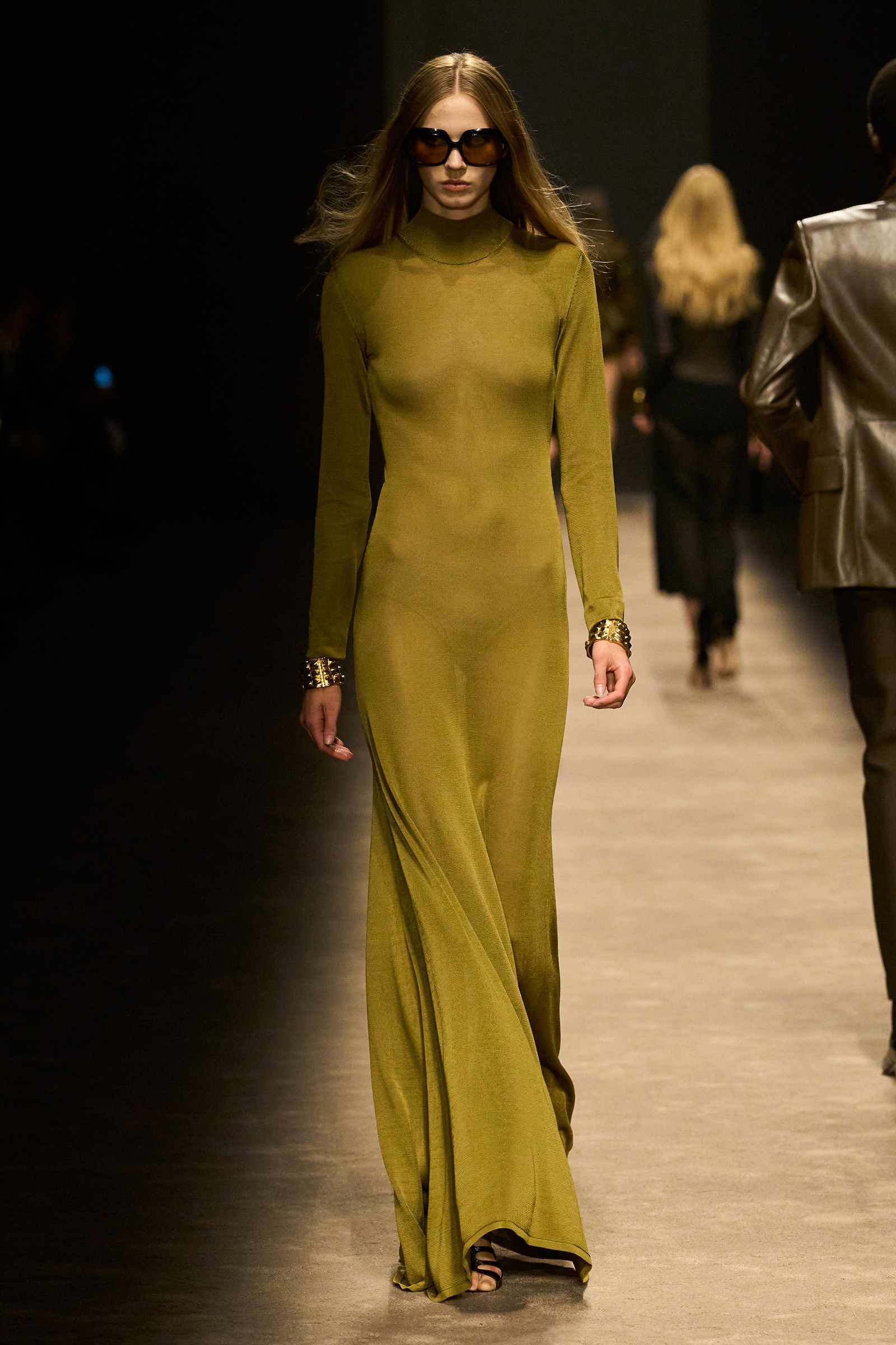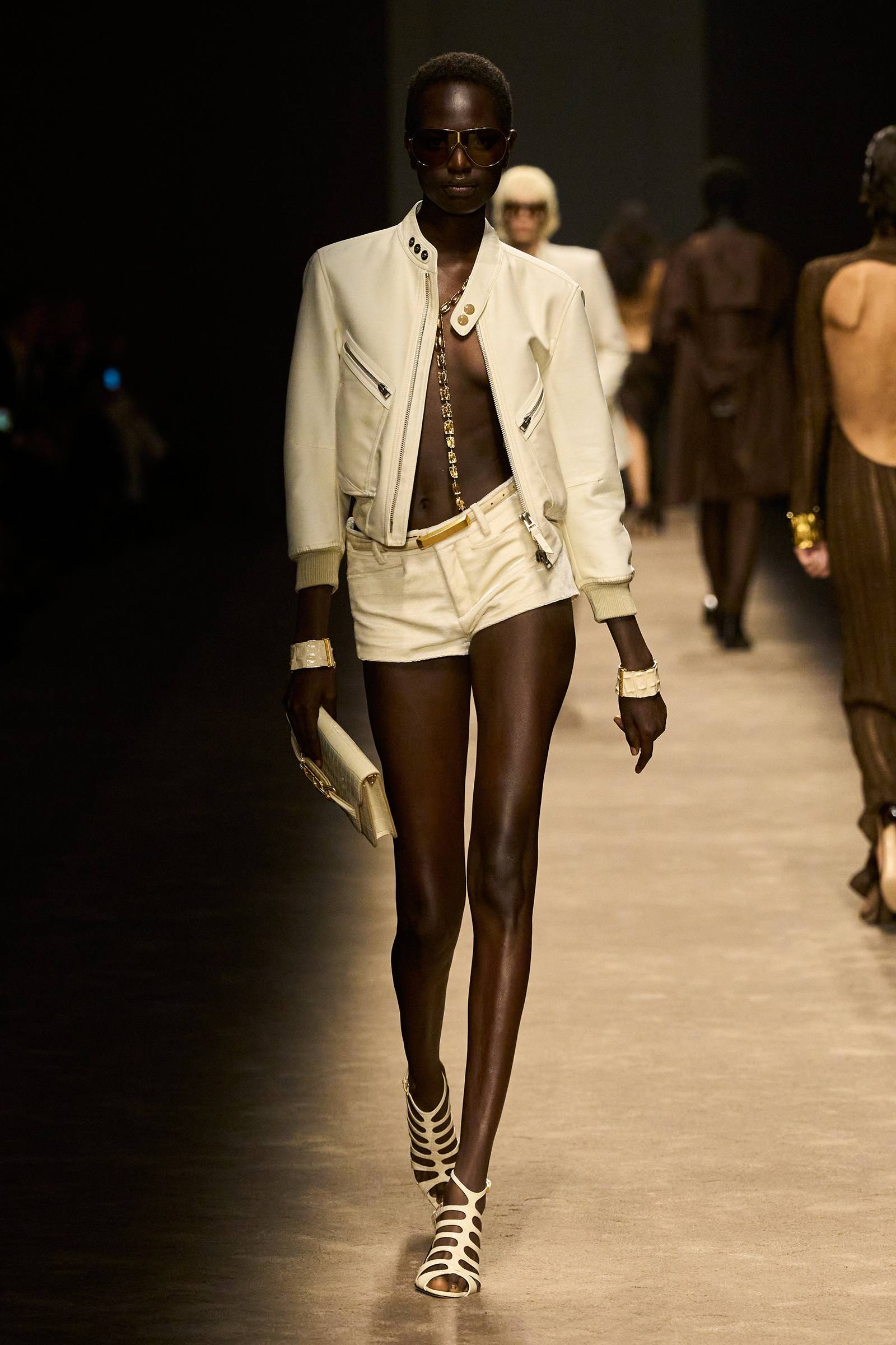 The women and men on the runway tonight did indeed feel closer together. They shared materials including glossy mock croc, a color palette, and a tendency to wear their shirts unbuttoned past the navel, though the short-shorts were girls-only. The collection was a bit like a greatest hits playlist, starting with the sculpted belt buckle from Ford’s iconic spring 1996 show for Gucci, only this slinky long dress was black, not white, and instead of a hip cut-out, it had an exposed back (a recurring motif).