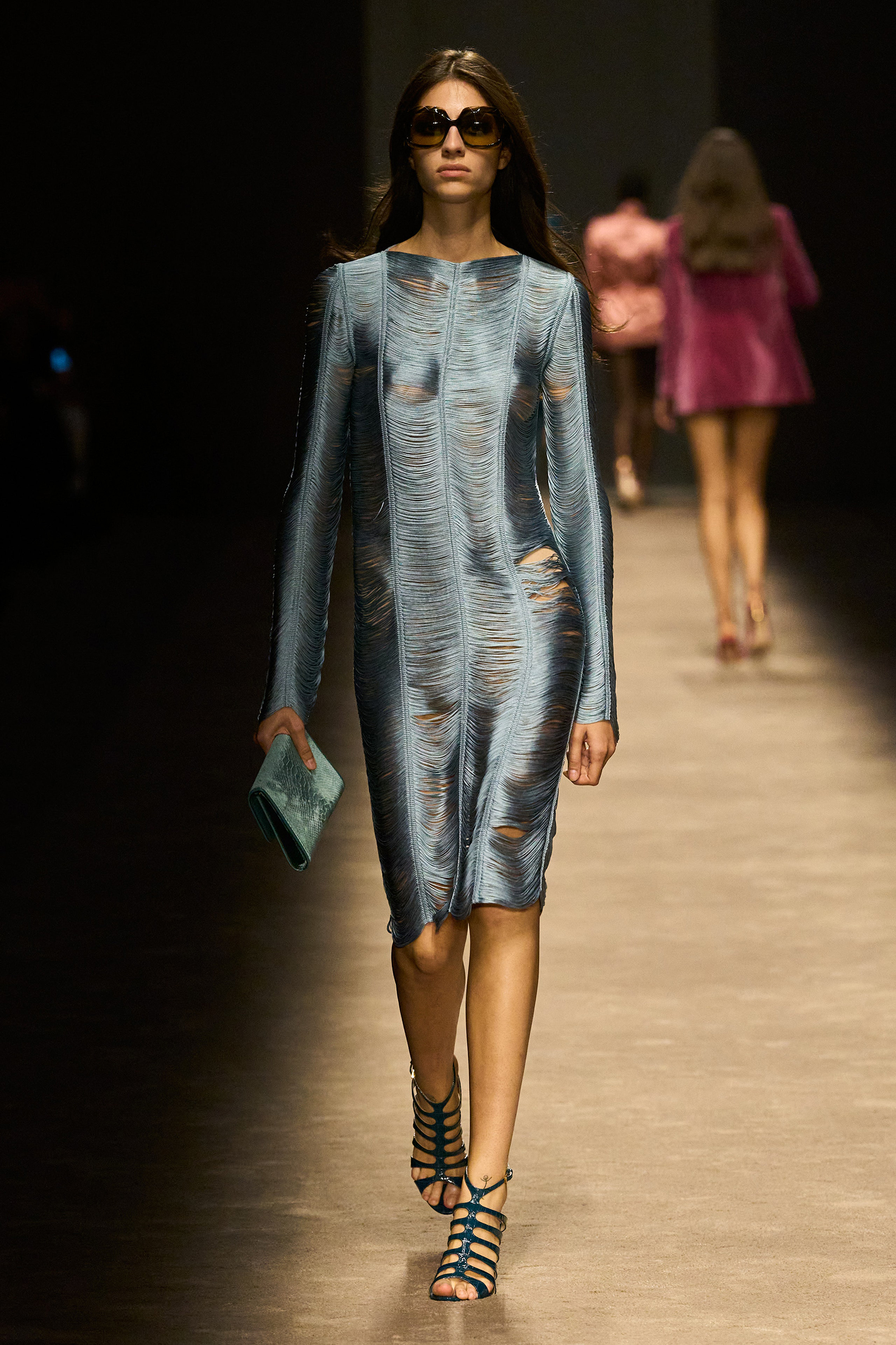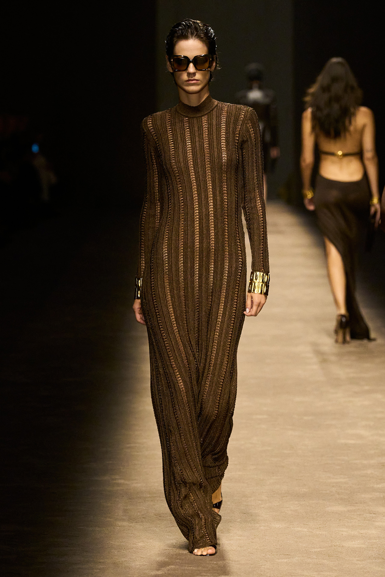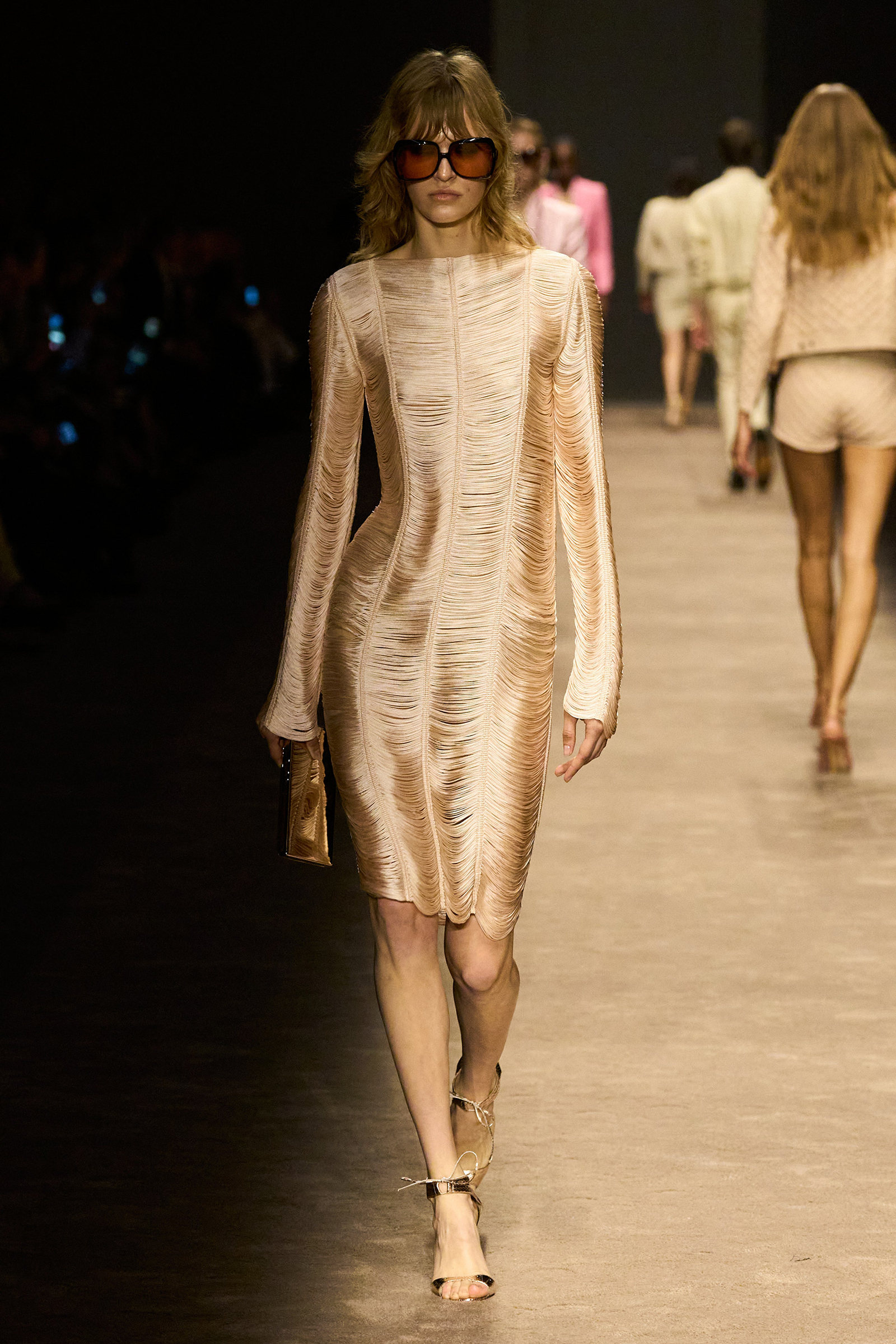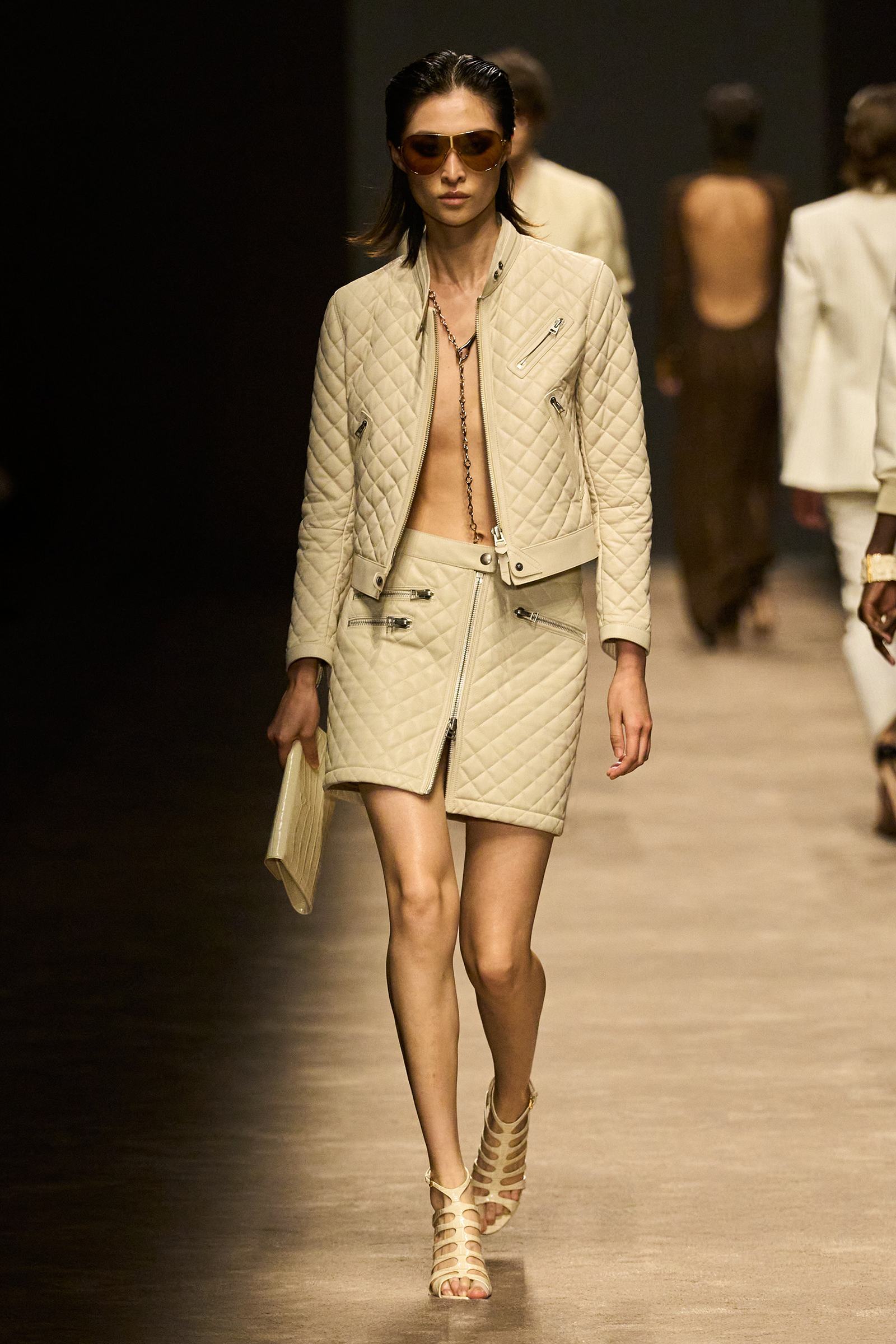 The women and men on the runway tonight did indeed feel closer together. They shared materials including glossy mock croc, a color palette, and a tendency to wear their shirts unbuttoned past the navel, though the short-shorts were girls-only. The collection was a bit like a greatest hits playlist, starting with the sculpted belt buckle from Ford’s iconic spring 1996 show for Gucci, only this slinky long dress was black, not white, and instead of a hip cut-out, it had an exposed back (a recurring motif).