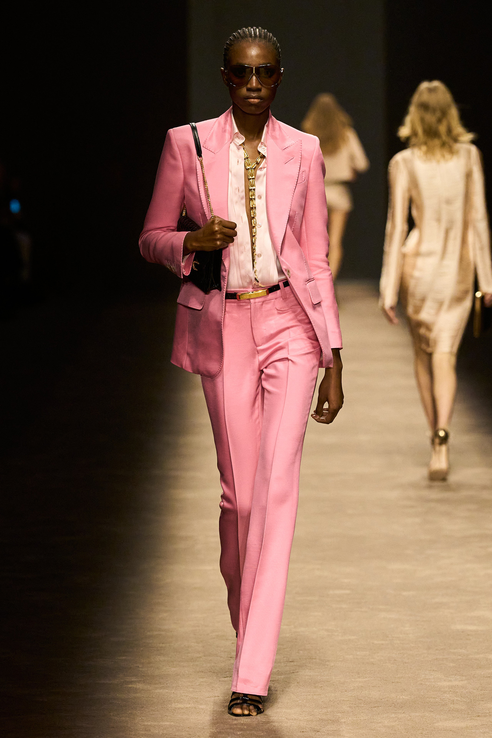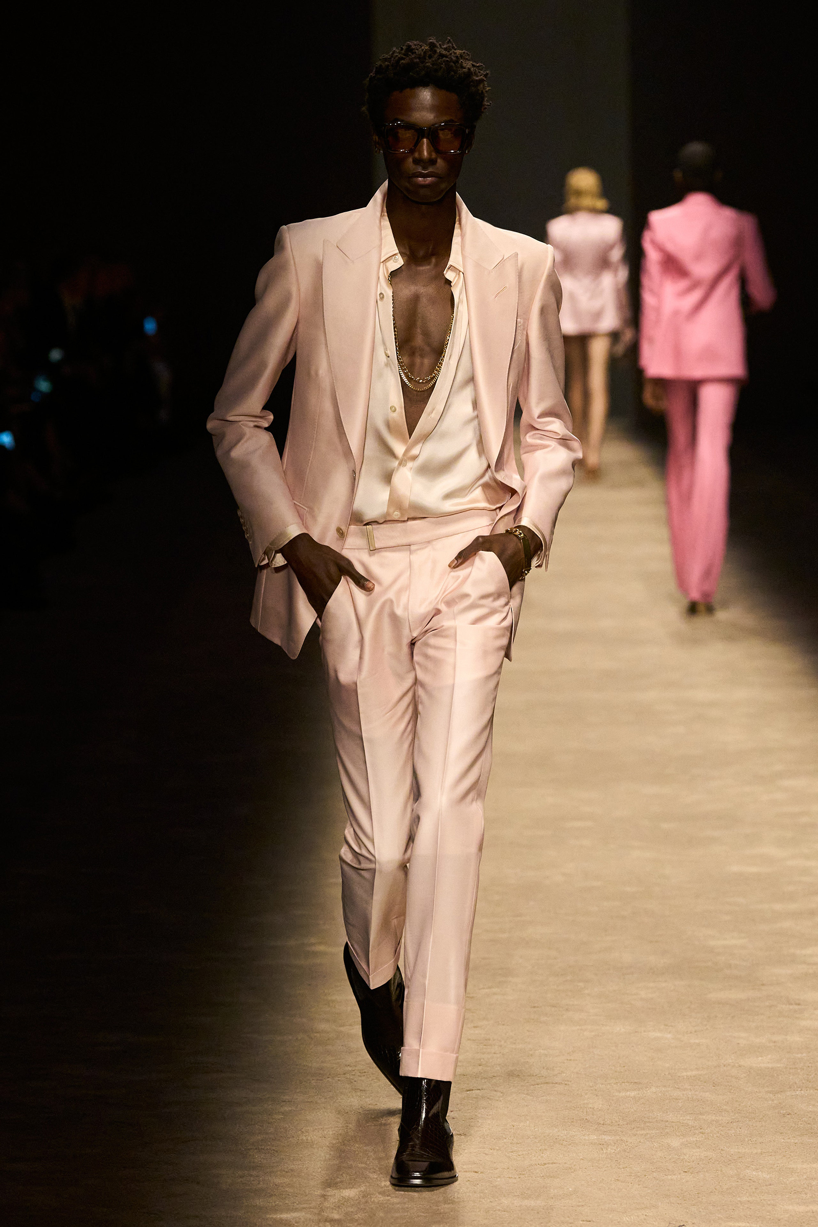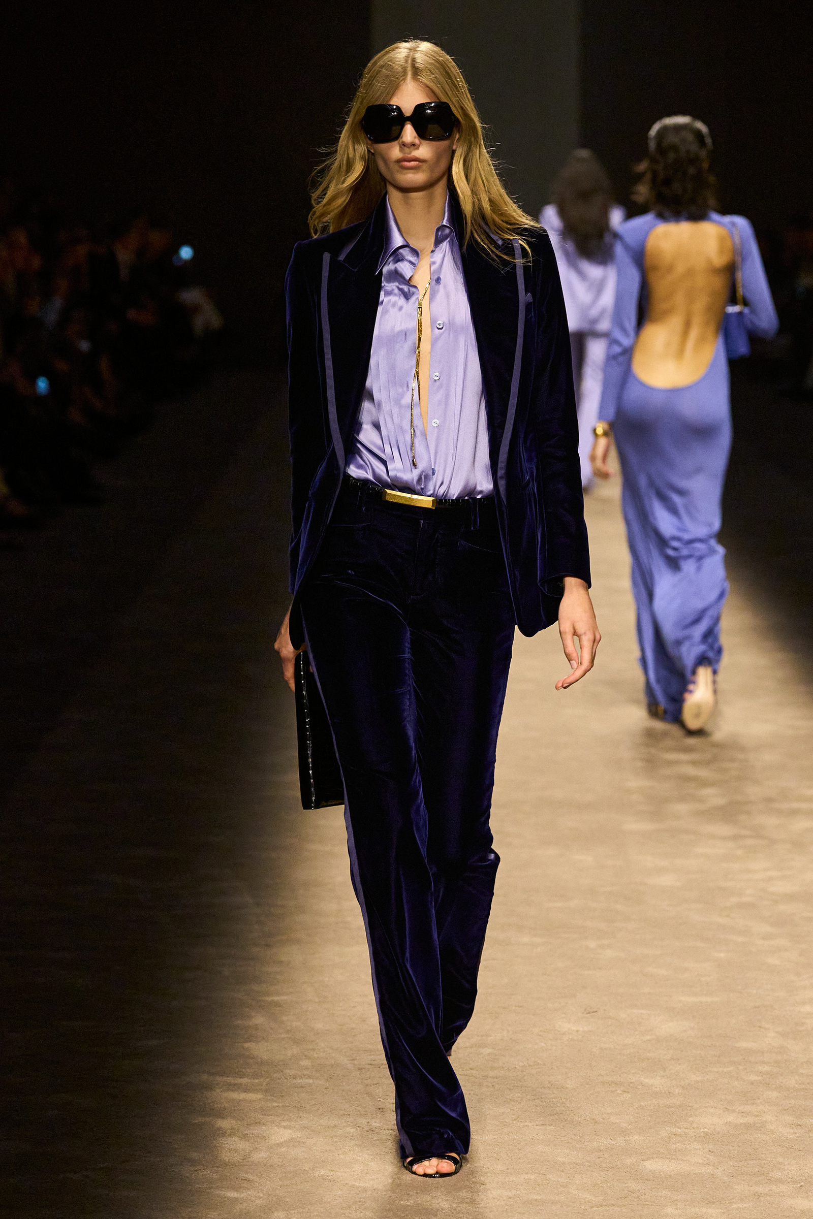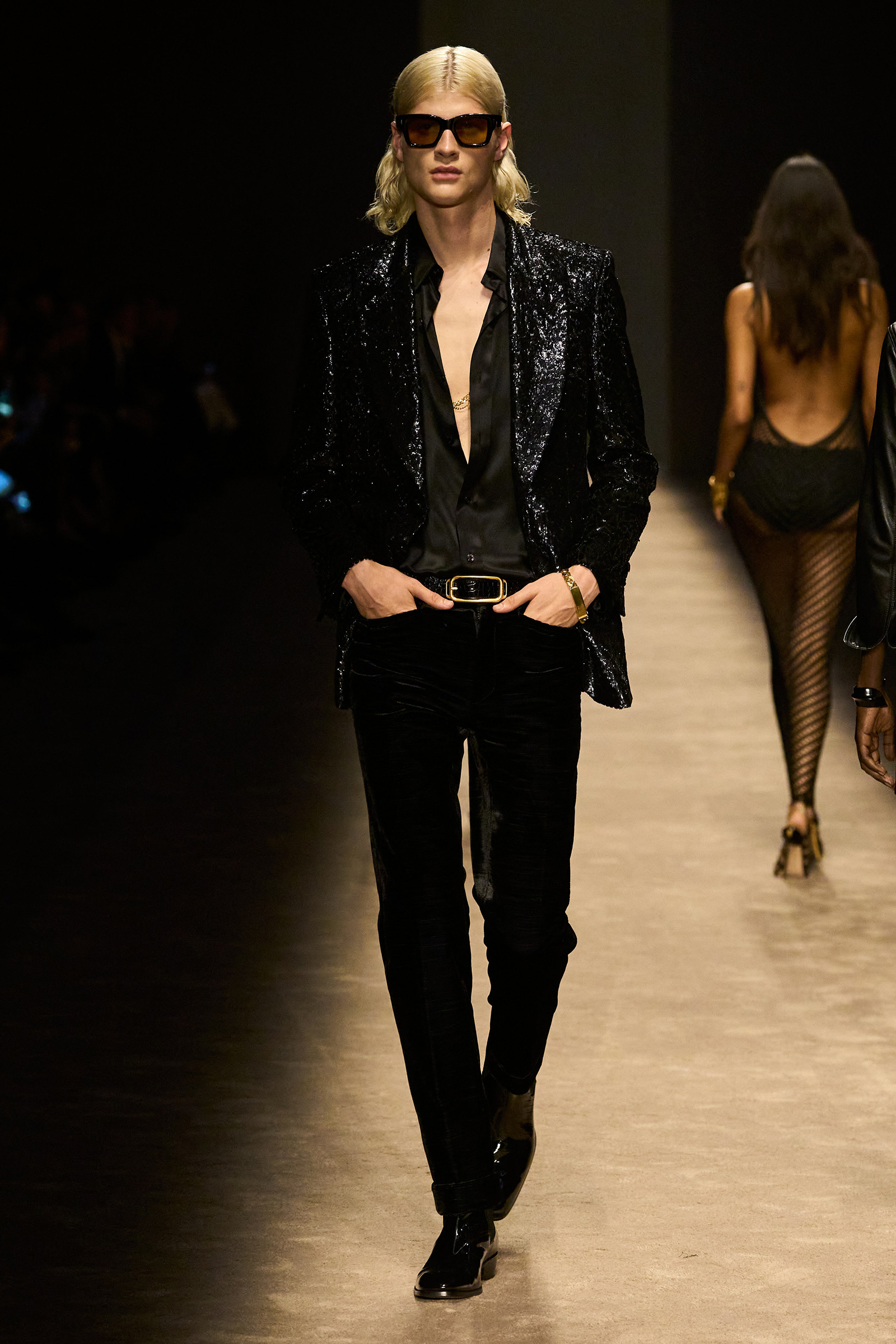 This isn’t a new designer/new direction debut, the kind we’re likely to get at Gucci tomorrow, where Sabato De Sarno has replaced Alessandro Michele, another Ford-era Gucci veteran. Consistency is the idea, and consolidation too. As Hawkings revealed in that interview, prior to his departure Ford was handling womenswear from Los Angeles, and Hawkings was doing menswear from London, and oftentimes there was a disconnect between the two. “It’s so important, bringing that woman closer to the man,” he said tonight, “so that they’re one universe.”
