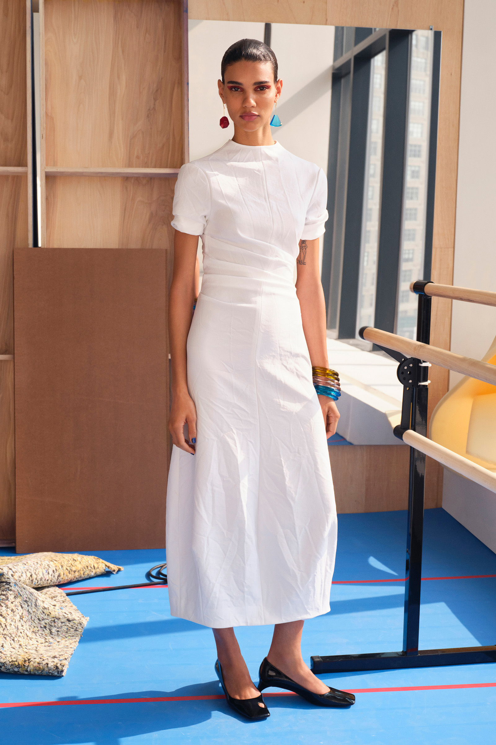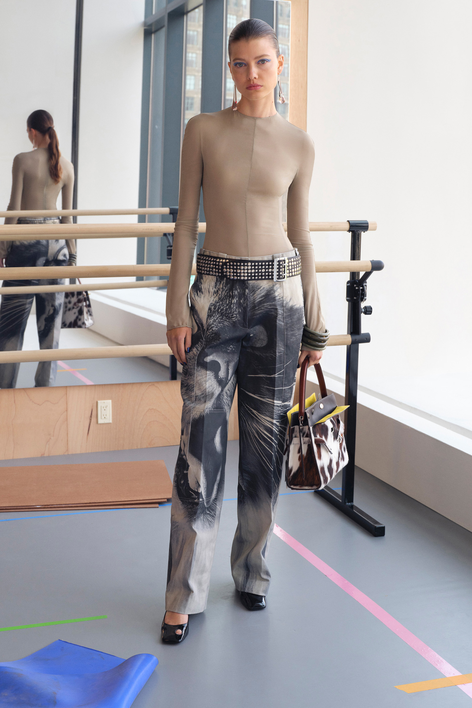 “I wanted clean lines,” Burch said at a showroom appointment. That translated to aerodynamic jersey tees and narrow skirts shown in monochrome white or navy blue punctuated only with a studded hip-slung belt, or to a leather handkerchief top embellished with more of those silver studs paired with mannish, straight-cut trousers. The tailoring is minimal and stripped of any visible hardware.