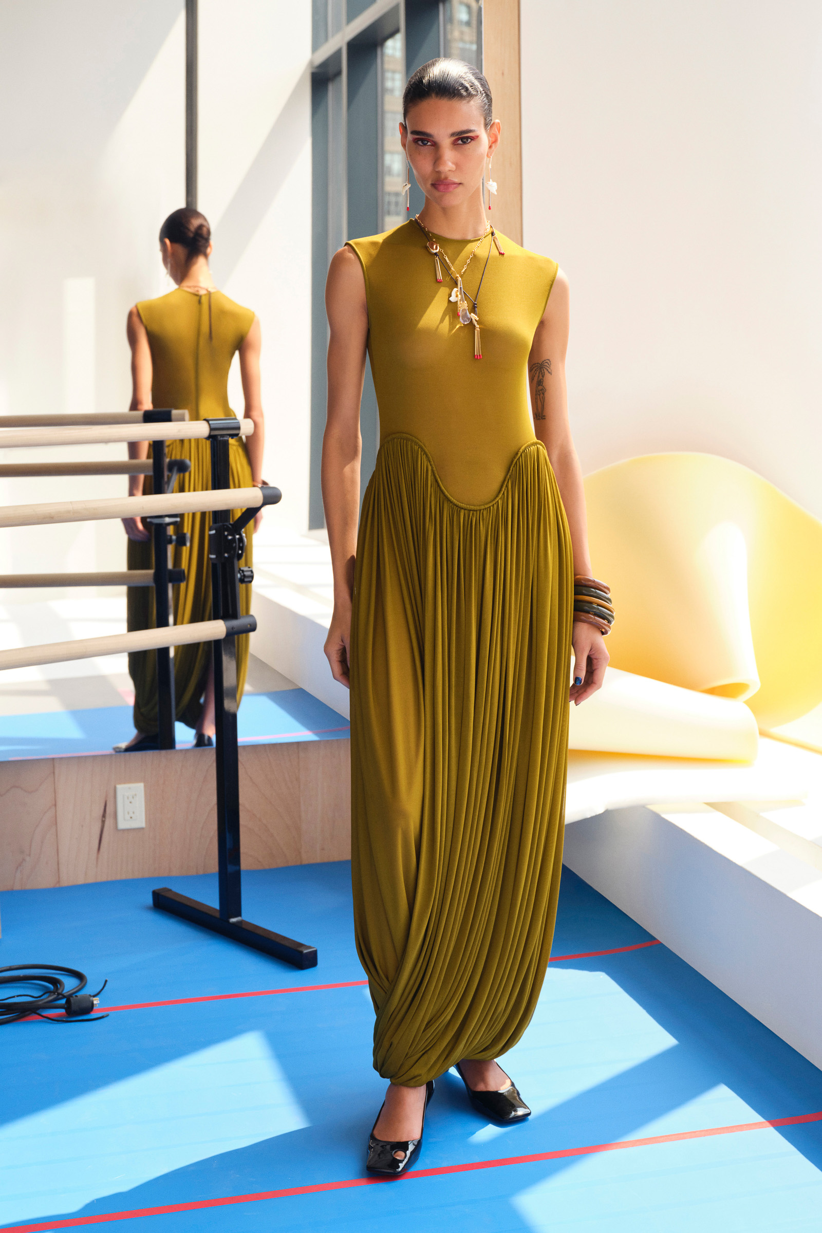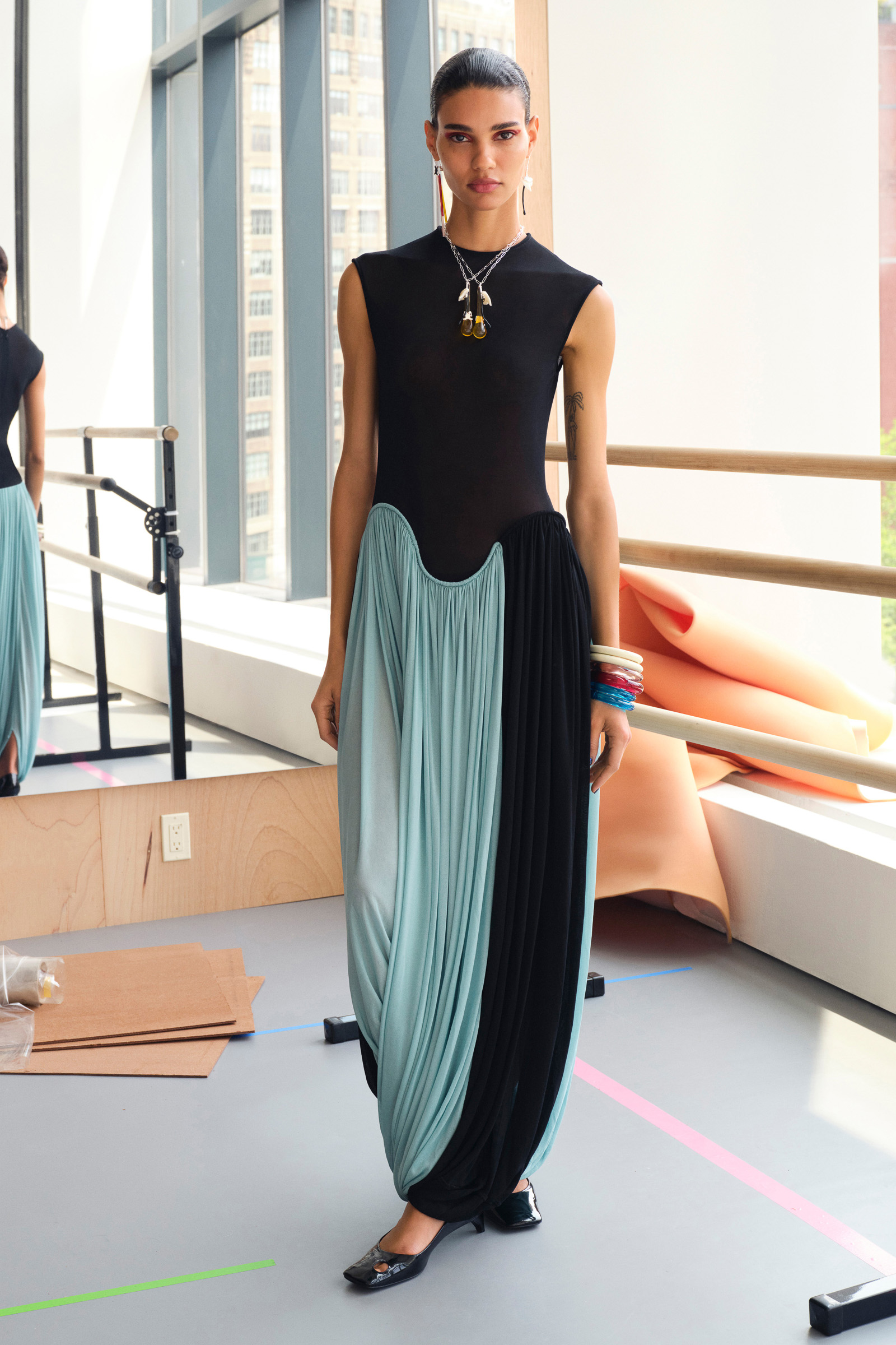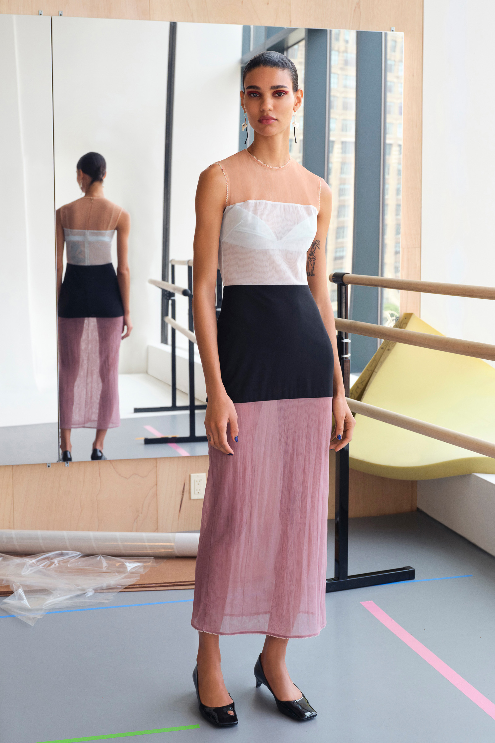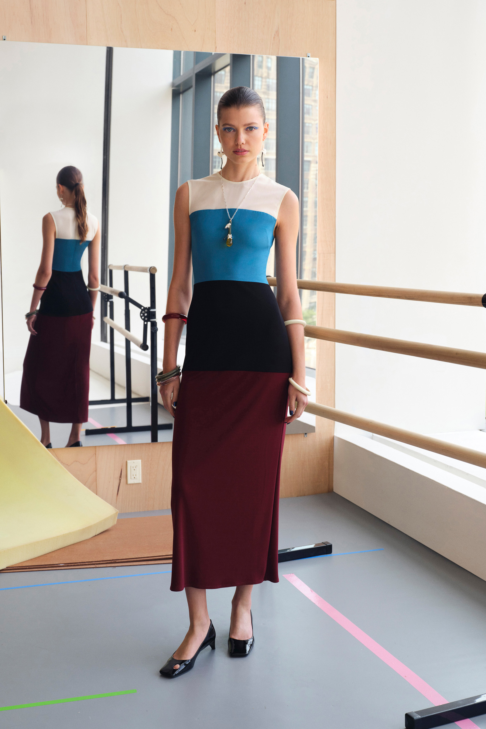 Burch herself is always in motion, which might be why she’s been leaning into stretch fabrics and lean, almost athletic shapes recently. Last September at her spring show she introduced a modular concept that combined a stretch top and tube skirt with capri-length leggings, or teamed a stretch top and a part-opaque, part-sheer skirt. For resort, there’s a pair of dresses that recreate the color-blocking of those looks—same big impact but in a couldn’t-be-easier all-in-one shape. The deep-v sweaters accompanied by sheer turtleneck dickeys here do the same thing: You get the look of layers in one completist piece. (Unlike traditional dickeys, these aren’t detachable.)