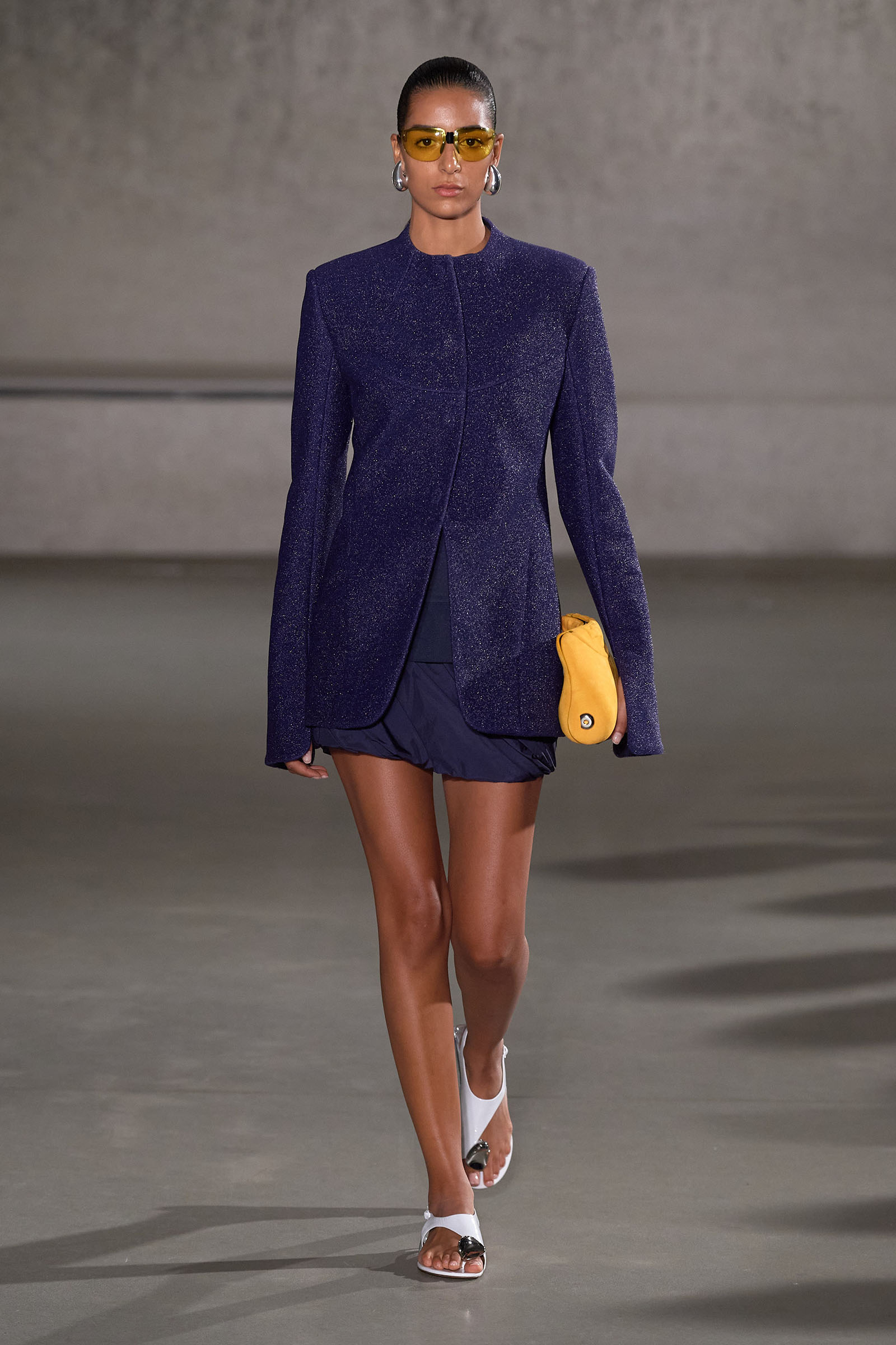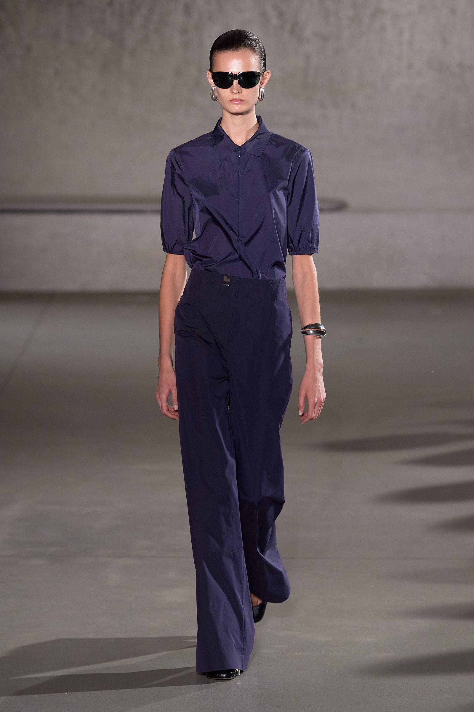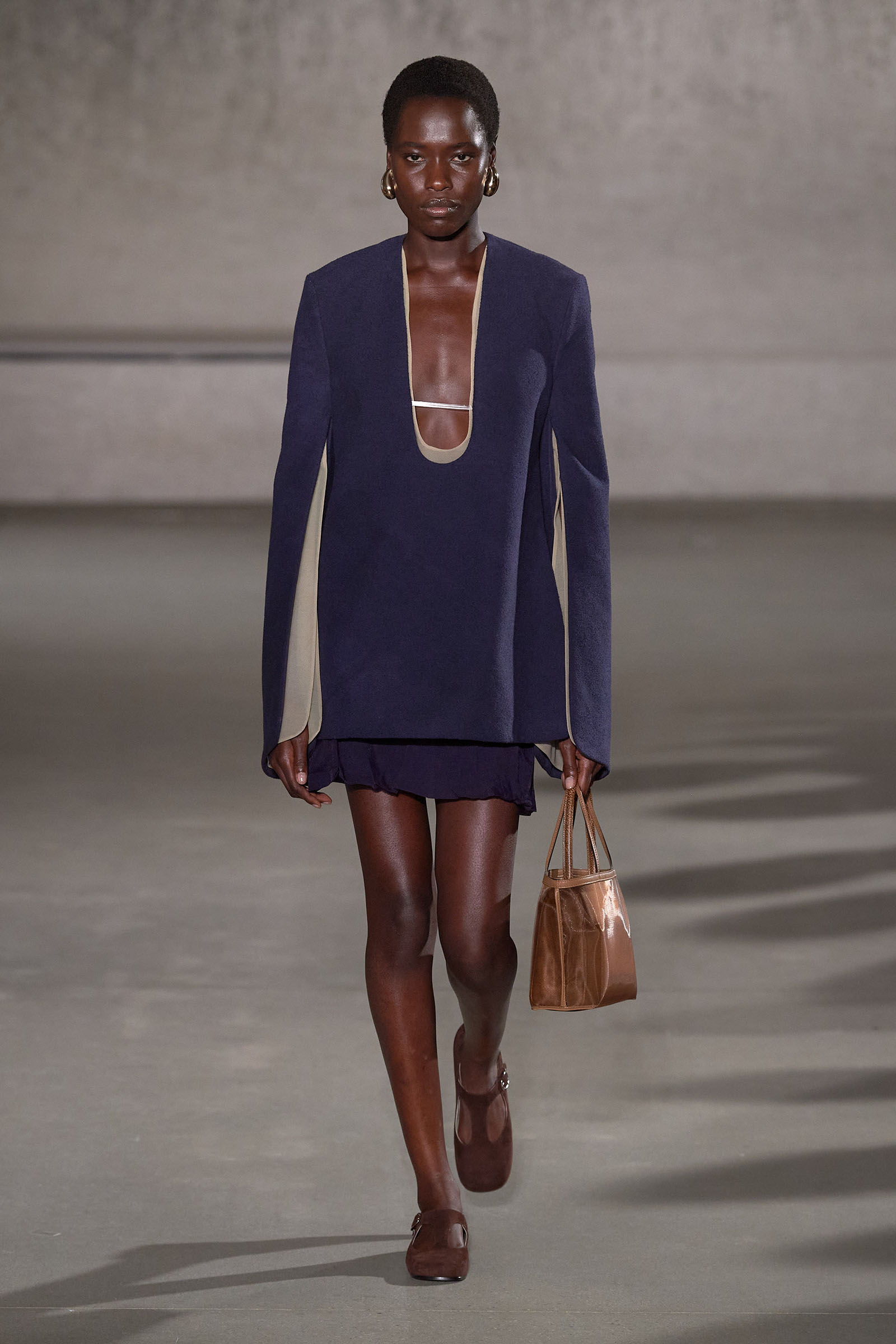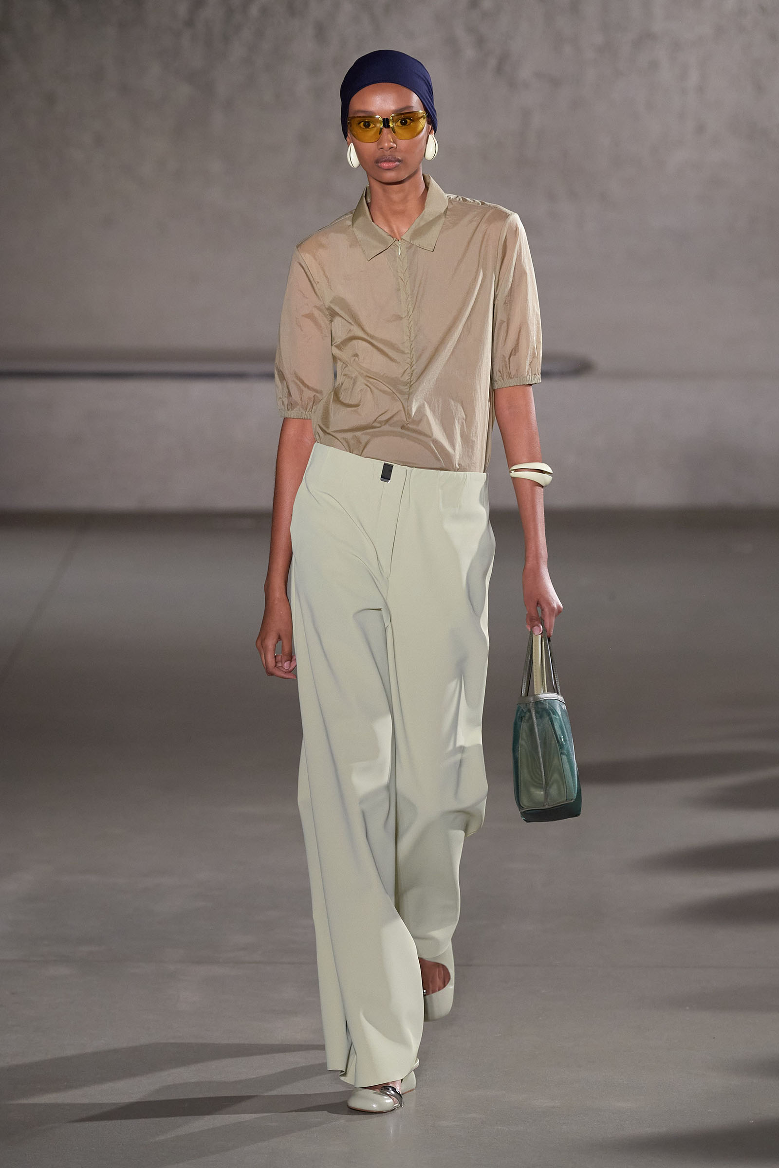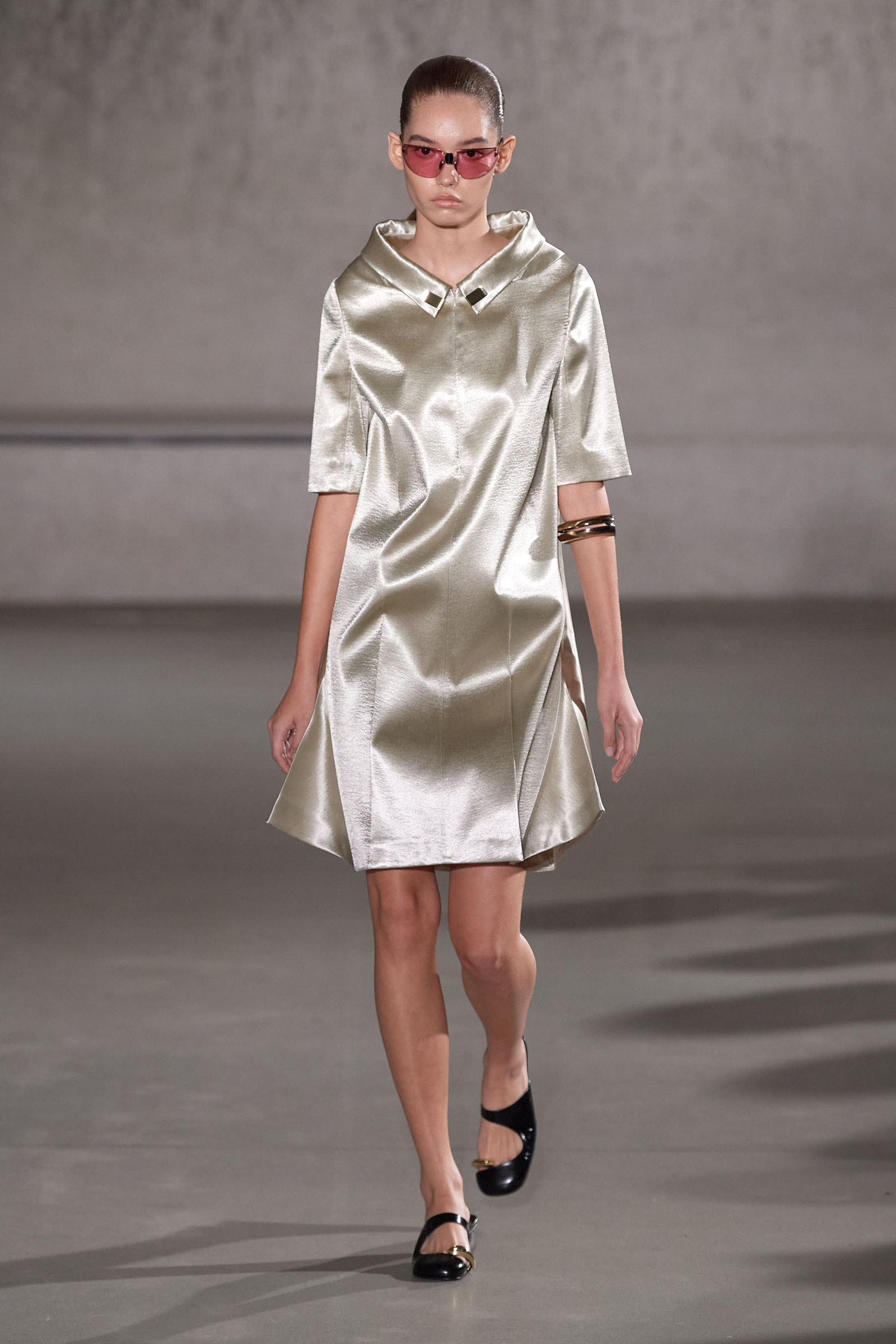 Did this collection live up to those principles? The thigh-high hems conveyed a carefree, youthful attitude, especially since they were paired with flat shoes, but the plunging U-necks, held in place with what looked like tie clips, might not prove as easy to wear. Nylon taffeta zip polos worn with tech-y pants got closer to the effortlessness she said she was aiming for. A coat, coatdress, and skirt suit with stand-away collars had a more retro look, in keeping with the ’60s influences we’ve seen elsewhere this week.