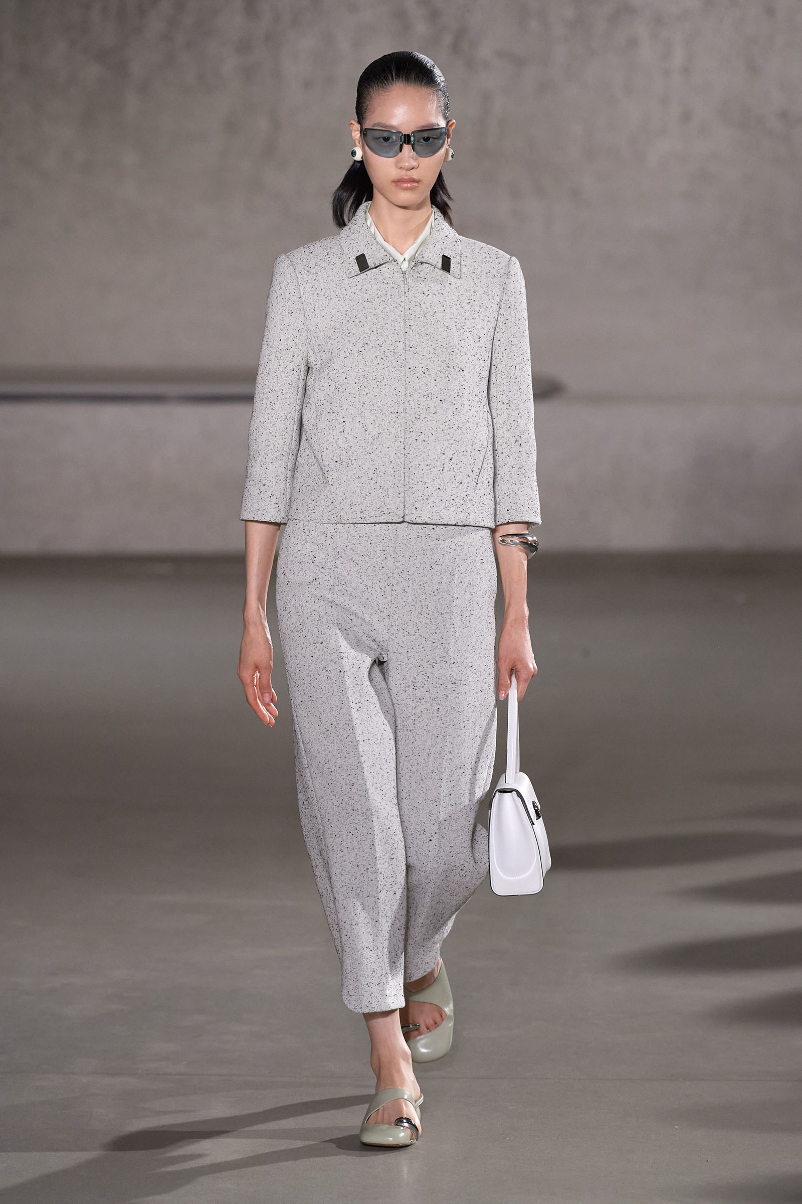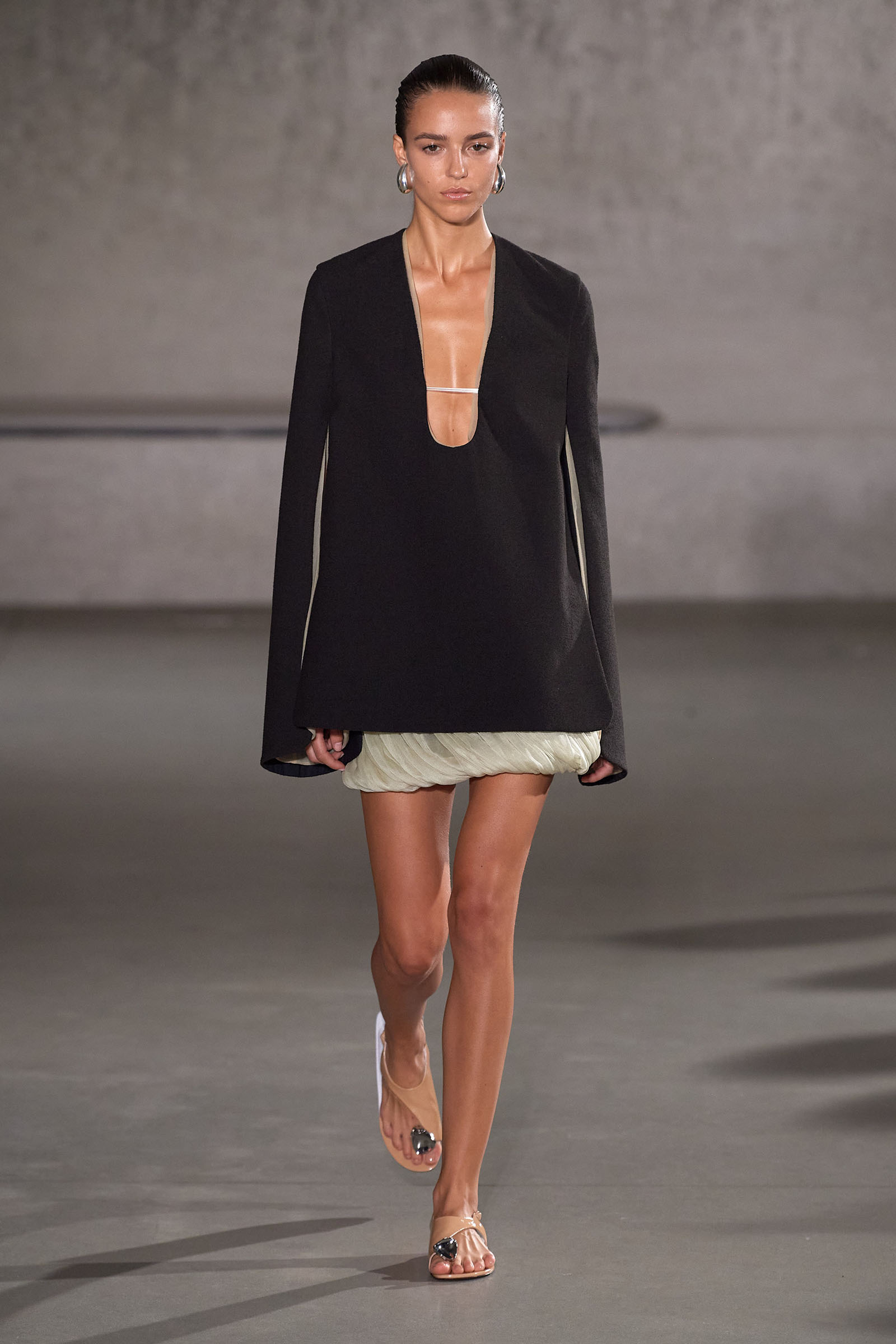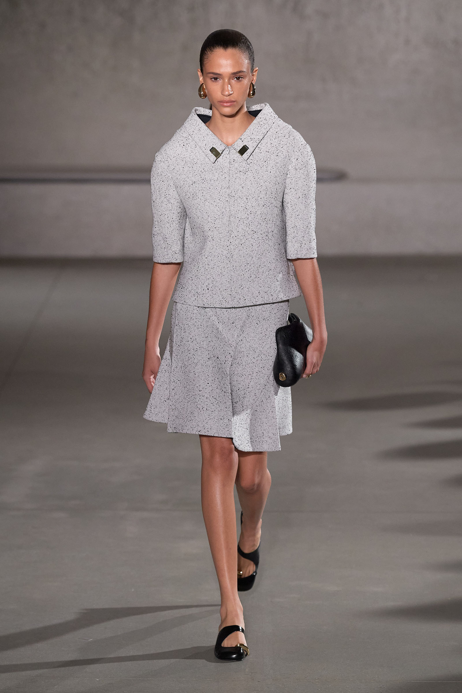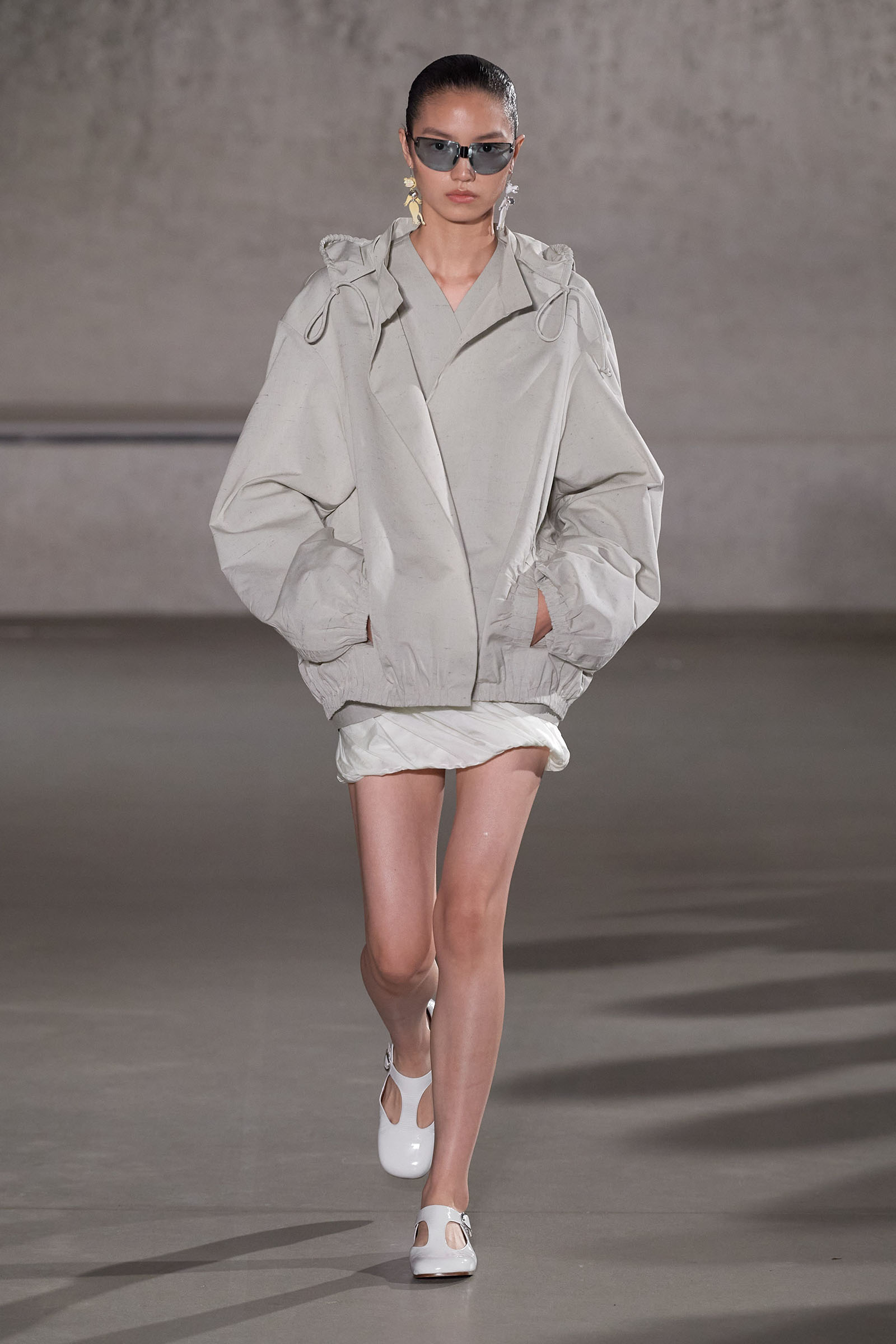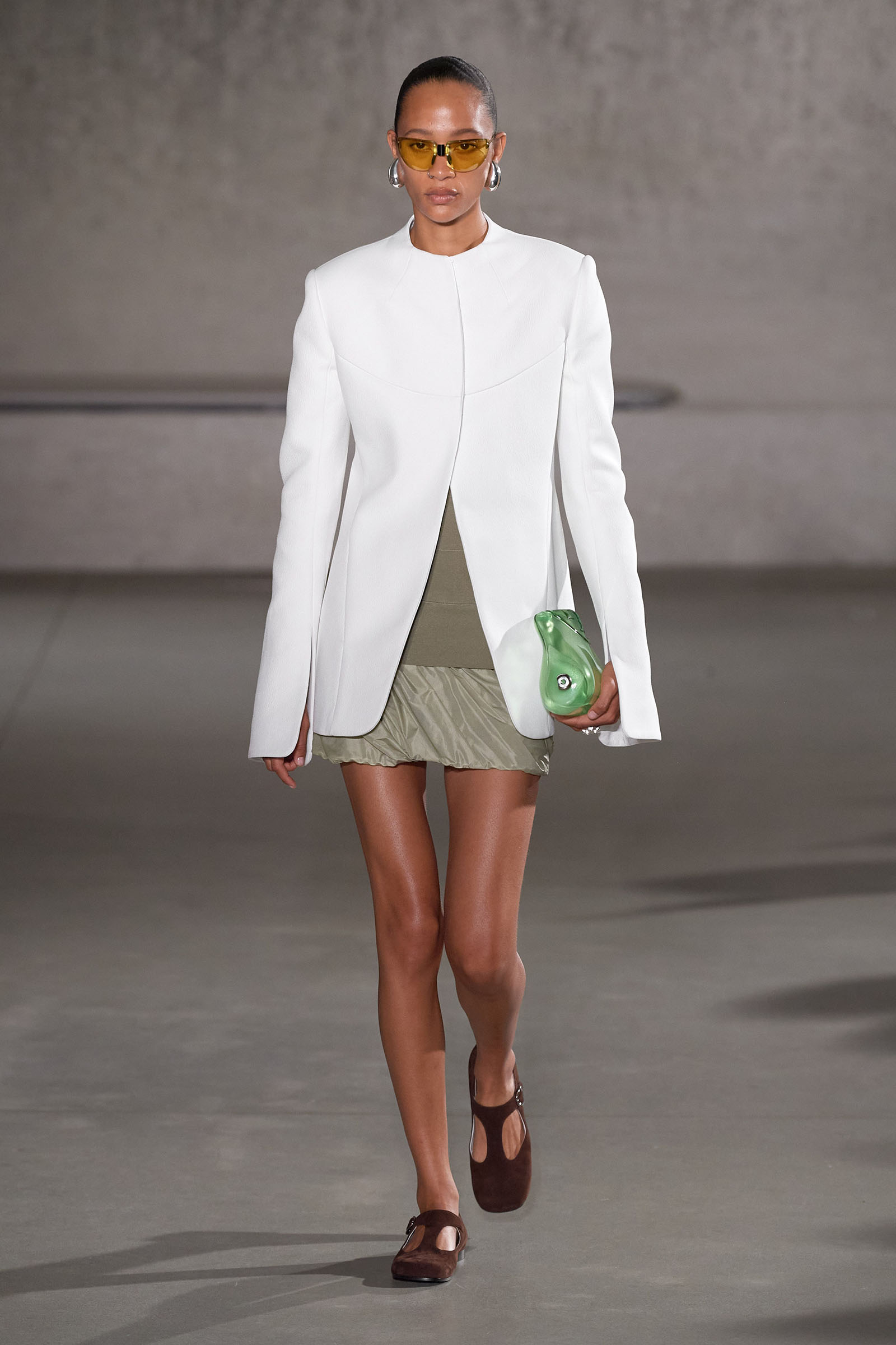 Did this collection live up to those principles? The thigh-high hems conveyed a carefree, youthful attitude, especially since they were paired with flat shoes, but the plunging U-necks, held in place with what looked like tie clips, might not prove as easy to wear. Nylon taffeta zip polos worn with tech-y pants got closer to the effortlessness she said she was aiming for. A coat, coatdress, and skirt suit with stand-away collars had a more retro look, in keeping with the ’60s influences we’ve seen elsewhere this week.