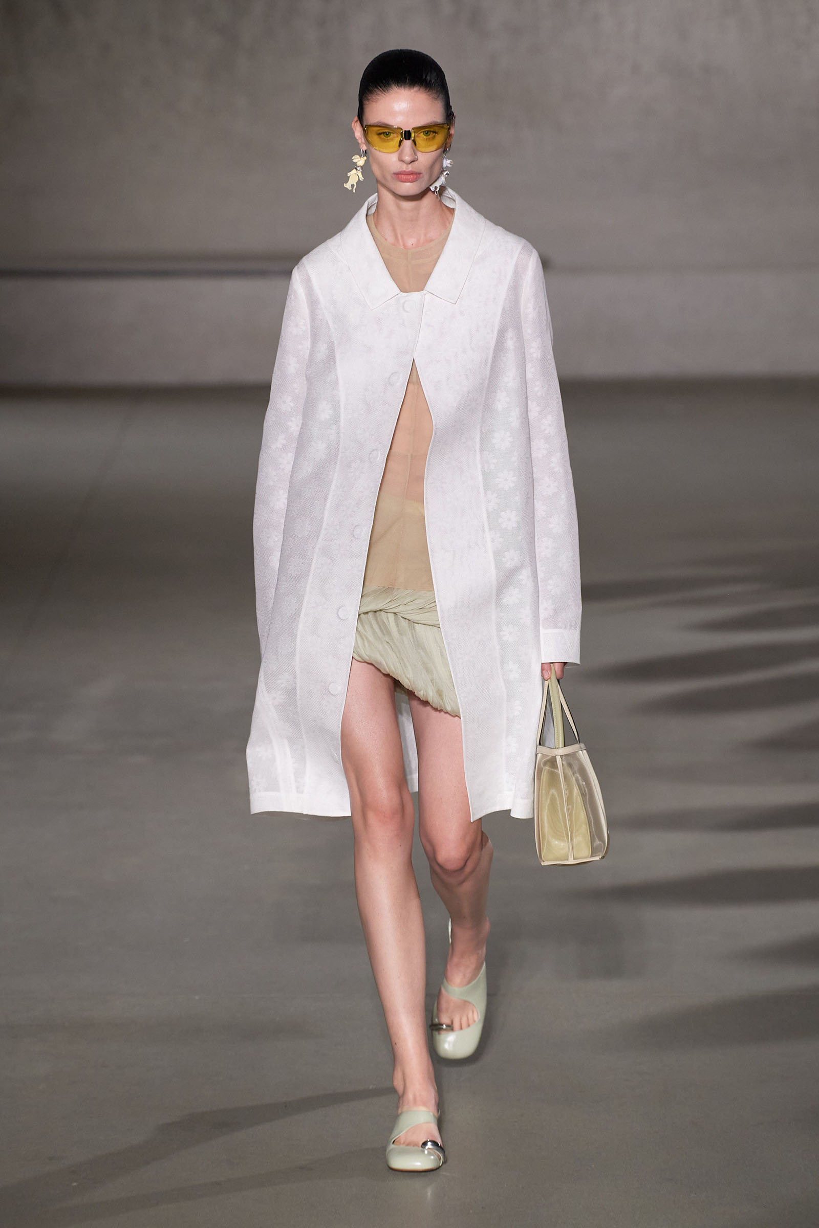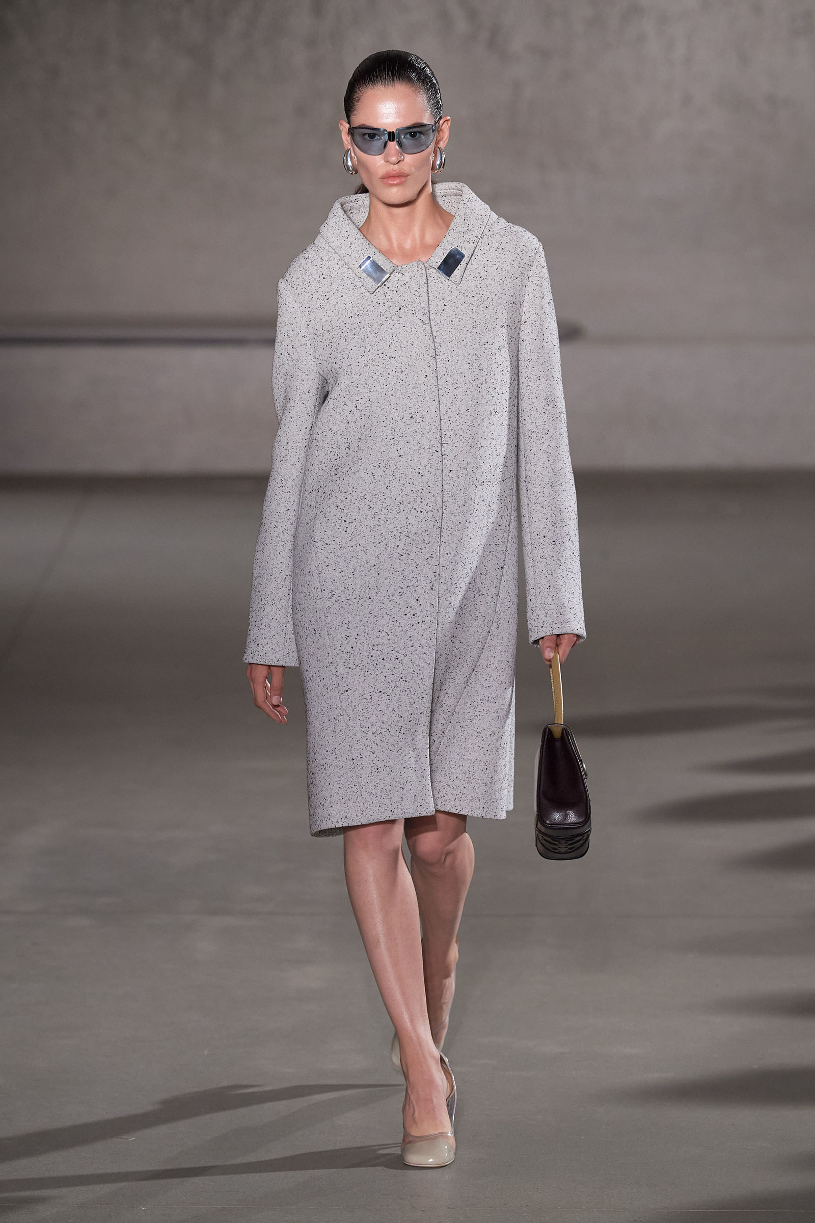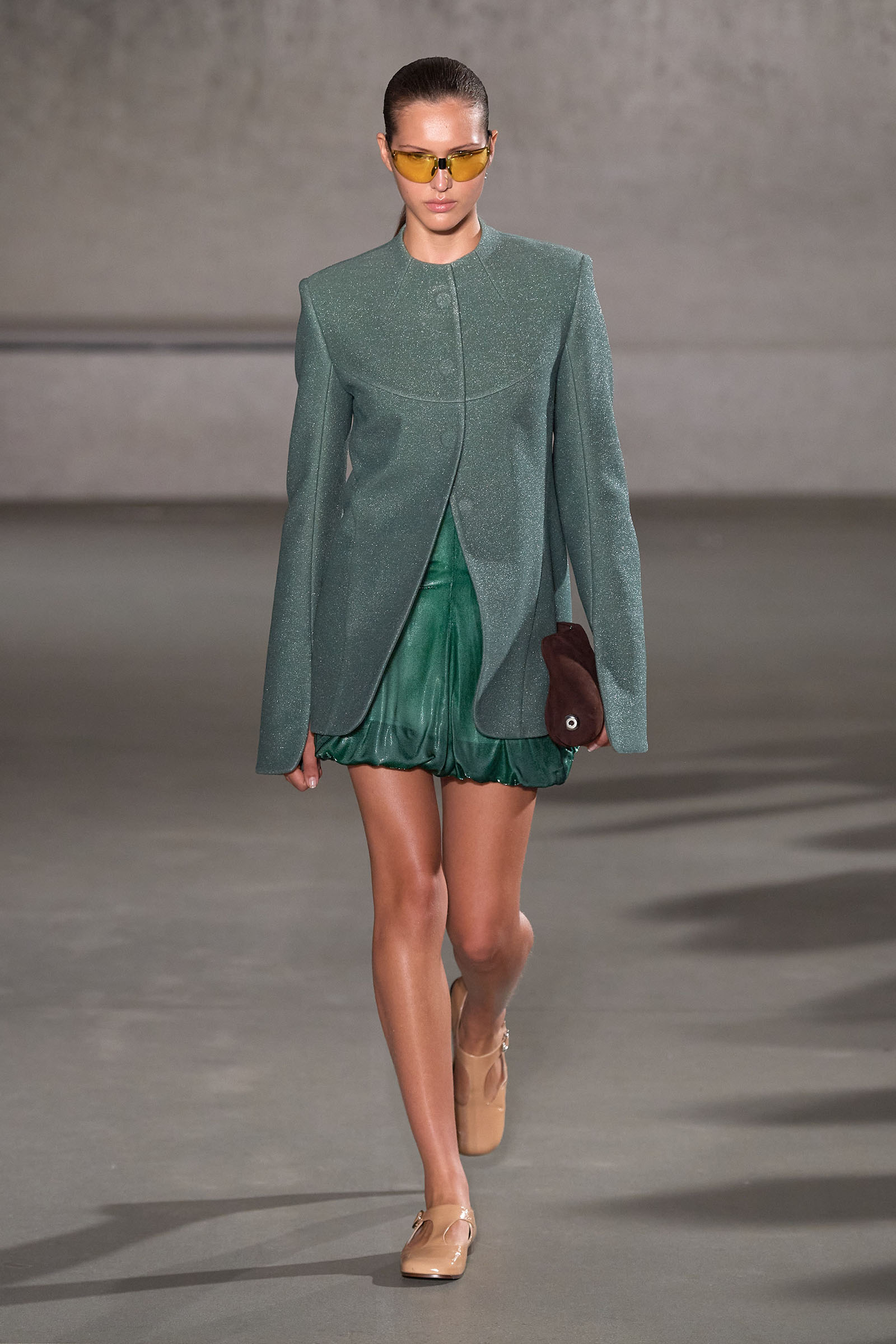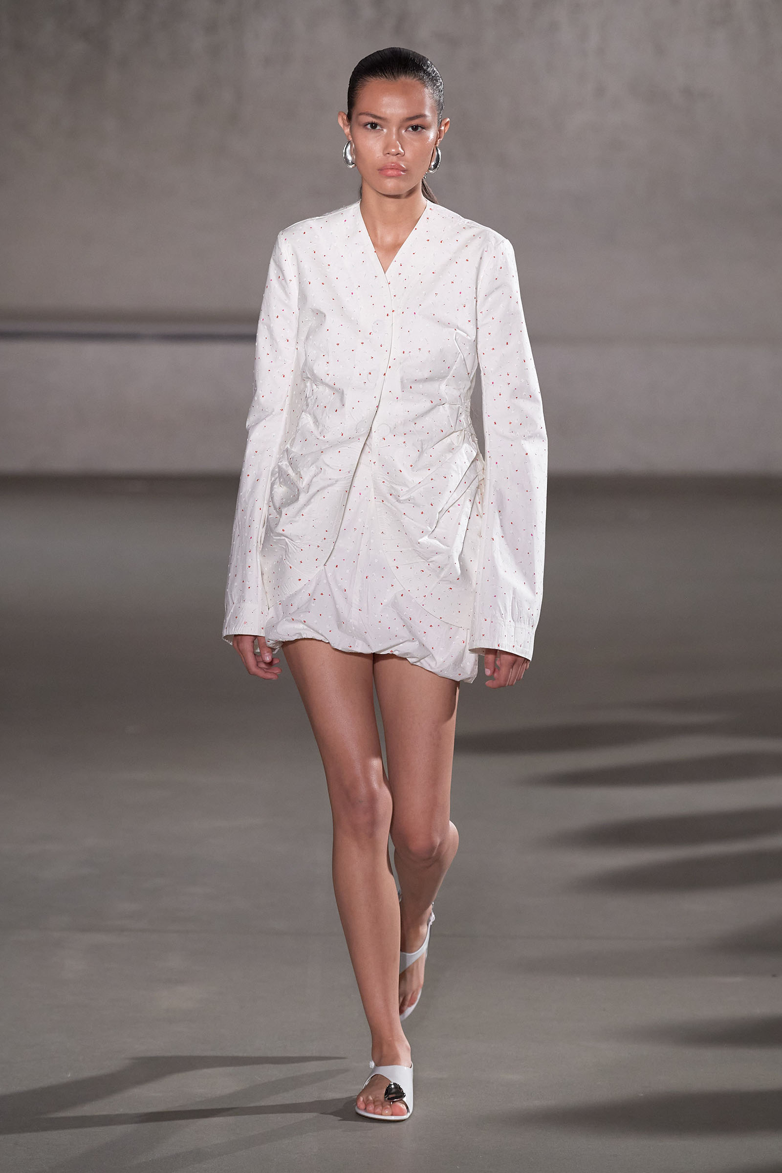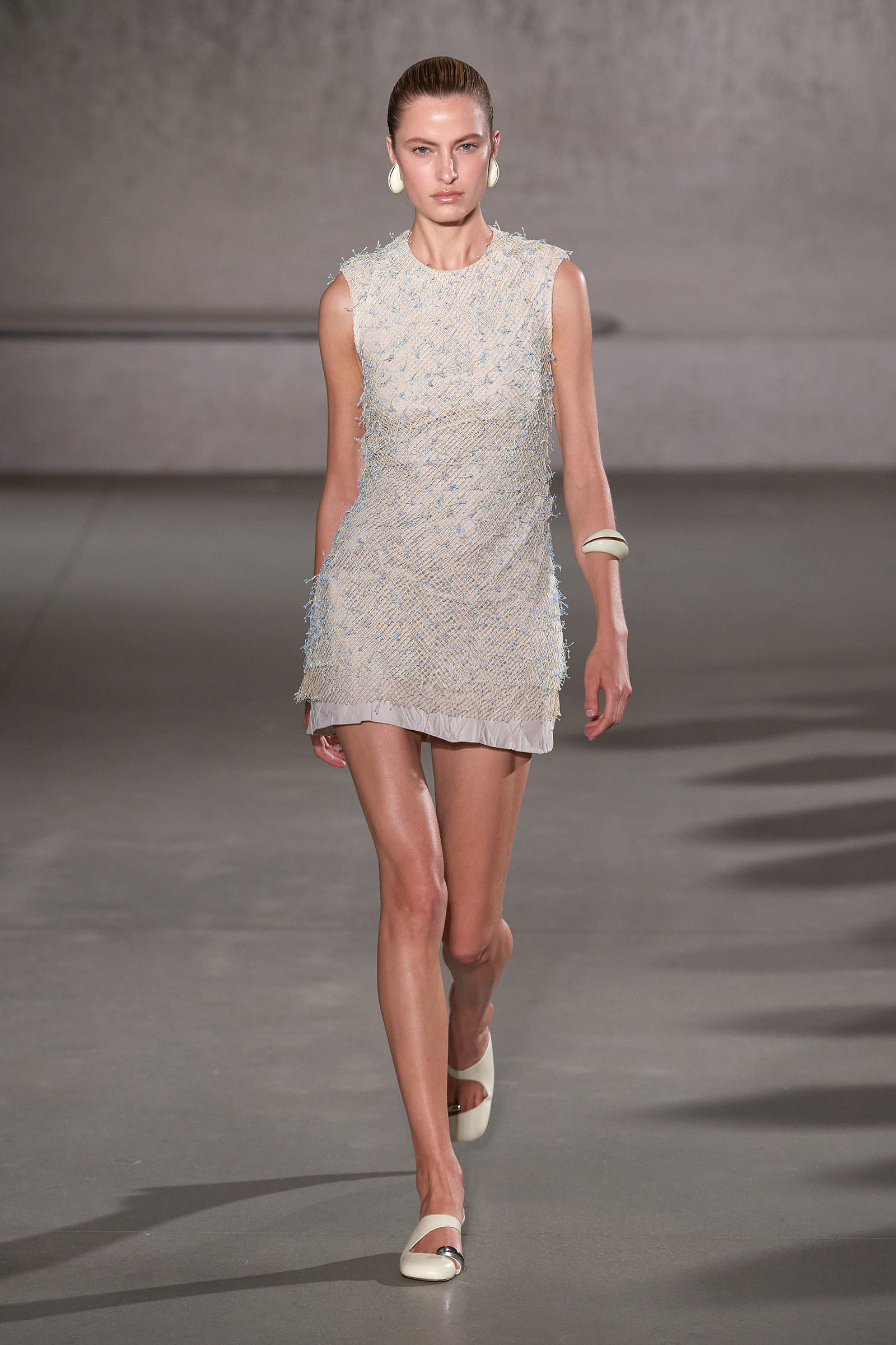 Did this collection live up to those principles? The thigh-high hems conveyed a carefree, youthful attitude, especially since they were paired with flat shoes, but the plunging U-necks, held in place with what looked like tie clips, might not prove as easy to wear. Nylon taffeta zip polos worn with tech-y pants got closer to the effortlessness she said she was aiming for. A coat, coatdress, and skirt suit with stand-away collars had a more retro look, in keeping with the ’60s influences we’ve seen elsewhere this week.