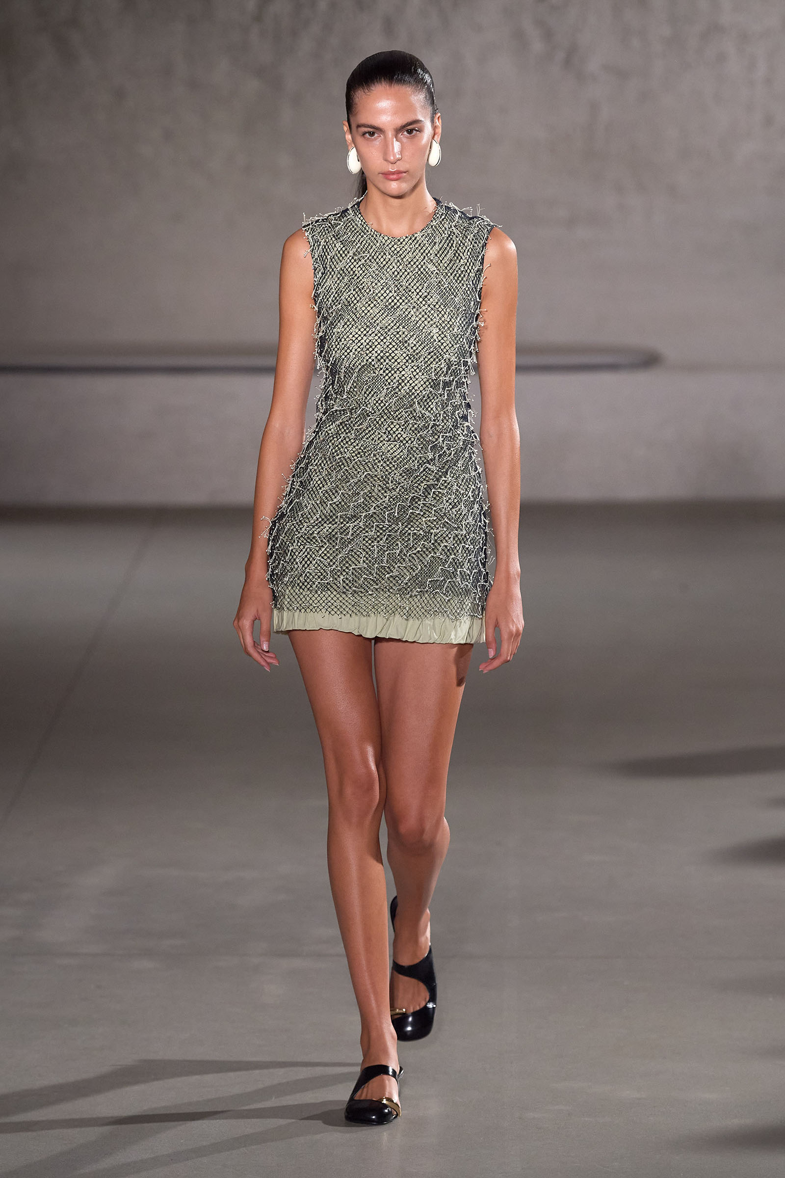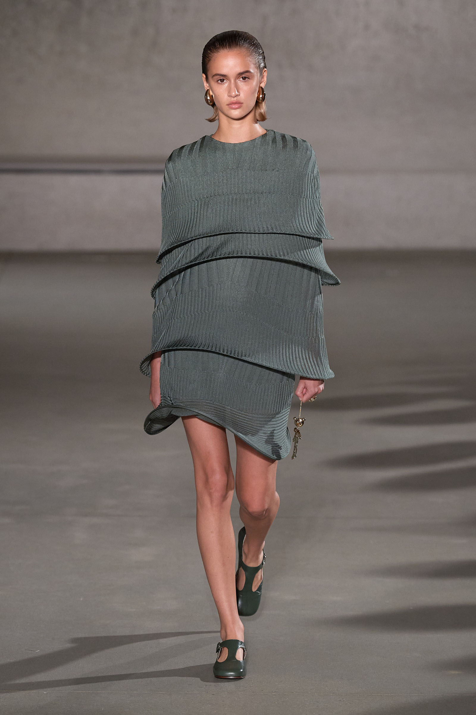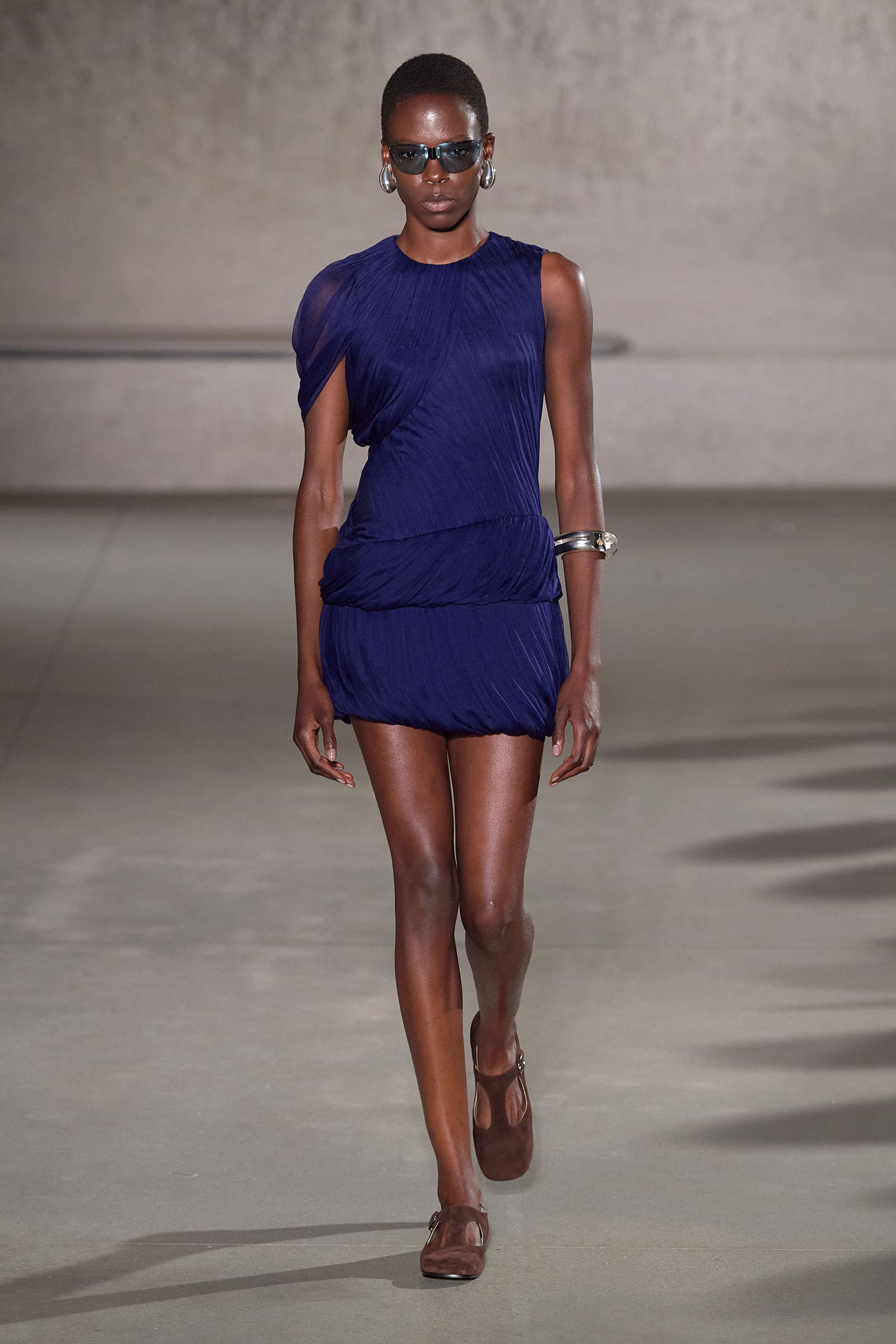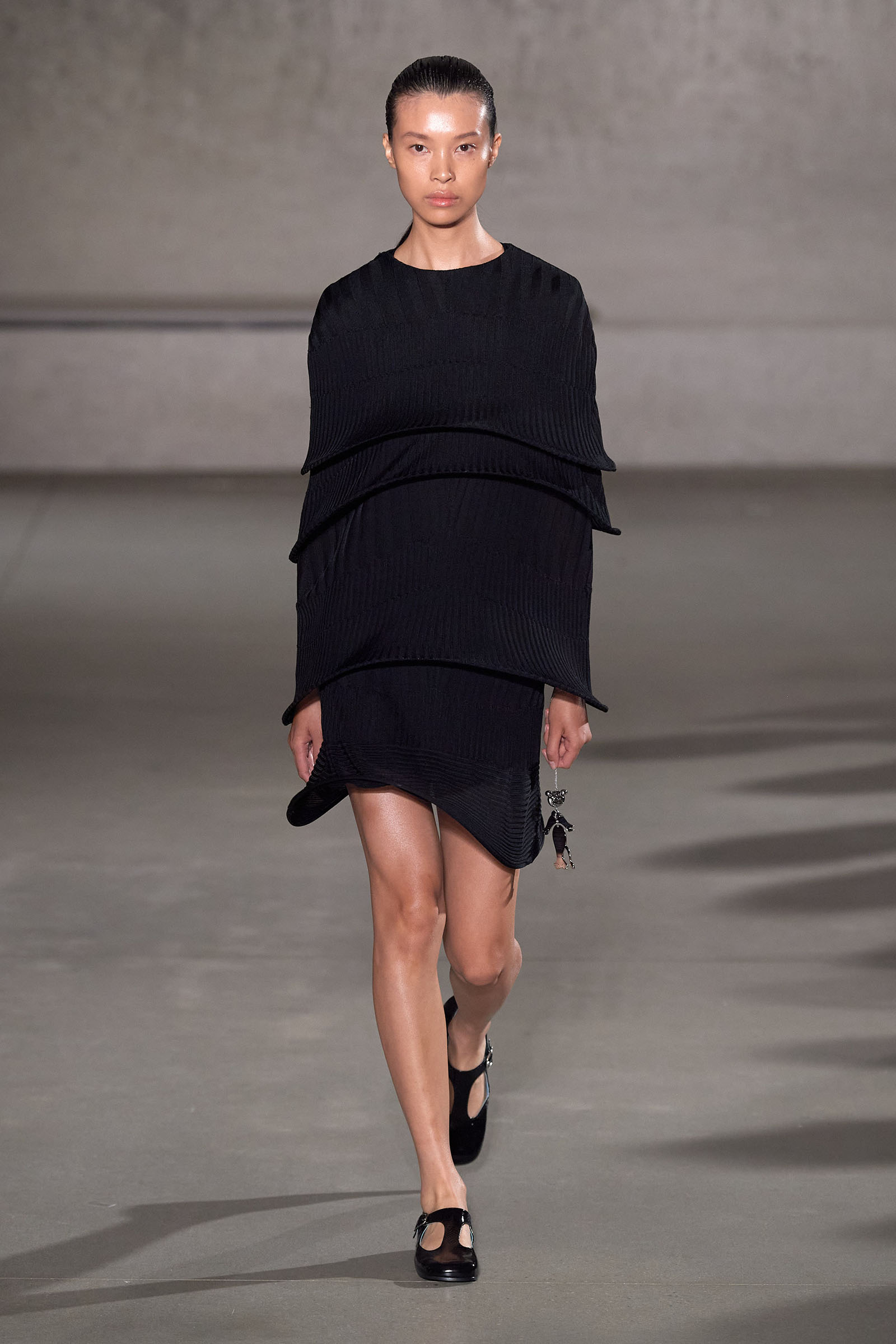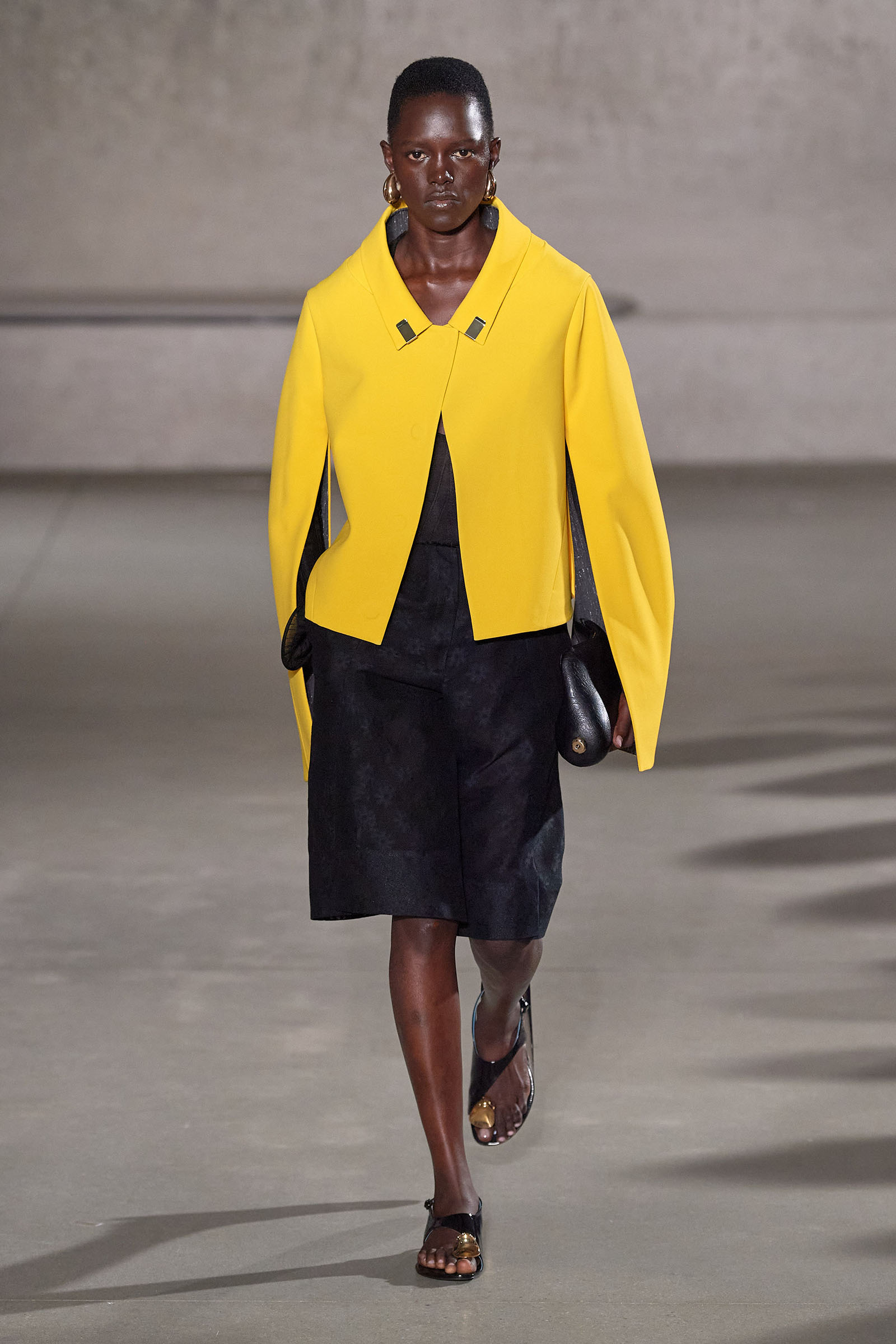 Did this collection live up to those principles? The thigh-high hems conveyed a carefree, youthful attitude, especially since they were paired with flat shoes, but the plunging U-necks, held in place with what looked like tie clips, might not prove as easy to wear. Nylon taffeta zip polos worn with tech-y pants got closer to the effortlessness she said she was aiming for. A coat, coatdress, and skirt suit with stand-away collars had a more retro look, in keeping with the ’60s influences we’ve seen elsewhere this week.