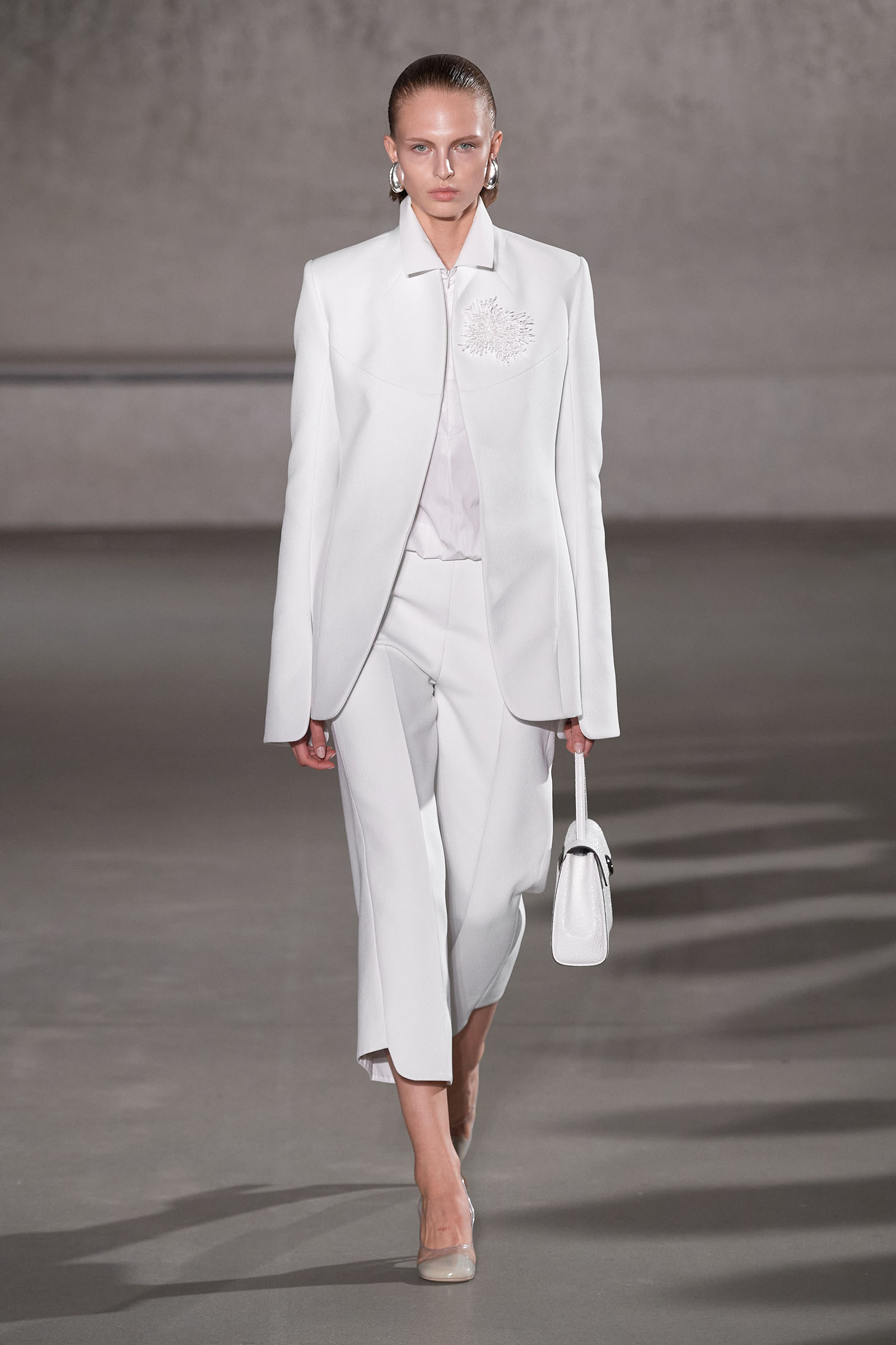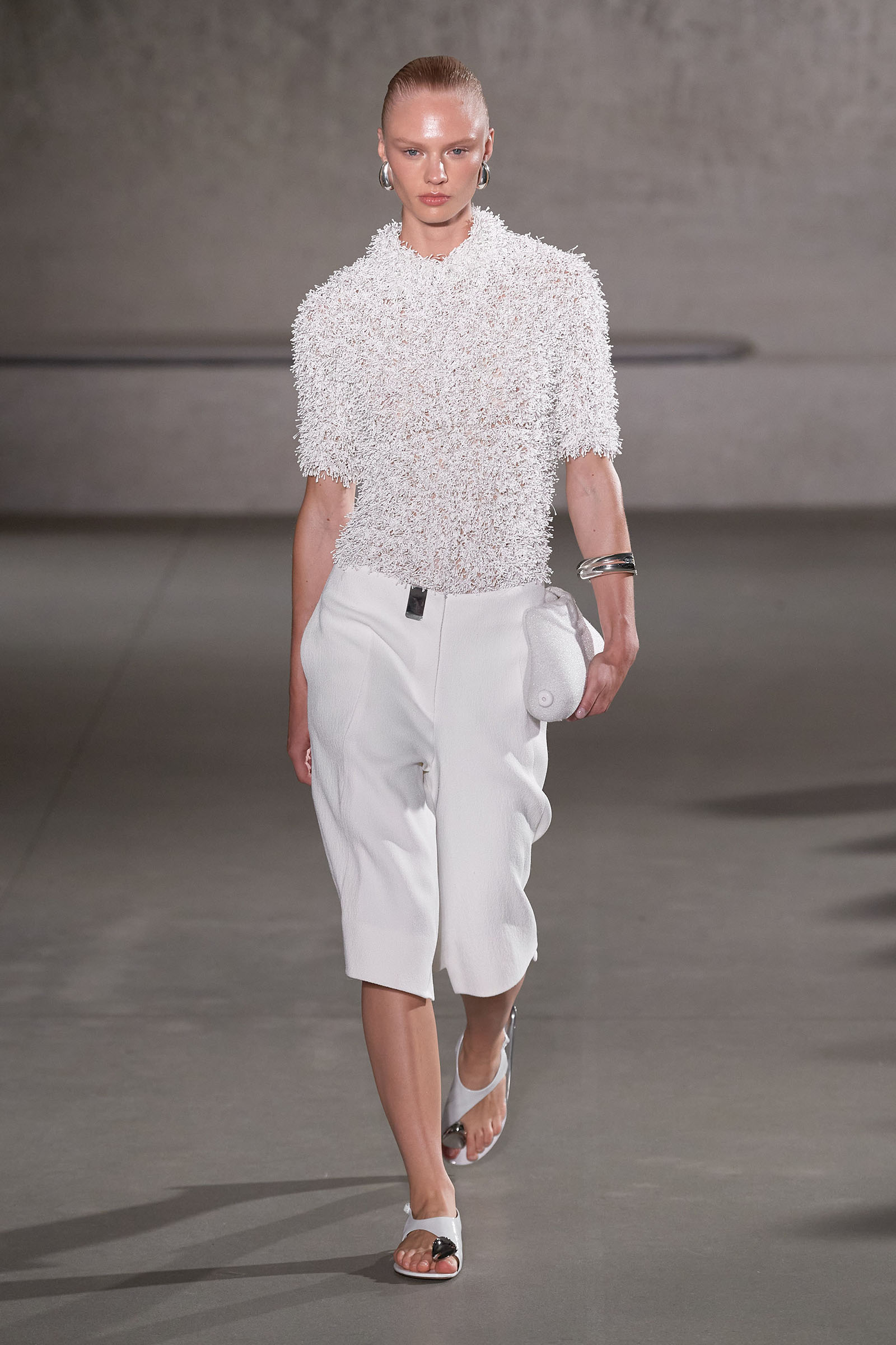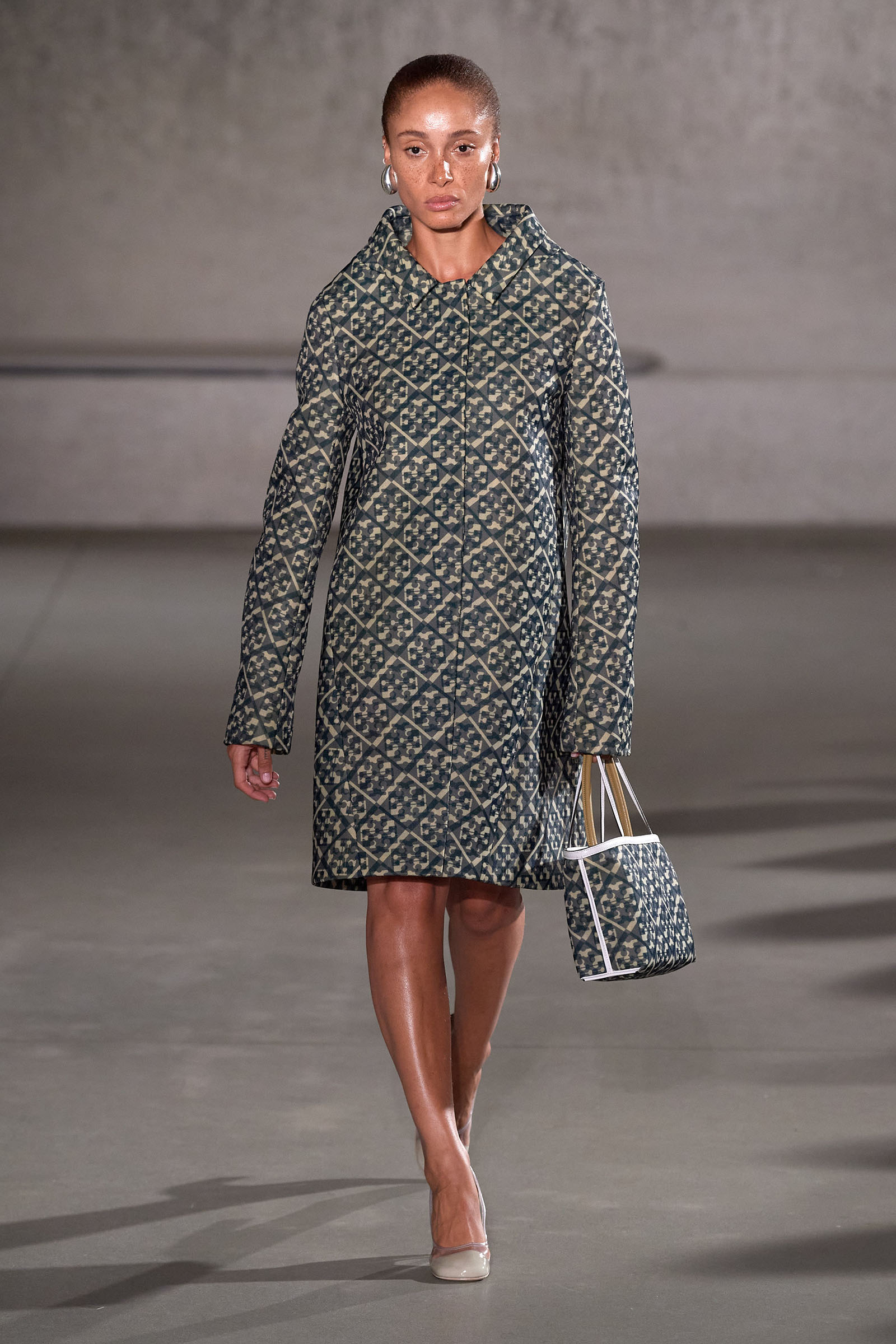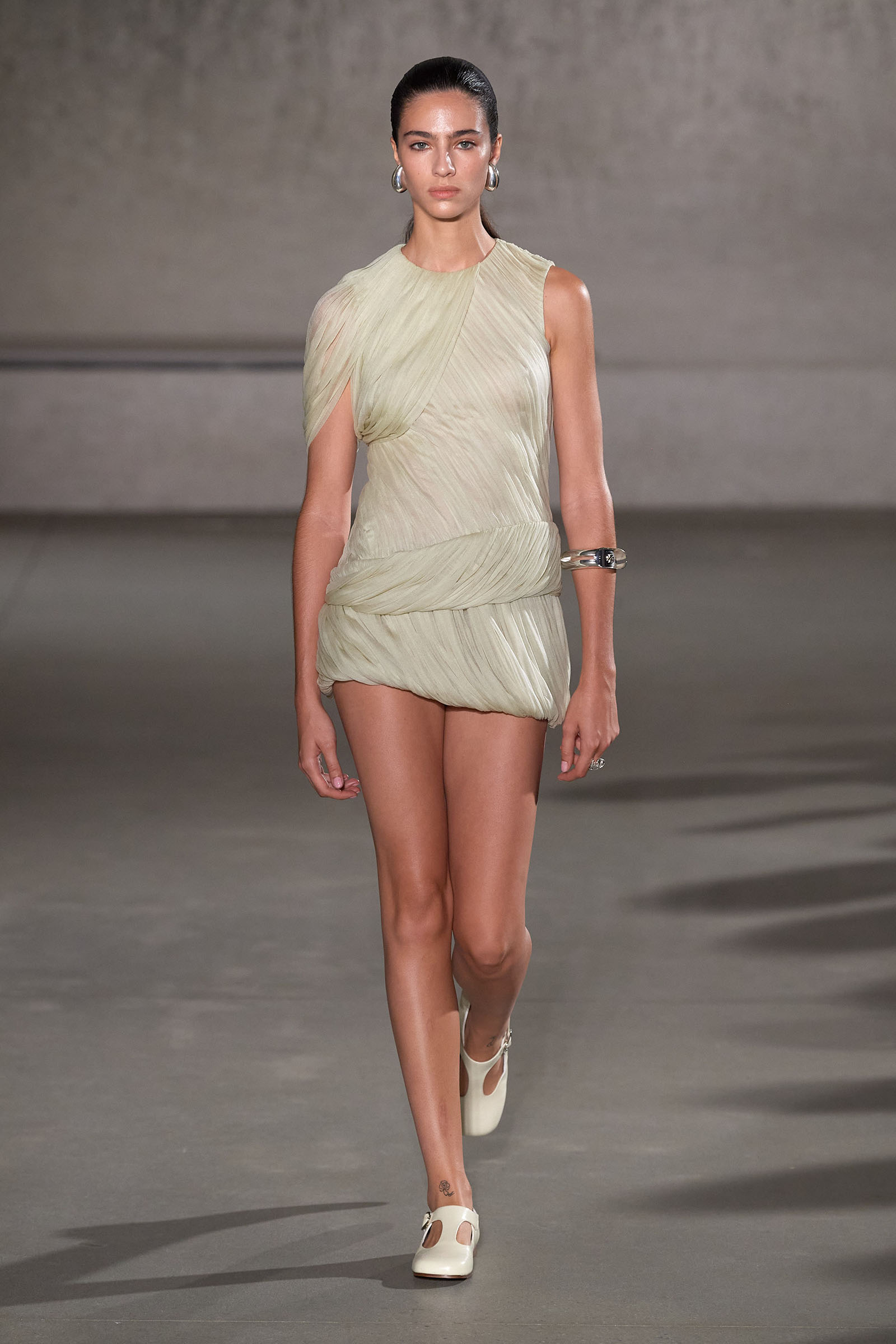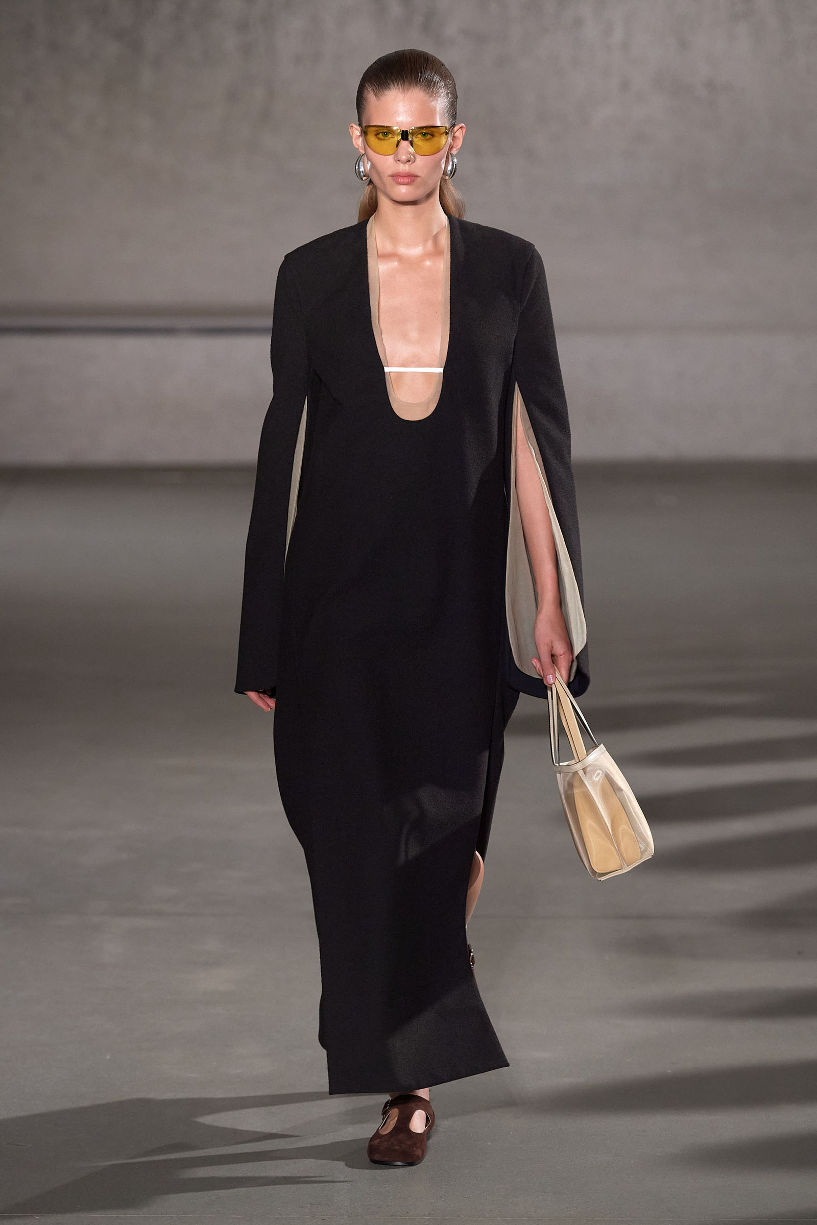 Did this collection live up to those principles? The thigh-high hems conveyed a carefree, youthful attitude, especially since they were paired with flat shoes, but the plunging U-necks, held in place with what looked like tie clips, might not prove as easy to wear. Nylon taffeta zip polos worn with tech-y pants got closer to the effortlessness she said she was aiming for. A coat, coatdress, and skirt suit with stand-away collars had a more retro look, in keeping with the ’60s influences we’ve seen elsewhere this week.