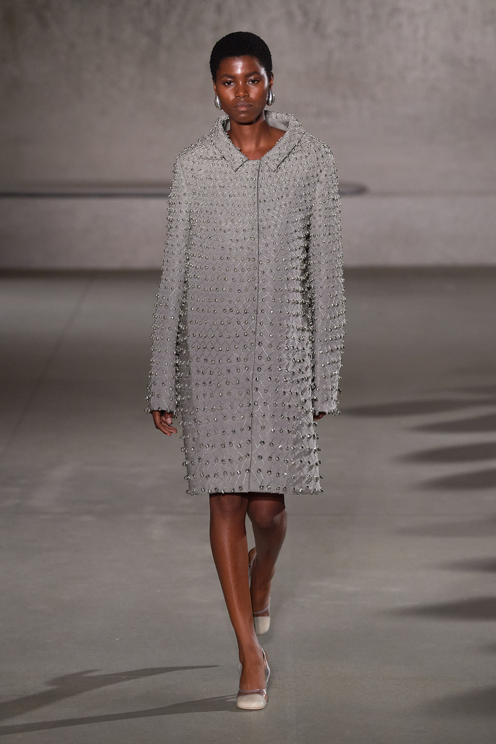 In comparison with Burch’s recent collections, there were a lot more embellishments here, even taking the form of a chainmail tunic strung with bells that jingled as the model walked by. It might not be the most practical of garments, but another thing Burch has been cultivating is her sense of play. The earrings in looks 7 and 12? Those were cows, no explanation given. As for all those crinoline rings, Burch explained that she liked taking what once held women back and turning them into something freeing. Into possibilities. We all can get with that.