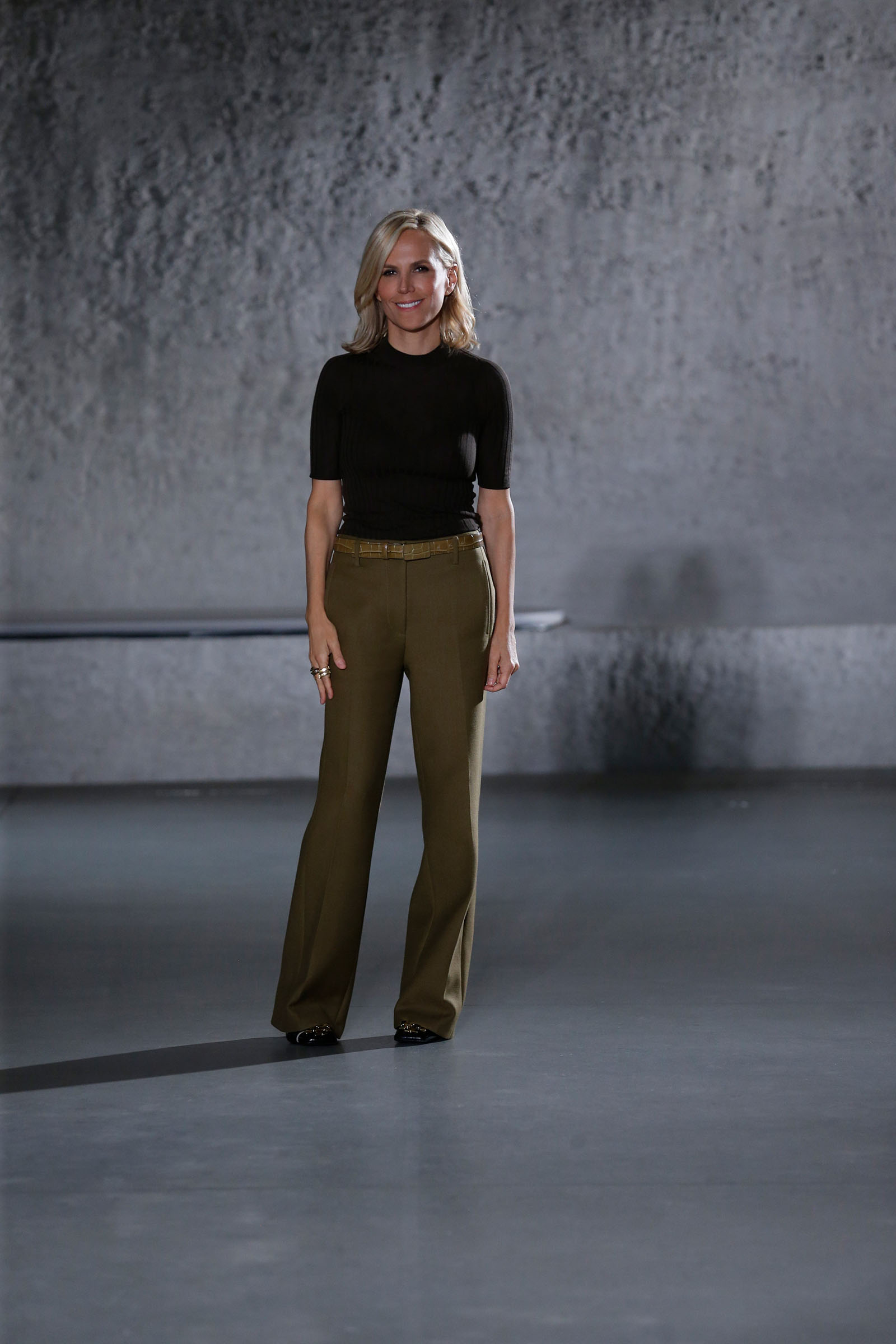 Tory Burch scored the prize and held her show in the museum’s new wing tonight. Maybe it was the center’s transportive atmosphere, but I saw space age aspects to her new collection. They were there in the crinoline rings that formed the bouncy hems of viscose knit dresses, in the uniform-like sensibility of the collarless bonded jersey jackets she paired with super-short minis, and in the ergonomically designed molded plastic handbags. Burch herself said nothing about the space age. Rather, she said she’d been thinking about what “effortless” means now. She liked the idea of clothing that “frees up your mind.”