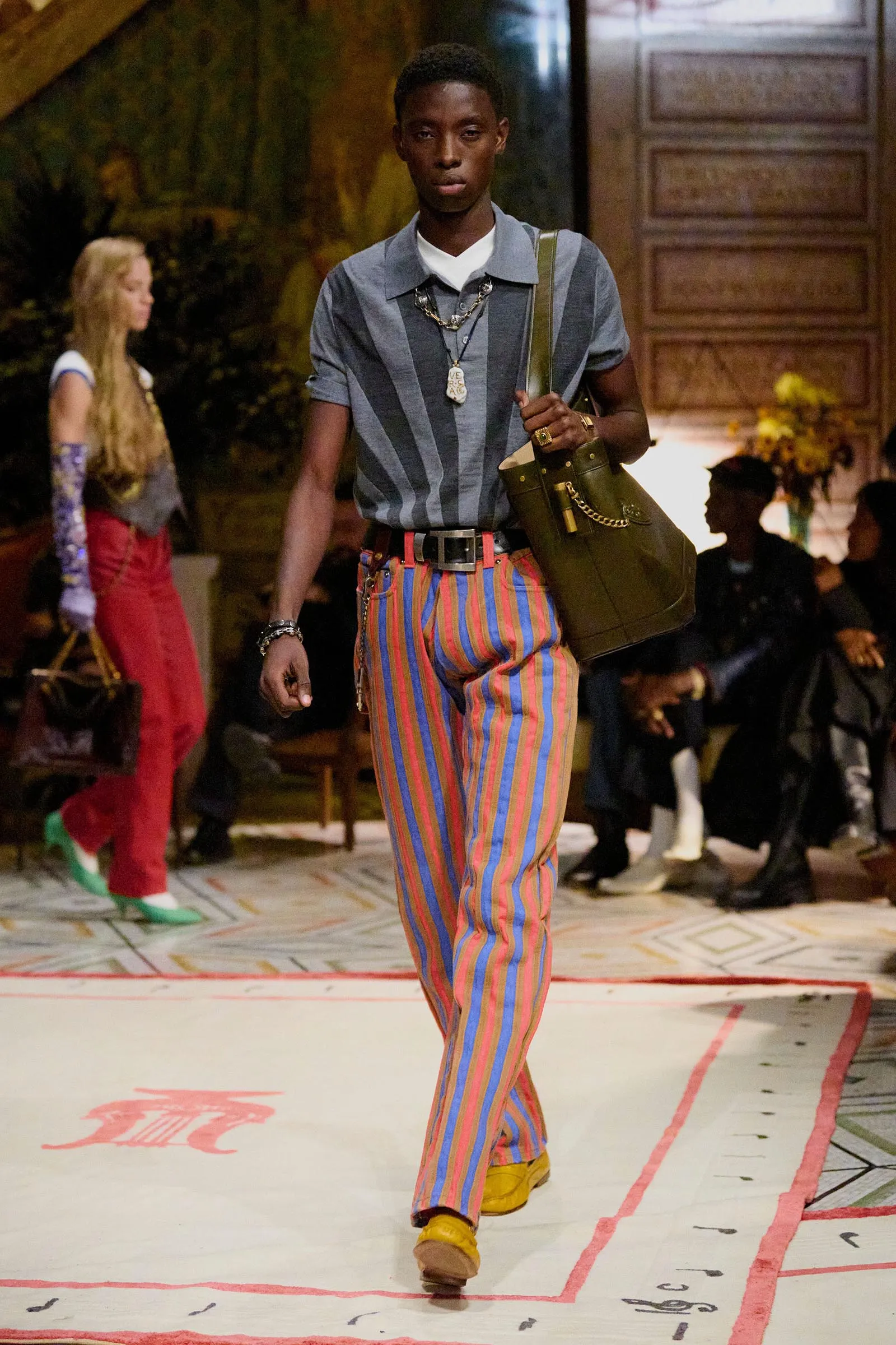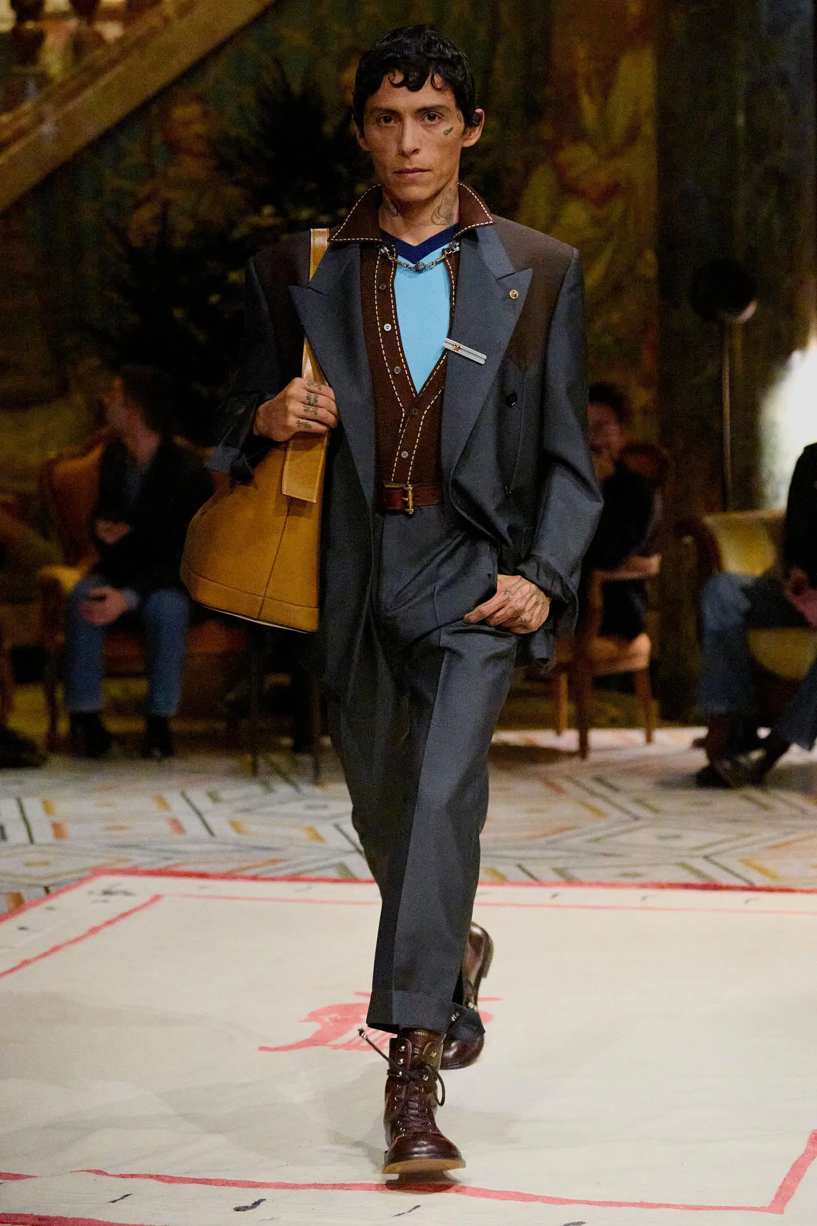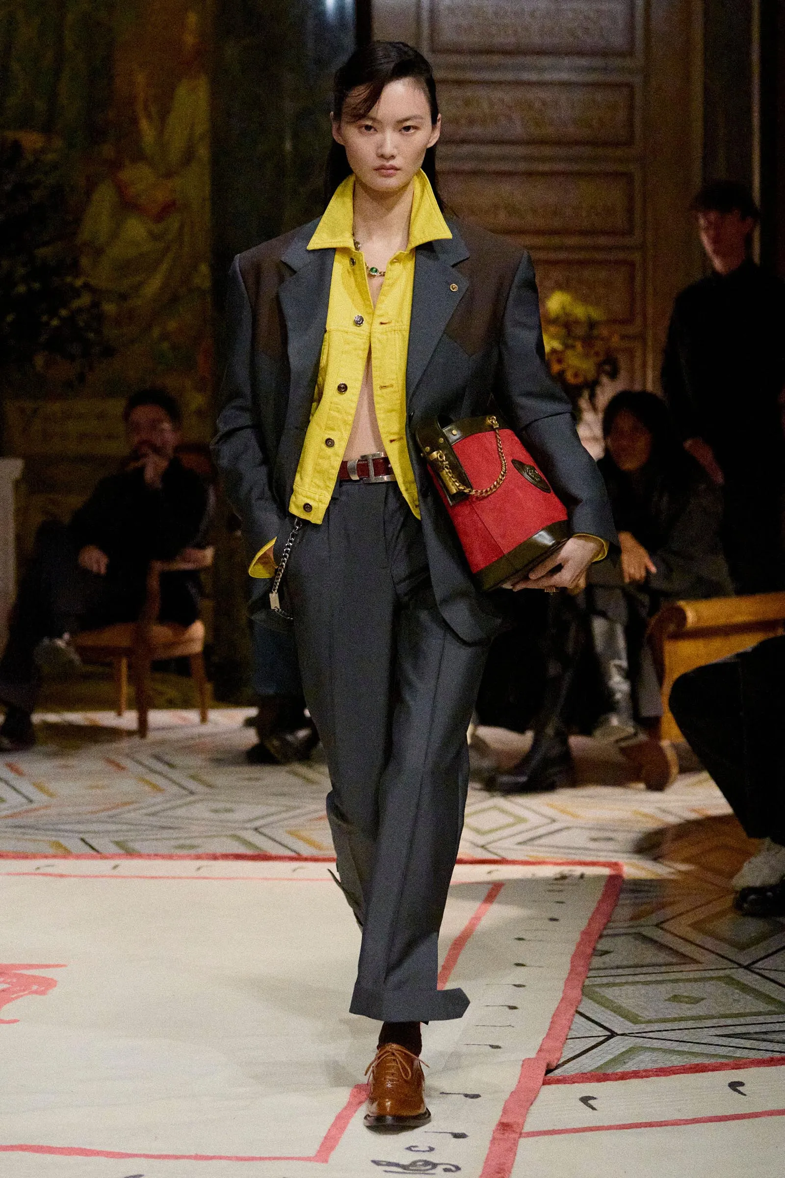 We were at the Pinacoteca Ambrosiana, a gem of a museum apparently never used for a fashion show before that houses the largest collection of Leonardo da Vinci’s drawings and notes, as well as a Caravaggio, among its treasures. Vitale said he has a “tormented passion for Caravaggio.” He also has a thing for Pier Paolo Pasolini’s Teorema, a movie in which the arrival of a mystery man upends a bourgeois household with liberating results. Vitale dressed the museum like a home; even going so far as to put his own bedsheets on a mattress tucked into a corner of one of the rooms. In his reimagining of Versace, he’s cast himself as the Visitor in Teorema. “It’s an awakening,” he said.