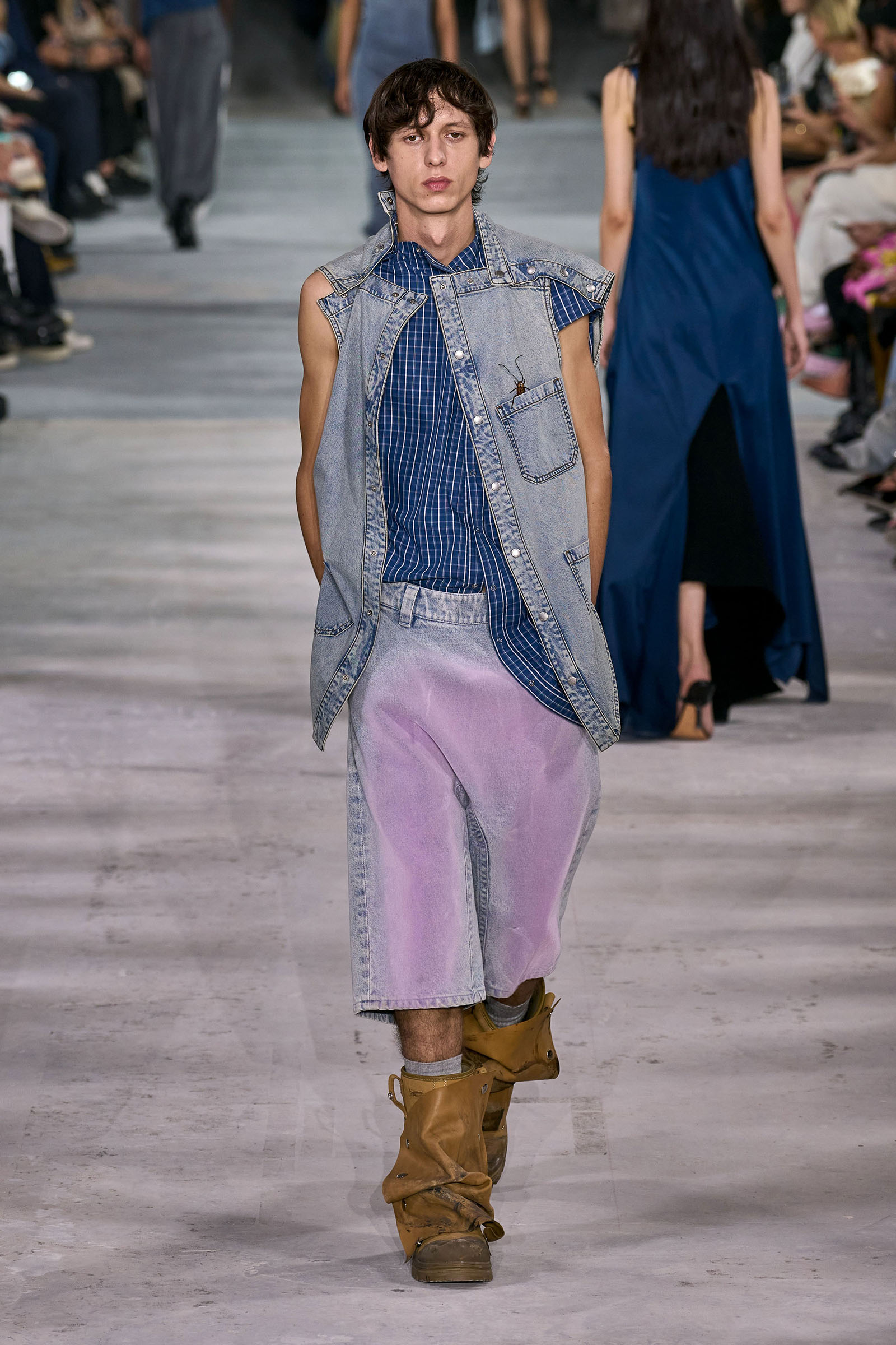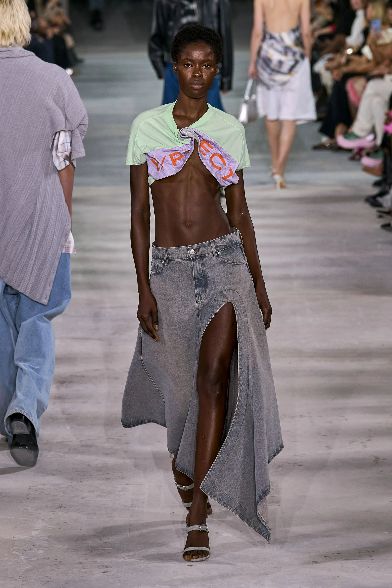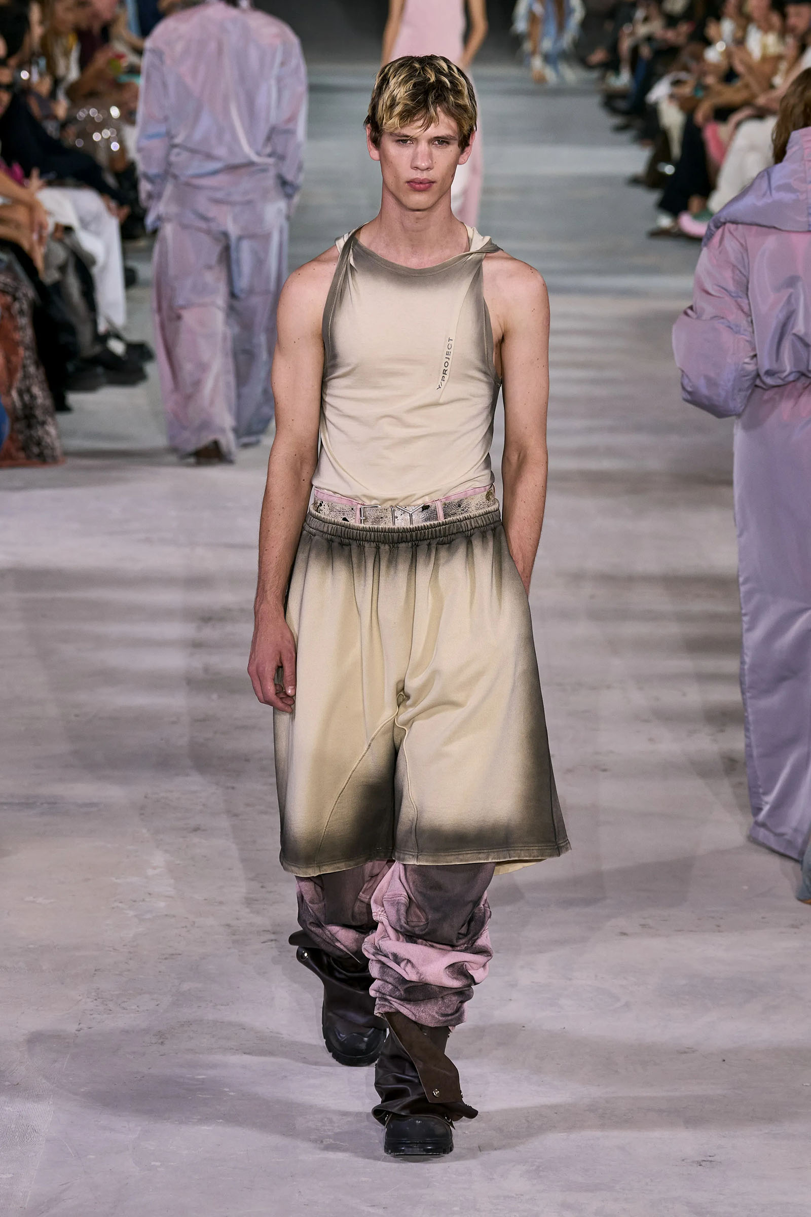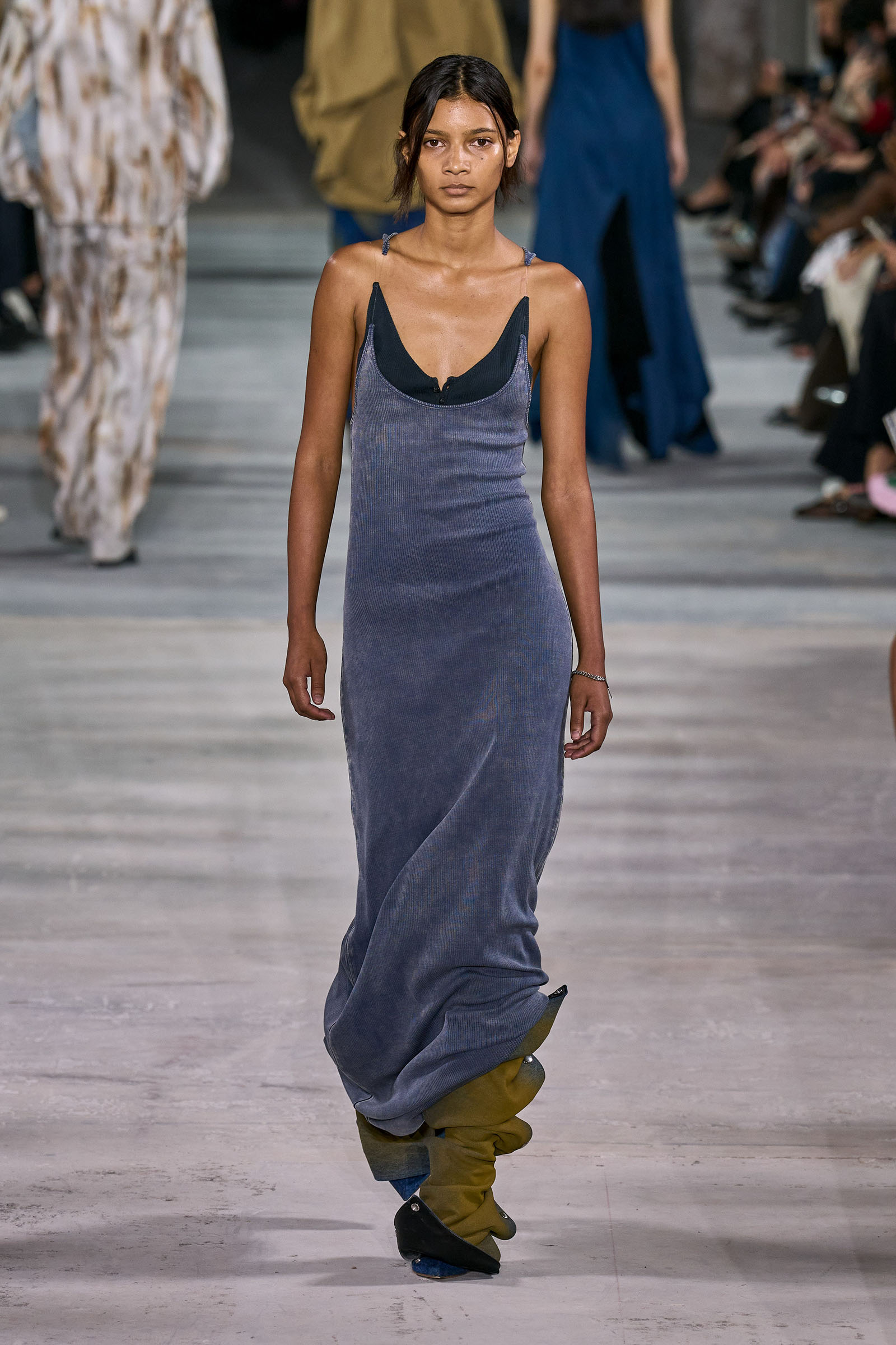 Like many a Y/Project collection before this one, the foundation here was denim torqued into all manner of non-obvious shapes and more often than not over-dyed in intense color—lavender, acid yellow, wine red. Some of the jeans appeared to snap onto the shafts of work boots. Twisting, twirling, and “changing the perception of wearability” is Martens’s m.o. here, and everything from logo tees to metal foil evening dresses got the treatment. The latter rivaled the gowns he made for the Jean Paul Gaultier haute couture collection he did for spring 2022, which is still the highpoint of that collaboration series.