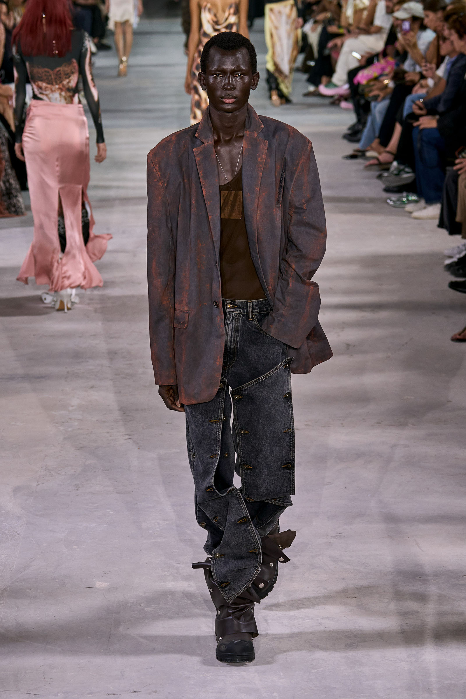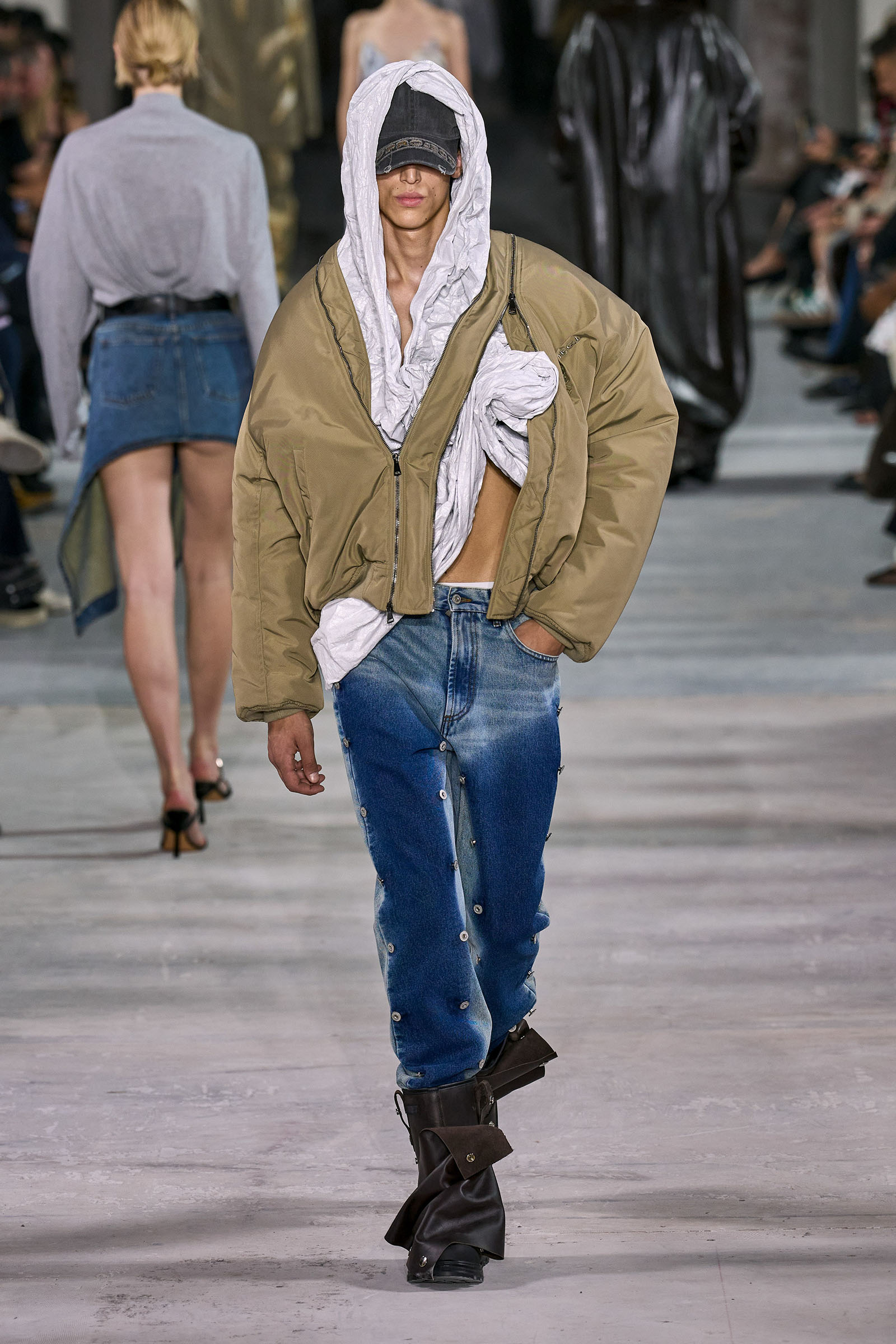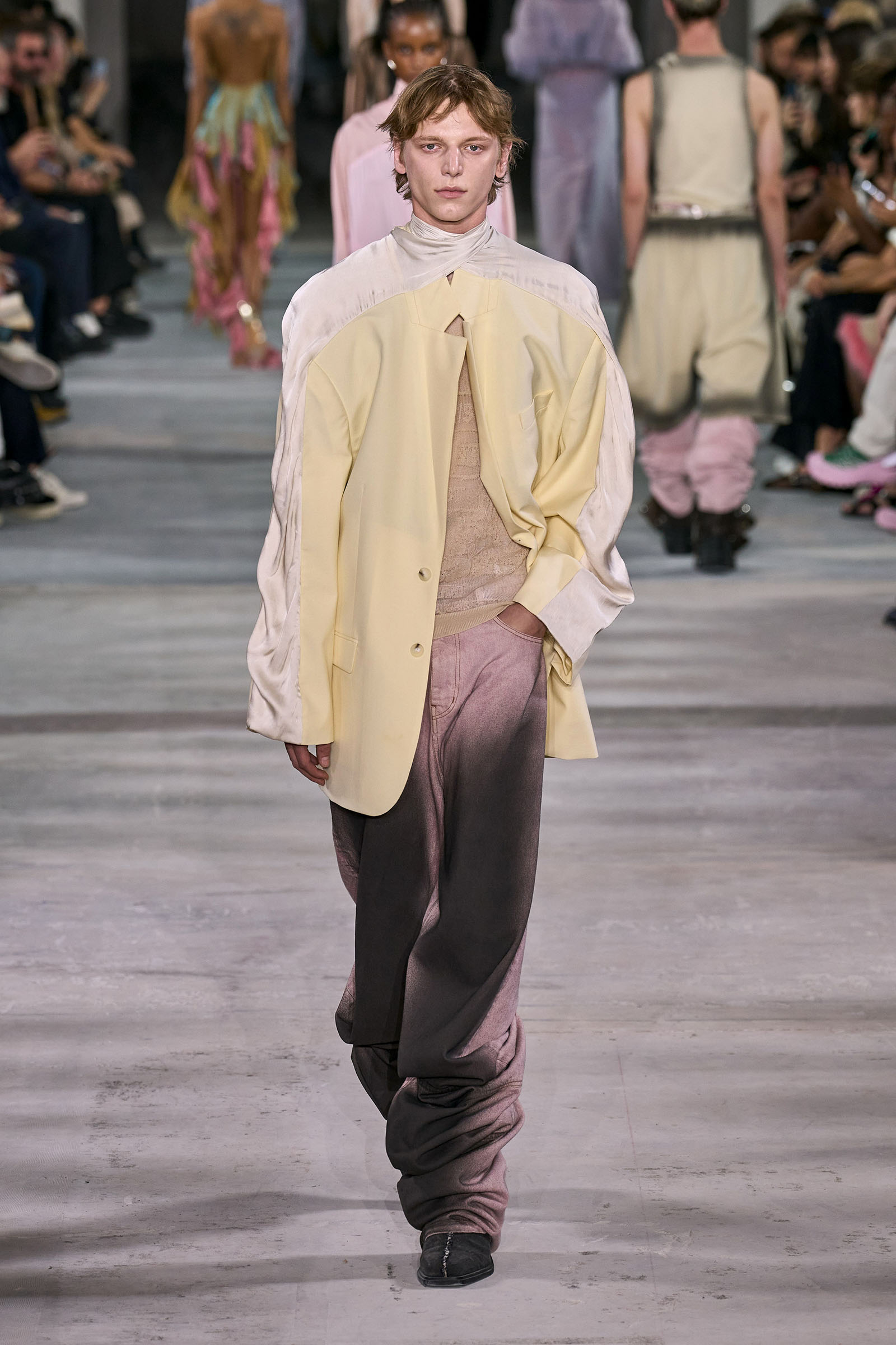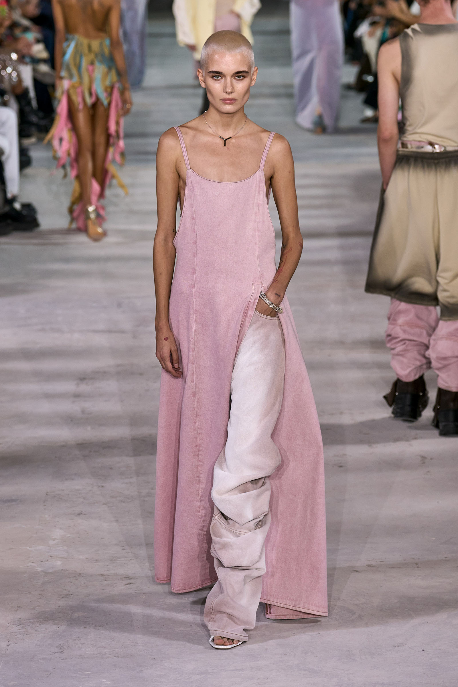 Like many a Y/Project collection before this one, the foundation here was denim torqued into all manner of non-obvious shapes and more often than not over-dyed in intense color—lavender, acid yellow, wine red. Some of the jeans appeared to snap onto the shafts of work boots. Twisting, twirling, and “changing the perception of wearability” is Martens’s m.o. here, and everything from logo tees to metal foil evening dresses got the treatment. The latter rivaled the gowns he made for the Jean Paul Gaultier haute couture collection he did for spring 2022, which is still the highpoint of that collaboration series.