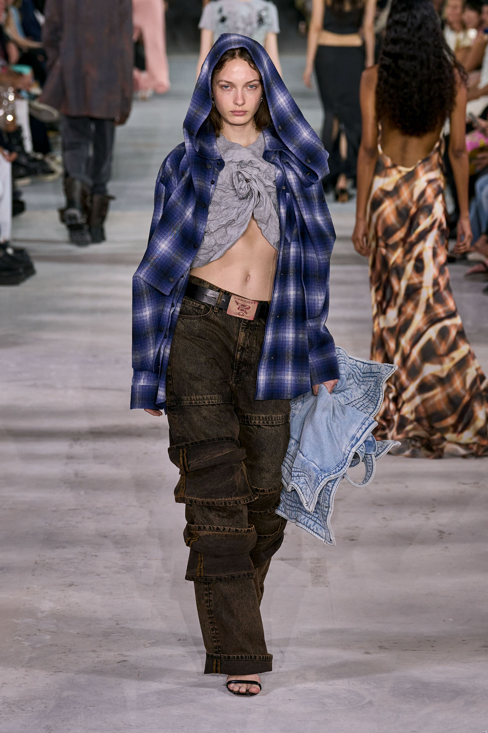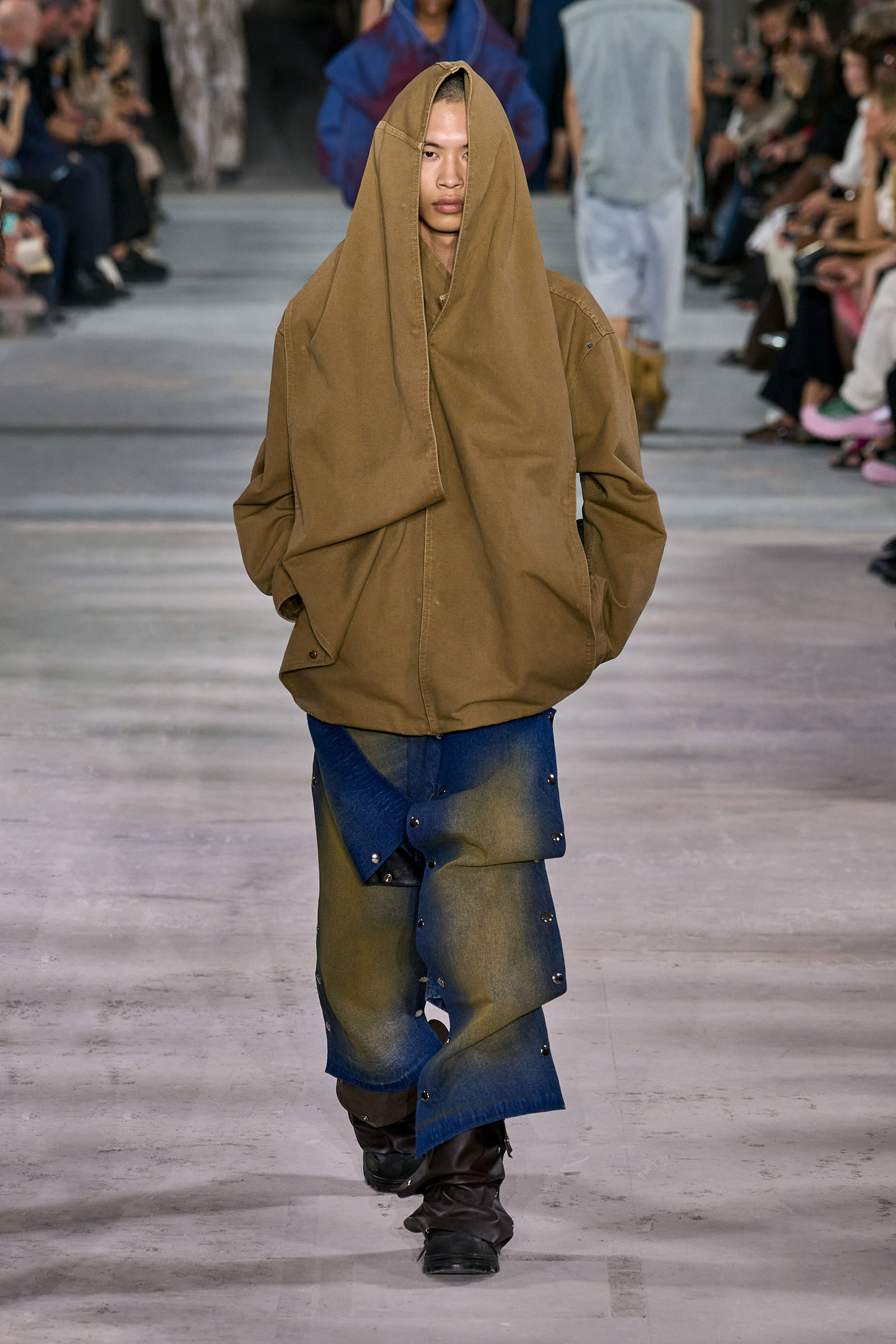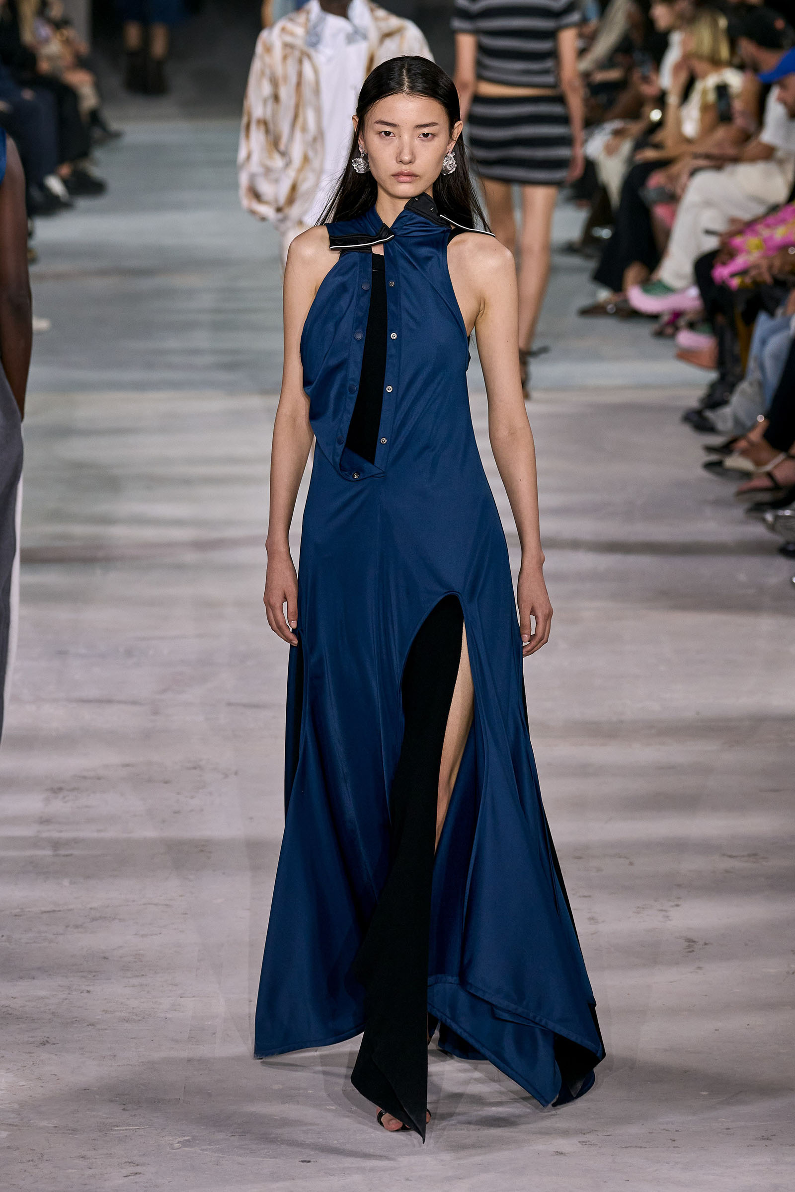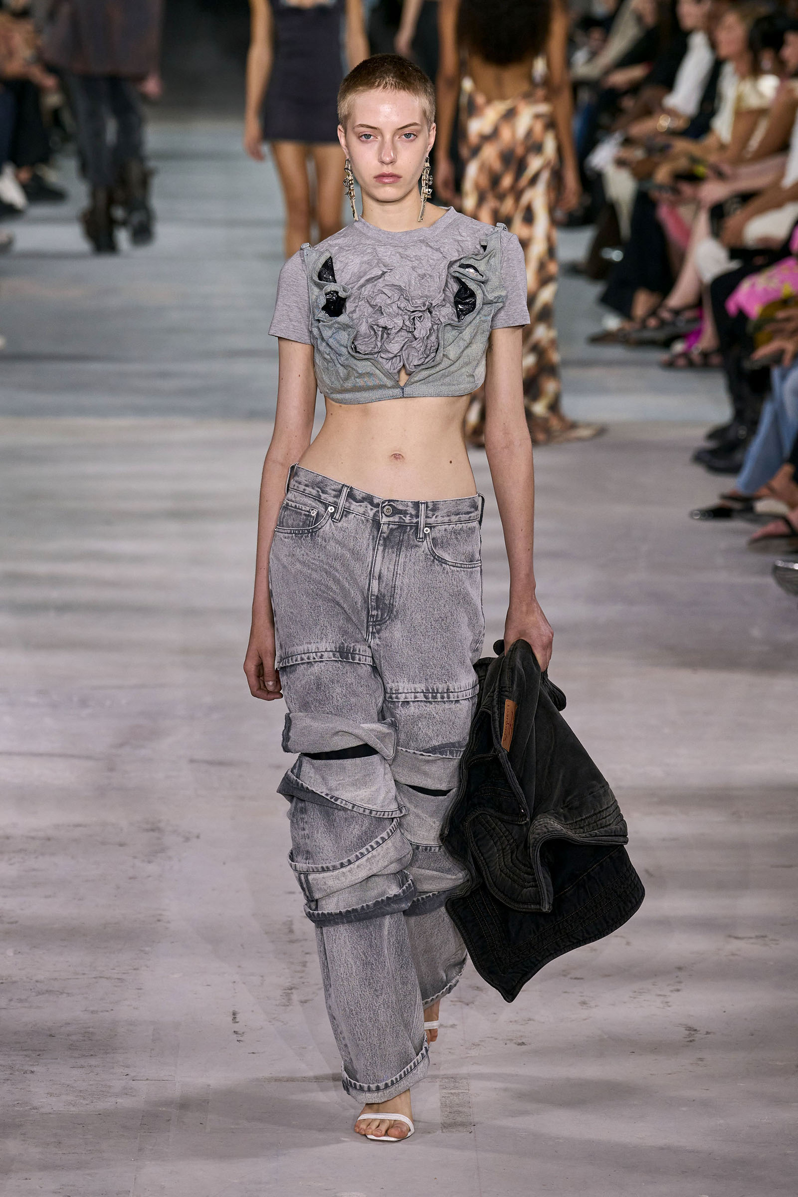 Like many a Y/Project collection before this one, the foundation here was denim torqued into all manner of non-obvious shapes and more often than not over-dyed in intense color—lavender, acid yellow, wine red. Some of the jeans appeared to snap onto the shafts of work boots. Twisting, twirling, and “changing the perception of wearability” is Martens’s m.o. here, and everything from logo tees to metal foil evening dresses got the treatment. The latter rivaled the gowns he made for the Jean Paul Gaultier haute couture collection he did for spring 2022, which is still the highpoint of that collaboration series.
