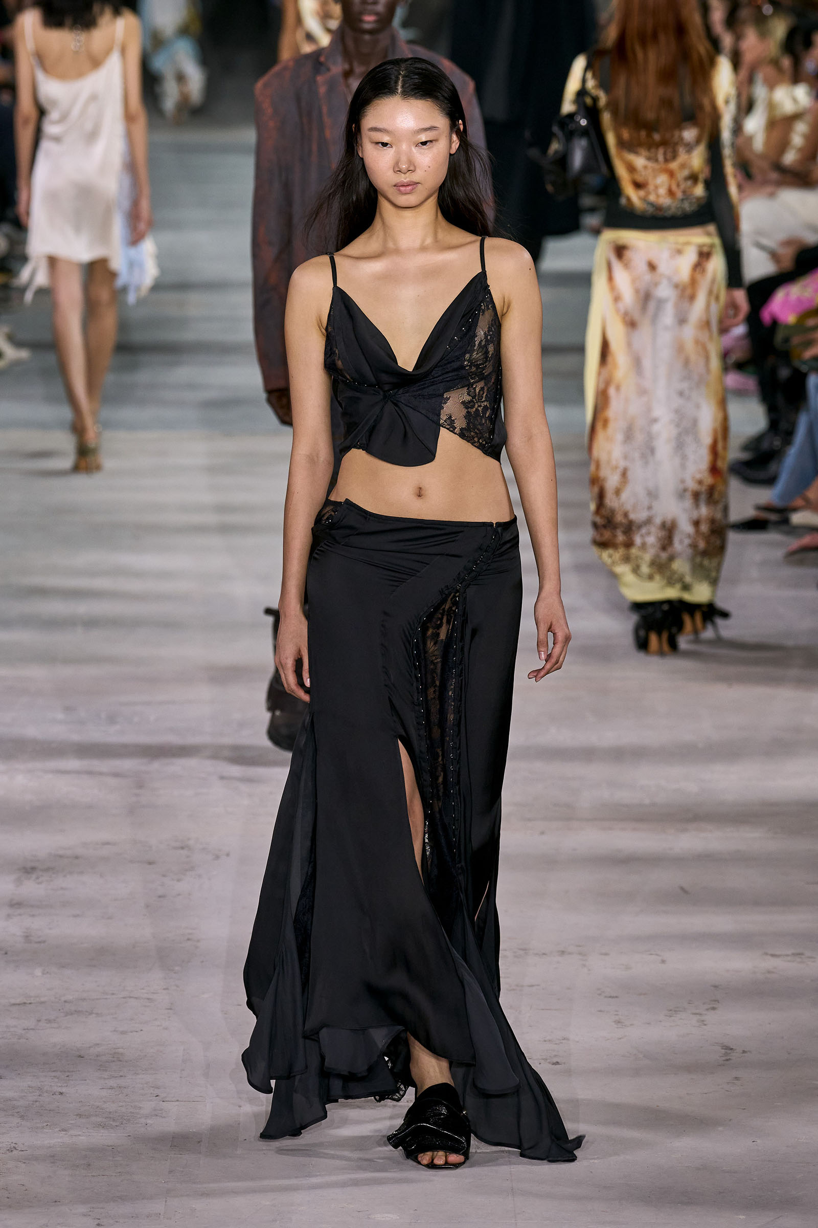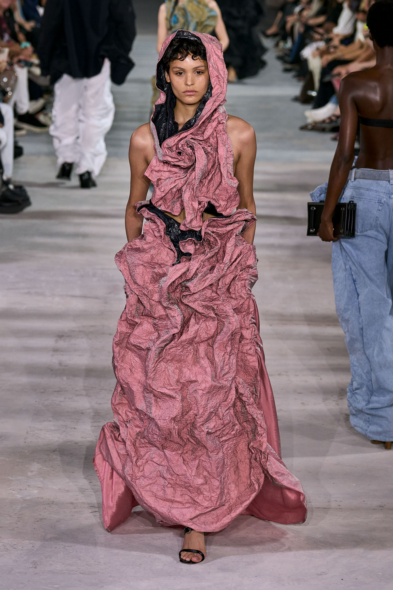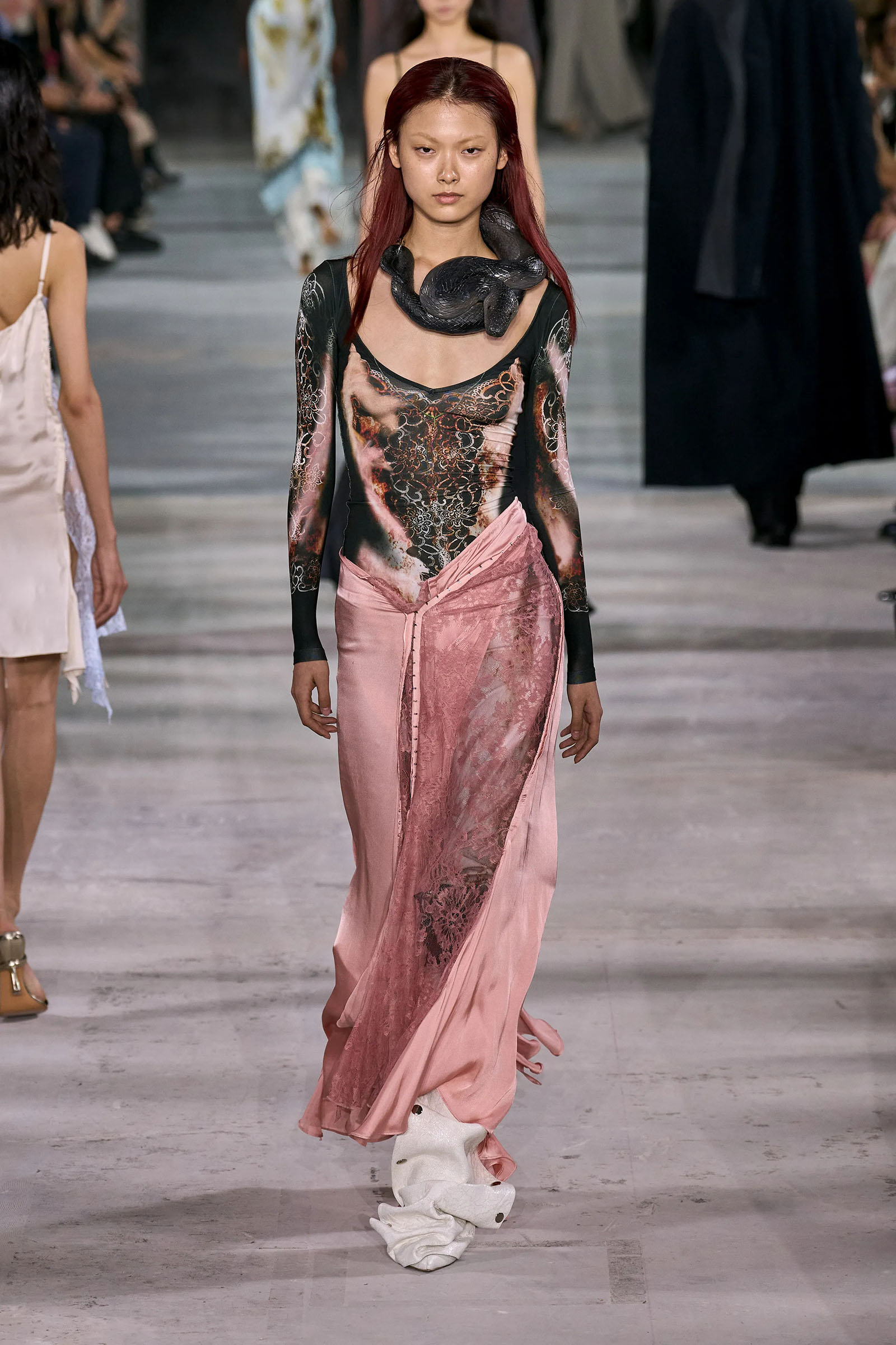 For the non-architecturally inclined, he reproduced the twists and twirls of his more three-dimensional designs in prints on silk “to be a bit more easy to wear.” They included scans of folds, pleats, and distressed lace; the lace print on a slip, in particular, will remind Gen Xers of Martin Margiela’s iconic photocopy dresses. As Martens came out for his bow it wasn’t just the fashion kids that cheered.