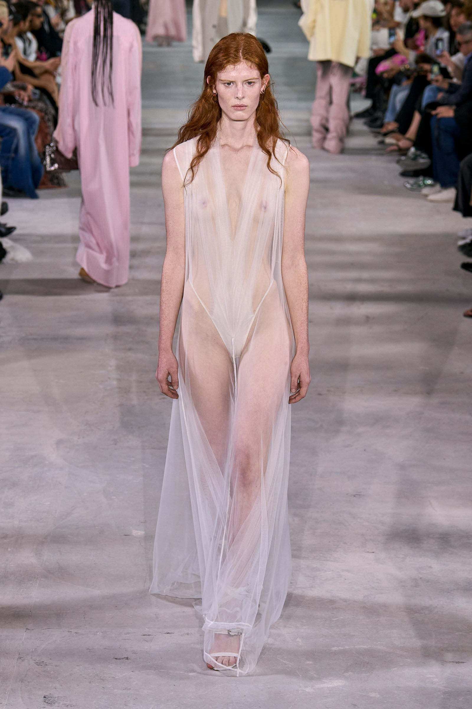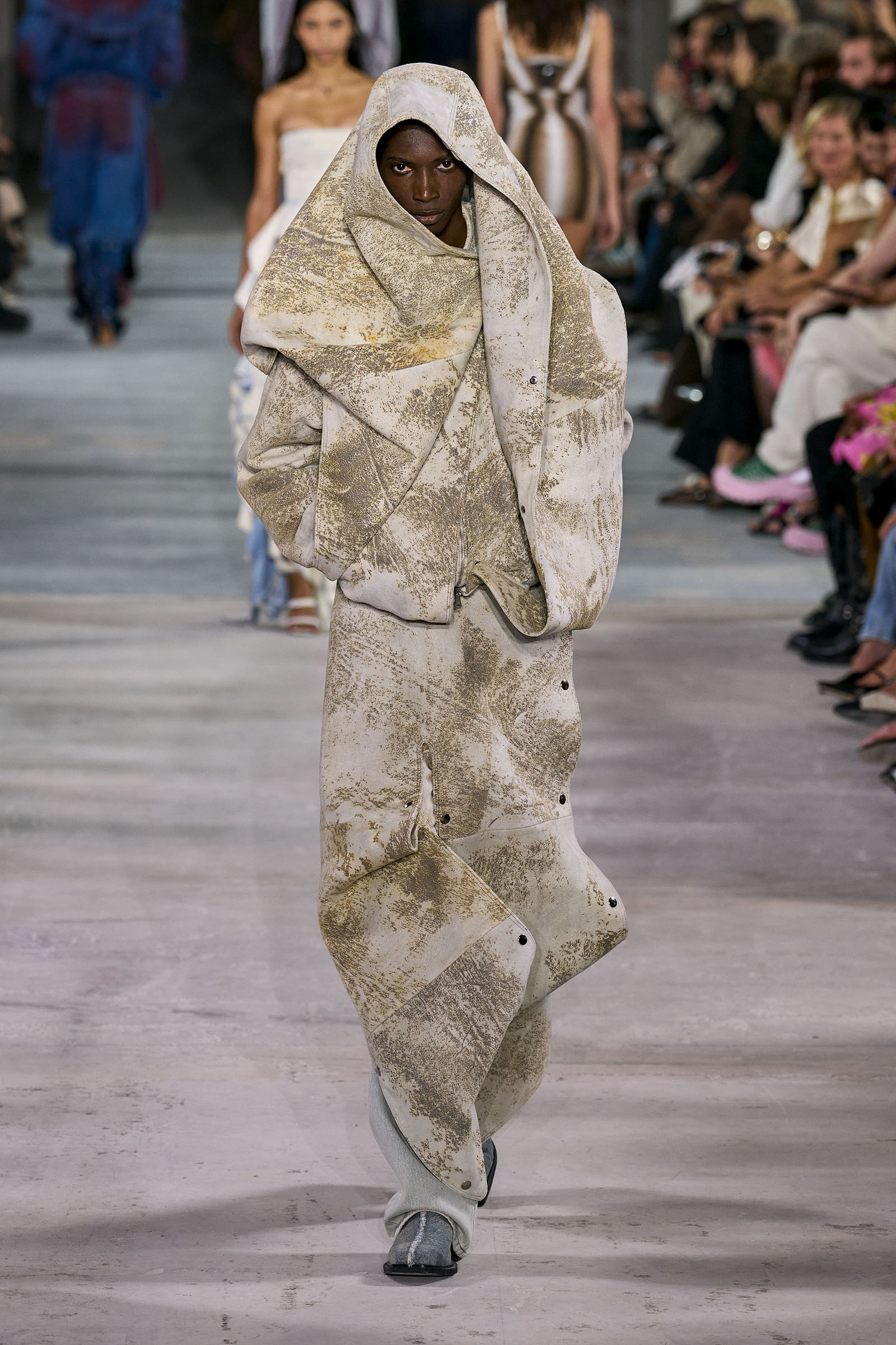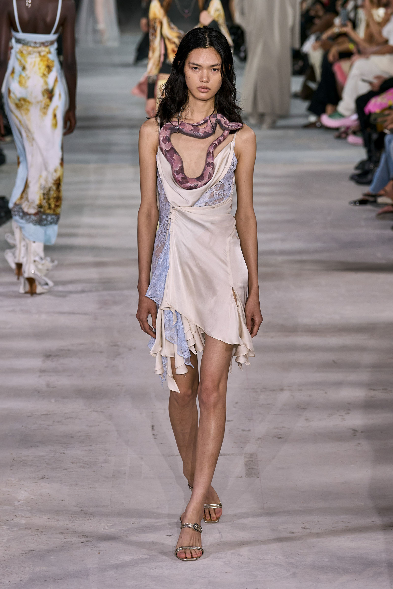 For the non-architecturally inclined, he reproduced the twists and twirls of his more three-dimensional designs in prints on silk “to be a bit more easy to wear.” They included scans of folds, pleats, and distressed lace; the lace print on a slip, in particular, will remind Gen Xers of Martin Margiela’s iconic photocopy dresses. As Martens came out for his bow it wasn’t just the fashion kids that cheered.