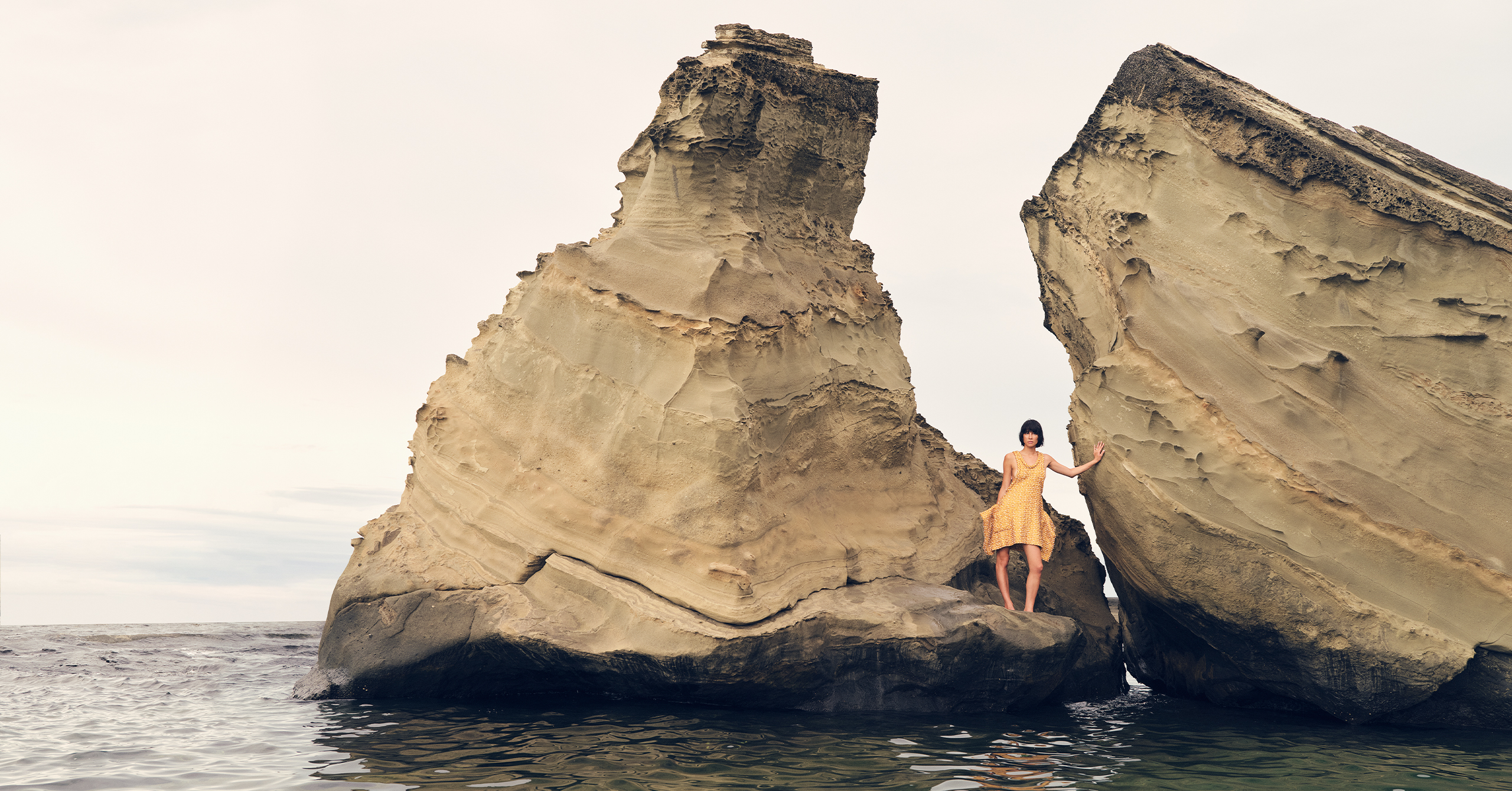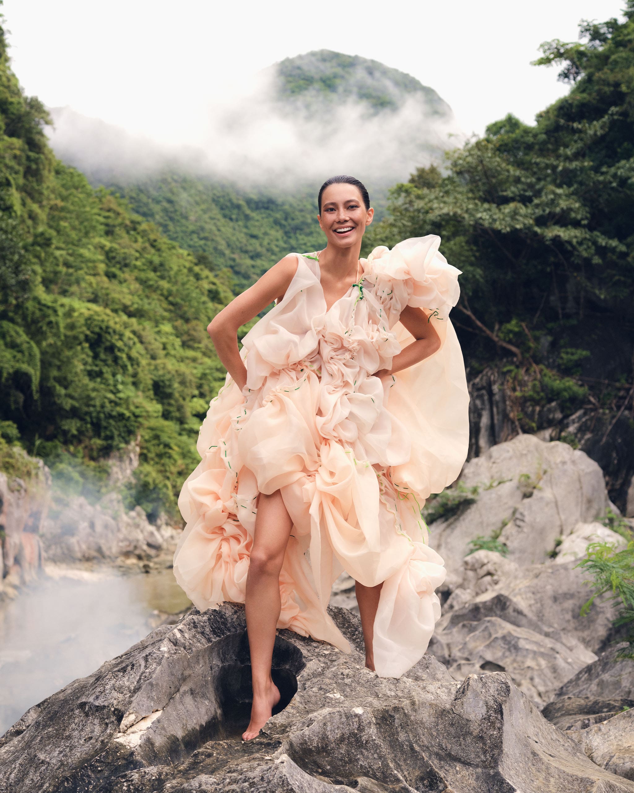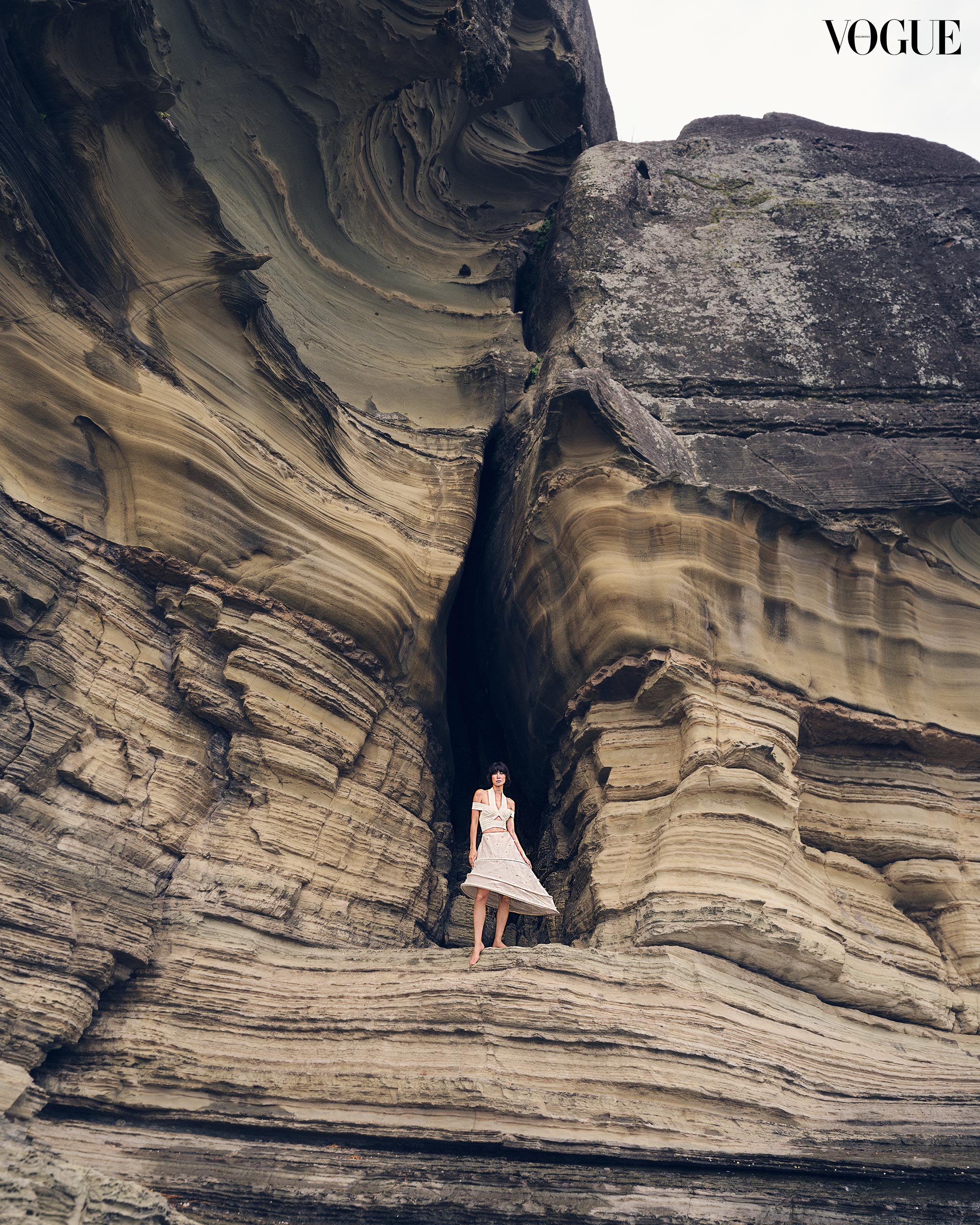 Traveling up to the Visayas, the crew arrived in Northern Samar where they clambered and swam to the Biri Rock Formations, six bluffs that front a tumultuous part of the sea where the San Bernardino Strait meets the Pacific Ocean. Formed by shifting undersea tectonic plates, the rocks have been further fashioned and grooved by the pummeling of waves over several epochs. Against this majestic backdrop, sometimes inside the crevices, Chloe was captured in striking silhouettes and textures that mimic the environment, including a sculpted metal headpiece by artist Jinggoy Buensuceso that looks like it was carved out of the rock.