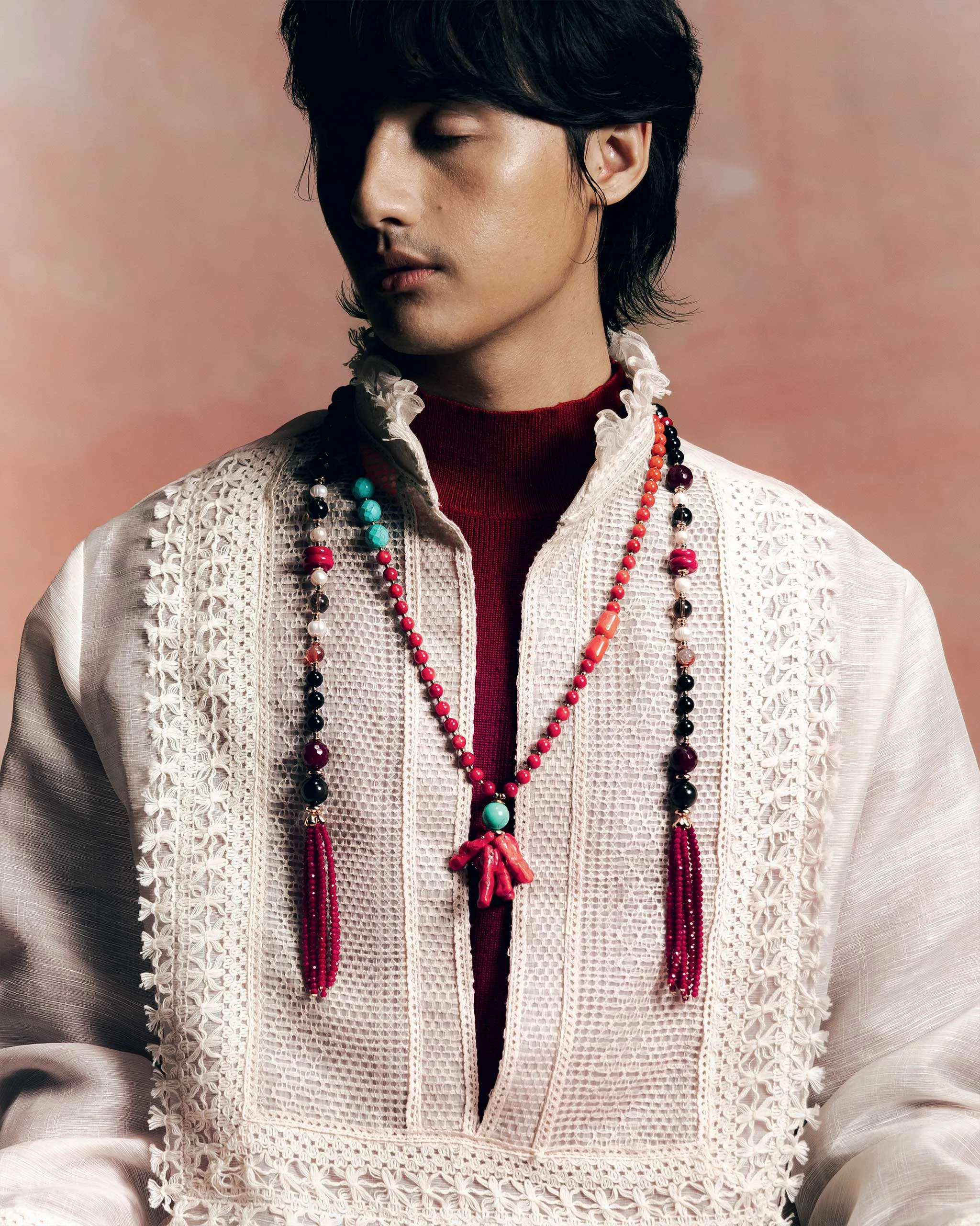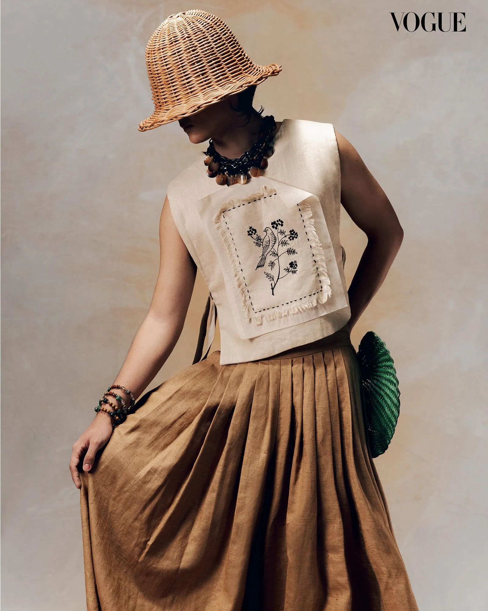 Sarah Tutor’s Hosanna collection, inspired by faith and nature, features palm-shaped curves traced in bias tape. It recalls the repetition and patience that go into preparing food meant to be shared. Similarly, jewelry designer Tina Campos works with freshwater pearls, red corals, and jasper stones, all materials sourced close to home. Here, she crafts pieces that mirror the natural palette of the island’s coastlines. Across these works, designers use their craft as a medium for telling stories of place.