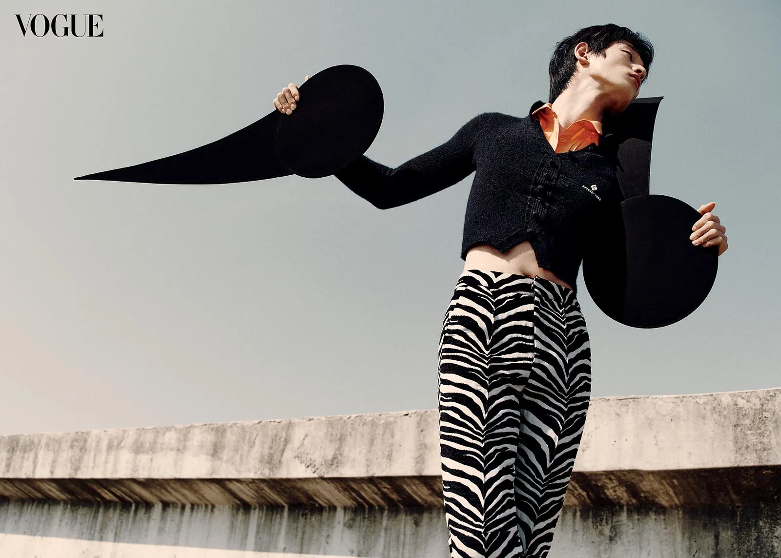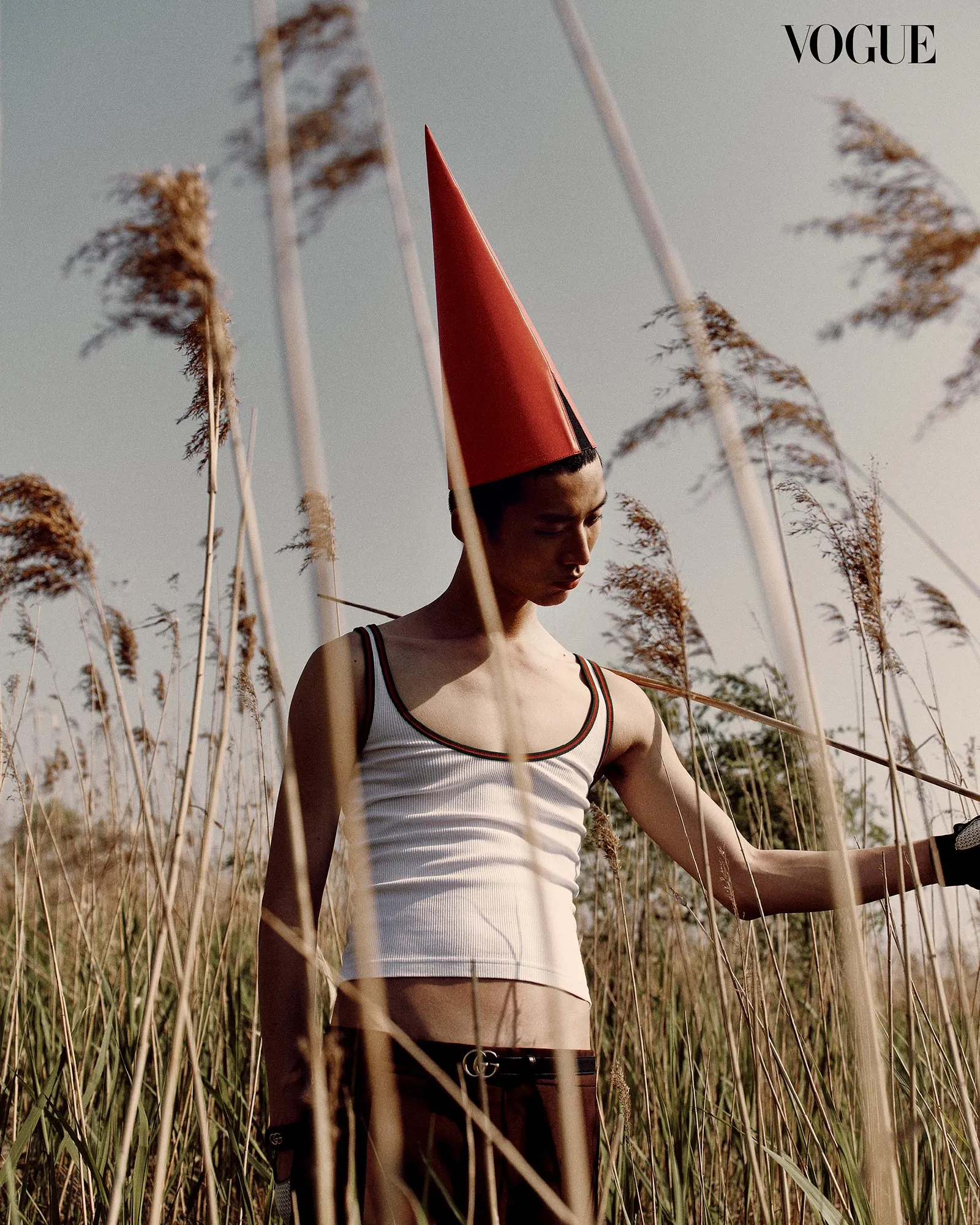 XANDER ZHOU hat, GUCCI top, trousers, and belt. Photographed by Als Sunxiaoran for the September 2025 Issue of Vogue Philippines