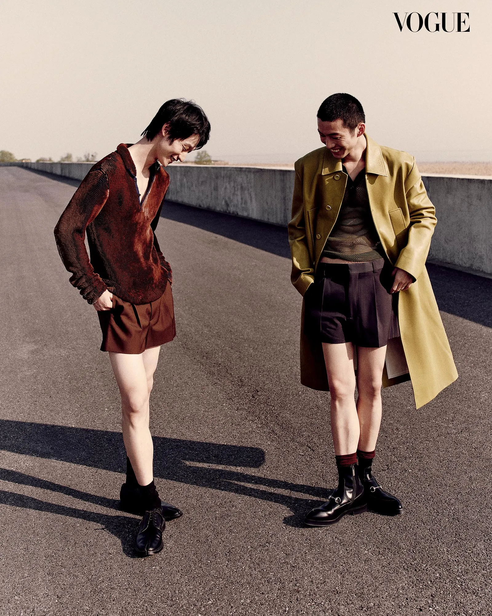 Chengwei wears GUCCI shirt and shorts, MAISON MARGIELA socks and shoes. Wang wears GUCCI coat, shirt, shorts, socks, and boots. Photographed by Als Sunxiaoran for the September 2025 Issue of Vogue Philippines