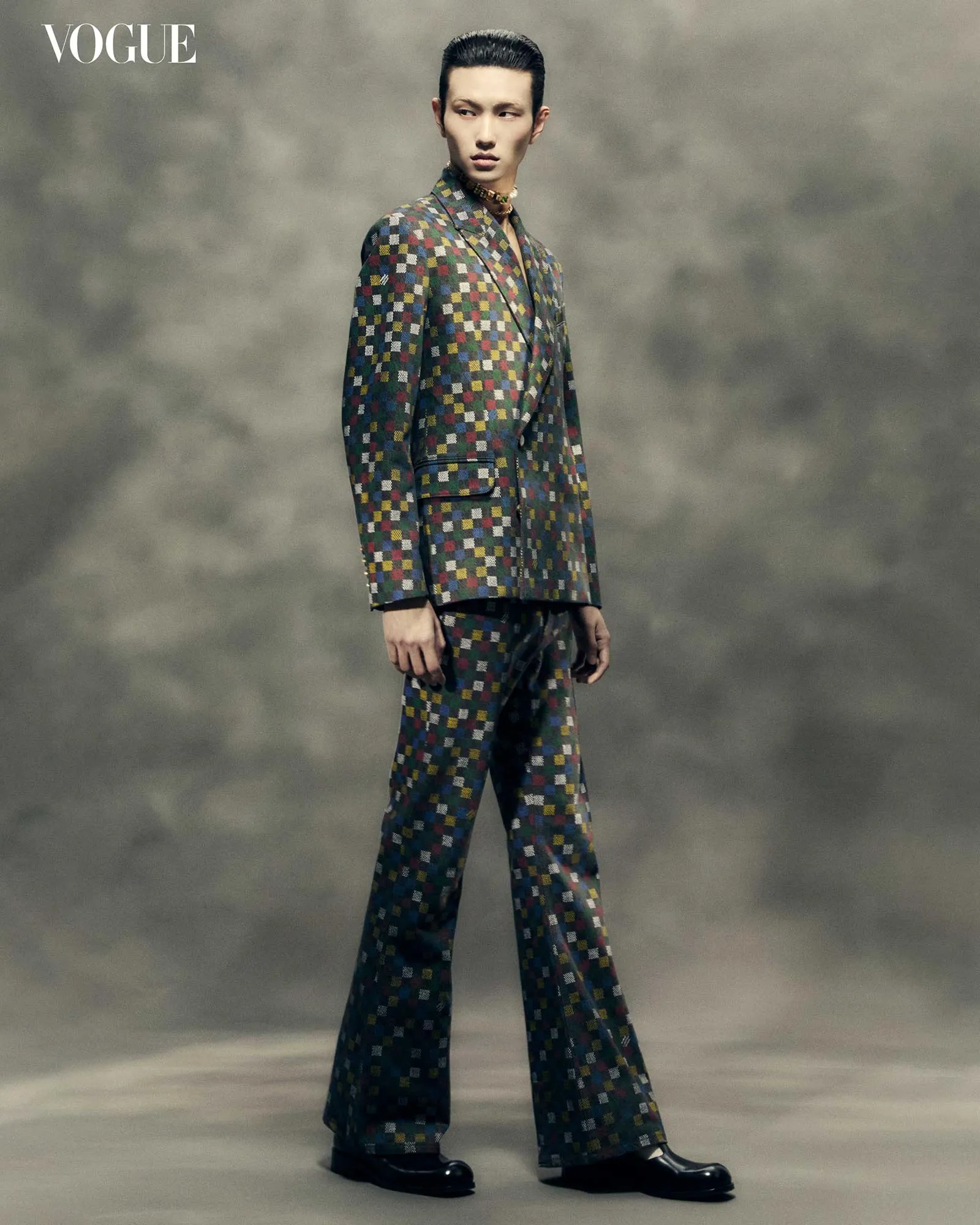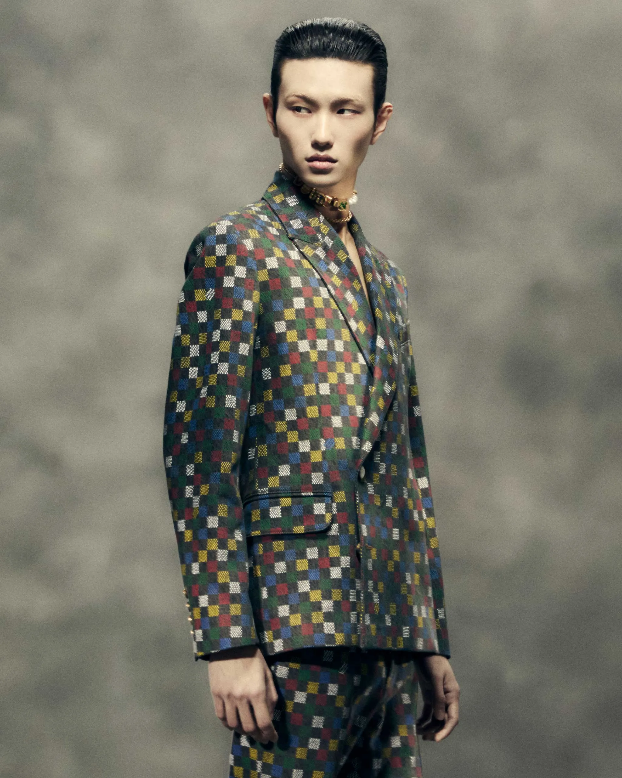 LOUIS VUITTON jacket, trousers, shoes, and necklace. Photographed by Sang Hun Lee