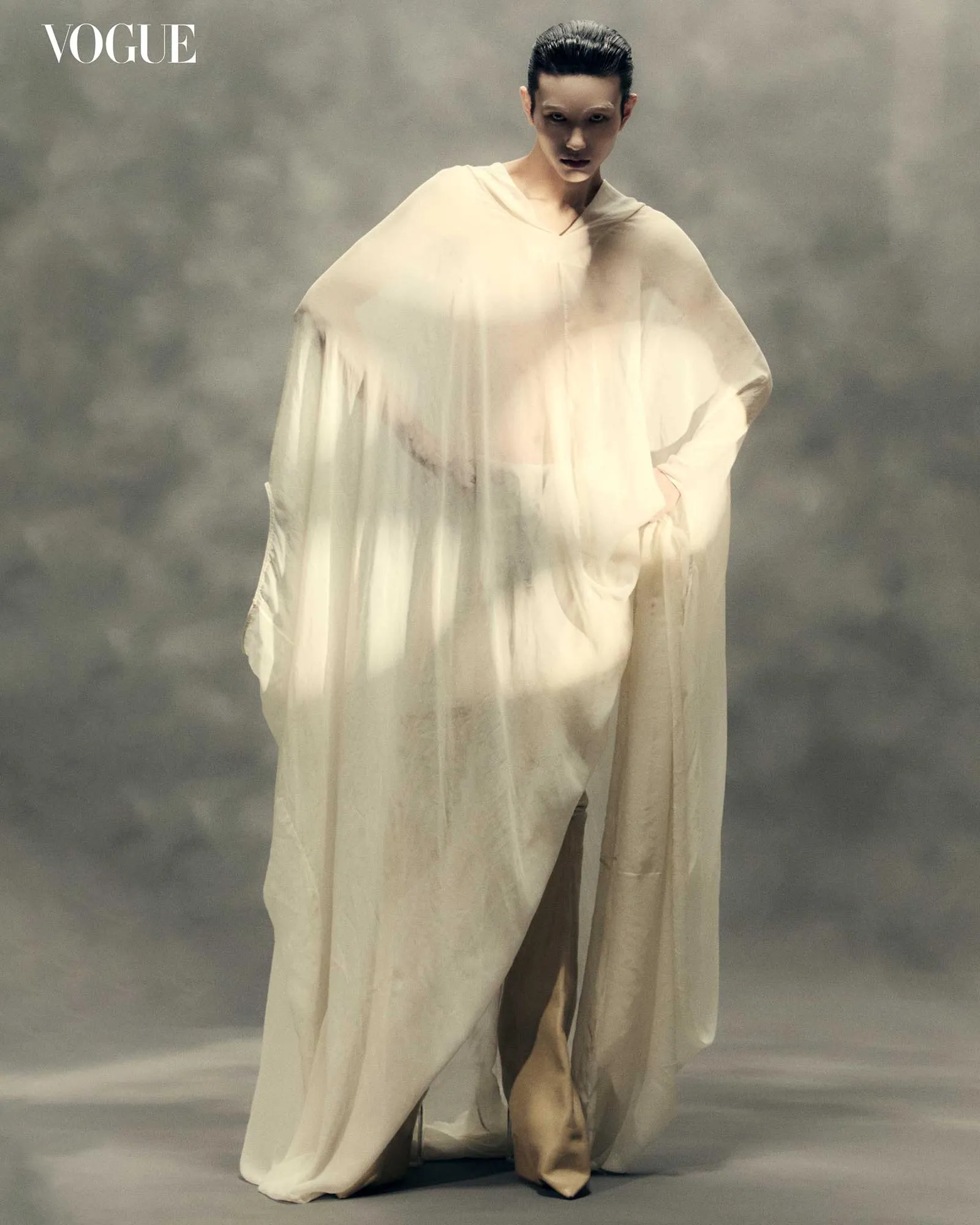 Their looks (monochrome, asymmetrical, intentional in their imbalance) reflected the philosophies of Japanese masters like Issey Miyake, Yohji Yamamoto, and Rei Kawakubo. That same spirit of defiant imperfection appears here, in puddling Rick Owens trousers, and jackets sculpted with tension by Balenciaga.