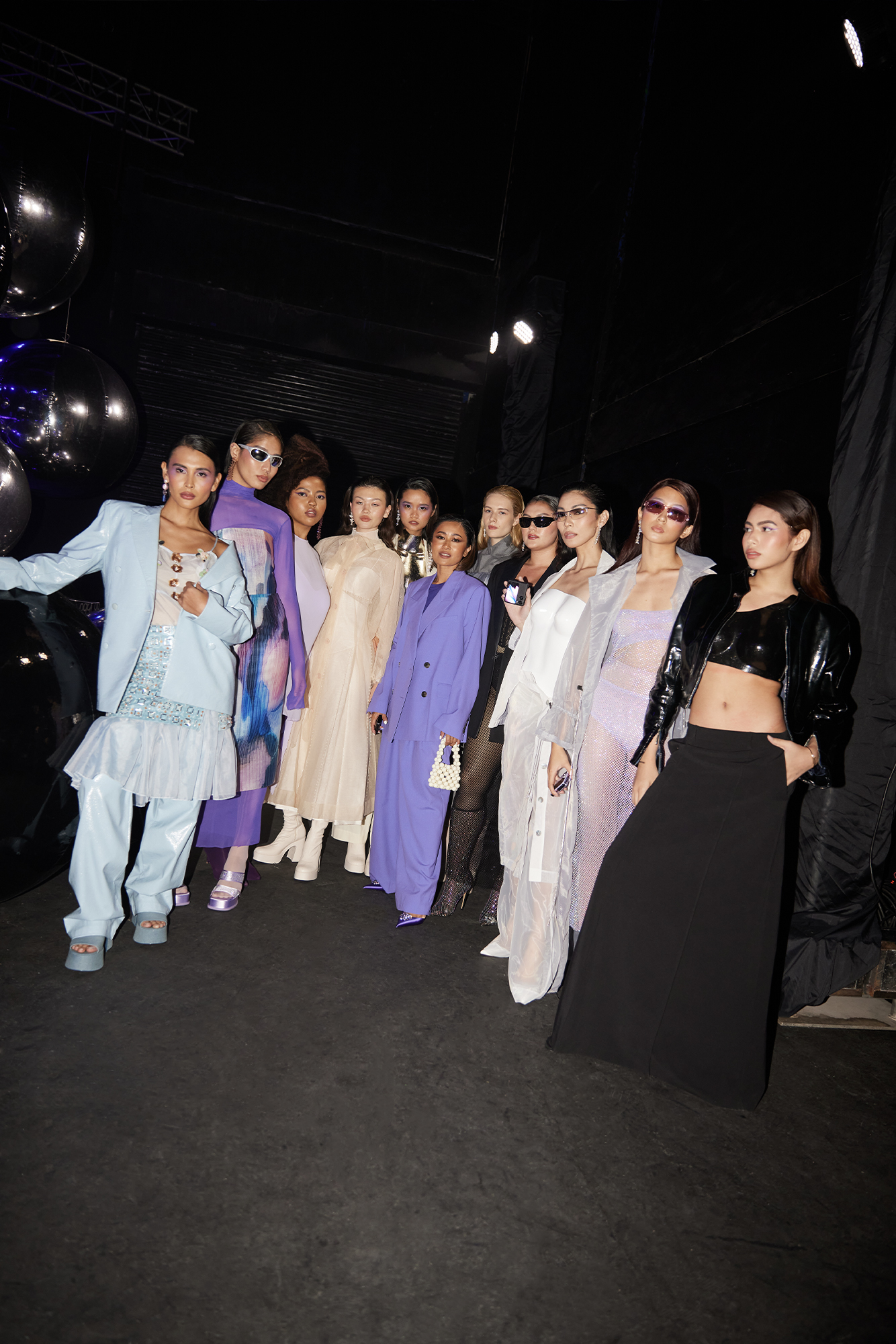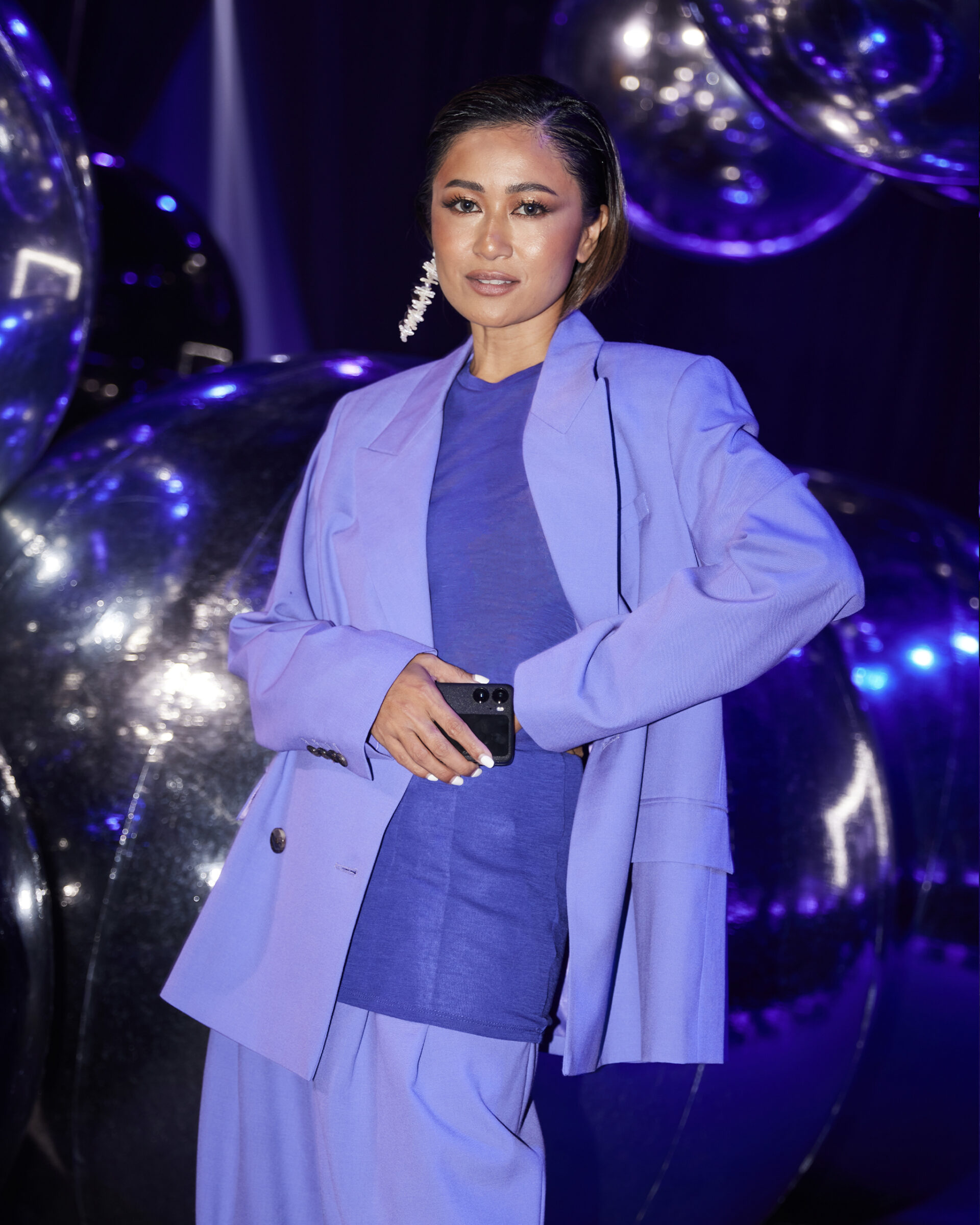 “We’ve always championed to be a brand that stands on one of the pillars of sustainability and circularity, which is re-wear and rental,” she shares. “The idea for this collection is a mix of concepts that highlight the features—at least my favorite features—of the Find N2 Flip. It’s composed of minimalist looks, concepts of aquamorphism and fluidity, and reflective materials that alludes to the curves, adaptability, and gleam of the foldable phone.”