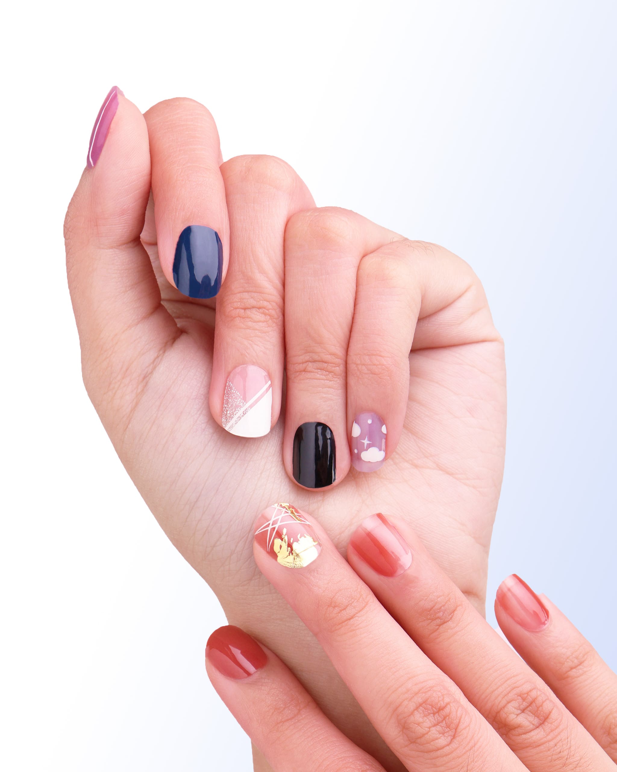 Patterned nails, like animal prints or abstract designs, are flattering with neutral or monochromatic makeup, allowing the nails to be the focal point of your look with the Bobbie Nails’ Nail Gel Wraps. These nail stickers come in Antique Fucshia, Lavender Sky, and Blushing Tomato shades that harden with UV light. For a playful touch, try a print-on-print outfit or add a unique flair with an irregular-shaped ring.