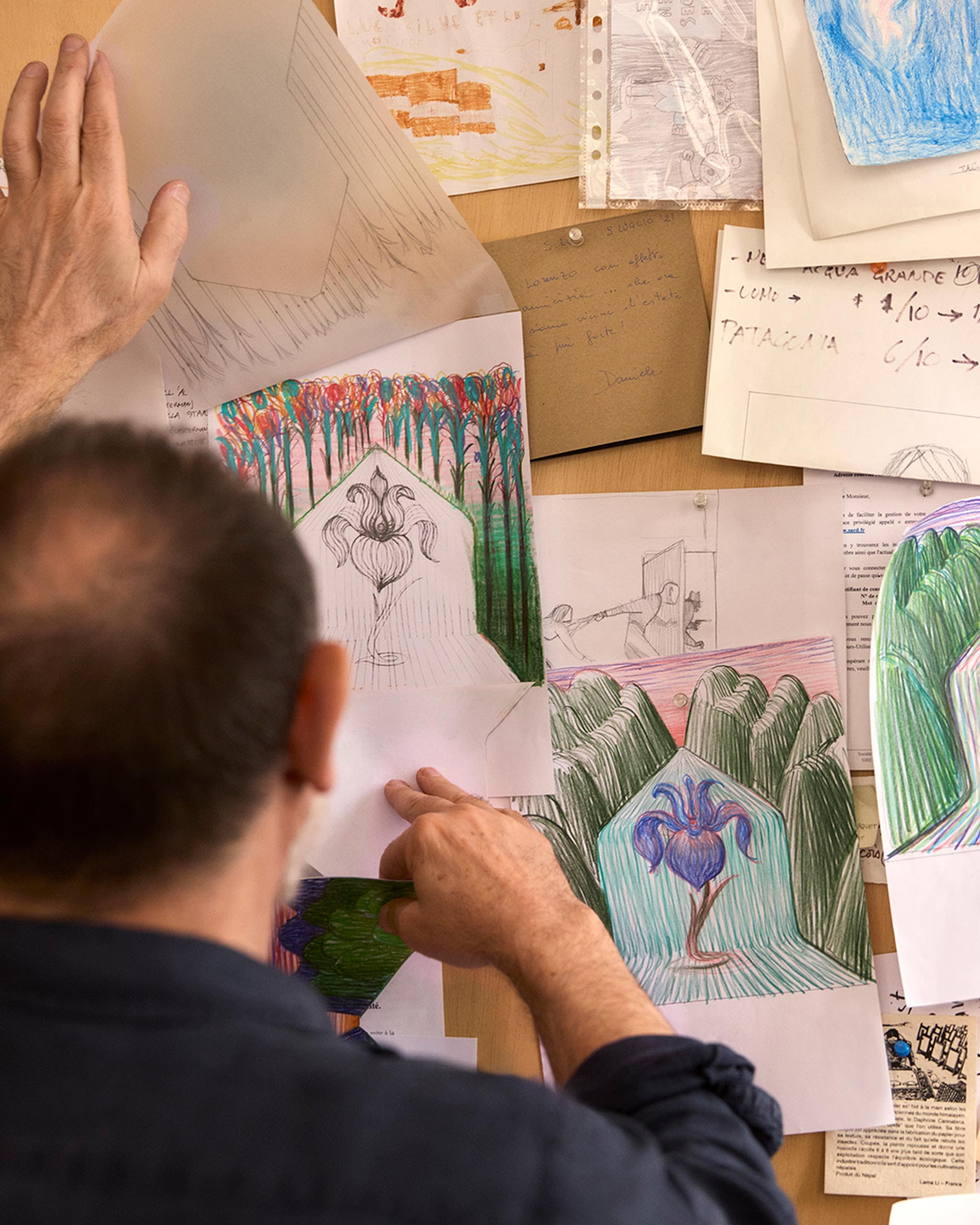 De Crécy’s whimsical style, conveyed through delicate Japanese nib strokes and rich watercolor combines Monogram-inspired accents with flowers and mountains, portraying a serene yet vibrant panorama.