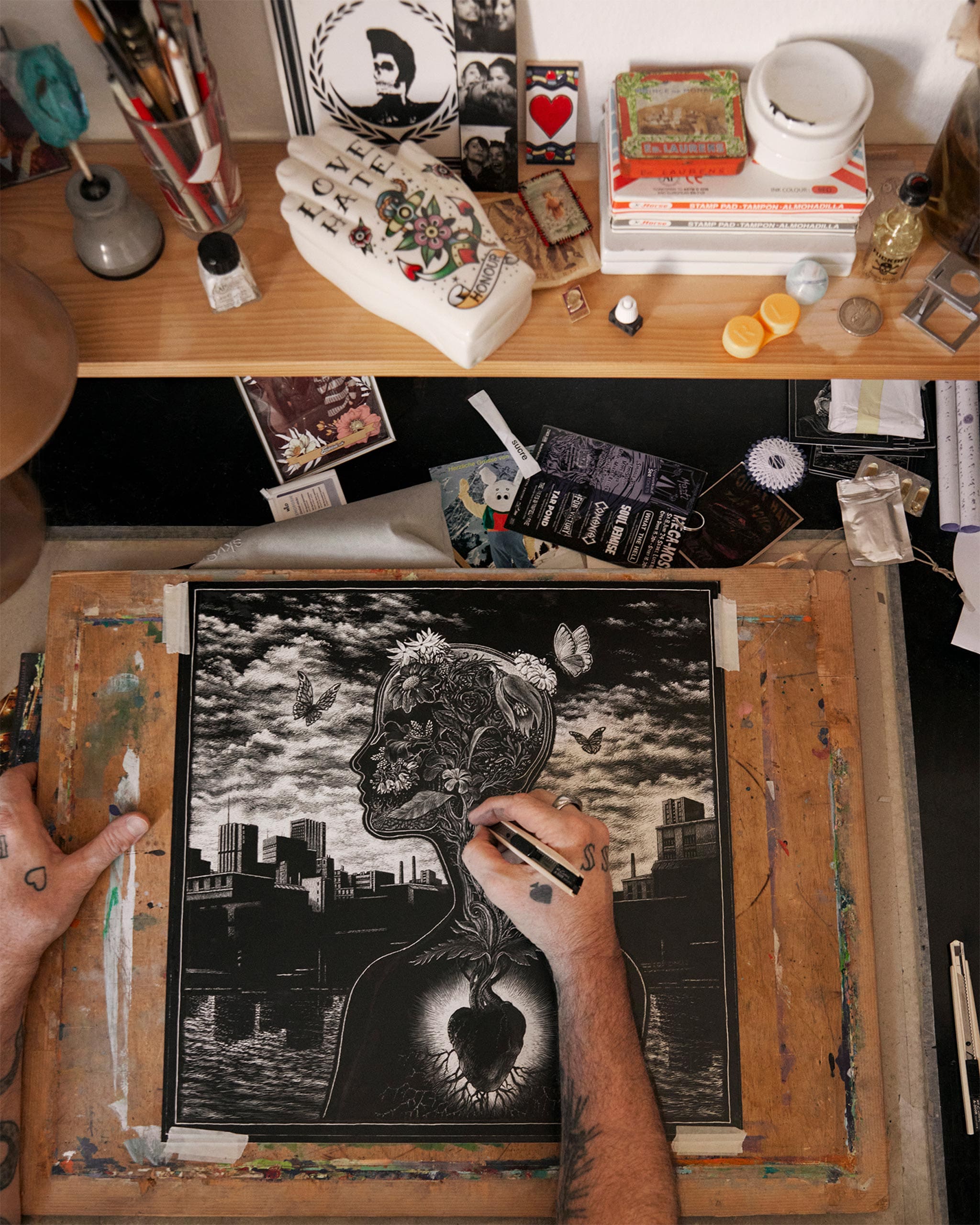 Swiss artist Thomas Ott’s scratchboard technique creates stark black-and-white visual narratives, adding a dramatic, almost cinematic quality to his work. In Urban Flowers, Ott morphs floral motifs into emblems of human resilience. The silk square embodies his signature atmospheric depth, turning flowers into symbols of the enduring human spirit.