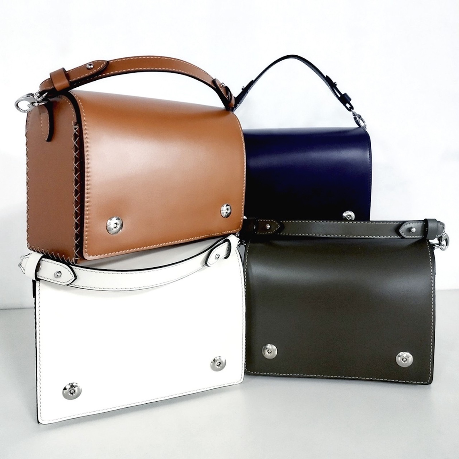 Convertible into either a shoulder bag or a sling through its adjustable handle, this bag is made to be versatile toward a variety of styles and functions. This medium-sized, rectangular bag is held together with cross stitched details across each of its sides, with a selection of neutral tones available in either tan, white, violet, and olive green.