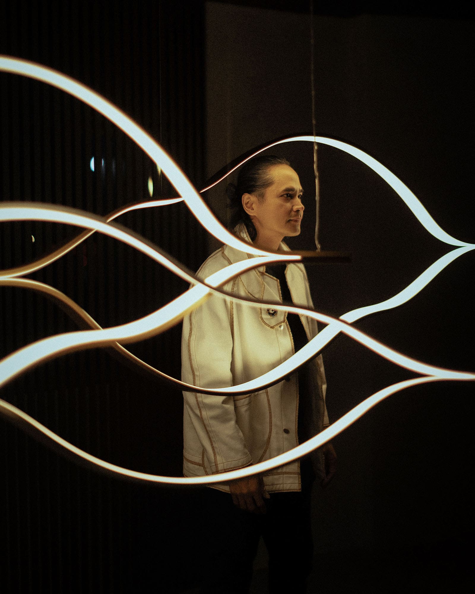 Interior designer Cecil Ravelas orchestrated this launch, with a series of experiential corners on each floor that sought to ignite the five senses before ultimately leading the guests to the main launch on the fourth floor. For example, each wall of the showroom was transformed into liquid metal with visual projections that encompassed the whole floor, stimulating the visual senses. While handpan, gongs and traditional Filipino percussion reverberated through the ears of each guest for a transformative experience. On the ‘scent’ floor, guests had the opportunity to create their own candles using a variety of different scents inspired by Henge’s use of natural materials.
