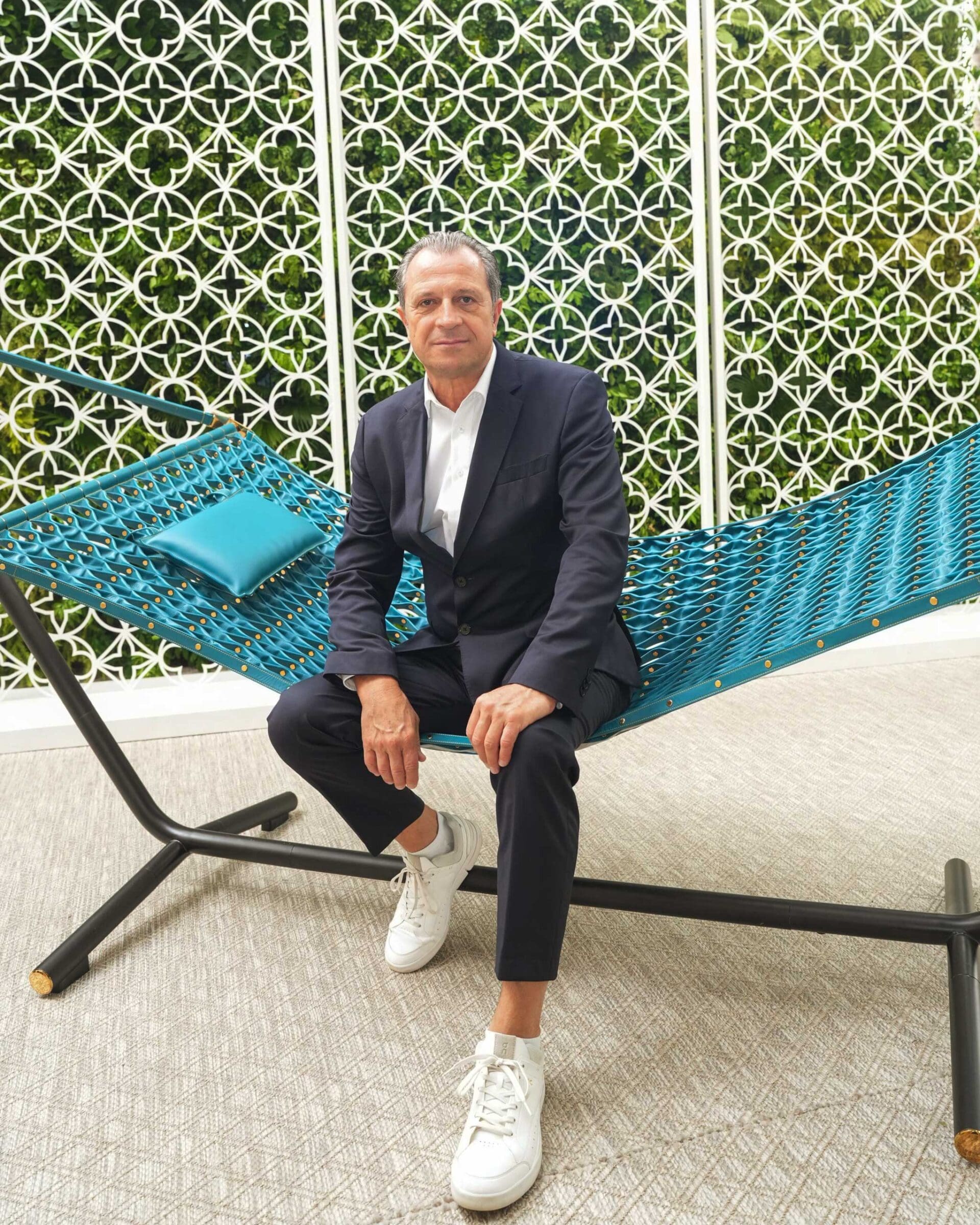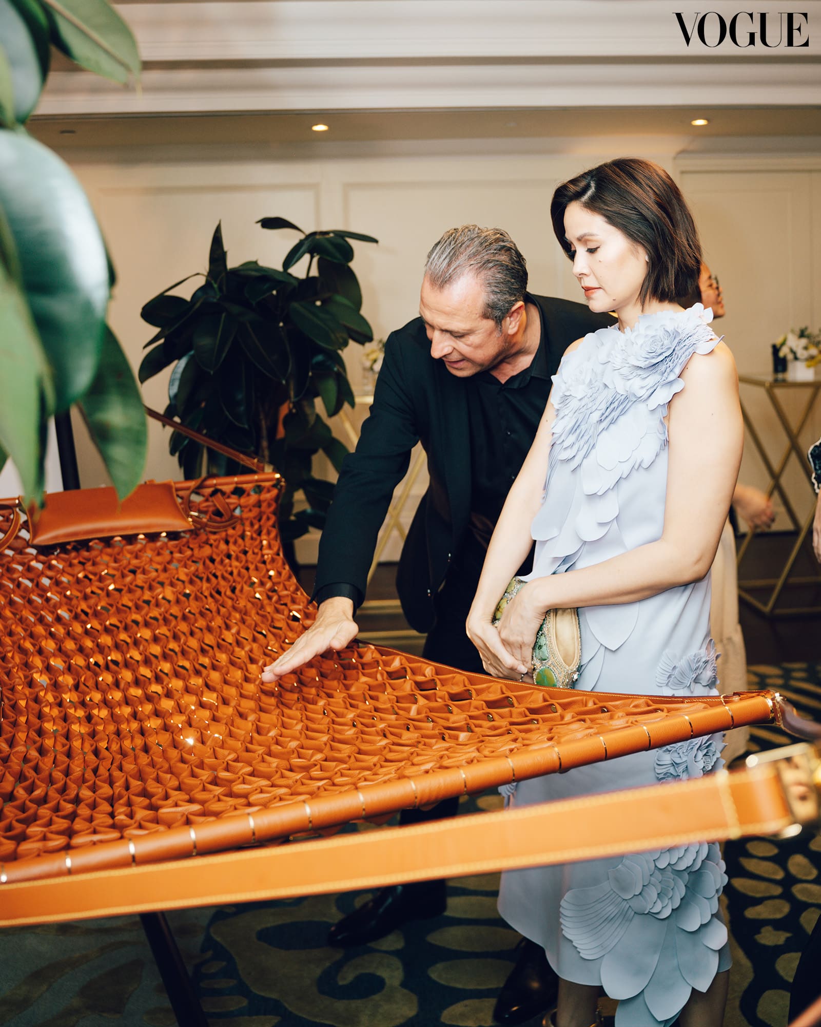 A key piece from their collection, “The Hammock,” reimagines a daybed through strips of interwoven Louis Vuitton leather. Secured by 786 engraved rivets, its structure draws inspiration from the texture and form of Italian farfalle pasta. Aebi recalls that tasting the pasta in Italy sparked the concept for the leather hammock: “It’s one thing to feel the pasta, but in tasting it, we found a foundation for its structure.”